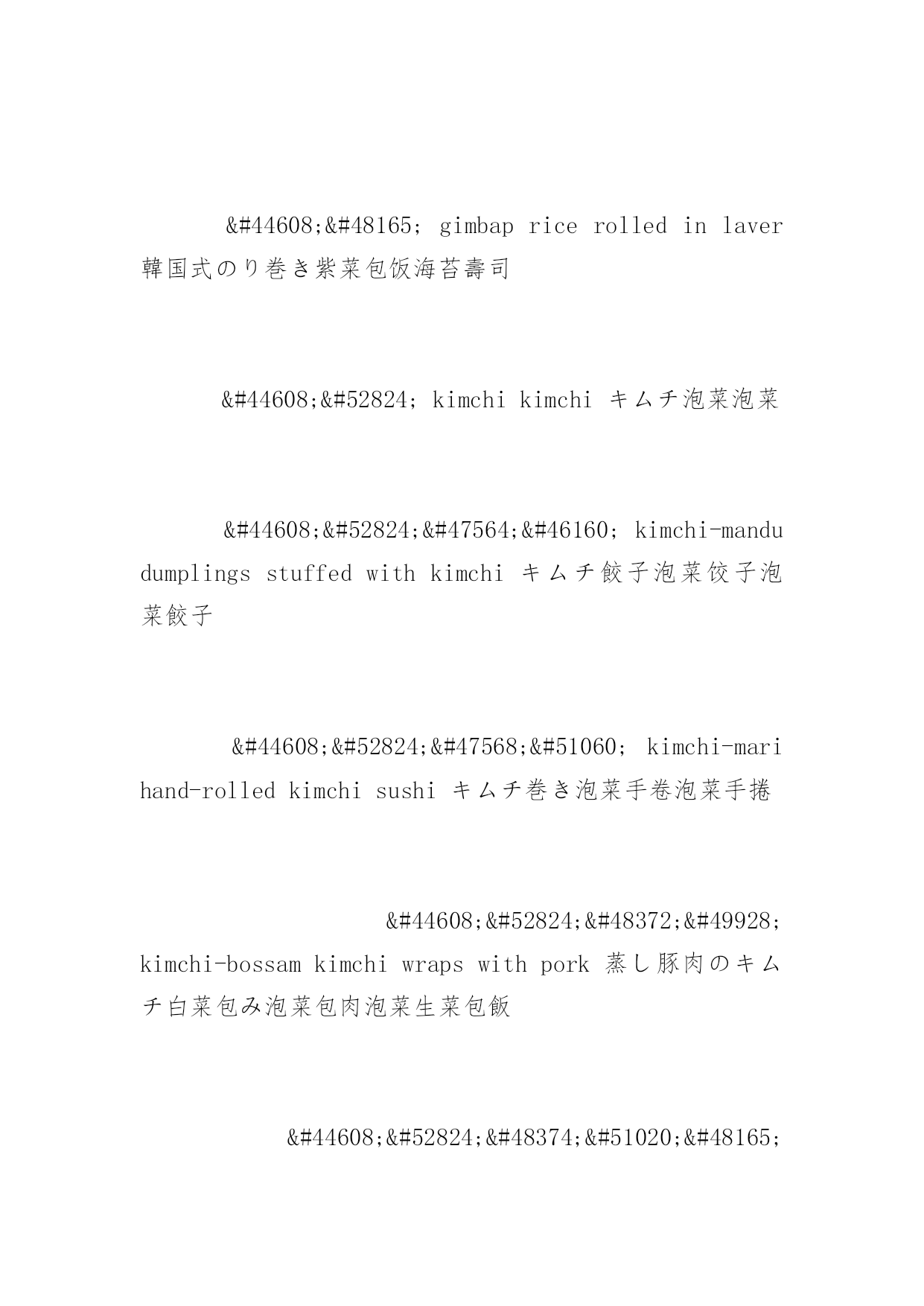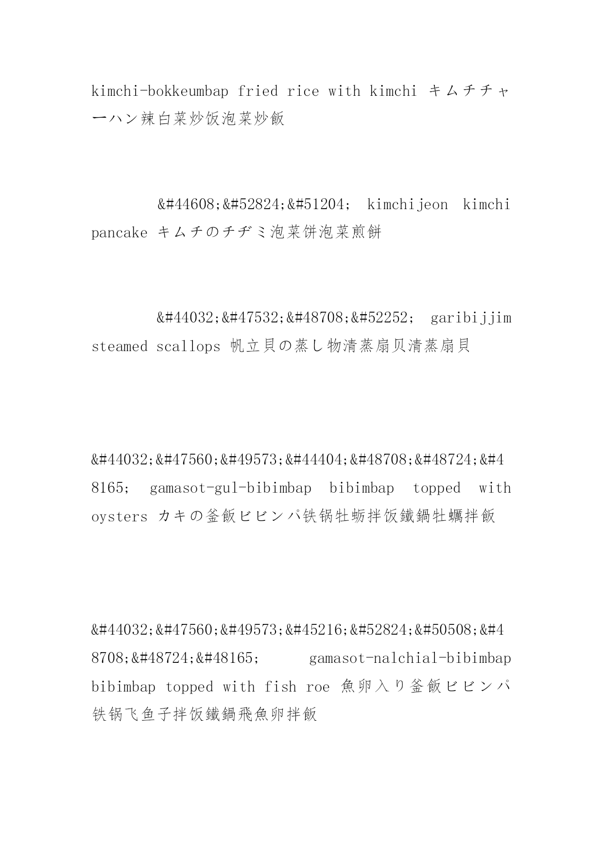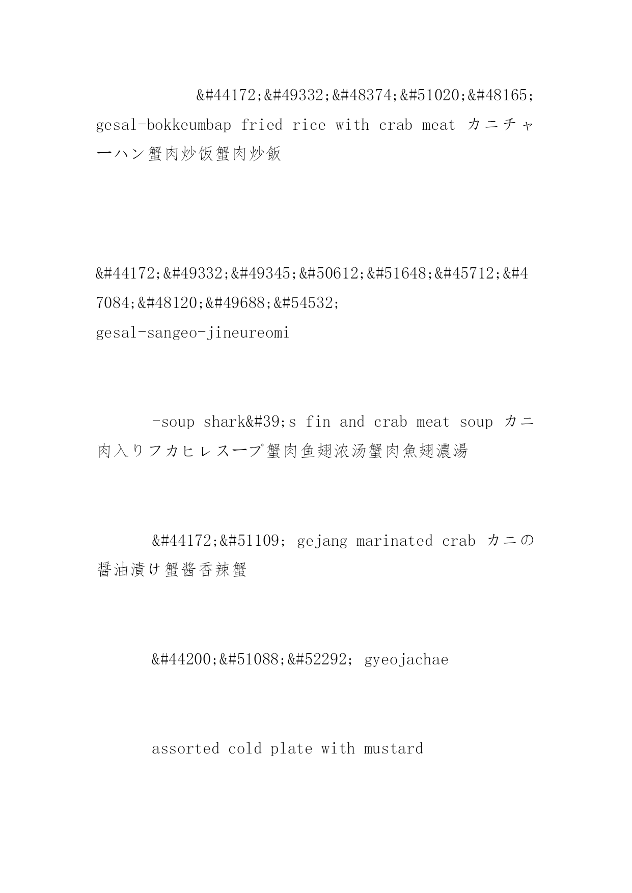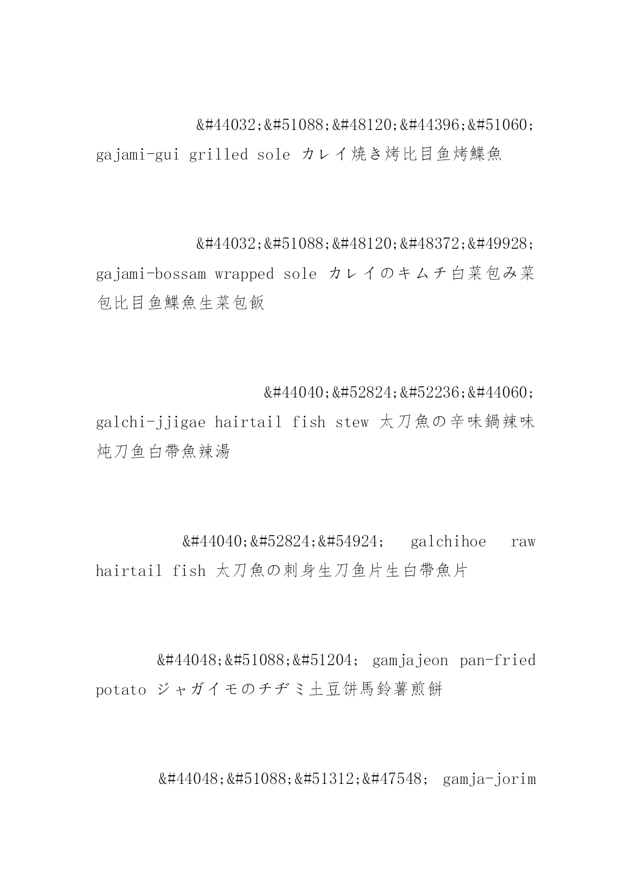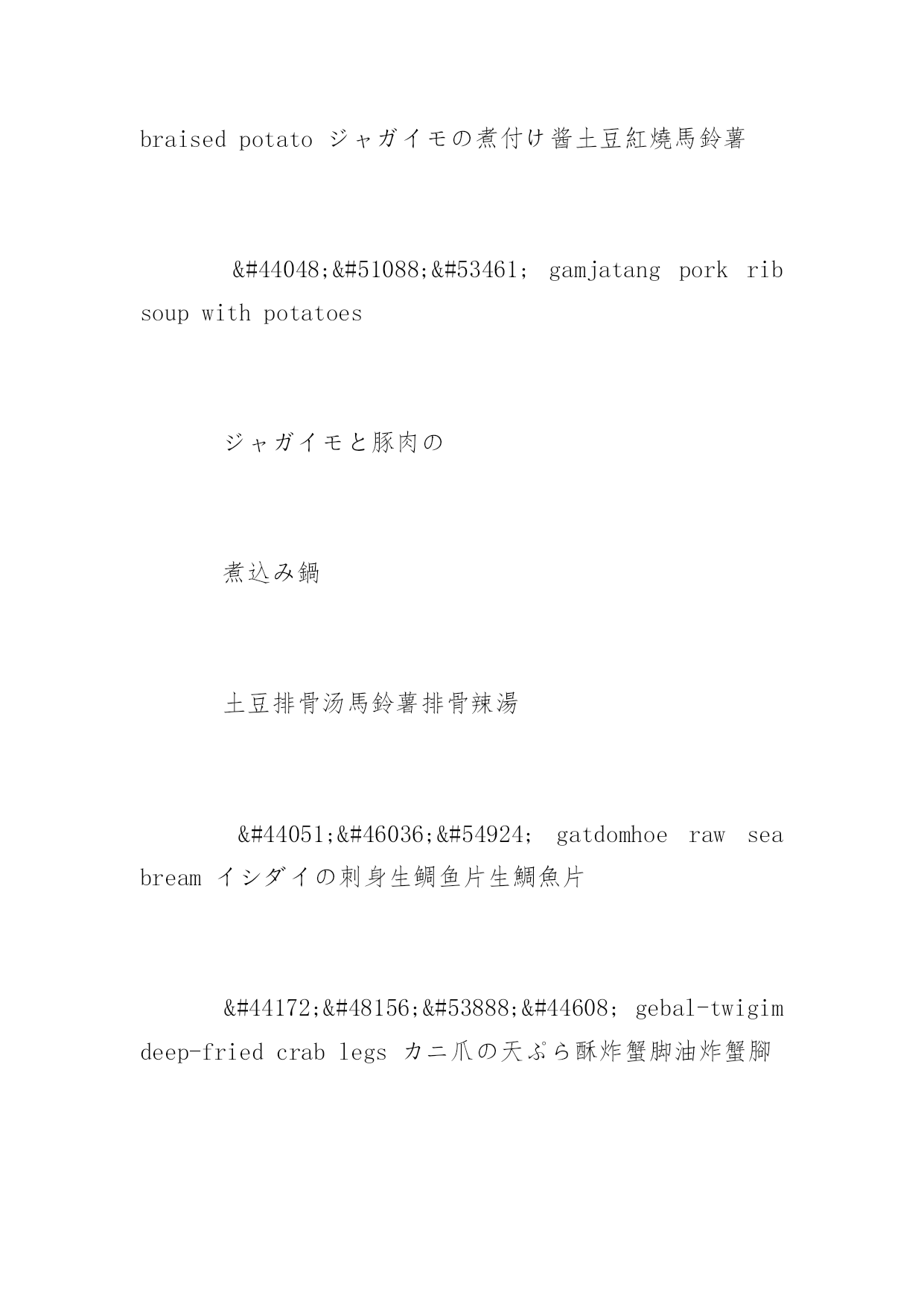 韩语考试餐厅食物词汇2017年韩语考试餐厅食物词汇Youmaybetoocunningforone,butnotforall.以下是小编为大家搜索整理的2017年韩语考试餐厅食物词汇,希望能给大家带来帮助!更多精彩内容请及时关注我们应届毕业生考试网!굴찜guljjimsteamedoysters蒸カキ清蒸牡蛎清蒸牡蠣굴탕수gul-tangsuyuksweetandsouroystersカキ酢豚糖醋牡蛎糖醋牡蠣굴해물파전gul-haemul-pajeonoysterandseafoodpancakeカキのお好み焼き牡蛎海鲜葱饼牡蠣海鮮蔥餅굴회gulhoerawoysters生カキ生牡蛎生牡蠣궁중잡채gungjung-japchaecoldstir-friedpotatonoodlesandvegetables春雨と野菜の炒め物:宮廷料理宫廷杂烩宮廷韓式炒冬粉기스면giseumyeonnoodlesoupinchickenbroth鶏スープ細麺鸡丝面雞絲麵김밥gimbapricerolledinlaver韓国式のり巻き紫菜包饭海苔壽司김치kimchikimchiキムチ泡菜泡菜김치만두kimchi-mandudumplingsstuffedwithkimchiキムチ餃子泡菜饺子泡菜餃子김치말이kimchi-marihand-rolledkimchisushiキムチ巻き泡菜手卷泡菜手捲김치보쌈kimchi-bossamkimchiwrapswithpork蒸し豚肉のキムチ白菜包み泡菜包肉泡菜生菜包飯김치볶음밥kimchi-bokkeumbapfriedricewithkimchiキムチチャーハン辣白菜炒饭泡菜炒飯김치전kimchijeonkimchipancakeキムチのチヂミ泡菜饼泡菜煎餅가리비찜garibijjimsteamedscallops帆立貝の蒸し物清蒸扇贝清蒸扇貝가마솥굴비빔밥gamasot-gul-bibimbapbibimbaptoppedwithoystersカキの釜飯ビビンパ铁锅牡蛎拌饭鐵鍋牡蠣拌飯가마솥날치알비빔밥gamasot-nalchial-bibimbapbibimbaptoppedwithfishroe魚卵入り釜飯ビビンパ铁锅飞鱼子拌饭鐵鍋飛魚卵拌飯가마솥밥gamasotbapcookedriceinanironpot釜飯铁锅饭鐵鍋飯가마솥순두부gamasot-sundubuspicysofttofustewおぼろ豆腐鍋铁锅豆腐脑鐵鍋嫩豆腐가마솥인삼영양비빔밥gamasot-insam-yeongyang-bibimbapbibimbaptoppedwithslicedginseng高麗人参入り釜飯ビビンパ铁锅人参营养拌饭鐵鍋人蔘營養拌飯가물치회gamulchihoerawmullet雷魚の刺身生黑鱼片生烏鱧片가스동gaseudongricetoppedwithfriedeggandporkcutletカツ丼炸猪排盖饭豬排蓋飯가오리gaorirawrayfishエイ铧鱼魟魚가자미구이