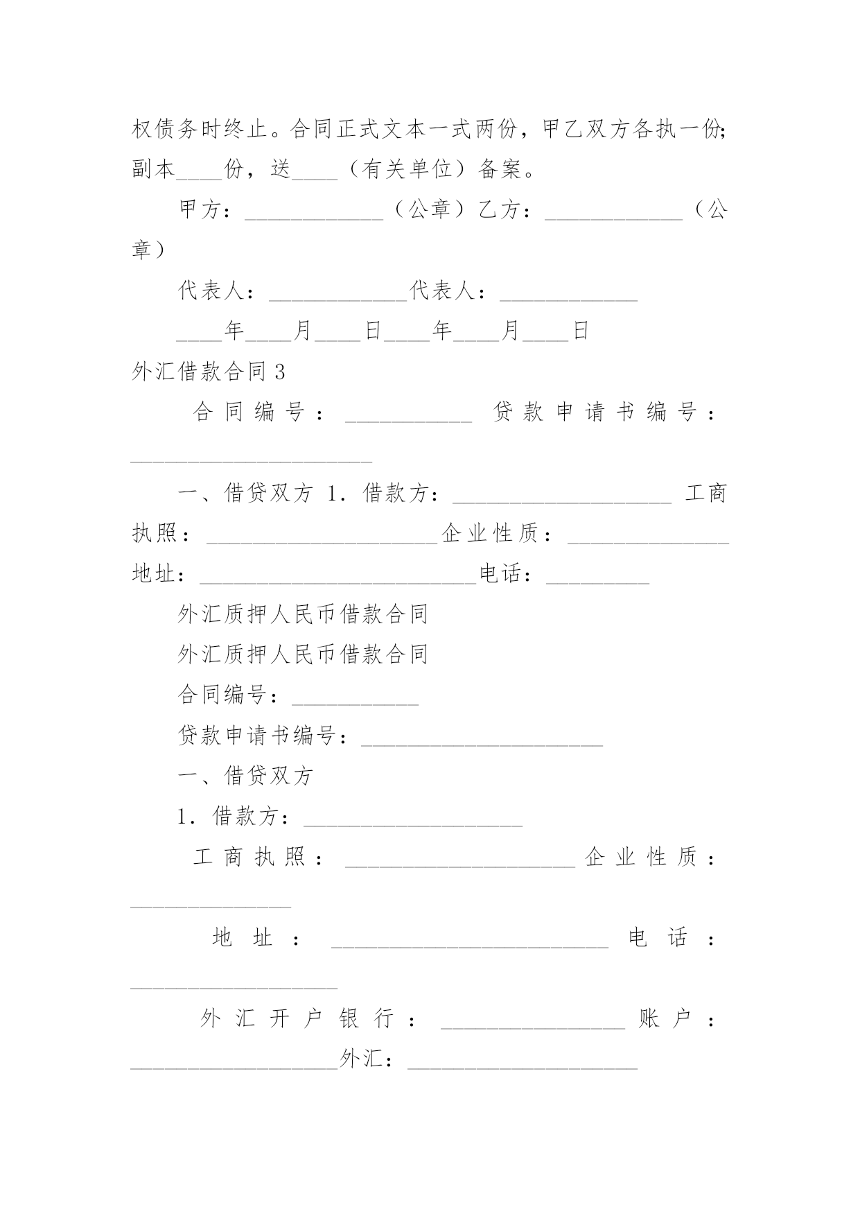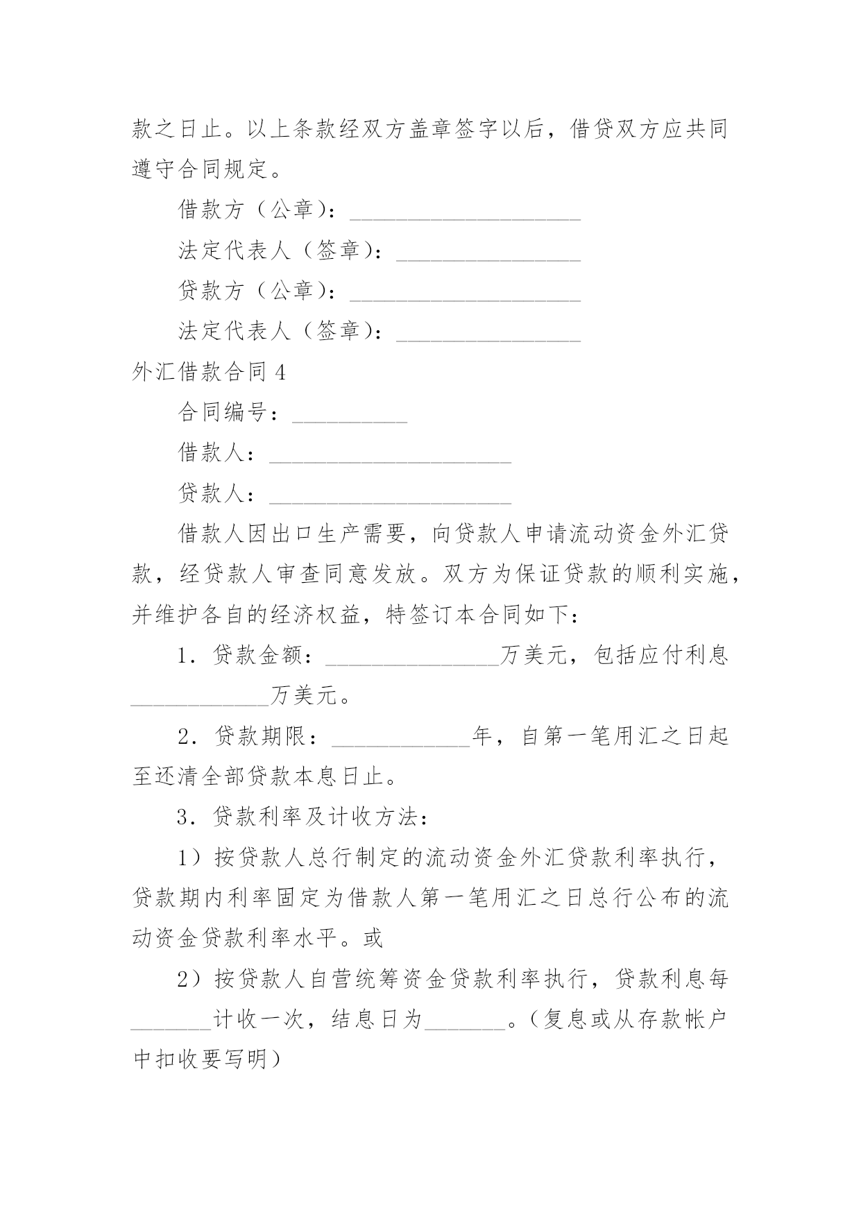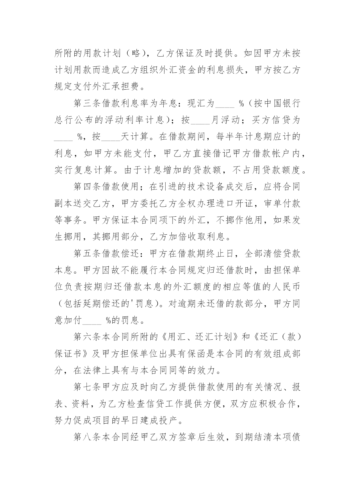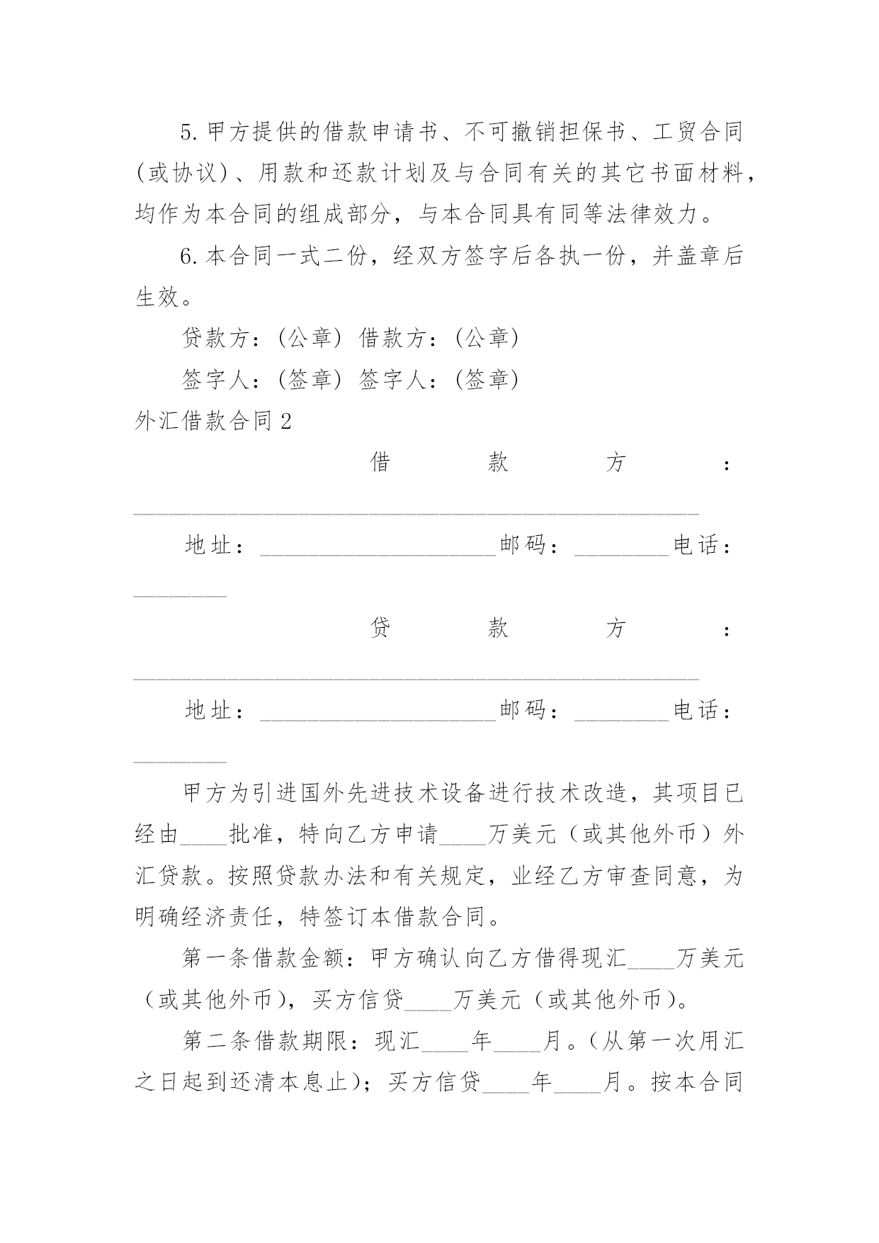 外汇借款合同(精华)外汇借款合同在当今不断发展的世界,人们运用到合同的场合不断增多,合同是企业发展中一个非常重要的因素。合同有不同的类型,当然也有不同的目的,以下是小编整理的外汇借款合同,希望对大家有所帮助。外汇借款合同1借款方:___(简称甲方)贷款方:中国人民建设银行(简称乙方)根据_____号文件批准的项目,所需资金经甲方申请,乙方审查同意发放外汇贷款。双方同意遵照《中华人民共和国合同法》和国务院颁发的《借款合同条例》的规定签订本合同,并共同遵守。第一条借款金额外汇贷款____万美元。第二条借款用途外汇贷款用于_____第三条借款期限____年__月__日至____年__月__日。外汇贷款自第一笔用汇之日起,在___个月之内分期还清全部贷款本息。第四条借款利率外汇贷款年利率为___%,按个月浮动。乙方每3个月计收一次利息,计息日为每季最后一个月的20日,第一次提款日到第一次计息日不足一浮动期限的也要浮动利率,此后利率浮动日即为某一计息日。如甲方不能按期付息,则转入贷款本金计收复利。第五条借款支用甲方根据用款计划支用贷款,对到期未支用部分,乙方直接将贷款从甲方的贷款户转到存款户。第六条借款偿还甲方保证在本合同规定的借款期限内按还款计划以所借同种外币偿还借款本息(若以其它可自由兑换的'外币偿还,按还款日的外汇买卖牌价折算成所借外币偿还)。还款计划如下:从____年__月__日开始还款,共分____次还清。第七条还款担保本合同项下的借款本息由作为甲方的担保人,并由担保人按乙方的要求向乙方出具担保函。一旦甲方不能按期偿还贷款本息,由担保单位承担归还本金、利息和费用的责任。第八条违约责任1.甲方不按用款计划用款,其提前支用部分须向乙方支付___‰的承担费。乙方因本身责任不按用款计划提供贷款须向甲方支付___‰的违约金。2.甲方如不按合同规定使用贷款,乙方有权停止或收回全部或部分贷款,挪用贷款部分在原贷款利率的基础上加收___%的罚息。3.如因不可抗力的原因,甲方不能在贷款期限终止日全部还清本息,应在到期日30天前向乙方提出展期申请。经乙方同意,双方共同修改合同的原借款期限,并重新确定相应的贷款利率。甲方未经乙方同意不按期归还的贷款,乙方有权从甲方在任何银行开立的帐户内扣收,并从过期之日起,对逾期贷款部分按借款利率加收____%的利息。第九条其它规定1.发生下列情况之一时,乙方有权停止发放贷款并立即或限期收回已发放的贷款。(1)甲方向乙方提供的情况、报表和各项资料不真实;(2)甲方与第三方发生诉讼经法院判决败诉,偿付赔偿金后,无力向乙方偿付贷款本息;(3)甲方的资产总额不足抵偿其负债总额;(4)甲方的保证人违反或失去保证书中规定的条件。2.甲方在还清贷款前,经营中的资金往来,除乙方同意者外,均须通过在乙方开立的帐户办理,不得擅自将资金转移到其他银行或者金融机构。3.乙方有权检查、监督贷款的使用情况。甲方应向乙方提供有关报表和资料。4.甲方或乙方任何一方要求变更合同或本合同中的某一项条款,须在事前以书面形式通知对方,在双方达成协议前本合同中的各项条款仍然有效。5.甲方提供的借款申请书、不可撤销担保书、工贸合同(或协议)、用款和还款计划及与合同有关的其它书面材料,均作为本合同的组成部分,与本合同具有同等法律效力。6.本合同一式二份,经双方签字后各执一份,并盖章后生效。贷款方:(公章)借款方:(公章)签字人:(签章)签字人:(签章)外汇借款合同2借款方:________________________________________________地址:____________________邮码:________电话:________贷款方:________________________________________________地址:____________________邮码:________电话:________甲方为引进国外先进技术设备进行技术改造,其项目已经由____批准,特向乙方申请____万美元(或其他外币)外汇贷款。按照贷款办法和有关规定,业经乙方审查同意,为明确经济责任,特签订本借款合同。第一条借款金额:甲方确认向乙方借得现汇____万美元(或其他外币),买方信贷____万美元(或其他外币)。第二条借款期限:现汇____年____月。(从第一次用汇之日起到还清本息止);买方信贷____年____月。按本合同所附的用款计划(略),乙方保证及时提供。如因甲方未按计划用款而造成乙方组织外汇资金的利息损失,甲方按乙方规定支付外汇承担费。第三条借款利息率为年息:现汇为____%(按中国银行总行公布的浮动利率计息);按____月浮动;买方信贷为____%,按____天计算。在借款期间,每半年计息期应计的利息,如甲方未能支