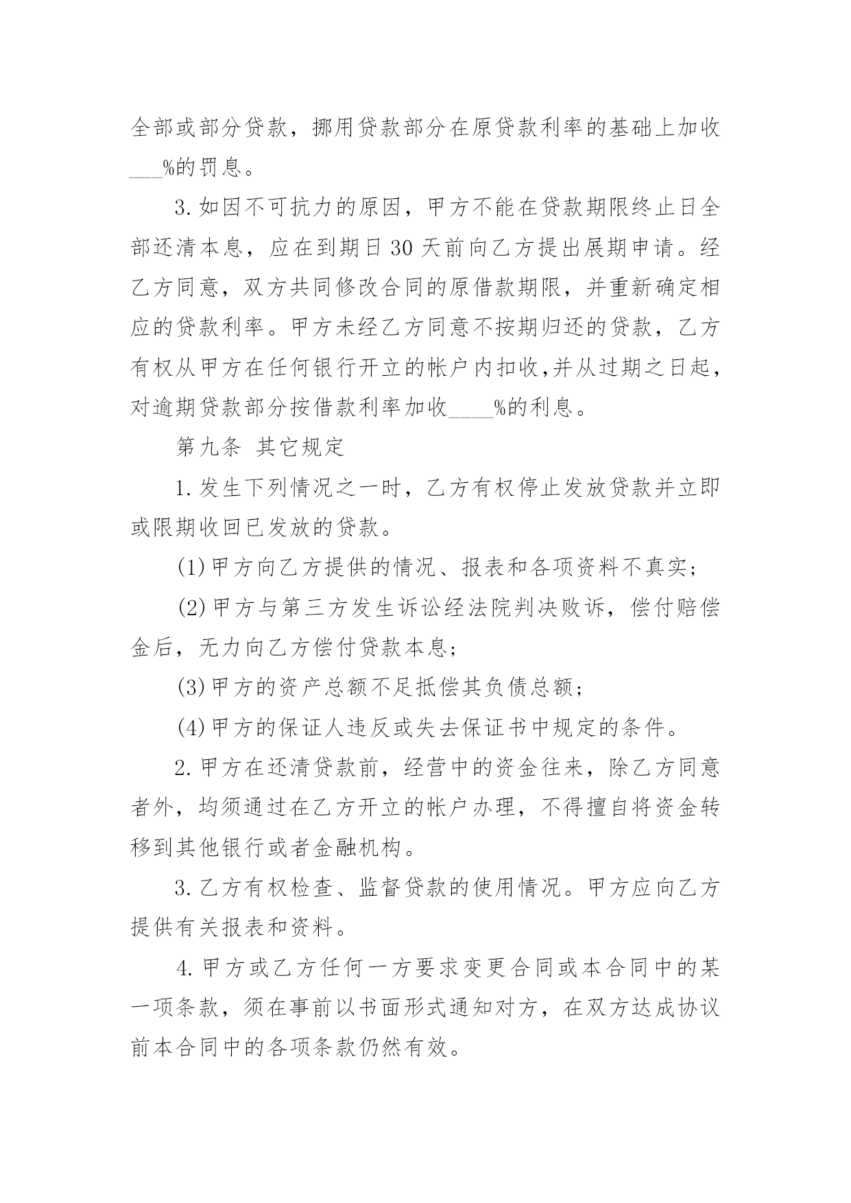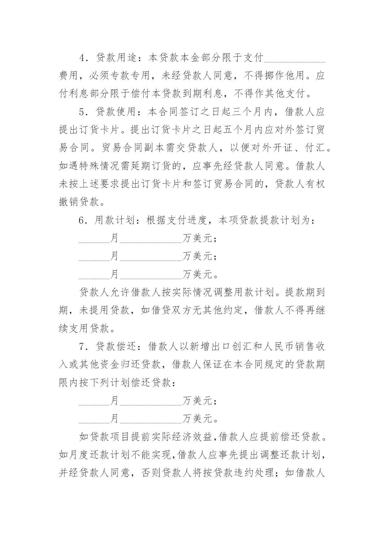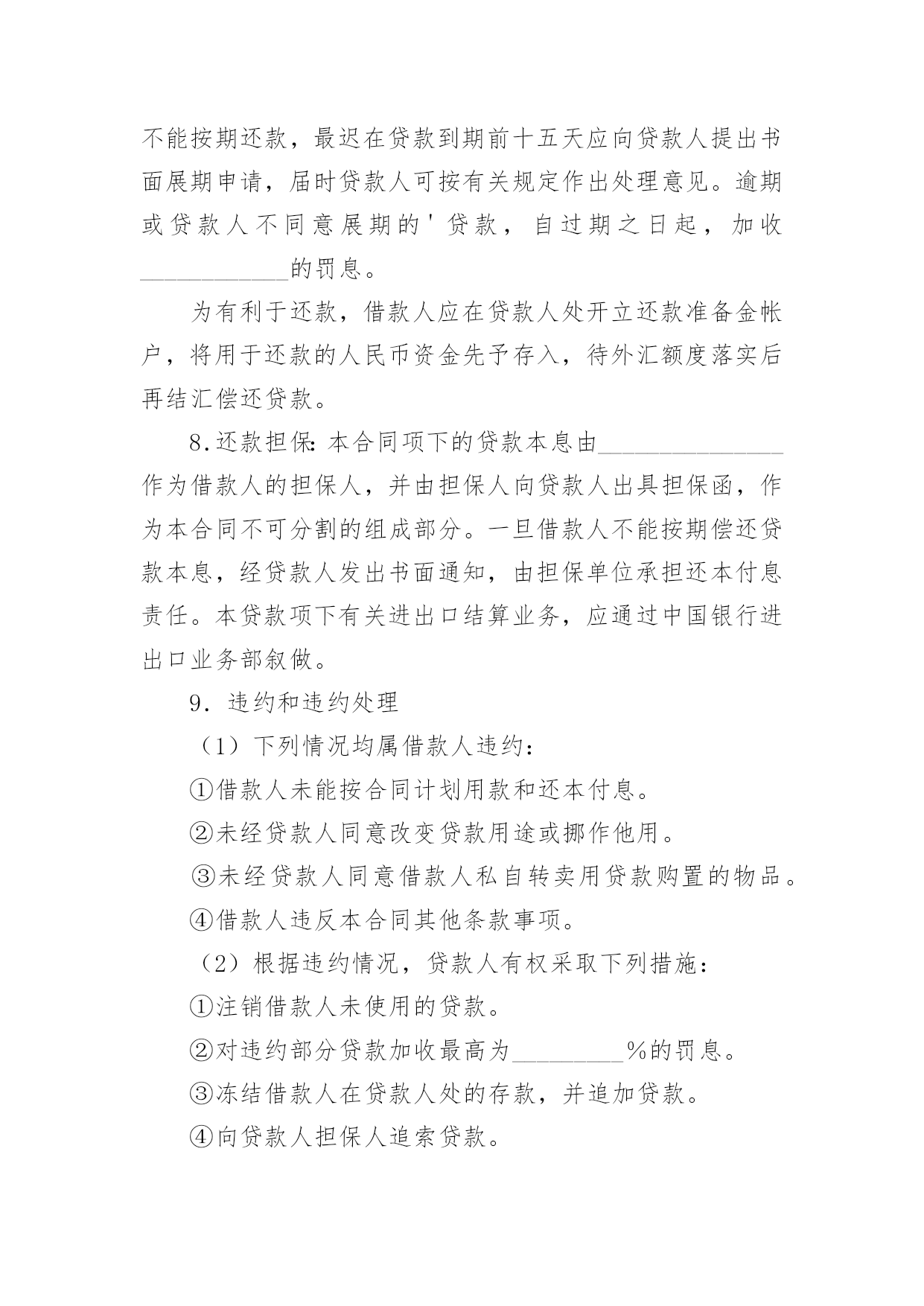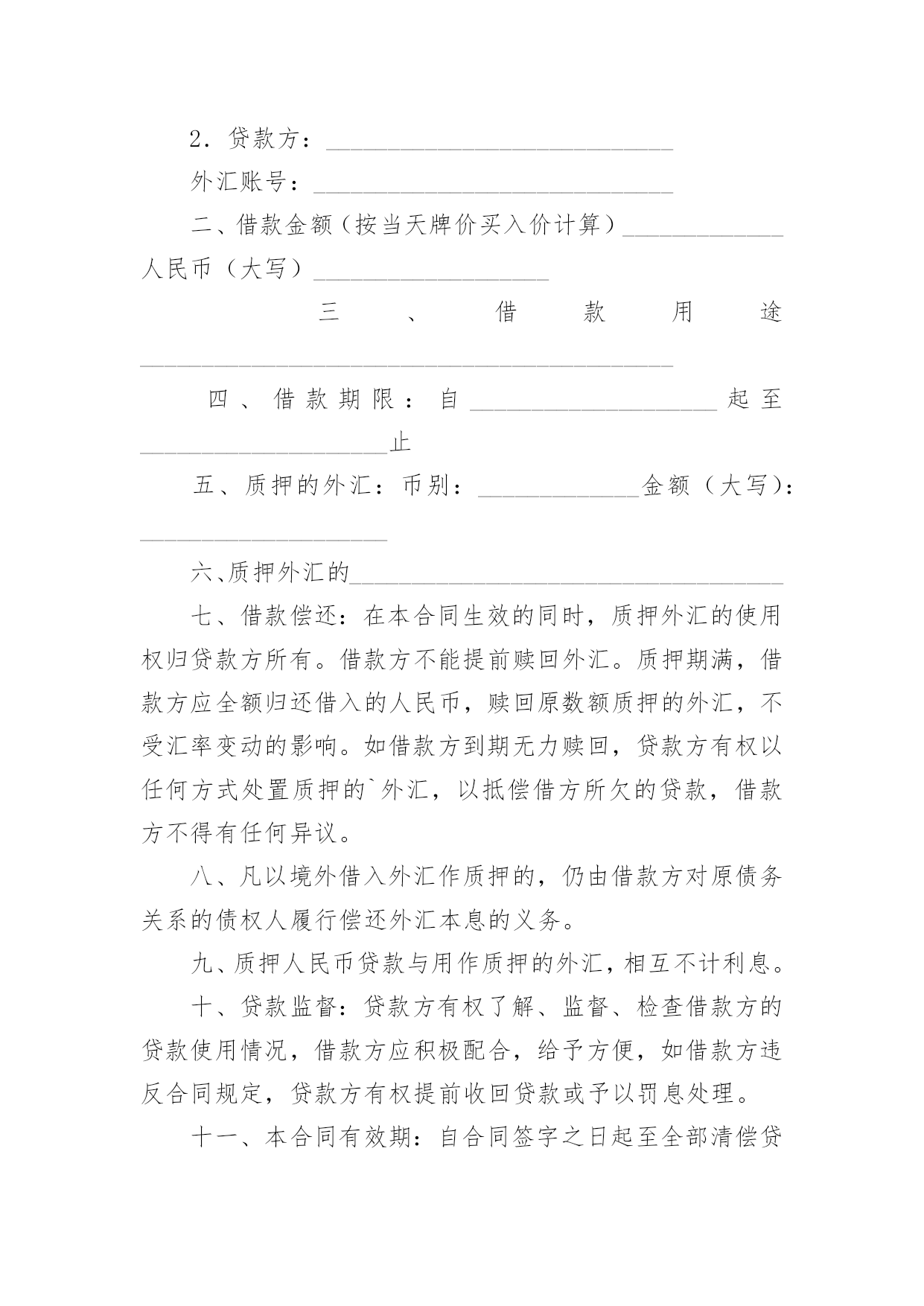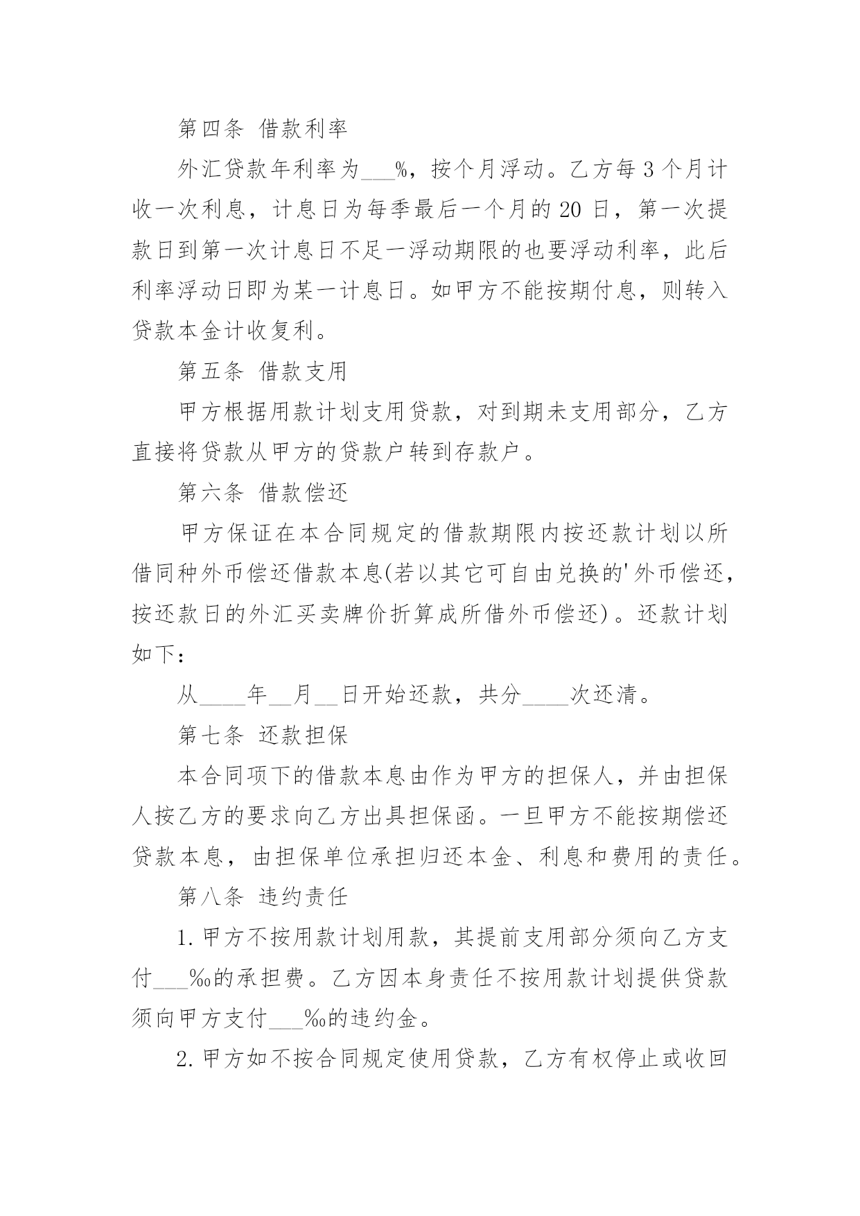 外汇借款合同(精华)外汇借款合同在当今不断发展的世界,人们运用到合同的场合不断增多,合同是企业发展中一个非常重要的因素。合同有不同的类型,当然也有不同的目的,以下是小编整理的外汇借款合同,希望对大家有所帮助。外汇借款合同1借款方:___(简称甲方)贷款方:中国人民建设银行(简称乙方)根据_____号文件批准的项目,所需资金经甲方申请,乙方审查同意发放外汇贷款。双方同意遵照《中华人民共和国合同法》和国务院颁发的《借款合同条例》的规定签订本合同,并共同遵守。第一条借款金额外汇贷款____万美元。第二条借款用途外汇贷款用于_____第三条借款期限____年__月__日至____年__月__日。外汇贷款自第一笔用汇之日起,在___个月之内分期还清全部贷款本息。第四条借款利率外汇贷款年利率为___%,按个月浮动。乙方每3个月计收一次利息,计息日为每季最后一个月的20日,第一次提款日到第一次计息日不足一浮动期限的也要浮动利率,此后利率浮动日即为某一计息日。如甲方不能按期付息,则转入贷款本金计收复利。第五条借款支用甲方根据用款计划支用贷款,对到期未支用部分,乙方直接将贷款从甲方的贷款户转到存款户。第六条借款偿还甲方保证在本合同规定的借款期限内按还款计划以所借同种外币偿还借款本息(若以其它可自由兑换的'外币偿还,按还款日的外汇买卖牌价折算成所借外币偿还)。还款计划如下:从____年__月__日开始还款,共分____次还清。第七条还款担保本合同项下的借款本息由作为甲方的担保人,并由担保人按乙方的要求向乙方出具担保函。一旦甲方不能按期偿还贷款本息,由担保单位承担归还本金、利息和费用的责任。第八条违约责任1.甲方不按用款计划用款,其提前支用部分须向乙方支付___‰的承担费。乙方因本身责任不按用款计划提供贷款须向甲方支付___‰的违约金。2.甲方如不按合同规定使用贷款,乙方有权停止或收回全部或部分贷款,挪用贷款部分在原贷款利率的基础上加收___%的罚息。3.如因不可抗力的原因,甲方不能在贷款期限终止日全部还清本息,应在到期日30天前向乙方提出展期申请。经乙方同意,双方共同修改合同的原借款期限,并重新确定相应的贷款利率。甲方未经乙方同意不按期归还的贷款,乙方有权从甲方在任何银行开立的帐户内扣收,并从过期之日起,对逾期贷款部分按借款利率加收____%的利息。第九条其它规定1.发生下列情况之一时,乙方有权停止发放贷款并立即或限期收回已发放的贷款。(1)甲方向乙方提供的情况、报表和各项资料不真实;(2)甲方与第三方发生诉讼经法院判决败诉,偿付赔偿金后,无力向乙方偿付贷款本息;(3)甲方的资产总额不足抵偿其负债总额;(4)甲方的保证人违反或失去保证书中规定的条件。2.甲方在还清贷款前,经营中的资金往来,除乙方同意者外,均须通过在乙方开立的帐户办理,不得擅自将资金转移到其他银行或者金融机构。3.乙方有权检查、监督贷款的使用情况。甲方应向乙方提供有关报表和资料。4.甲方或乙方任何一方要求变更合同或本合同中的某一项条款,须在事前以书面形式通知对方,在双方达成协议前本合同中的各项条款仍然有效。5.甲方提供的借款申请书、不可撤销担保书、工贸合同(或协议)、用款和还款计划及与合同有关的其它书面材料,均作为本合同的组成部分,与本合同具有同等法律效力。6.本合同一式二份,经双方签字后各执一份,并盖章后生效。贷款方:(公章)借款方:(公章)签字人:(签章)签字人:(签章)外汇借款合同2借款方:________________________________________________地址:____________________邮码:________电话:________贷款方:________________________________________________地址:____________________邮码:________电话:________甲方为引进国外先进技术设备进行技术改造,其项目已经由____批准,特向乙方申请____万美元(或其他外币)外汇贷款。按照贷款办法和有关规定,业经乙方审查同意,为明确经济责任,特签订本借款合同。第一条借款金额:甲方确认向乙方借得现汇____万美元(或其他外币),买方信贷____万美元(或其他外币)。第二条借款期限:现汇____年____月。(从第一次用汇之日起到还清本息止);买方信贷____年____月。按本合同所附的用款计划(略),乙方保证及时提供。如因甲方未按计划用款而造成乙方组织外汇资金的利息损失,甲方按乙方规定支付外汇承担费。第三条借款利息率为年息:现汇为____%(按中国银行总行公布的浮动利率计息);按____月浮动;买方信贷为____%,按____天计算。在借款期间,每半年计息期应计的利息,如甲方未能支