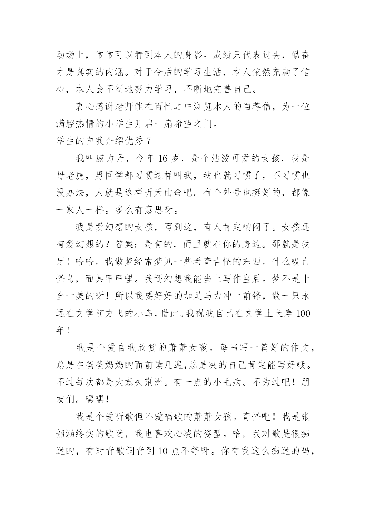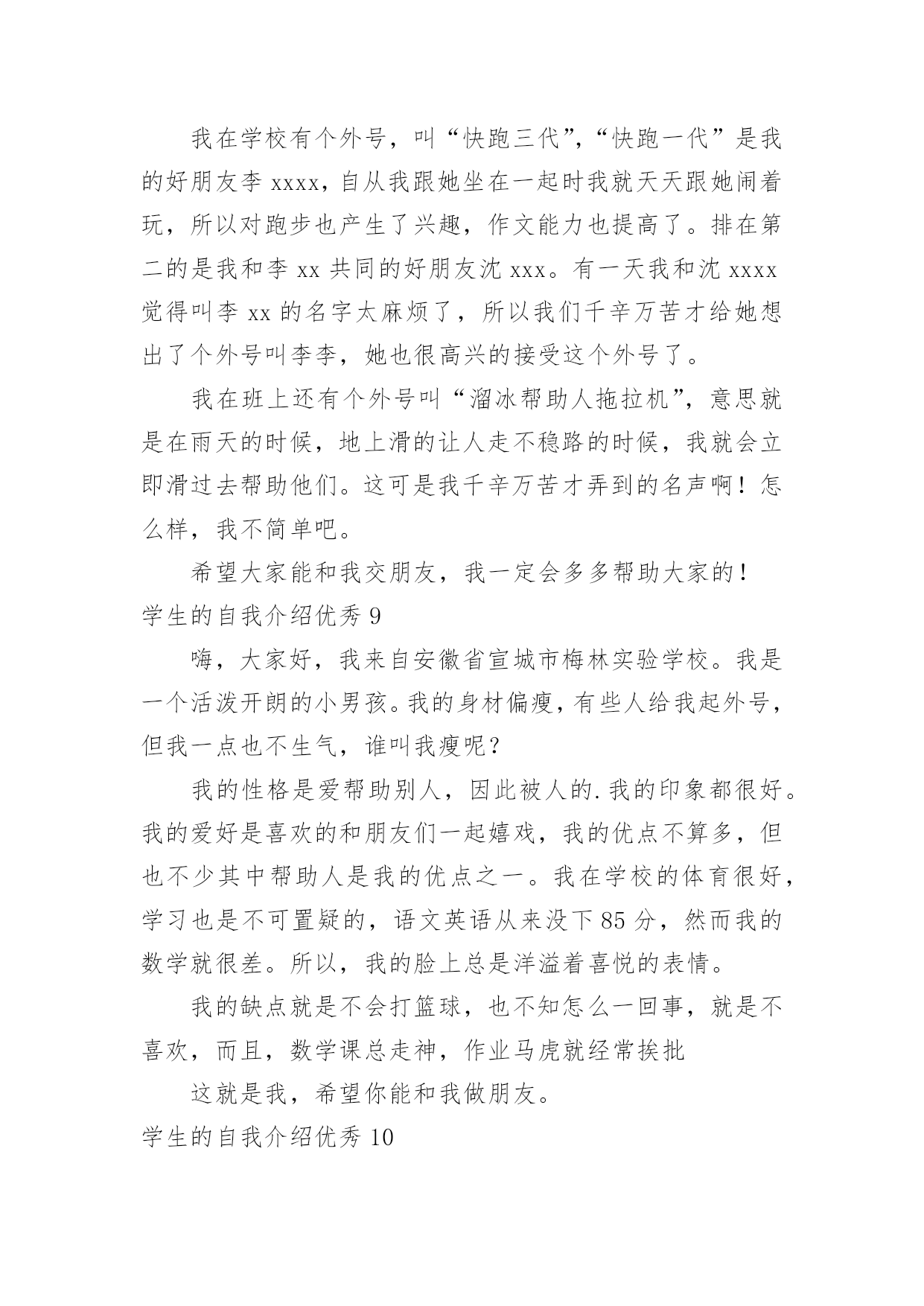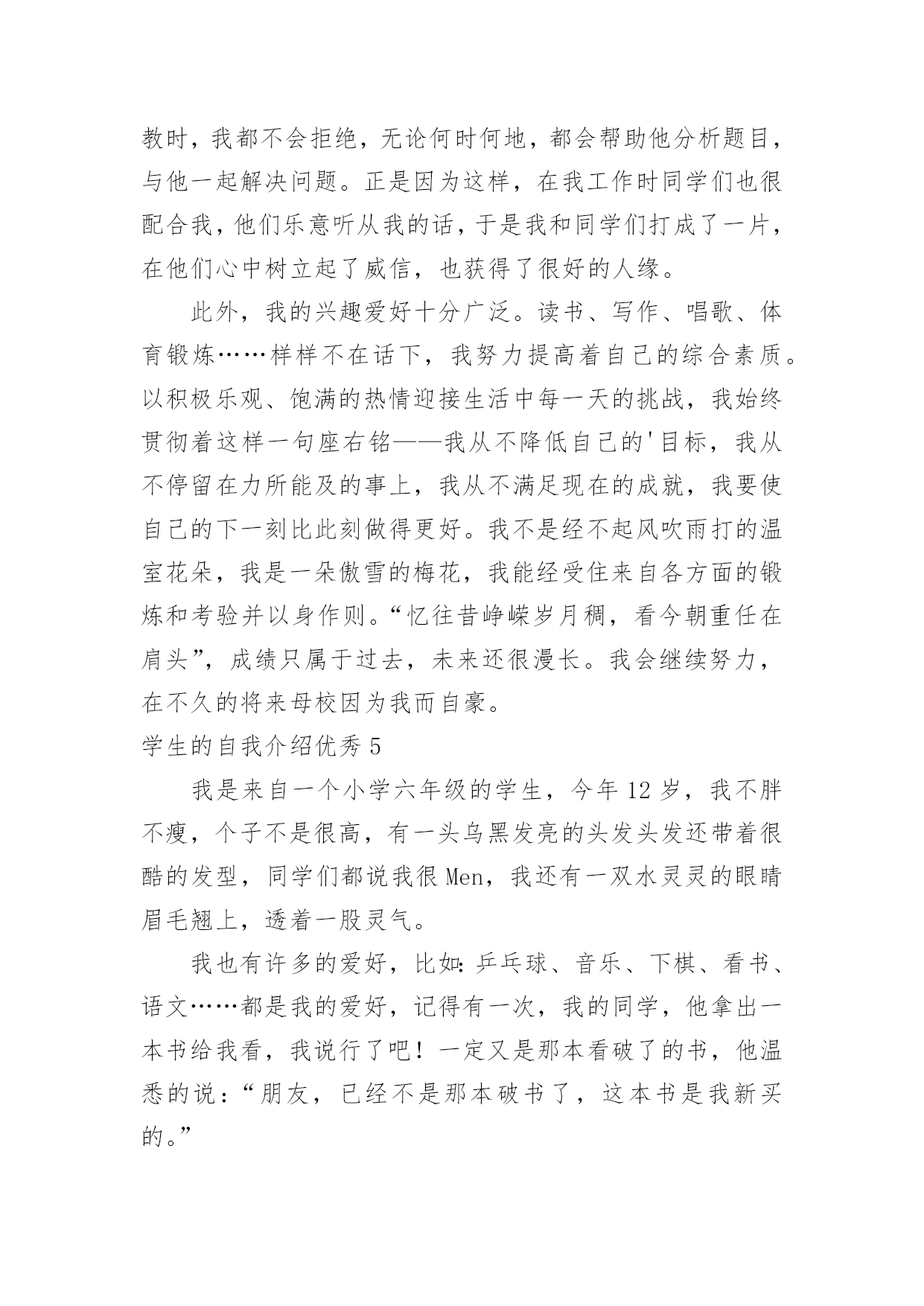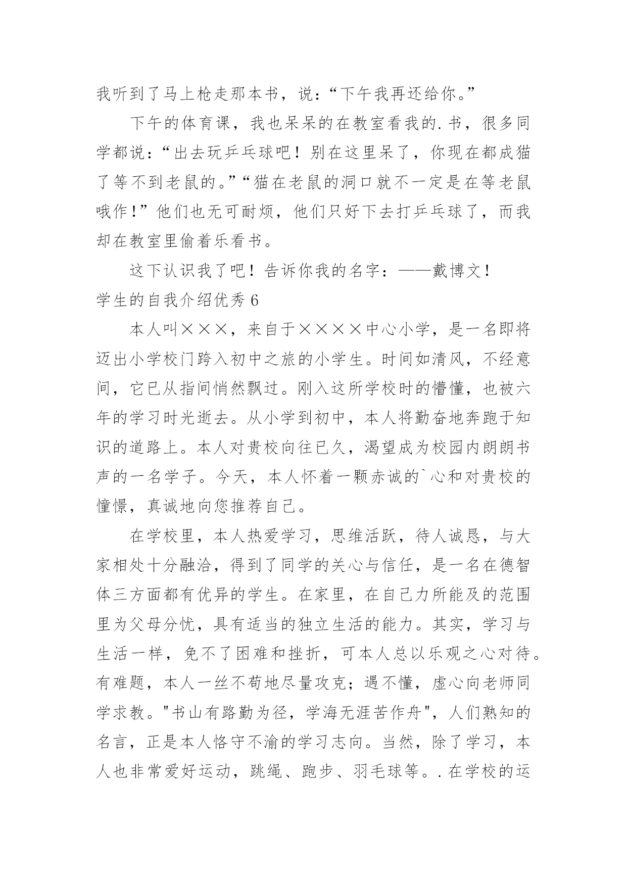 学生的自我介绍优秀学生的自我介绍优秀当换了一个新环境后,进行自我介绍是必不可少的,自我介绍有助于自我宣传、自我展示。那么自我介绍有什么格式呢?下面是小编帮大家整理的学生的自我介绍优秀,欢迎阅读,希望大家能够喜欢。学生的自我介绍优秀1安婧妍,一个活泼、开朗的女孩儿,今年12岁,现在丰南区大齐学校六年级学习,担任六(2)班班长,我是一位品学兼优的好学生。在家中,我乖巧听话,总是想方设法为父母分忧解愁,是父母的好帮手;在学校,我勤奋好学,心系集体,积极参加各项活动且成绩显著,是老师的好助手和同学的好榜样;在社会,我乐于助人,热心公益事业,是传递爱心的小天使。我由衷地希望,因为有我,家庭充满欢笑,班级更加团结,社会更加和谐!我具有强烈的集体荣誉感,凡事以集体利益为先。平时我严以律己,甘于付出,具有较强的'组织管理能力和高度责任心,是老师的得力助手,是班里其他同学的表率。我担任班级干部,经常组织同学出黑板报。学生的自我介绍优秀2我现在6岁半,上一年级了。我很活跃,也很快乐,每天都开开心心的,永远也不感到悲伤。我总爱臭美,比如说刚发了短袖的校服,晚上我就穿上了,还在镜子前扭来扭去。第二天我就穿到学校去了,老师问我冷不冷,我说不冷,但我还是有点冷。我的.爱好是看书、弹古筝、画画和跳舞。我最喜欢看书了,要是星期五的阅读课没上的话,那真是糟糕透了。我喜欢的小动物是小白兔和梅花鹿,因为它们长得很可爱,还不吃人。它们吃的青草我也很喜欢吃,因为绿色的东西可以帮助我们消除眼睛的疲劳。我害怕的动物是蛇,可是妈妈说我们这里没有蛇,不用害怕。我好爱我自己呀,我也不知道我为什么会这么爱自己。学生的自我介绍优秀3我叫袁瑞,今年10岁,你知道爸爸为什么给我起这个名字吗?是因为那是冬天下的第一场雪,所以叫袁瑞.我有一头乌黑的头发,弯弯的眉毛像一张弓,圆溜溜的'眼睛嘟噜嘟噜地直转,一个小小的鼻子和樱桃似的小嘴形成了活泼可爱的我.我有一个缺点,就是钢笔字老是写不好,世界上恐怕没有一个生下来就能写好的,字写的好都是后天练出来的记得有一次,那是星期六的事了,杨老师布置了很多作业,都得拿钢笔写,这下可把我急坏了,晚上我吃过晚饭,刷完牙,就去写作业了,可妈妈偏偏又把电视打开了,我在房间里听见了我最爱看的大型动画片我就是这样一个天真浪漫,活泼可爱的人.学生的自我介绍优秀4我是一名勤奋好学、活泼可爱的女生,在班级中人缘极好,具有较高的声望。在学习上,我勤奋踏实,能一步一个脚印地做好自己的本职工作。每当上课时,我总能端端正正地坐好,专心致志地听刘老师讲课。刘老师每提一个问题,我都能认真思考,积极发言。课余时,我也没有一丝松懈,任然抓紧一切时间学习,认真完成作业,并且作业的字迹总是写得很美观,正确率也很高。写完作业,我便马上沉浸在书地海洋里,不断地充实自己的课外知识,我把读书当成一种爱好,坚持不懈,每天睡前读书30分钟更是我久已养成的习惯,至今我已经读过的书有《格林童话》、《淘气包马小跳》全集、《窗边的小豆豆》、《伊索寓言》、《昆虫记》……所有这些,不仅拓宽了我的知识面,同时很好的扩大了我的识字量,也极大地提高了我的写作能力,现在我的每一篇作文都能得到刘老师的好评。我还代表我们学校两次参加了武进区的作文竞赛,并两次获得了三等奖。正因为这样,我在班级中的各项功课都名列前茅,每学期都被评为“三好学生”,还获得了“常州市四好少年”的称号等。在班级中,我对工作认真负责,是刘老师的小助手,同学们的小刘老师。刘老师不在时,我总是能负责管理好班级纪律,安排同学们自学。当同学们在学习上遇到困难向我请教时,我都不会拒绝,无论何时何地,都会帮助他分析题目,与他一起解决问题。正是因为这样,在我工作时同学们也很配合我,他们乐意听从我的话,于是我和同学们打成了一片,在他们心中树立起了威信,也获得了很好的人缘。此外,我的兴趣爱好十分广泛。读书、写作、唱歌、体育锻炼……样样不在话下,我努力提高着自己的综合素质。以积极乐观、饱满的热情迎接生活中每一天的挑战,我始终贯彻着这样一句座右铭——我从不降低自己的'目标,我从不停留在力所能及的事上,我从不满足现在的成就,我要使自己的下一刻比此刻做得更好。我不是经不起风吹雨打的温室花朵,我是一朵傲雪的梅花,我能经受住来自各方面的锻炼和考验并以身作则。“忆往昔峥嵘岁月稠,看今朝重任在肩头”,成绩只属于过去,未来还很漫长。我会继续努力,在不久的将来母校因为我而自豪。学生的自我介绍优秀5我是来自一个小学六年级的学生,今年12岁,我不胖不瘦,个子不是很高,有一头乌黑发亮的头发头发还带着很酷的发型,同学们都说我很Men,我还有一双水灵灵的眼睛眉毛翘上,透着一股灵气。我也有许多的爱好,比如:乒乓球、音乐、下棋、看书、语文……都是我的爱好,记得有一次,我的同学,他拿出一本书给我看,我说行了