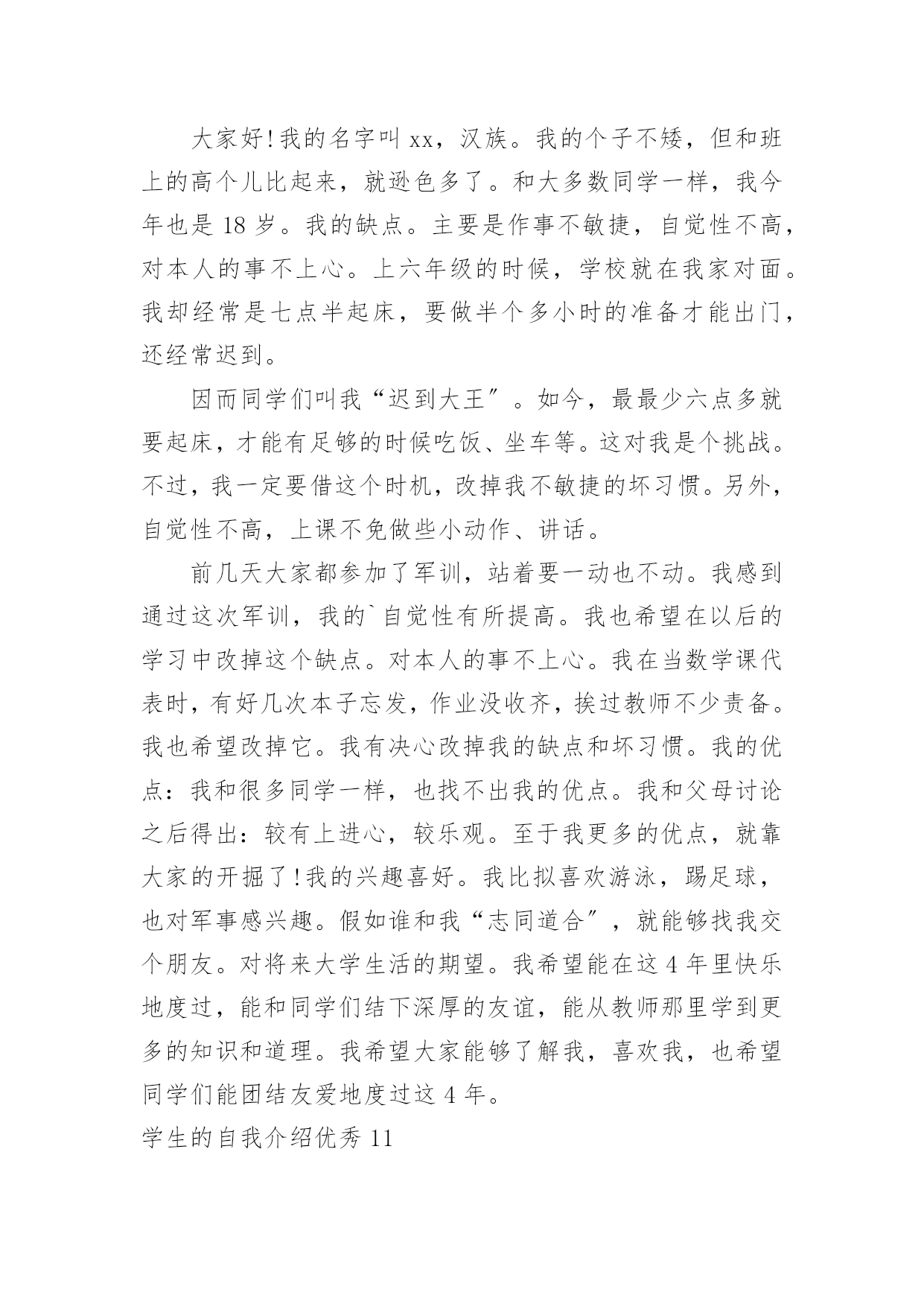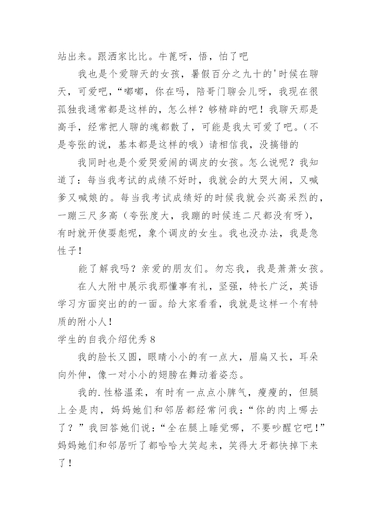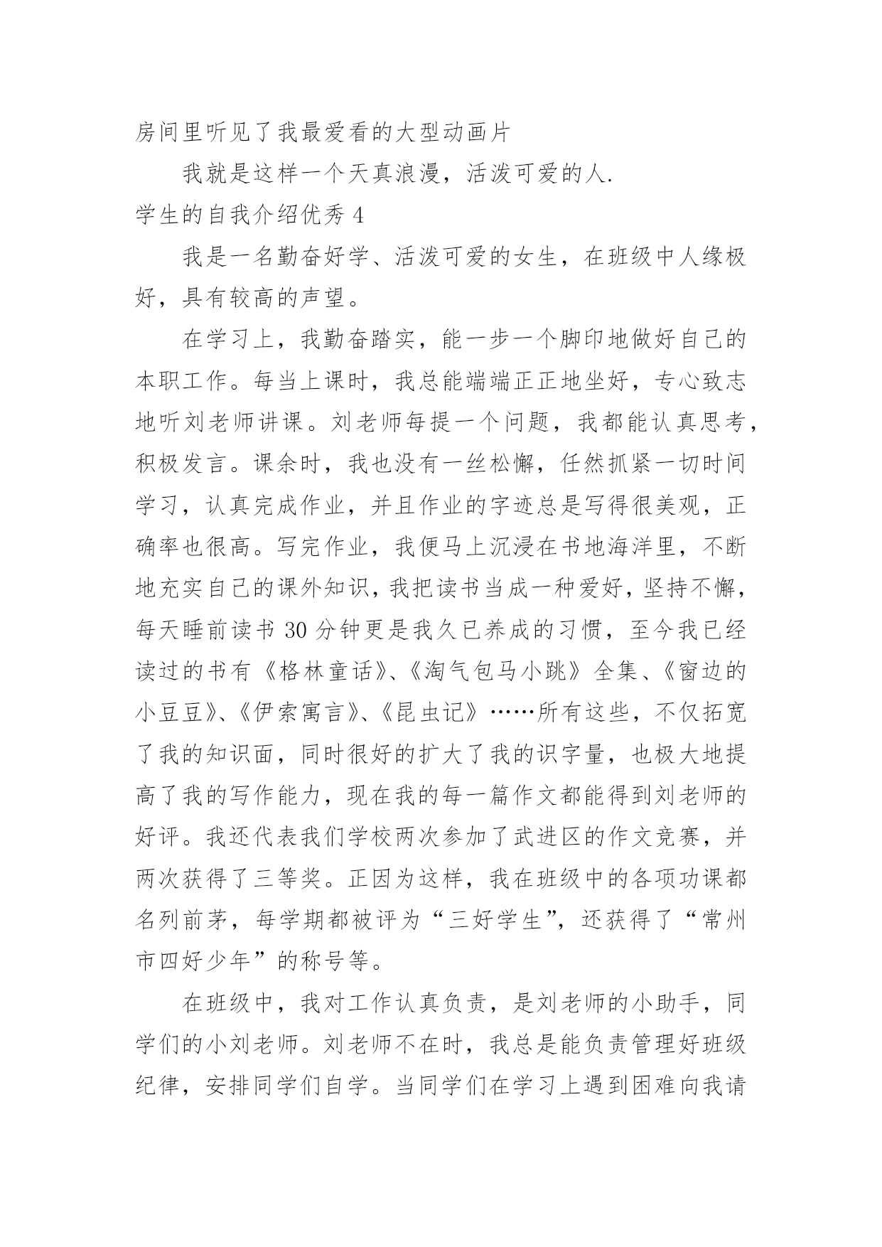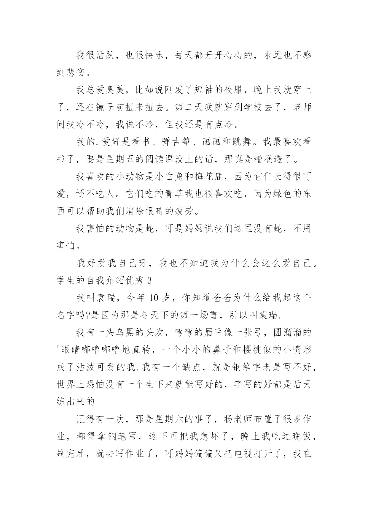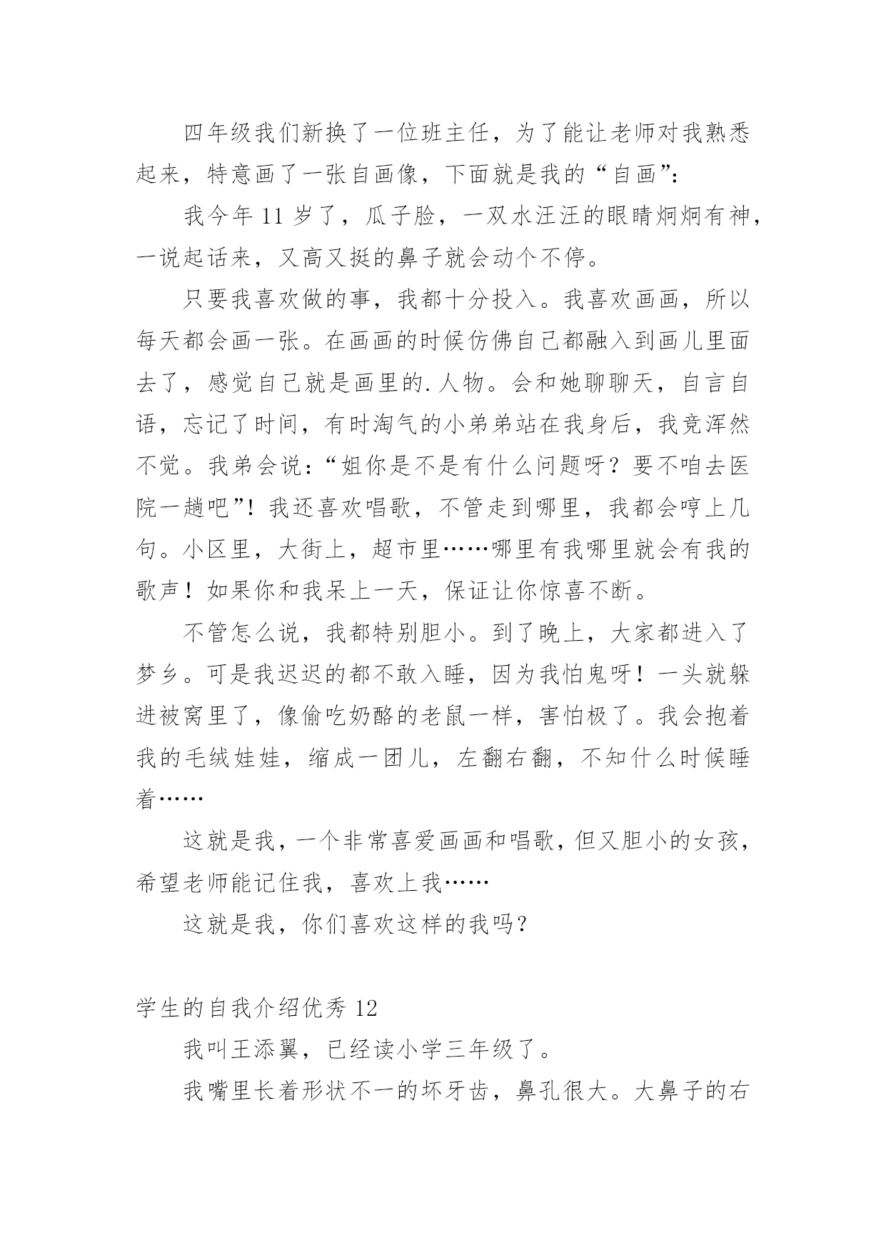 学生的自我介绍优秀学生的自我介绍优秀当换了一个新环境后,进行自我介绍是必不可少的,自我介绍有助于自我宣传、自我展示。那么自我介绍有什么格式呢?下面是小编帮大家整理的学生的自我介绍优秀,欢迎阅读,希望大家能够喜欢。学生的自我介绍优秀1安婧妍,一个活泼、开朗的女孩儿,今年12岁,现在丰南区大齐学校六年级学习,担任六(2)班班长,我是一位品学兼优的好学生。在家中,我乖巧听话,总是想方设法为父母分忧解愁,是父母的好帮手;在学校,我勤奋好学,心系集体,积极参加各项活动且成绩显著,是老师的好助手和同学的好榜样;在社会,我乐于助人,热心公益事业,是传递爱心的小天使。我由衷地希望,因为有我,家庭充满欢笑,班级更加团结,社会更加和谐!我具有强烈的集体荣誉感,凡事以集体利益为先。平时我严以律己,甘于付出,具有较强的'组织管理能力和高度责任心,是老师的得力助手,是班里其他同学的表率。我担任班级干部,经常组织同学出黑板报。学生的自我介绍优秀2我现在6岁半,上一年级了。我很活跃,也很快乐,每天都开开心心的,永远也不感到悲伤。我总爱臭美,比如说刚发了短袖的校服,晚上我就穿上了,还在镜子前扭来扭去。第二天我就穿到学校去了,老师问我冷不冷,我说不冷,但我还是有点冷。我的.爱好是看书、弹古筝、画画和跳舞。我最喜欢看书了,要是星期五的阅读课没上的话,那真是糟糕透了。我喜欢的小动物是小白兔和梅花鹿,因为它们长得很可爱,还不吃人。它们吃的青草我也很喜欢吃,因为绿色的东西可以帮助我们消除眼睛的疲劳。我害怕的动物是蛇,可是妈妈说我们这里没有蛇,不用害怕。我好爱我自己呀,我也不知道我为什么会这么爱自己。学生的自我介绍优秀3我叫袁瑞,今年10岁,你知道爸爸为什么给我起这个名字吗?是因为那是冬天下的第一场雪,所以叫袁瑞.我有一头乌黑的头发,弯弯的眉毛像一张弓,圆溜溜的'眼睛嘟噜嘟噜地直转,一个小小的鼻子和樱桃似的小嘴形成了活泼可爱的我.我有一个缺点,就是钢笔字老是写不好,世界上恐怕没有一个生下来就能写好的,字写的好都是后天练出来的记得有一次,那是星期六的事了,杨老师布置了很多作业,都得拿钢笔写,这下可把我急坏了,晚上我吃过晚饭,刷完牙,就去写作业了,可妈妈偏偏又把电视打开了,我在房间里听见了我最爱看的大型动画片我就是这样一个天真浪漫,活泼可爱的人.学生的自我介绍优秀4我是一名勤奋好学、活泼可爱的女生,在班级中人缘极好,具有较高的声望。在学习上,我勤奋踏实,能一步一个脚印地做好自己的本职工作。每当上课时,我总能端端正正地坐好,专心致志地听刘老师讲课。刘老师每提一个问题,我都能认真思考,积极发言。课余时,我也没有一丝松懈,任然抓紧一切时间学习,认真完成作业,并且作业的字迹总是写得很美观,正确率也很高。写完作业,我便马上沉浸在书地海洋里,不断地充实自己的课外知识,我把读书当成一种爱好,坚持不懈,每天睡前读书30分钟更是我久已养成的习惯,至今我已经读过的书有《格林童话》、《淘气包马小跳》全集、《窗边的小豆豆》、《伊索寓言》、《昆虫记》……所有这些,不仅拓宽了我的知识面,同时很好的扩大了我的识字量,也极大地提高了我的写作能力,现在我的每一篇作文都能得到刘老师的好评。我还代表我们学校两次参加了武进区的作文竞赛,并两次获得了三等奖。正因为这样,我在班级中的各项功课都名列前茅,每学期都被评为“三好学生”,还获得了“常州市四好少年”的称号等。在班级中,我对工作认真负责,是刘老师的小助手,同学们的小刘老师。刘老师不在时,我总是能负责管理好班级纪律,安排同学们自学。当同学们在学习上遇到困难向我请教时,我都不会拒绝,无论何时何地,都会帮助他分析题目,与他一起解决问题。正是因为这样,在我工作时同学们也很配合我,他们乐意听从我的话,于是我和同学们打成了一片,在他们心中树立起了威信,也获得了很好的人缘。此外,我的兴趣爱好十分广泛。读书、写作、唱歌、体育锻炼……样样不在话下,我努力提高着自己的综合素质。以积极乐观、饱满的热情迎接生活中每一天的挑战,我始终贯彻着这样一句座右铭——我从不降低自己的'目标,我从不停留在力所能及的事上,我从不满足现在的成就,我要使自己的下一刻比此刻做得更好。我不是经不起风吹雨打的温室花朵,我是一朵傲雪的梅花,我能经受住来自各方面的锻炼和考验并以身作则。“忆往昔峥嵘岁月稠,看今朝重任在肩头”,成绩只属于过去,未来还很漫长。我会继续努力,在不久的将来母校因为我而自豪。学生的自我介绍优秀5我是来自一个小学六年级的学生,今年12岁,我不胖不瘦,个子不是很高,有一头乌黑发亮的头发头发还带着很酷的发型,同学们都说我很Men,我还有一双水灵灵的眼睛眉毛翘上,透着一股灵气。我也有许多的爱好,比如:乒乓球、音乐、下棋、看书、语文……都是我的爱好,记得有一次,我的同学,他拿出一本书给我看,我说行了