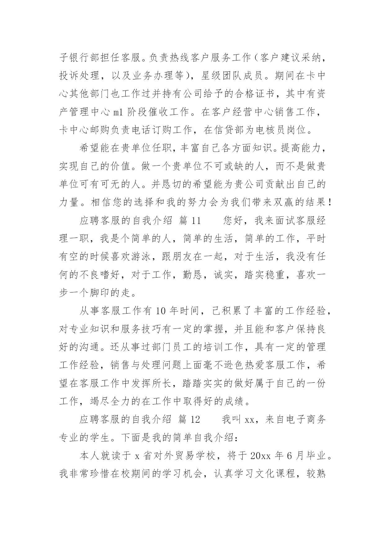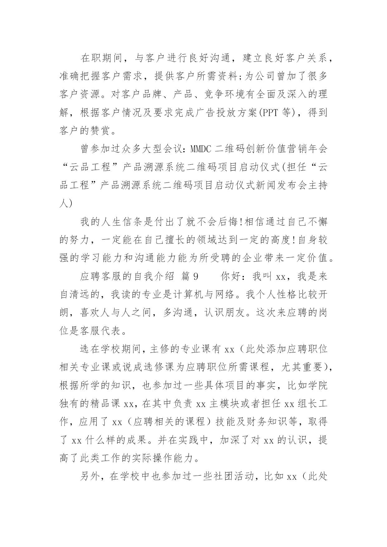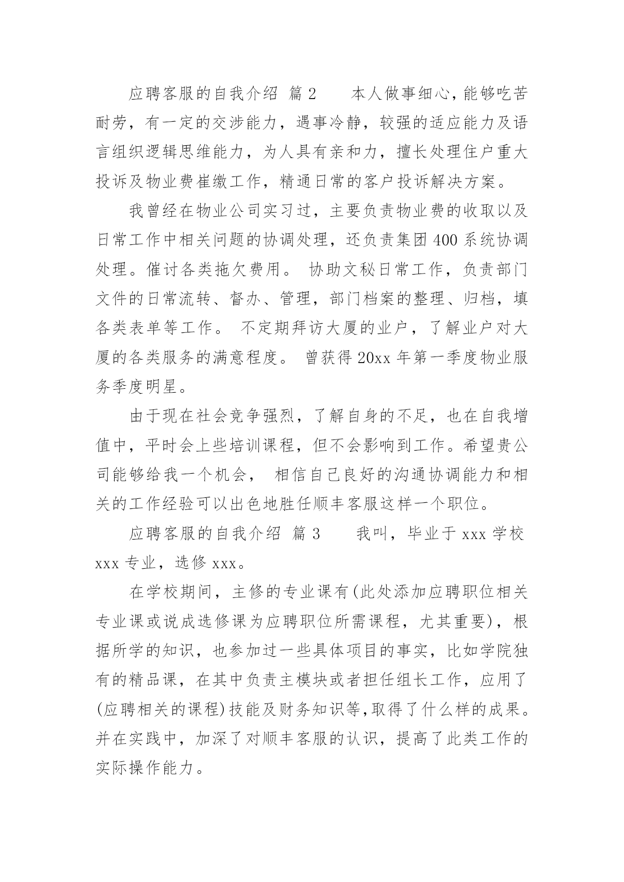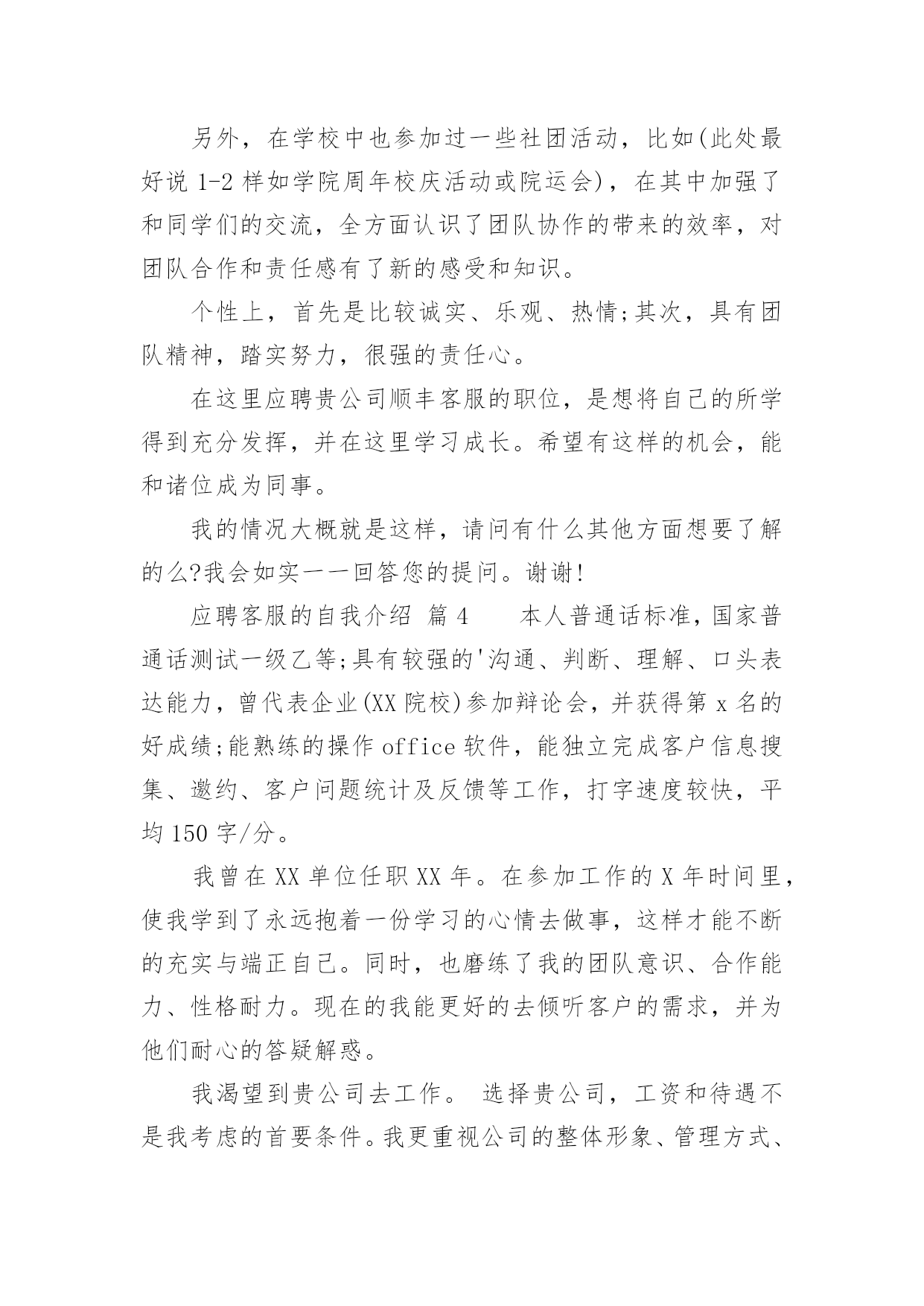 应聘客服的自我介绍应聘客服的自我介绍(精选14篇)来到一个新的地方后,时常需要我们进行一个自我介绍,自我介绍是人与人进行沟通的出发点。那么自我介绍有什么格式呢?以下是小编为大家收集的应聘客服的自我介绍,欢迎大家借鉴与参考,希望对大家有所帮助。应聘客服的自我介绍篇1我是一个开朗大方,性格外向,每做一件事情都要求最好,能刻苦成担每一件事情。在校表现良好,担任班科代,生活委员,在学生会担任学习部事务,在社团部担任干事,工作要求做到最满意一做就做到最好,自觉服从公司要求和纪律,熟悉运用本专业知识,掌握课外知识本能,带着激情去工作,可在短时间内接受新的环境及事物实习期间,我的工作主要是解答顺丰客服拔打上来的投拆电话,我认为首先要认同客户要求,根据用户提出的问题进行解答,要使用户得到合理的答案。还参与经理实施的奖励政策,通过实施和有效沟通,成功促成6家加盟客户开分店,4家加盟客户介绍朋友/亲戚与公司合作。我坚信,自己学到的知识和勤奋努力都将取得收获,请给我一个机会,我将为公司的发展贡献自己的一份力量。总之,我觉得自己各方面都很适合担任顺丰客服这份工作。应聘客服的自我介绍篇2本人做事细心,能够吃苦耐劳,有一定的交涉能力,遇事冷静,较强的适应能力及语言组织逻辑思维能力,为人具有亲和力,擅长处理住户重大投诉及物业费崔缴工作,精通日常的客户投诉解决方案。我曾经在物业公司实习过,主要负责物业费的收取以及日常工作中相关问题的协调处理,还负责集团400系统协调处理。催讨各类拖欠费用。协助文秘日常工作,负责部门文件的日常流转、督办、管理,部门档案的整理、归档,填各类表单等工作。不定期拜访大厦的业户,了解业户对大厦的各类服务的满意程度。曾获得20xx年第一季度物业服务季度明星。由于现在社会竞争强烈,了解自身的不足,也在自我增值中,平时会上些培训课程,但不会影响到工作。希望贵公司能够给我一个机会,相信自己良好的沟通协调能力和相关的工作经验可以出色地胜任顺丰客服这样一个职位。应聘客服的自我介绍篇3我叫,毕业于xxx学校xxx专业,选修xxx。在学校期间,主修的专业课有(此处添加应聘职位相关专业课或说成选修课为应聘职位所需课程,尤其重要),根据所学的知识,也参加过一些具体项目的事实,比如学院独有的精品课,在其中负责主模块或者担任组长工作,应用了(应聘相关的课程)技能及财务知识等,取得了什么样的成果。并在实践中,加深了对顺丰客服的认识,提高了此类工作的实际操作能力。另外,在学校中也参加过一些社团活动,比如(此处最好说1-2样如学院周年校庆活动或院运会),在其中加强了和同学们的交流,全方面认识了团队协作的带来的效率,对团队合作和责任感有了新的感受和知识。个性上,首先是比较诚实、乐观、热情;其次,具有团队精神,踏实努力,很强的责任心。在这里应聘贵公司顺丰客服的职位,是想将自己的所学得到充分发挥,并在这里学习成长。希望有这样的机会,能和诸位成为同事。我的情况大概就是这样,请问有什么其他方面想要了解的么?我会如实一一回答您的提问。谢谢!应聘客服的自我介绍篇4本人普通话标准,国家普通话测试一级乙等;具有较强的'沟通、判断、理解、口头表达能力,曾代表企业(XX院校)参加辩论会,并获得第x名的好成绩;能熟练的操作office软件,能独立完成客户信息搜集、邀约、客户问题统计及反馈等工作,打字速度较快,平均150字/分。我曾在XX单位任职XX年。在参加工作的X年时间里,使我学到了永远抱着一份学习的心情去做事,这样才能不断的充实与端正自己。同时,也磨练了我的团队意识、合作能力、性格耐力。现在的我能更好的去倾听客户的需求,并为他们耐心的答疑解惑。我渴望到贵公司去工作。选择贵公司,工资和待遇不是我考虑的首要条件。我更重视公司的整体形象、管理方式、员工的士气及工作气氛。我相信贵公司正是我所追求的理想目标。我很自信地向您承诺:选择我,您绝不会后悔。应聘客服的自我介绍篇5我是大专毕业应届生,三年间求学问的同时我也从不忘记求品,保持一颗善良的心,正直的心,修心修品是求学问的基础。在客服主管这个岗位实习一年,使我明白:勤奋、能吃苦,自我激励,自学能力,才能不断提升个人的综合素质和个人的情操。培养了我的团队合作能力,明白个人能力有限,团队潜力无限的道理。同时我也明白了一个道理:有为才有位,更才有得。社会竞争激烈,压力逐年增大,天道酬勤的人总会顺势努力而上,乐于敬业。未来,我以这样的原则时刻要求自己,不屈服、不退缩!在最美的年华,不浪费青春,石穿般修行,静待花开绽放的季节!希望公司给我这个机会,我相信我能够在客服主管岗位上做到更好。本人刻苦努力,也不缺乏活动和交际能力。在校学习努力认真,掌握了金融方面的知识。在金融领域,有扎实的理论基础和实践经验,三年综合排名第八,三年平均成绩为82.3,三年平均
