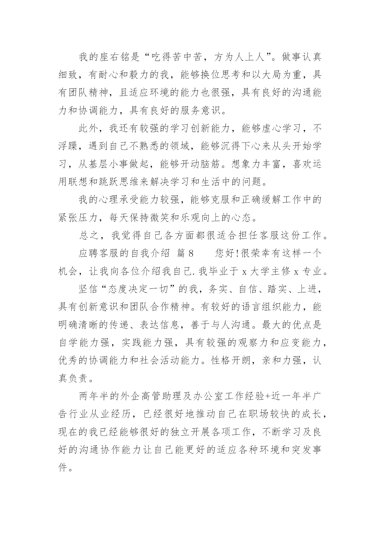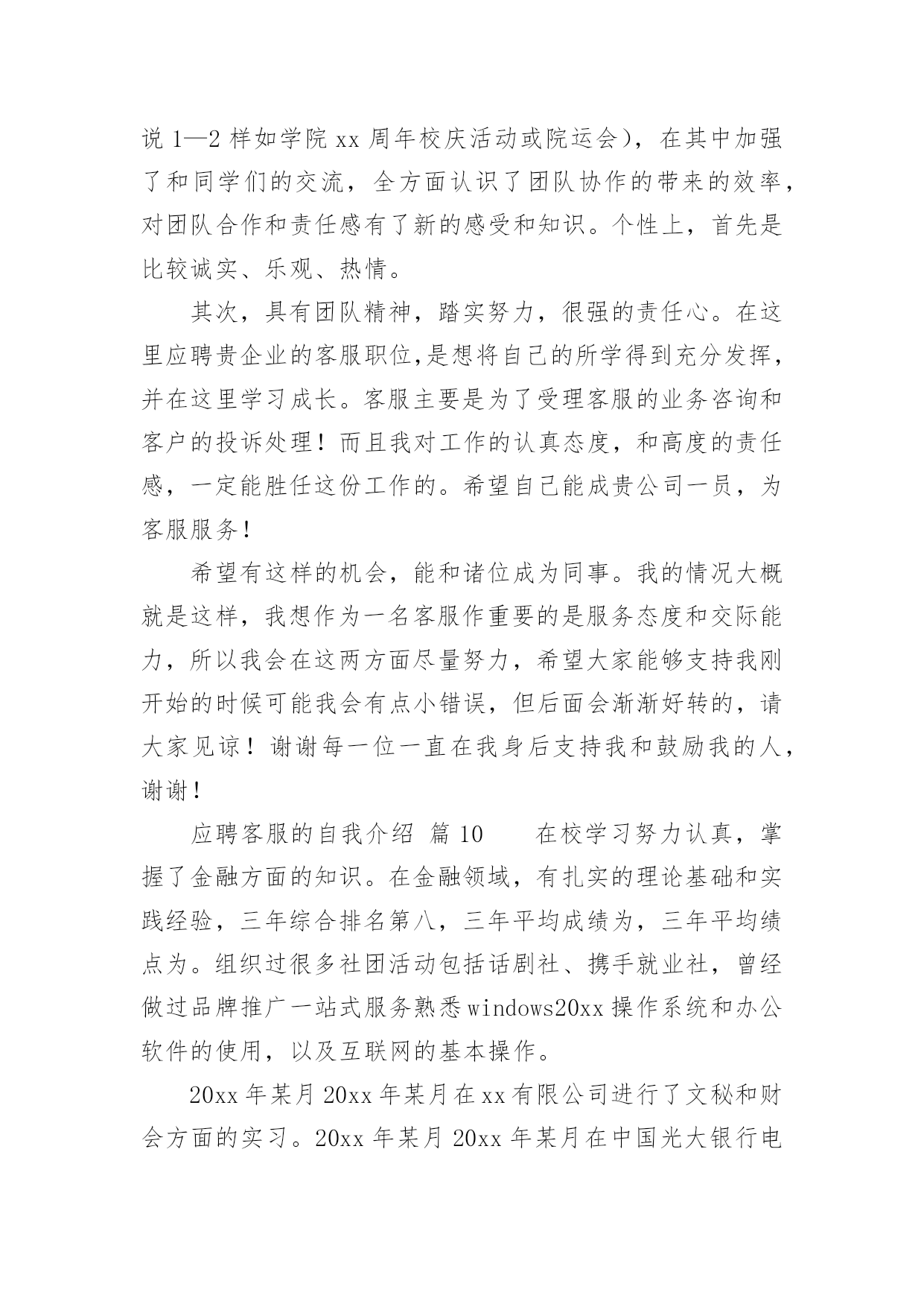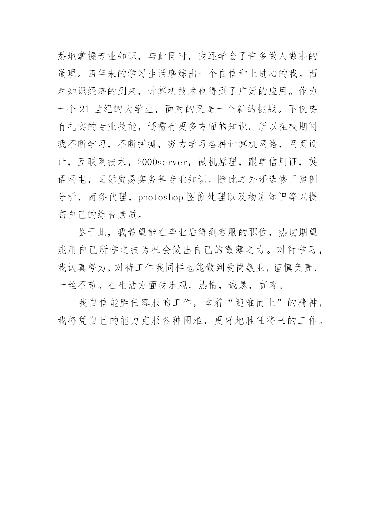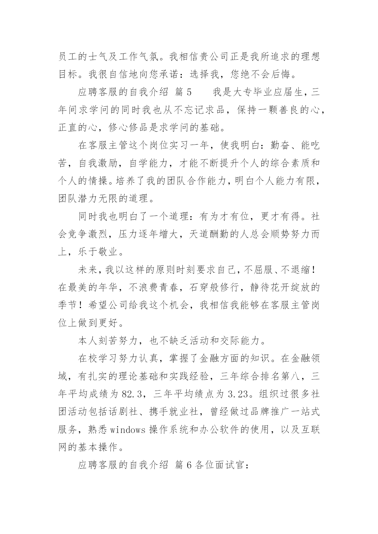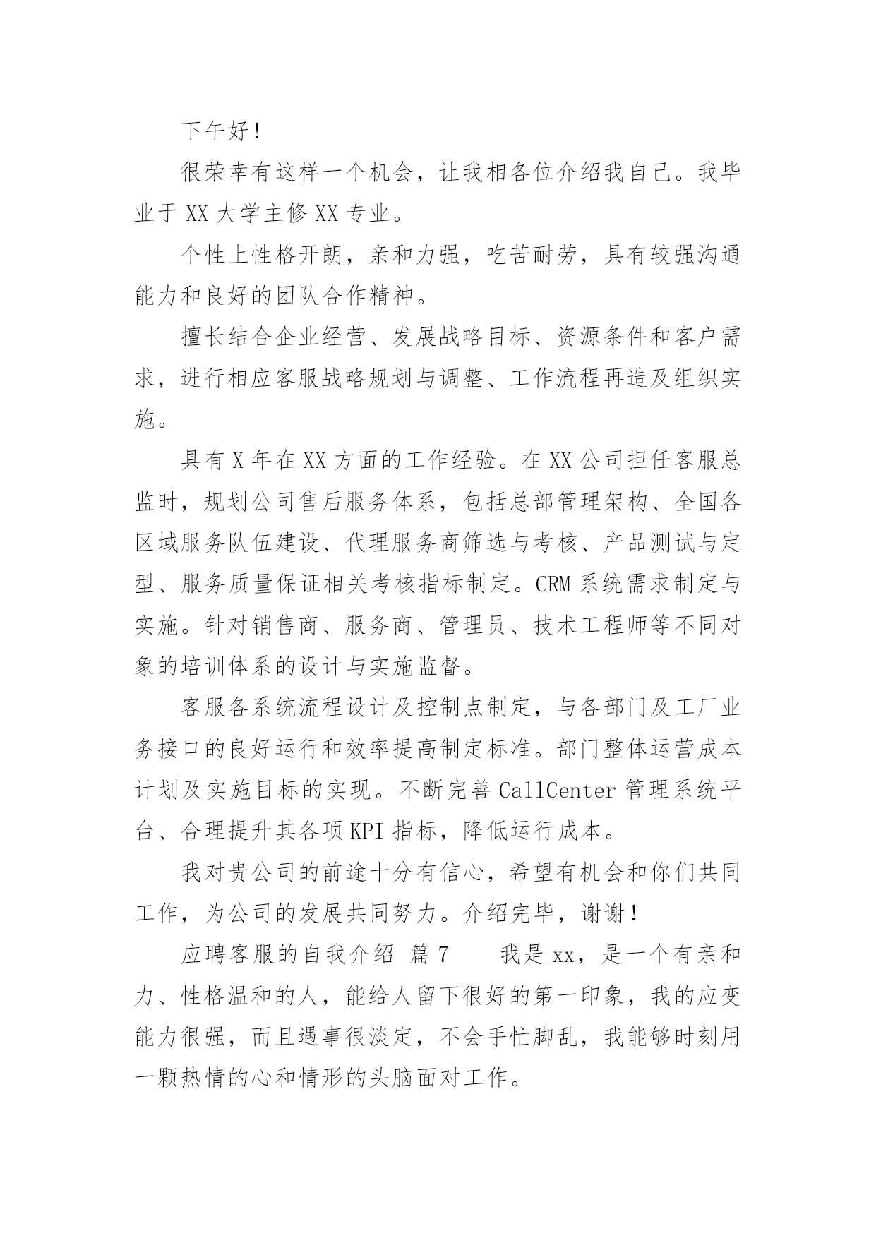 应聘客服的自我介绍应聘客服的自我介绍(精选14篇)来到一个新的地方后,时常需要我们进行一个自我介绍,自我介绍是人与人进行沟通的出发点。那么自我介绍有什么格式呢?以下是小编为大家收集的应聘客服的自我介绍,欢迎大家借鉴与参考,希望对大家有所帮助。应聘客服的自我介绍篇1我是一个开朗大方,性格外向,每做一件事情都要求最好,能刻苦成担每一件事情。在校表现良好,担任班科代,生活委员,在学生会担任学习部事务,在社团部担任干事,工作要求做到最满意一做就做到最好,自觉服从公司要求和纪律,熟悉运用本专业知识,掌握课外知识本能,带着激情去工作,可在短时间内接受新的环境及事物实习期间,我的工作主要是解答顺丰客服拔打上来的投拆电话,我认为首先要认同客户要求,根据用户提出的问题进行解答,要使用户得到合理的答案。还参与经理实施的奖励政策,通过实施和有效沟通,成功促成6家加盟客户开分店,4家加盟客户介绍朋友/亲戚与公司合作。我坚信,自己学到的知识和勤奋努力都将取得收获,请给我一个机会,我将为公司的发展贡献自己的一份力量。总之,我觉得自己各方面都很适合担任顺丰客服这份工作。应聘客服的自我介绍篇2本人做事细心,能够吃苦耐劳,有一定的交涉能力,遇事冷静,较强的适应能力及语言组织逻辑思维能力,为人具有亲和力,擅长处理住户重大投诉及物业费崔缴工作,精通日常的客户投诉解决方案。我曾经在物业公司实习过,主要负责物业费的收取以及日常工作中相关问题的协调处理,还负责集团400系统协调处理。催讨各类拖欠费用。协助文秘日常工作,负责部门文件的日常流转、督办、管理,部门档案的整理、归档,填各类表单等工作。不定期拜访大厦的业户,了解业户对大厦的各类服务的满意程度。曾获得20xx年第一季度物业服务季度明星。由于现在社会竞争强烈,了解自身的不足,也在自我增值中,平时会上些培训课程,但不会影响到工作。希望贵公司能够给我一个机会,相信自己良好的沟通协调能力和相关的工作经验可以出色地胜任顺丰客服这样一个职位。应聘客服的自我介绍篇3我叫,毕业于xxx学校xxx专业,选修xxx。在学校期间,主修的专业课有(此处添加应聘职位相关专业课或说成选修课为应聘职位所需课程,尤其重要),根据所学的知识,也参加过一些具体项目的事实,比如学院独有的精品课,在其中负责主模块或者担任组长工作,应用了(应聘相关的课程)技能及财务知识等,取得了什么样的成果。并在实践中,加深了对顺丰客服的认识,提高了此类工作的实际操作能力。另外,在学校中也参加过一些社团活动,比如(此处最好说1-2样如学院周年校庆活动或院运会),在其中加强了和同学们的交流,全方面认识了团队协作的带来的效率,对团队合作和责任感有了新的感受和知识。个性上,首先是比较诚实、乐观、热情;其次,具有团队精神,踏实努力,很强的责任心。在这里应聘贵公司顺丰客服的职位,是想将自己的所学得到充分发挥,并在这里学习成长。希望有这样的机会,能和诸位成为同事。我的情况大概就是这样,请问有什么其他方面想要了解的么?我会如实一一回答您的提问。谢谢!应聘客服的自我介绍篇4本人普通话标准,国家普通话测试一级乙等;具有较强的'沟通、判断、理解、口头表达能力,曾代表企业(XX院校)参加辩论会,并获得第x名的好成绩;能熟练的操作office软件,能独立完成客户信息搜集、邀约、客户问题统计及反馈等工作,打字速度较快,平均150字/分。我曾在XX单位任职XX年。在参加工作的X年时间里,使我学到了永远抱着一份学习的心情去做事,这样才能不断的充实与端正自己。同时,也磨练了我的团队意识、合作能力、性格耐力。现在的我能更好的去倾听客户的需求,并为他们耐心的答疑解惑。我渴望到贵公司去工作。选择贵公司,工资和待遇不是我考虑的首要条件。我更重视公司的整体形象、管理方式、员工的士气及工作气氛。我相信贵公司正是我所追求的理想目标。我很自信地向您承诺:选择我,您绝不会后悔。应聘客服的自我介绍篇5我是大专毕业应届生,三年间求学问的同时我也从不忘记求品,保持一颗善良的心,正直的心,修心修品是求学问的基础。在客服主管这个岗位实习一年,使我明白:勤奋、能吃苦,自我激励,自学能力,才能不断提升个人的综合素质和个人的情操。培养了我的团队合作能力,明白个人能力有限,团队潜力无限的道理。同时我也明白了一个道理:有为才有位,更才有得。社会竞争激烈,压力逐年增大,天道酬勤的人总会顺势努力而上,乐于敬业。未来,我以这样的原则时刻要求自己,不屈服、不退缩!在最美的年华,不浪费青春,石穿般修行,静待花开绽放的季节!希望公司给我这个机会,我相信我能够在客服主管岗位上做到更好。本人刻苦努力,也不缺乏活动和交际能力。在校学习努力认真,掌握了金融方面的知识。在金融领域,有扎实的理论基础和实践经验,三年综合排名第八,三年平均成绩为82.3,三年平均