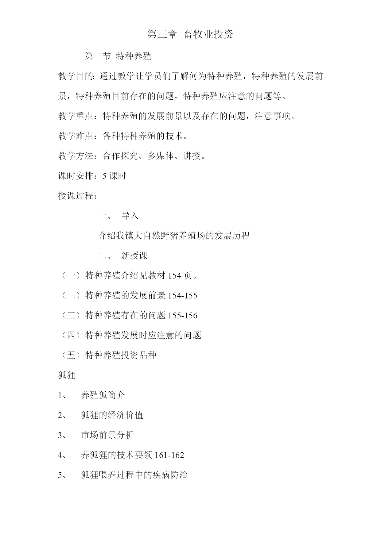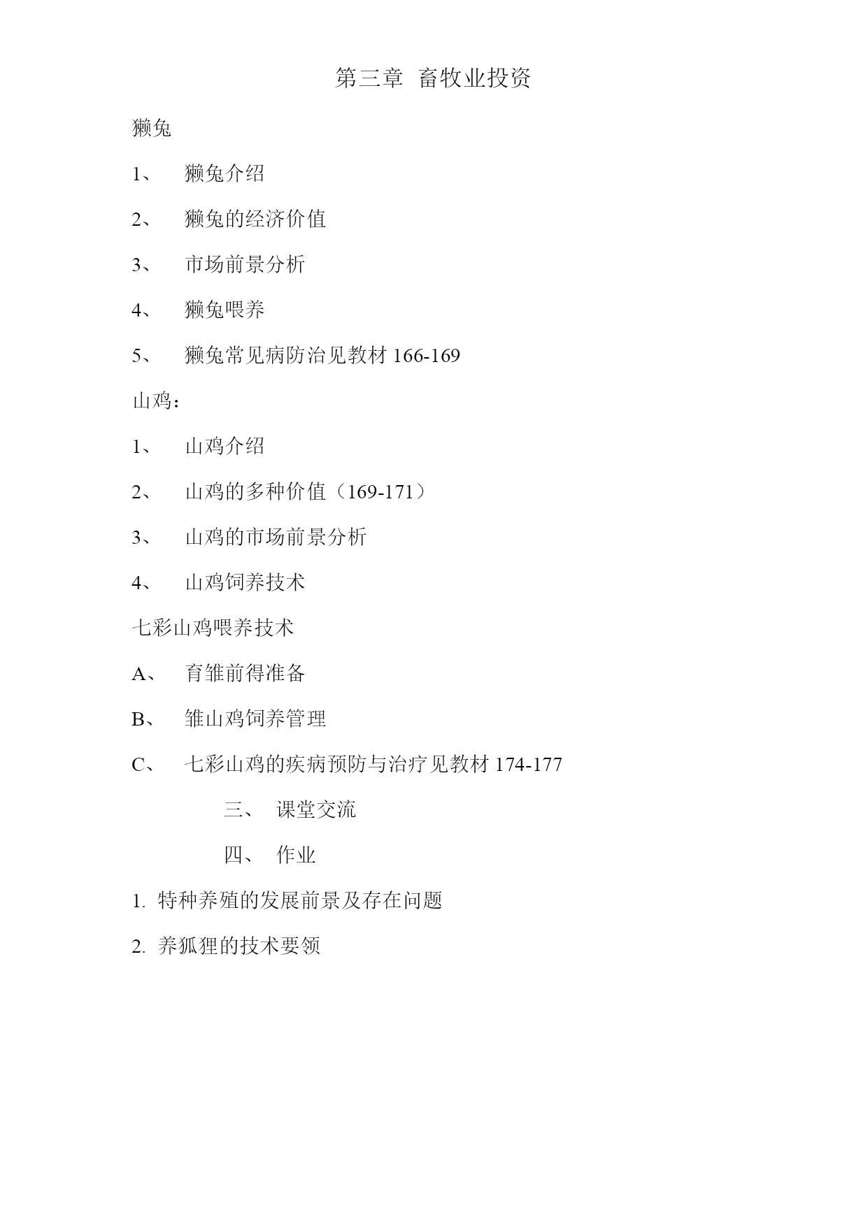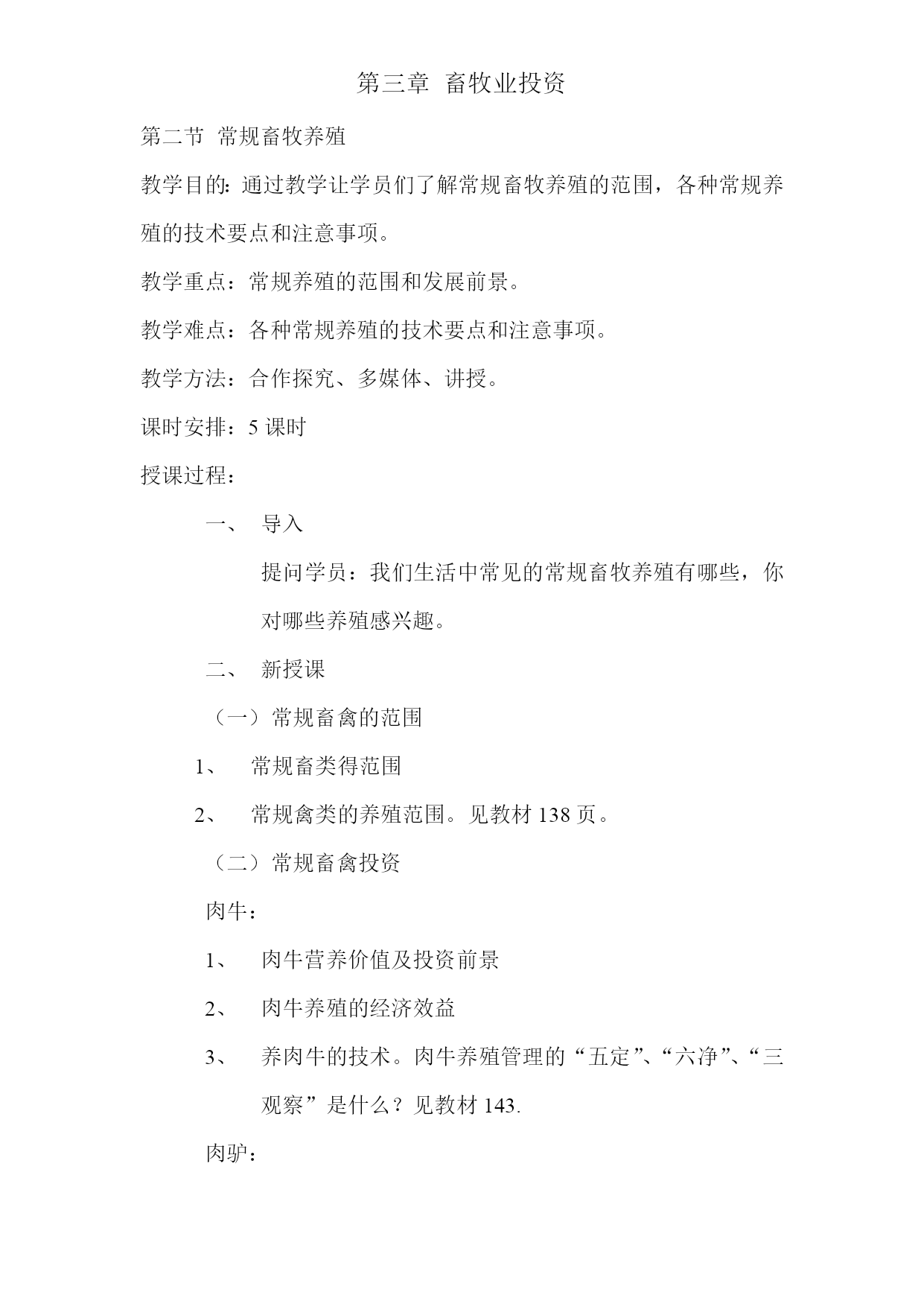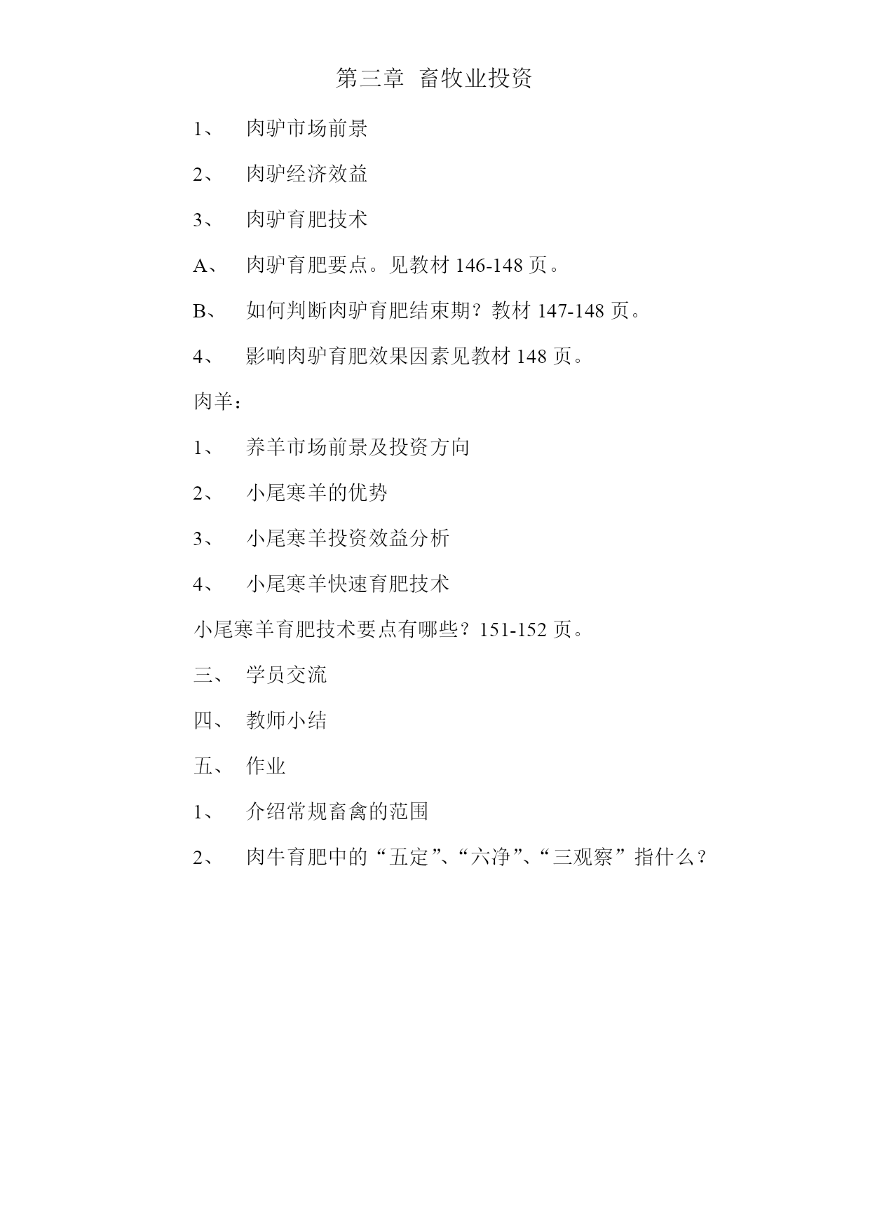 第三章畜牧业投资畜牧业概述教学目的:通过教学让学员们了解中国畜牧业业发展的现状,国家对畜牧业发展的相关政策。教学重点:我国畜牧业宏观政策和畜牧业发展态势。教学方法:合作探究、多媒体、讲授。课时安排:2课时授课过程:导入介绍我镇养殖业发展状况和效益。新授课从1953年第一个五年计划起,国家先后制定了十个五年计划:见教材137页。总体看来,国家政策上倾向扶持农业,关注畜牧业发展。近几年各地畜牧业发展趋势,关键在于选择科学合理的投资方向,选对适宜的品种。学员交流讨论各村畜牧业发展的情况。教师小结我区畜牧业发展情