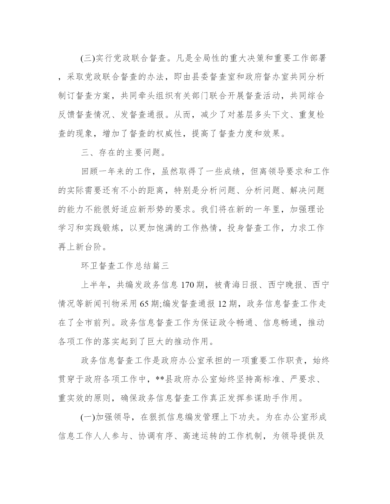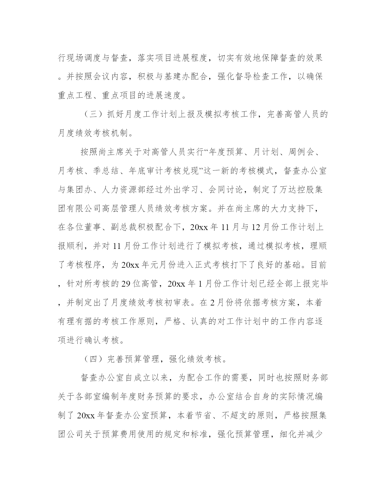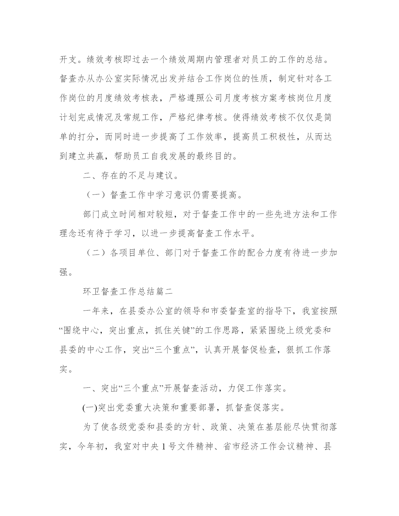最新环卫督查工作总结督查工作总结(模板13篇)对某一单位、某一部门工作进行全面性总结,既反映工作的概况,取得的成绩,存在的问题、缺点,也要写经验教训和今后如何改进的意见等。相信许多人会觉得总结很难写?那么下面我就给大家讲一讲总结怎么写才比较好,我们一起来看一看吧。环卫督查工作总结篇一一年来,在董事局的正确领导下,在主管领导的支持下,严格按照尚主席的指示精神,紧紧围绕集团公司的发展大局,以公司董事局决定的重大决策和重要工作部署为核心,以各单位、各部门和经营管理、重点工程、重点项目等工作任务目标为重点,以“力求落实、实事求是、突出重点、讲求实效”为工作理念,以“批必查、查必清、清必办、办必果”为工作原则,认真扎实地开展督查工作,现根据公司要求,简要总结如下:一、主要及重要工作。(一)制定督查工作运行实施办法,完善督查程序。1、在本部室的成立之初,按照尚主席的指示要求,在集团办公室的大力协助下,制定了以督查工作内容、督查工作程序和方法、督查结果考核、违反督查纪律处理等内容的督查工作运行实施试行办法及督查工作职责,并在工作中,以该办法为工作准则,扎实而认真的开展了有关事项的督查工作。绕每个时期的中心工作,分别轻重缓急,及时填制,专卷留查。既可以突出重点,一事一卡,细致认真,又能防止遗漏,注意时效。(二)强化督导管理,严格督查工作程序。1、在督查办公室成立之初,第一时间及时与集团办公室就督查事项进行了严格、缜密的工作交接,本着“力求落实、实事求是、突出重点、讲求实效”的工作理念,深入开展督查工作,一年来,30多项督查工作予以顺利结项。下发督查简报7份,上报督查专报6份,督查工作汇报材料共计36份。针对董事局领导签批及会议确定时限的督查事项,督查办严格按照时限性、时效性进行督查,下发了统一的督查事项通知单,做到了周调度、周汇报,保持了督查工作的连续性。特别是针对一些时间紧、任务急的督查事项,本着负责、省时、尽快到位的理念,我亲自到各有关单位、部门与责任人沟通交流,必要时进行现场调度与督查。与此同时根据中心工作,就重点督办事项下发督查简报,重点对执行不力,延时、误时等问题进行问责和效能通报。2、为保障督查工作的顺利进行和取得良好的效果,采取深入项目现场一线,以实地督查与上报督查相结合的督查方式,切实有效地保证了督查工作的良好效果。为加快项目施工进展,督查办公室坚持定时、不定时的到专家公寓、财富新城、商务大厦、半钢、全钢及黑炭黑项目等项目施工现场现场督查,做到了在周汇报的基础上进行现场取证,推动了施工项目的工程进度。每周按时参加集团公司重点工程、重点项目调度会,按照会议精神,对会议内容及项目进展情况进行现场调度与督查,落实项目进展程度,切实有效地保障督查的效果。并按照会议内容,积极与基建办配合,强化督导检查工作,以确保重点工程、重点项目的进展速度。(三)抓好月度工作计划上报及模拟考核工作,完善高管人员的月度绩效考核机制。按照尚主席关于对高管人员实行“年度预算、月计划、周例会、月考核、季总结、年底审计考核兑现”这一新的考核模式,督查办公室与集团办、人力资源部经过外出学习、会同讨论,制定了万达控股集团有限公司高层管理人员绩效考核方案。并在尚主席的大力支持下,在各位董事、副总裁积极配合下,20xx年11月与12月份工作计划上报顺利,并对11月份工作计划进行了模拟考核,通过模拟考核,理顺了考核程序,为20xx年元月份进入正式考核打下了良好的基础。目前,针对所考核的29位高管,20xx年1月份工作计划已经全部上报完毕,并制定出了月度绩效考核初审表。在2月份将依据考核方案,本着有理有据的考核工作原则,严格、认真的对工作计划中的工作内容逐项进行确认考核。(四)完善预算管理,强化绩效考核。督查办公室自成立以来,为配合工作的需要,同时也按照财务部关于各部室编制年度财务预算的要求,办公室结合自身的实际情况编制了20xx年督查办公室预算,本着节省、不超支的原则,严格按照集团公司关于预算费用使用的规定和标准,强化预算管理,细化并减少开支。绩效考核即过去一个绩效周期内管理者对员工的工作的总结。督查办从办公室实际情况出发并结合工作岗位的性质,制定针对各工作岗位的月度绩效考核表,严格遵照公司月度考核方案考核岗位月度计划完成情况及常规工作,严格纪律考核。使得绩效考核不仅仅是简单的打分,而同时进一步提高了工作效率,提高员工积极性,从而达到建立共赢,帮助员工自我发展的最终目的。二、存在的不足与建议。(一)督查工作中学习意识仍需要提高。部门成立时间相对较短,对于督查工作中的一些先进方法和工作理念还有待于学习,以进一步提高督查工作水平。(二)各项目单位、部门对于督查工作的配合力度有待进一步加强。环卫督查工作总结篇二一年来,在县委办公室的领导
