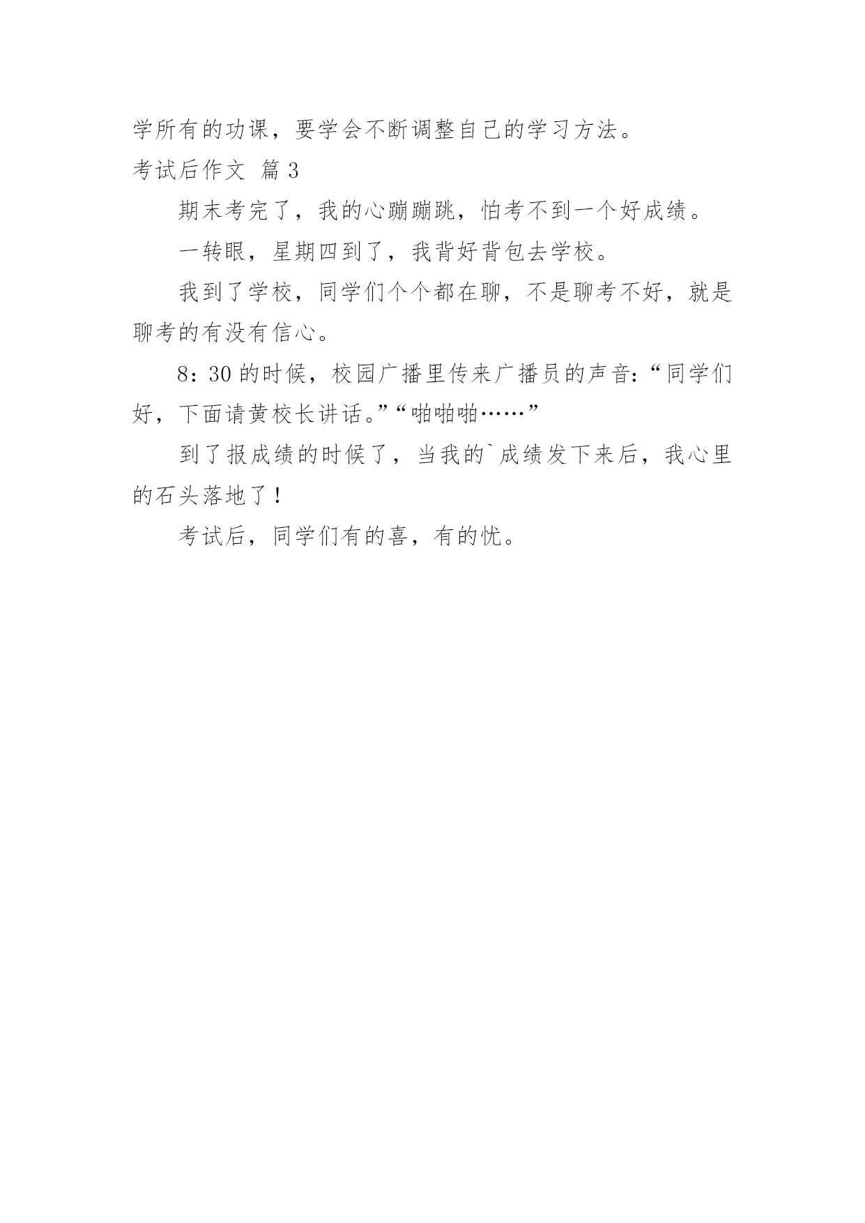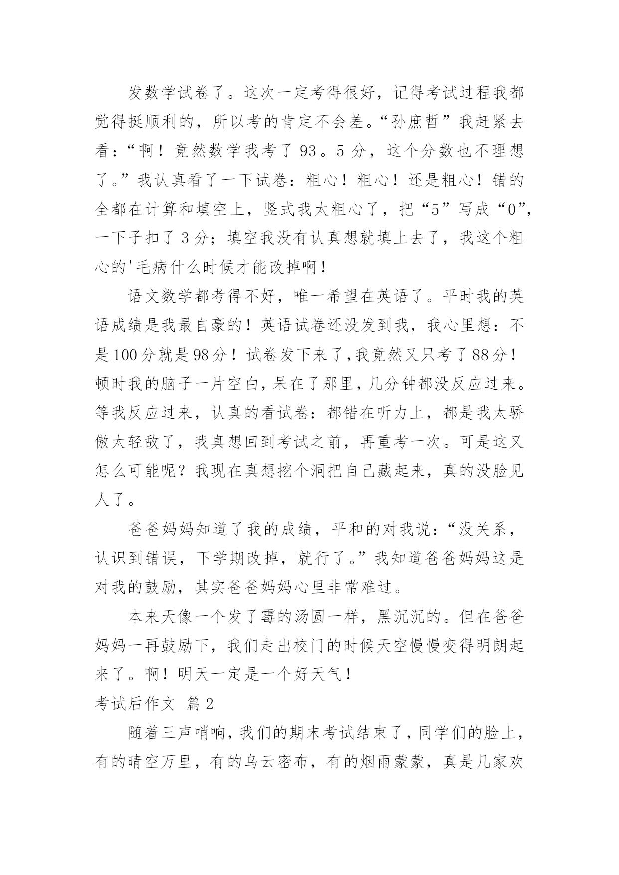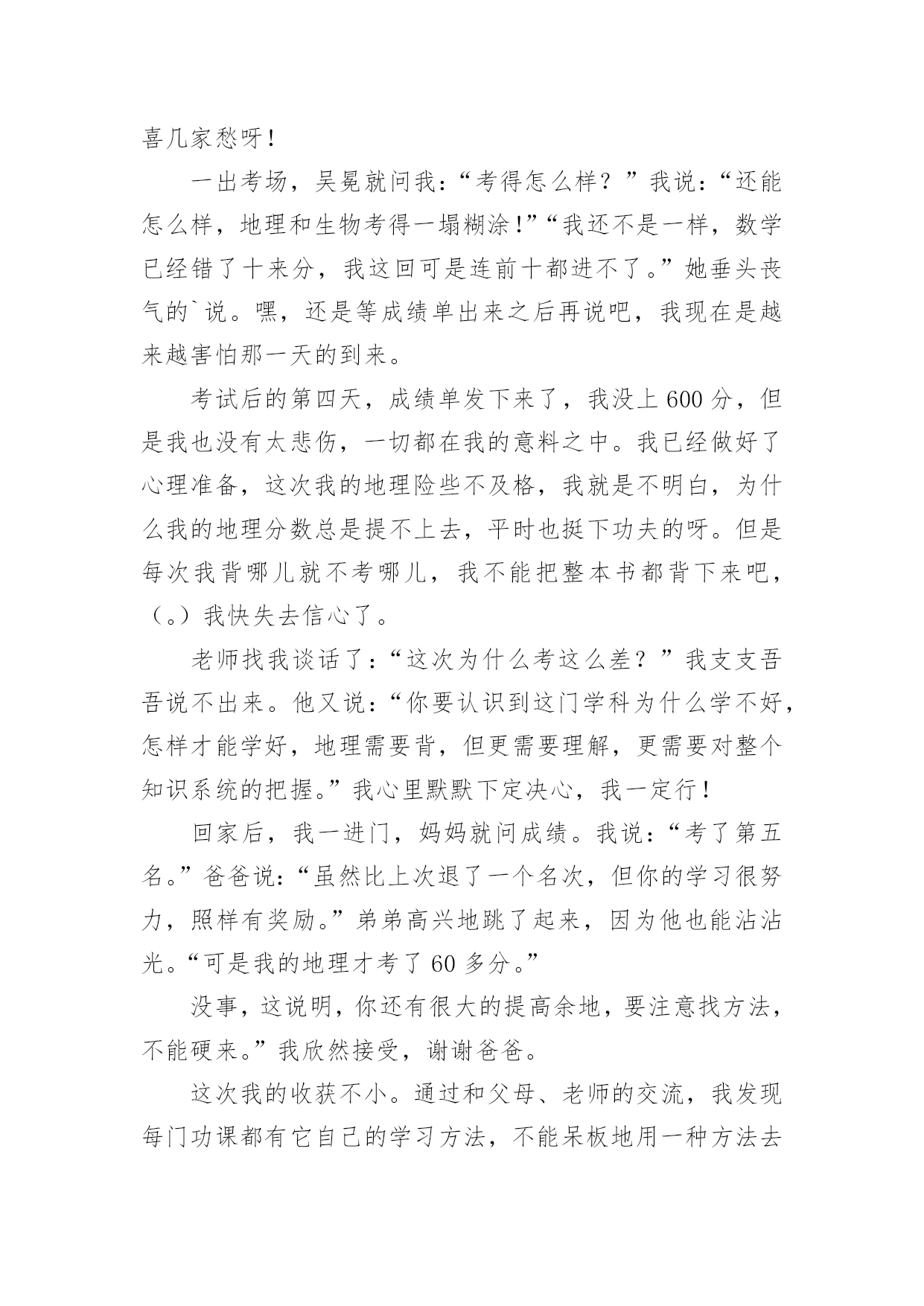 考试后作文考试后作文3篇[精]在日复一日的学习、工作或生活中,许多人都写过作文吧,作文可分为小学作文、中学作文、大学作文(论文)。你写作文时总是无从下笔?下面是小编整理的考试后作文3篇,供大家参考借鉴,希望可以帮助到有需要的朋友。考试后作文篇1这是一个细雨蒙蒙的星期五,也是我这学期在东华小学的最后半天。在这半天我们将会拿到这学期最后一次大考的试卷——期末考试试卷。我的心跳加快,我很担心,万一没考好怎么办?教室里,几个同学在帮老师发语文试卷,我心里暗暗高兴:这次考试感觉不错,应该在95分以上吧。试卷发到我了,我急切地去看分数,天啊!我简直不敢相信自己的眼睛,竟然只考了88。5分!这离我的目标分95分远远隔开了好几分的距离。我再仔细看看试卷,都是作文和阅读题失分。作文我写童话故事,写的不生动也不具体。我以前写过了《桌椅的笑声》,利用了先哭后笑的对比手法,写的很生动,扣分很少,但这次因为我怕时间不够,才写了《椅子的哭声》,加上我的字写的不认真,扣了4。5分;阅读题没理解好,没有读懂就做题导致失分很多。妈妈以前说过:一遍不行读两遍,两边不行读三遍,三遍不行读四遍……可我,哎,这可怎么办啊?发数学试卷了。这次一定考得很好,记得考试过程我都觉得挺顺利的,所以考的肯定不会差。“孙庶哲”我赶紧去看:“啊!竟然数学我考了93。5分,这个分数也不理想了。”我认真看了一下试卷:粗心!粗心!还是粗心!错的全都在计算和填空上,竖式我太粗心了,把“5”写成“0”,一下子扣了3分;填空我没有认真想就填上去了,我这个粗心的'毛病什么时候才能改掉啊!语文数学都考得不好,唯一希望在英语了。平时我的英语成绩是我最自豪的!英语试卷还没发到我,我心里想:不是100分就是98分!试卷发下来了,我竟然又只考了88分!顿时我的脑子一片空白,呆在了那里,几分钟都没反应过来。等我反应过来,认真的看试卷:都错在听力上,都是我太骄傲太轻敌了,我真想回到考试之前,再重考一次。可是这又怎么可能呢?我现在真想挖个洞把自己藏起来,真的没脸见人了。爸爸妈妈知道了我的成绩,平和的对我说:“没关系,认识到错误,下学期改掉,就行了。”我知道爸爸妈妈这是对我的鼓励,其实爸爸妈妈心里非常难过。本来天像一个发了霉的汤圆一样,黑沉沉的。但在爸爸妈妈一再鼓励下,我们走出校门的时候天空慢慢变得明朗起来了。啊!明天一定是一个好天气!考试后作文篇2随着三声哨响,我们的期末考试结束了,同学们的脸上,有的晴空万里,有的乌云密布,有的烟雨蒙蒙,真是几家欢喜几家愁呀!一出考场,吴冕就问我:“考得怎么样?”我说:“还能怎么样,地理和生物考得一塌糊涂!”“我还不是一样,数学已经错了十来分,我这回可是连前十都进不了。”她垂头丧气的`说。嘿,还是等成绩单出来之后再说吧,我现在是越来越害怕那一天的到来。考试后的第四天,成绩单发下来了,我没上600分,但是我也没有太悲伤,一切都在我的意料之中。我已经做好了心理准备,这次我的地理险些不及格,我就是不明白,为什么我的地理分数总是提不上去,平时也挺下功夫的呀。但是每次我背哪儿就不考哪儿,我不能把整本书都背下来吧,(。)我快失去信心了。老师找我谈话了:“这次为什么考这么差?”我支支吾吾说不出来。他又说:“你要认识到这门学科为什么学不好,怎样才能学好,地理需要背,但更需要理解,更需要对整个知识系统的把握。”我心里默默下定决心,我一定行!回家后,我一进门,妈妈就问成绩。我说:“考了第五名。”爸爸说:“虽然比上次退了一个名次,但你的学习很努力,照样有奖励。”弟弟高兴地跳了起来,因为他也能沾沾光。“可是我的地理才考了60多分。”没事,这说明,你还有很大的提高余地,要注意找方法,不能硬来。”我欣然接受,谢谢爸爸。这次我的收获不小。通过和父母、老师的交流,我发现每门功课都有它自己的学习方法,不能呆板地用一种方法去学所有的功课,要学会不断调整自己的学习方法。考试后作文篇3期末考完了,我的心蹦蹦跳,怕考不到一个好成绩。一转眼,星期四到了,我背好背包去学校。我到了学校,同学们个个都在聊,不是聊考不好,就是聊考的有没有信心。8:30的时候,校园广播里传来广播员的声音:“同学们好,下面请黄校长讲话。”“啪啪啪……”到了报成绩的时候了,当我的`成绩发下来后,我心里的石头落地了!考试后,同学们有的喜,有的忧。
