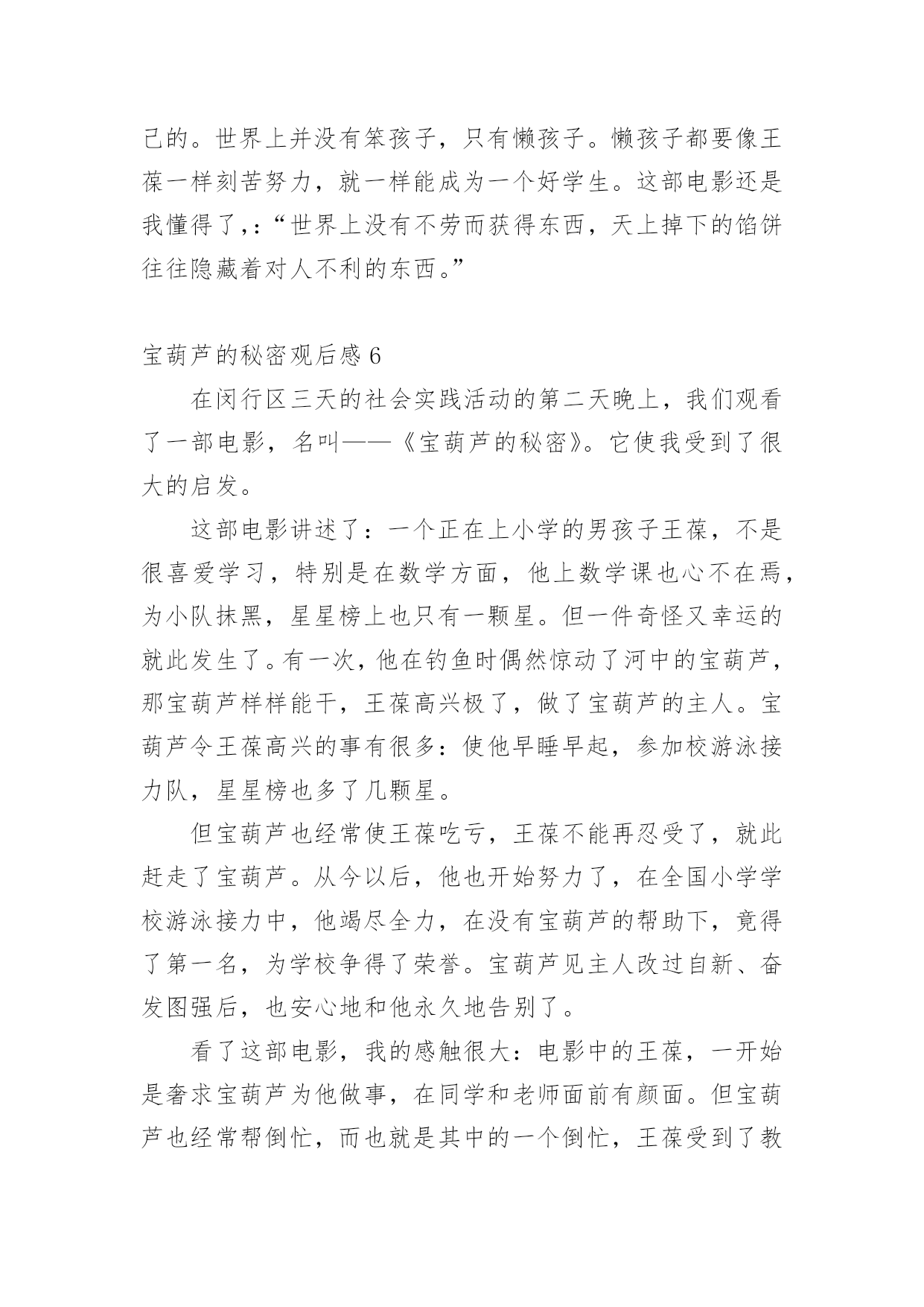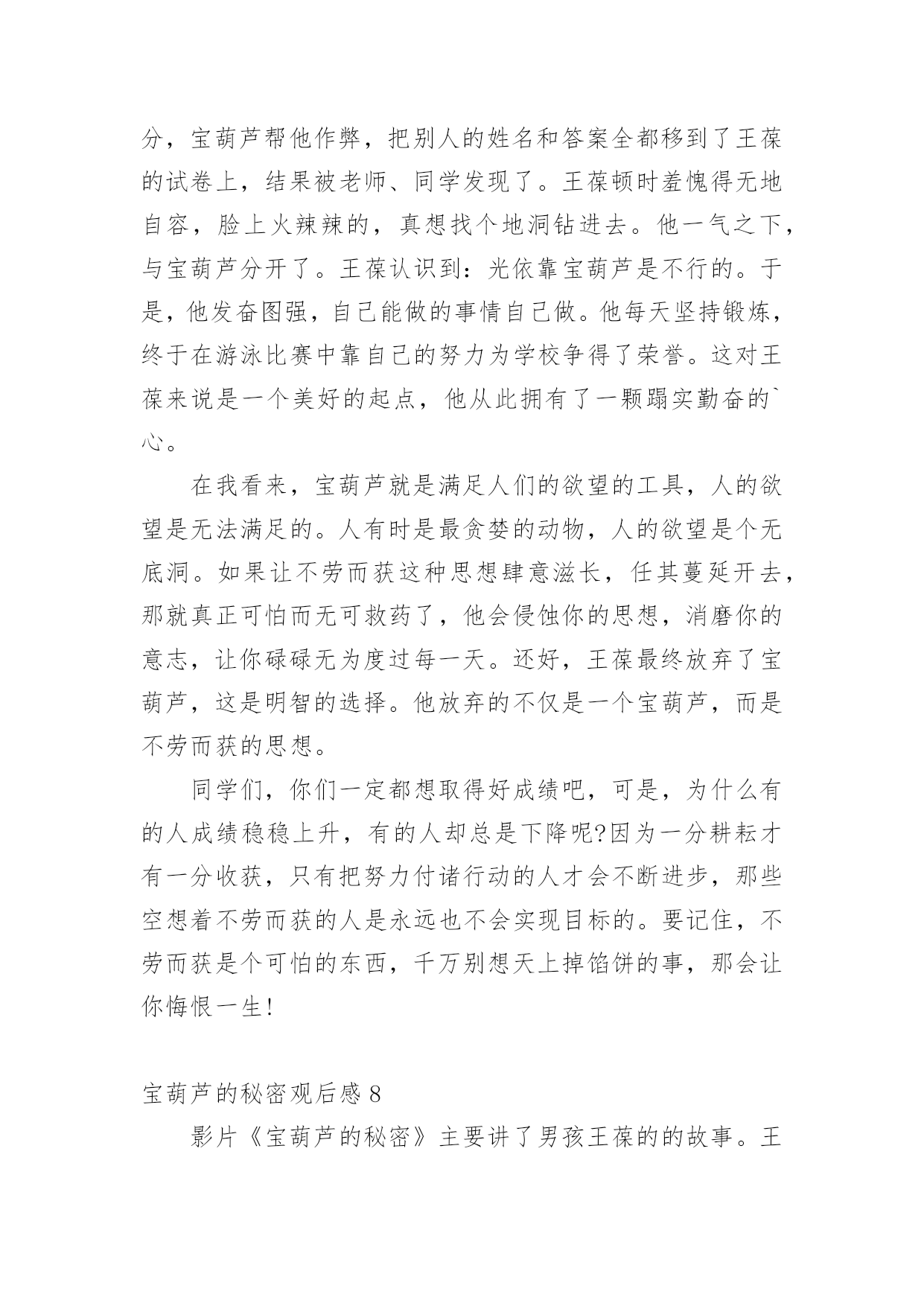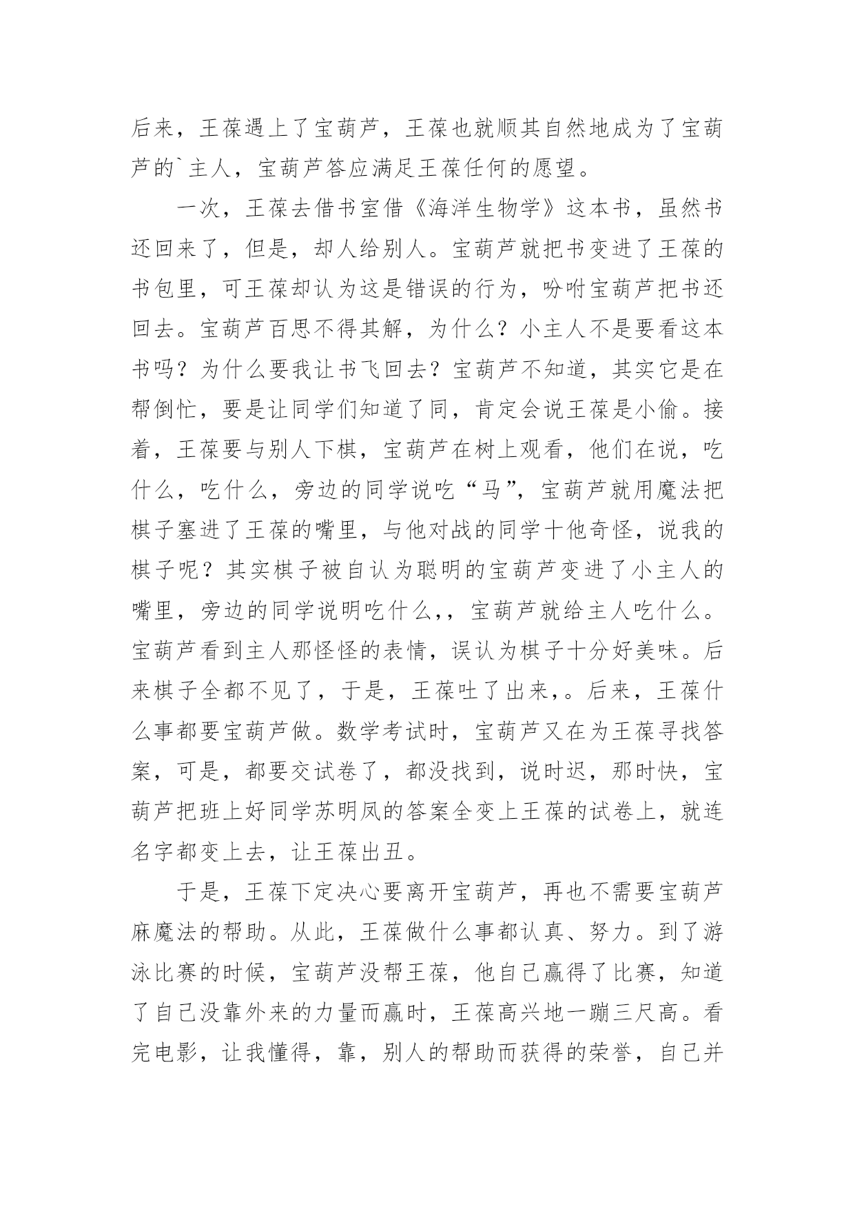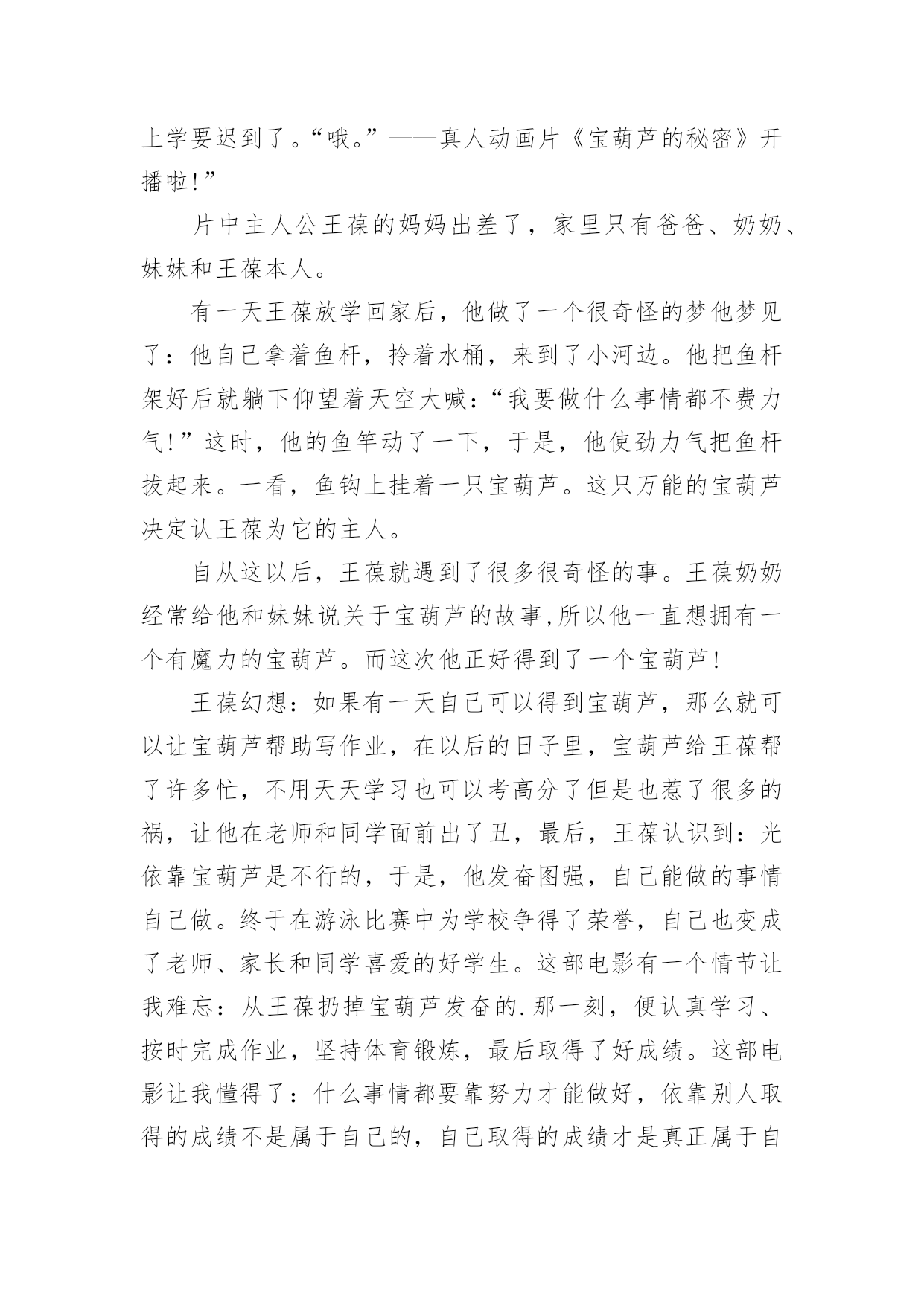 宝葫芦的秘密观后感[优]宝葫芦的秘密观后感11篇认真品味一部作品后,相信大家的视野一定开拓了不少吧,不能光会看哦,写一篇观后感吧。你想知道观后感怎么写吗?下面是小编收集整理的宝葫芦的秘密观后感,希望能够帮助到大家。宝葫芦的秘密观后感1今天,妈妈和我冒着大雨去看电影《宝葫芦的秘密》。电影的主人公是一位名叫“王葆”的学生。他天真活泼、喜欢幻想,每当在学习上碰到困难,或在课余生活中遇到麻烦时,他就幻想有一个神奇的宝贝能出现来帮他轻松地实现目标。有一次他受不住别人的嘲笑,一气之下跑出学校,在一个风景优美的地方,跟着一只青蛙来到一条河边,无意之下钓鱼时钓到了一个葫芦,他惊奇地发现这个葫芦是活的,它还瞪着眼睛看着王葆呢。葫芦突然开口说话了:“我可以帮你实现任何愿望。”王葆随意说了个想要鱼的愿望,没想到真有各种各样的鱼从水里“飞”了出来,王葆高兴地从中选了许多金鱼。第二天给同学们看,同学们又惊奇又奇怪:为什么河里有金鱼?从此以后,宝葫芦经常帮王葆实现愿望,做高级模型、完成课外作业,还变换成各种形状令他开心。并帮助他在泳池中大显神威,轻易获得了参加校队的机会。然而也惹了很多的祸,让他在老师和同学面前出了丑……特别是一次数学考试时,他担心自己考不好,所以让宝葫芦帮他,宝葫芦爽快地答应了。它使出魔法,把王葆的同学苏鸣凤试卷上的答案和名字全部转移到了王葆的空白试卷上。当王葆把试卷交给老师,老师看了后,立刻皱起了眉头,疑问道:“王葆,这是你做的吗?”“是我做的。”“那怎么是苏鸣凤的名字?”王葆一看,心虚地吓跑了。他跑向了小河边。在和宝葫芦的`争辩之中,王葆发现宝葫芦原来不分青红皂白,只懂盲目服从……王葆一愤怒,把宝葫芦重新丢入了湖中。以后王葆什么事都自己做,并认真刻苦地在游泳池中练习,终于在区游泳比赛中获得了奖。最后,宝葫芦也踏上了寻找知识的道路,他们分开了。通过这部电影,我认识到了世界上没有不劳而获的东西,只有靠自己的努力,才能取得好的收获。天下没有掉馅饼的事,什么事都得靠自己。我会把它记在心里,做一个努力学习的好学生,为自己的将来打下坚实的基础。宝葫芦的秘密观后感2今天,我看了一部电影,名字叫《宝葫芦的秘密》。这部电影十分地有趣。这部电影的主人公是王葆和宝葫芦,讲述了他们之间发生的事。王葆曾经是一个学习不上进、懒散的人。他喜欢钓鱼,可他一条鱼也钓不着,是因为他不聪明吗?不,不是你所想象的那样,王葆是一个非常聪明的人,只是他不用功而已。后来,王葆遇上了宝葫芦,王葆也就顺其自然地成为了宝葫芦的`主人,宝葫芦答应满足王葆任何的愿望。一次,王葆去借书室借《海洋生物学》这本书,虽然书还回来了,但是,却人给别人。宝葫芦就把书变进了王葆的书包里,可王葆却认为这是错误的行为,吩咐宝葫芦把书还回去。宝葫芦百思不得其解,为什么?小主人不是要看这本书吗?为什么要我让书飞回去?宝葫芦不知道,其实它是在帮倒忙,要是让同学们知道了同,肯定会说王葆是小偷。接着,王葆要与别人下棋,宝葫芦在树上观看,他们在说,吃什么,吃什么,旁边的同学说吃“马”,宝葫芦就用魔法把棋子塞进了王葆的嘴里,与他对战的同学十他奇怪,说我的棋子呢?其实棋子被自认为聪明的宝葫芦变进了小主人的嘴里,旁边的同学说明吃什么,,宝葫芦就给主人吃什么。宝葫芦看到主人那怪怪的表情,误认为棋子十分好美味。后来棋子全都不见了,于是,王葆吐了出来,。后来,王葆什么事都要宝葫芦做。数学考试时,宝葫芦又在为王葆寻找答案,可是,都要交试卷了,都没找到,说时迟,那时快,宝葫芦把班上好同学苏明凤的答案全变上王葆的试卷上,就连名字都变上去,让王葆出丑。于是,王葆下定决心要离开宝葫芦,再也不需要宝葫芦麻魔法的帮助。从此,王葆做什么事都认真、努力。到了游泳比赛的时候,宝葫芦没帮王葆,他自己赢得了比赛,知道了自己没靠外来的力量而赢时,王葆高兴地一蹦三尺高。看完电影,让我懂得,靠,别人的帮助而获得的荣誉,自己并不快乐也不真实,而靠自己的努力获得了成功那很真实,自己心里边也快乐。宝葫芦的秘密观后感320xx年9月23日上午,我们在学校操场上的“移动影院”里,看了两部电影,我最喜欢,也感受最深的是第一部电影《宝葫芦的秘密》。他讲的是一个叫王褒的小学生的故事,王葆总想不费力,把啥都做得最好。一天,他钓鱼钓到了一个宝葫芦,宝葫芦告诉王葆,它啥都能变出来,能满足王葆的一切愿望。王葆很高兴,就把宝葫芦收藏了起来,做了宝葫芦的主人。这部电影中,有几个情节,既趣味又有教育意义,我很喜欢。第一个情节是:王葆来到玩具店,看到造型各异、千奇百怪、琳琅满目、好玩趣味的玩具,他都喜欢,想全部得到它们。他把自我的愿望告诉了宝葫芦,宝葫芦把所有的玩具一下都变回到王葆家里。王葆忙的玩可是来,之后,王褒看爸爸要回来了,就让宝葫芦立刻把玩具变回到玩具店去了。第二个情节是:要进
