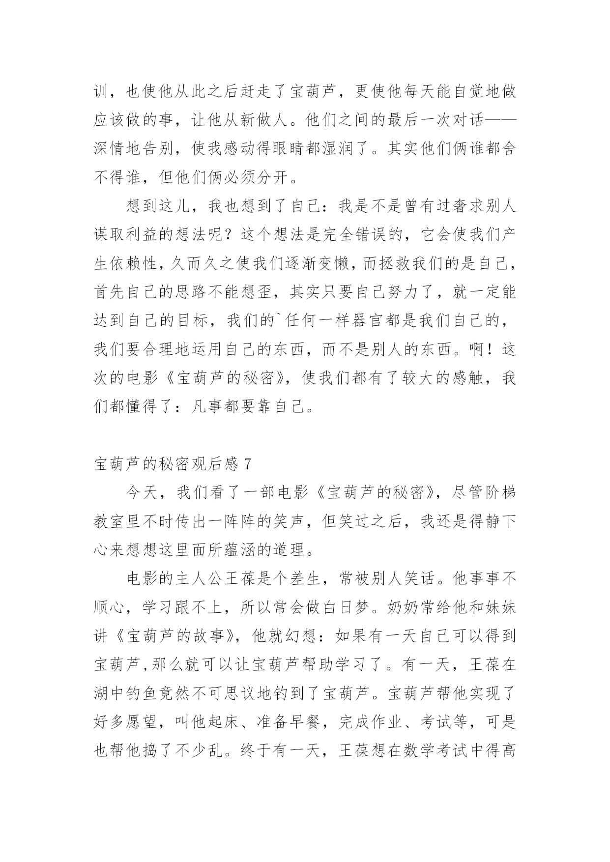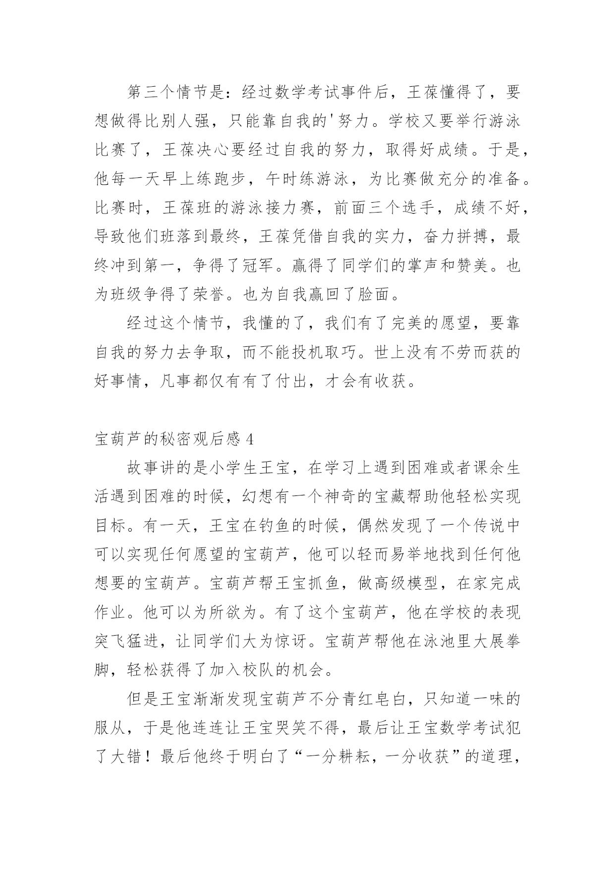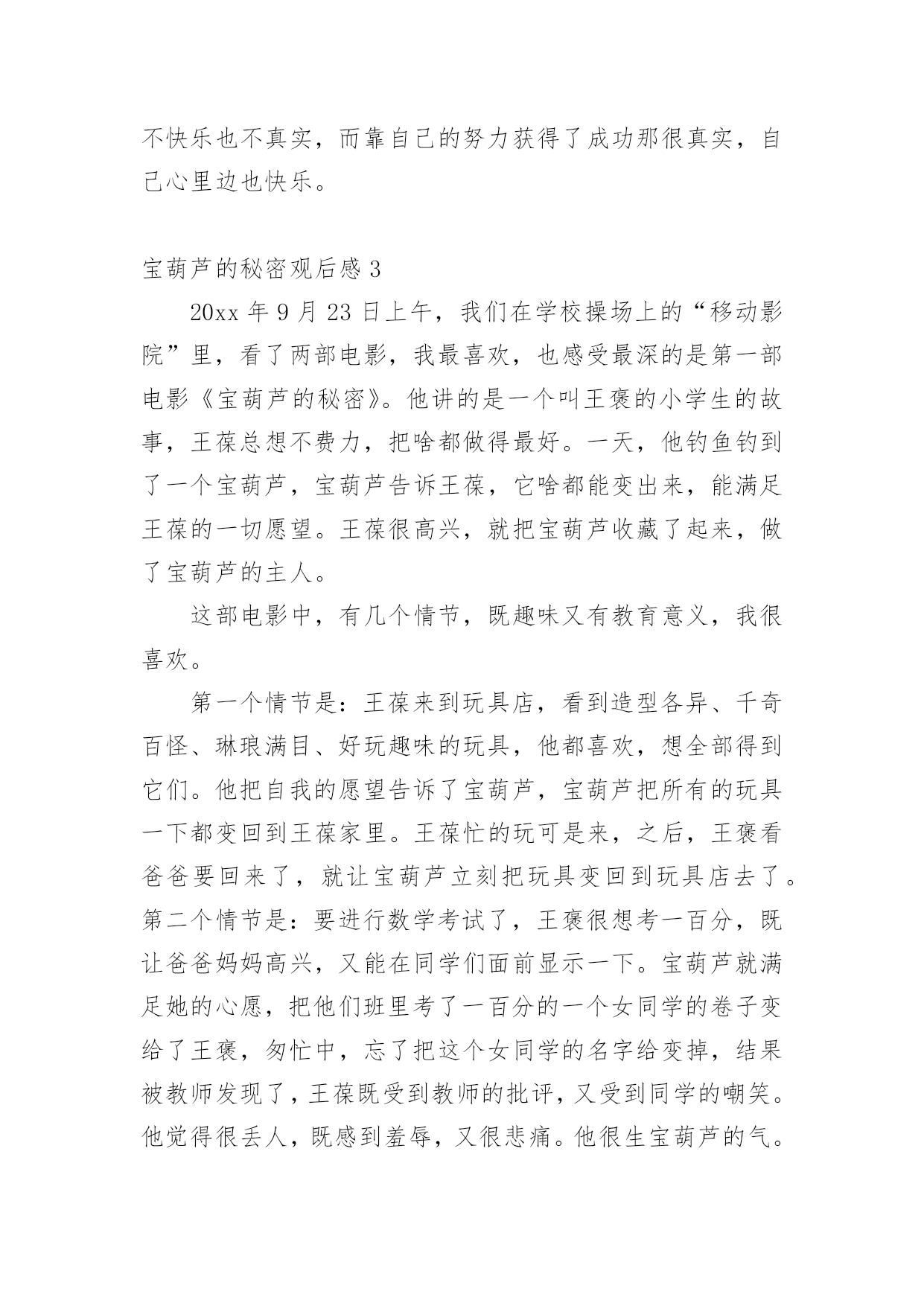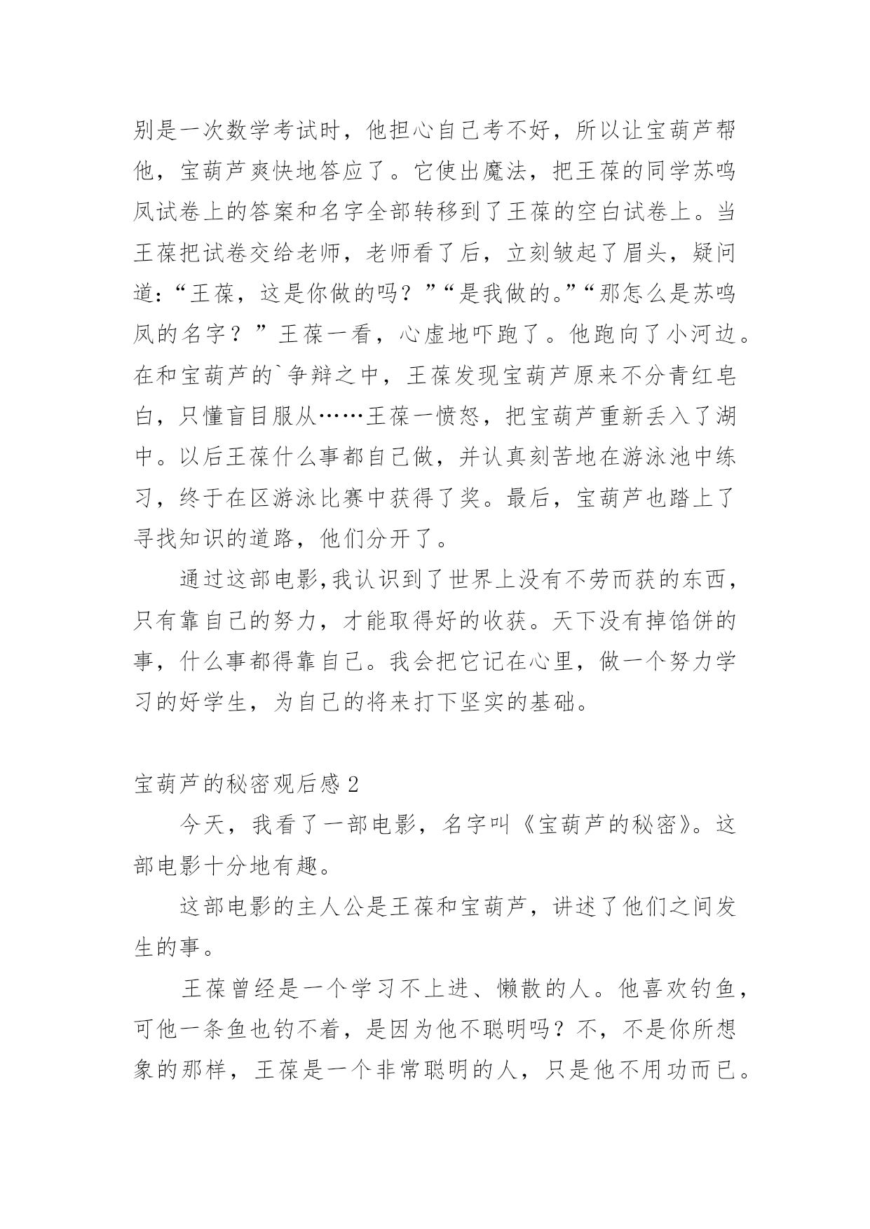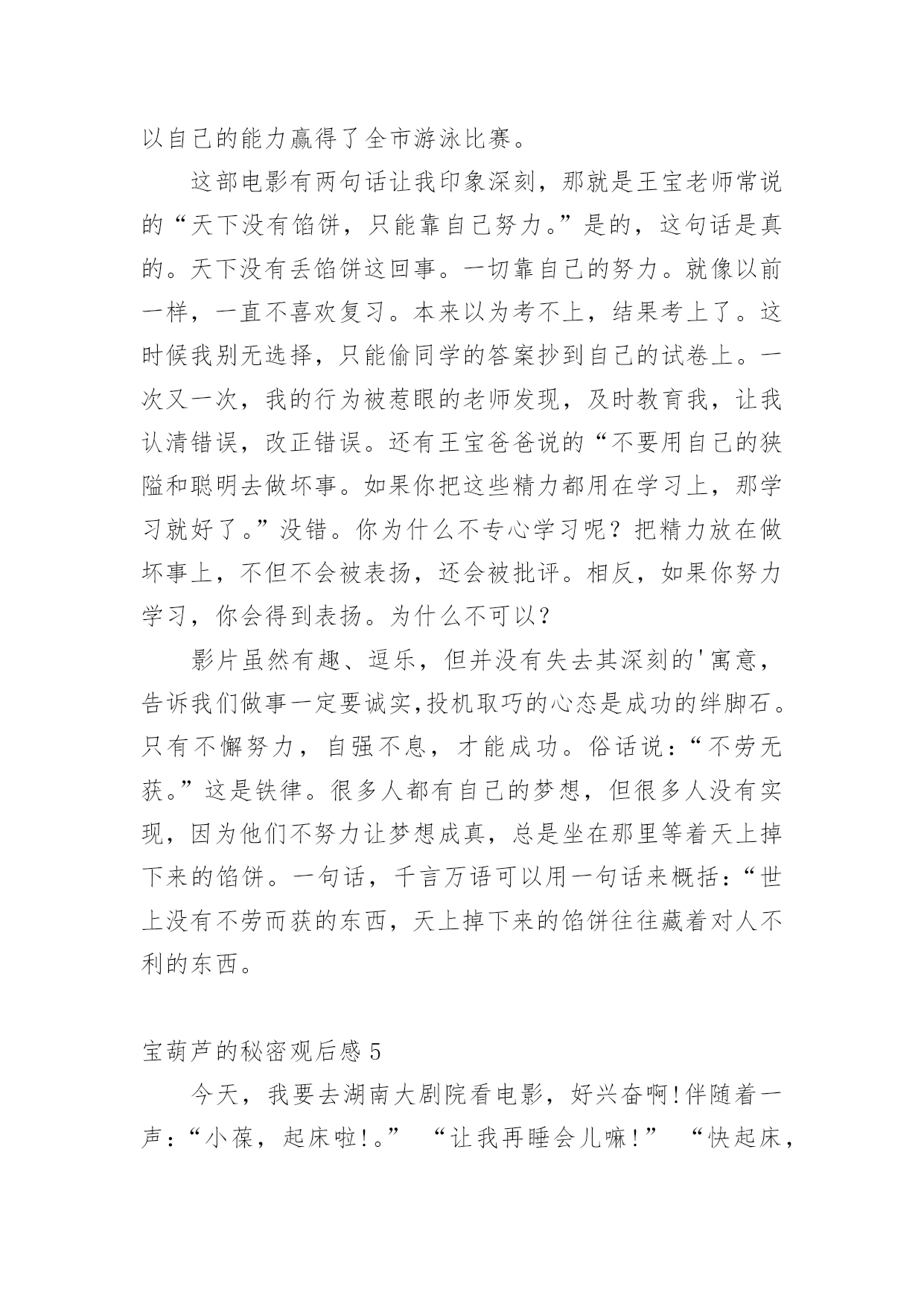 宝葫芦的秘密观后感[优]宝葫芦的秘密观后感11篇认真品味一部作品后,相信大家的视野一定开拓了不少吧,不能光会看哦,写一篇观后感吧。你想知道观后感怎么写吗?下面是小编收集整理的宝葫芦的秘密观后感,希望能够帮助到大家。宝葫芦的秘密观后感1今天,妈妈和我冒着大雨去看电影《宝葫芦的秘密》。电影的主人公是一位名叫“王葆”的学生。他天真活泼、喜欢幻想,每当在学习上碰到困难,或在课余生活中遇到麻烦时,他就幻想有一个神奇的宝贝能出现来帮他轻松地实现目标。有一次他受不住别人的嘲笑,一气之下跑出学校,在一个风景优美的地方,跟着一只青蛙来到一条河边,无意之下钓鱼时钓到了一个葫芦,他惊奇地发现这个葫芦是活的,它还瞪着眼睛看着王葆呢。葫芦突然开口说话了:“我可以帮你实现任何愿望。”王葆随意说了个想要鱼的愿望,没想到真有各种各样的鱼从水里“飞”了出来,王葆高兴地从中选了许多金鱼。第二天给同学们看,同学们又惊奇又奇怪:为什么河里有金鱼?从此以后,宝葫芦经常帮王葆实现愿望,做高级模型、完成课外作业,还变换成各种形状令他开心。并帮助他在泳池中大显神威,轻易获得了参加校队的机会。然而也惹了很多的祸,让他在老师和同学面前出了丑……特别是一次数学考试时,他担心自己考不好,所以让宝葫芦帮他,宝葫芦爽快地答应了。它使出魔法,把王葆的同学苏鸣凤试卷上的答案和名字全部转移到了王葆的空白试卷上。当王葆把试卷交给老师,老师看了后,立刻皱起了眉头,疑问道:“王葆,这是你做的吗?”“是我做的。”“那怎么是苏鸣凤的名字?”王葆一看,心虚地吓跑了。他跑向了小河边。在和宝葫芦的`争辩之中,王葆发现宝葫芦原来不分青红皂白,只懂盲目服从……王葆一愤怒,把宝葫芦重新丢入了湖中。以后王葆什么事都自己做,并认真刻苦地在游泳池中练习,终于在区游泳比赛中获得了奖。最后,宝葫芦也踏上了寻找知识的道路,他们分开了。通过这部电影,我认识到了世界上没有不劳而获的东西,只有靠自己的努力,才能取得好的收获。天下没有掉馅饼的事,什么事都得靠自己。我会把它记在心里,做一个努力学习的好学生,为自己的将来打下坚实的基础。宝葫芦的秘密观后感2今天,我看了一部电影,名字叫《宝葫芦的秘密》。这部电影十分地有趣。这部电影的主人公是王葆和宝葫芦,讲述了他们之间发生的事。王葆曾经是一个学习不上进、懒散的人。他喜欢钓鱼,可他一条鱼也钓不着,是因为他不聪明吗?不,不是你所想象的那样,王葆是一个非常聪明的人,只是他不用功而已。后来,王葆遇上了宝葫芦,王葆也就顺其自然地成为了宝葫芦的`主人,宝葫芦答应满足王葆任何的愿望。一次,王葆去借书室借《海洋生物学》这本书,虽然书还回来了,但是,却人给别人。宝葫芦就把书变进了王葆的书包里,可王葆却认为这是错误的行为,吩咐宝葫芦把书还回去。宝葫芦百思不得其解,为什么?小主人不是要看这本书吗?为什么要我让书飞回去?宝葫芦不知道,其实它是在帮倒忙,要是让同学们知道了同,肯定会说王葆是小偷。接着,王葆要与别人下棋,宝葫芦在树上观看,他们在说,吃什么,吃什么,旁边的同学说吃“马”,宝葫芦就用魔法把棋子塞进了王葆的嘴里,与他对战的同学十他奇怪,说我的棋子呢?其实棋子被自认为聪明的宝葫芦变进了小主人的嘴里,旁边的同学说明吃什么,,宝葫芦就给主人吃什么。宝葫芦看到主人那怪怪的表情,误认为棋子十分好美味。后来棋子全都不见了,于是,王葆吐了出来,。后来,王葆什么事都要宝葫芦做。数学考试时,宝葫芦又在为王葆寻找答案,可是,都要交试卷了,都没找到,说时迟,那时快,宝葫芦把班上好同学苏明凤的答案全变上王葆的试卷上,就连名字都变上去,让王葆出丑。于是,王葆下定决心要离开宝葫芦,再也不需要宝葫芦麻魔法的帮助。从此,王葆做什么事都认真、努力。到了游泳比赛的时候,宝葫芦没帮王葆,他自己赢得了比赛,知道了自己没靠外来的力量而赢时,王葆高兴地一蹦三尺高。看完电影,让我懂得,靠,别人的帮助而获得的荣誉,自己并不快乐也不真实,而靠自己的努力获得了成功那很真实,自己心里边也快乐。宝葫芦的秘密观后感320xx年9月23日上午,我们在学校操场上的“移动影院”里,看了两部电影,我最喜欢,也感受最深的是第一部电影《宝葫芦的秘密》。他讲的是一个叫王褒的小学生的故事,王葆总想不费力,把啥都做得最好。一天,他钓鱼钓到了一个宝葫芦,宝葫芦告诉王葆,它啥都能变出来,能满足王葆的一切愿望。王葆很高兴,就把宝葫芦收藏了起来,做了宝葫芦的主人。这部电影中,有几个情节,既趣味又有教育意义,我很喜欢。第一个情节是:王葆来到玩具店,看到造型各异、千奇百怪、琳琅满目、好玩趣味的玩具,他都喜欢,想全部得到它们。他把自我的愿望告诉了宝葫芦,宝葫芦把所有的玩具一下都变回到王葆家里。王葆忙的玩可是来,之后,王褒看爸爸要回来了,就让宝葫芦立刻把玩具变回到玩具店去了。第二个情节是:要进