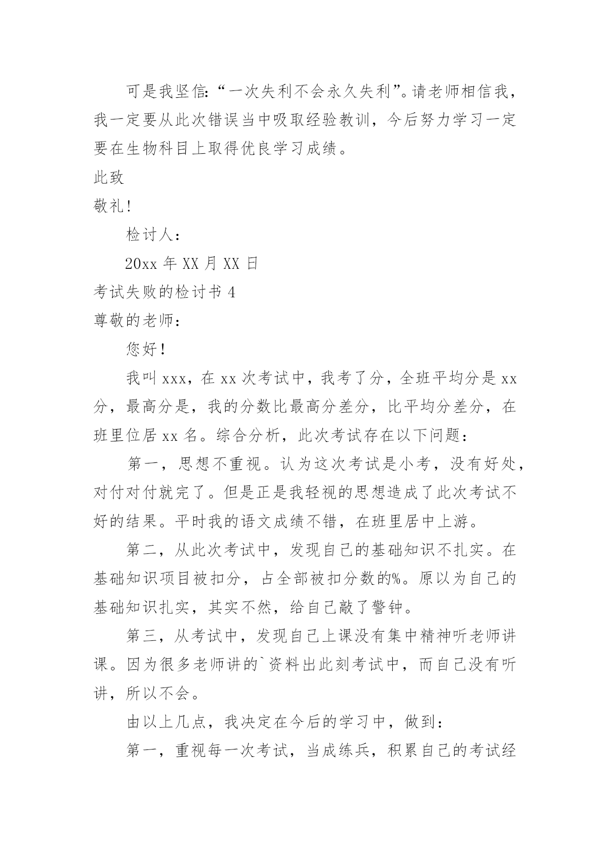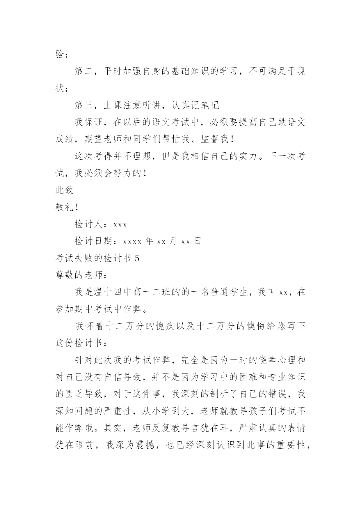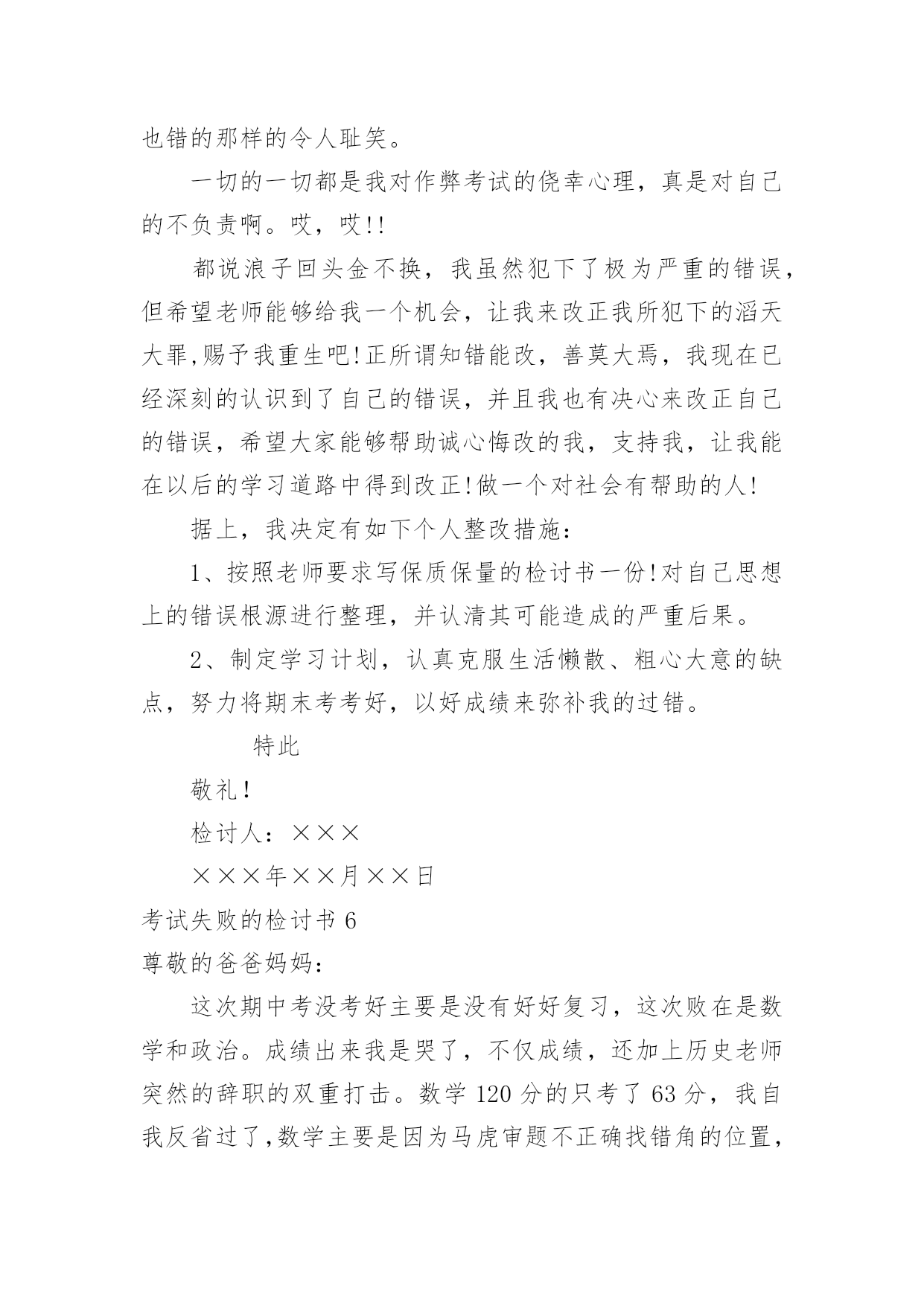 考试失败的检讨书考试失败的检讨书集锦10篇在学习、工作或生活中出现了过错后,为了表明自己悔改的决心,往往被要求写检讨书来自我检讨,在写检讨书的时候,我们的用语要非常注意。但是你知道怎样才能写的好吗?以下是小编为大家整理的考试失败的检讨书,仅供参考,希望能够帮助到大家。考试失败的检讨书1尊敬的数学老师:您好!此番我在数学考试当中基础题目失分太大,这导致我虽然在后面的难题部分取得了还算可以的分数,但是却因为基础题目失分太大,导致我的数学成绩位于班级倒数几名。回顾错误,我深刻地意识到了您对我的批评是对我的.。向我这样的错误是很愚蠢的,相当于有点“捡芝麻扔西瓜”的情况。众所周知,数学的难题部分往往是不好拿分的,往往绞尽脑汁也只能够得一点点分。可是数学的基础题目就很简单可以拿分啊,简直就是在送分,我为什么要丢失呢。很显然,我这样的错误发生,充分地暴露出我平时不注意基础知识的积累,片面地追求难题攻坚,这是导致我错误的主要原因。现如今,我知道自身错误所在了。从今往后,我一定要认清数学考试的分数分配问题。重点将精力花在基础题目训练当中,在保证基础题目有足够时间训练基础上,然后再投入时间攻坚数学难题。最后,我恳求老师能够原谅我的错误。此致敬礼!检讨人:xxx检讨日期:xxxx年xx月xx日考试失败的检讨书2时光匆匆,转眼间考试也已结束,试卷也发下来了.望着试卷上的分数,我惊讶了.因为这和我应有的水平相差甚远,我在此向你说一声对不起,我辜负了您对我的殷切希望。在这次期末英语考试中我成绩十分不理想,不仅伤透了你的心,也让我无地自容。于是,今天,我怀着十二万分的愧疚和懊悔写下这份检讨书,以向您表示我对不好好学英语这种恶劣行为的歉意及打死也不再不好学英语的决心。早在您刚带我们的'时候,您就已经三令五申,一再强调,全班同学,一定要好好学习,认真学英语。直到现在,老师的反复教导言犹在耳,严肃认真的表情犹在眼前,我深为震撼,也经深刻认识到此事的重要性,于是我一再告诫自己要把此事当成头等大事来抓,不能辜负老师对我们的一片苦心。也应此,我现在开始自我反省.正如高尔基说过的那样---当你把一件是看得十分重要的时候,磨难和失败就接踵而来了。就像在这次考试前,我因为太想考好太紧张导致我焦虑失眠,第二天精神状态极其不好。但归根结底,还是由于我学得不牢固,要不然就是精神不好也不会考这个分。忆起当时,我当时就因为太焦虑不好好复习!但,悔亦晚矣,悔亦晚矣!而其他那些诸如粗心大意,没看清题目的事情我就不想多说了,我知道这些理由说出来都是不能成立的,因为,这所有的问题都只能归结于我没有学扎实,还未能达到一个现代中学生该具有地认识问题的水平。未能对老师们的辛勤劳作做出回报,我越来越清晰地感觉到我是一个对自己,对父母,对老师不负责的人对于我(们)没有考好的事情,所造成的严重后果如下:1、折磨了老师的精神,这样的折磨可能让老师工作分心,造成更为严重的后果。2、影响个人综合水平的提高,使自身在本能提高的条件下未能得到提高,违背父母的意愿,实乃不孝。这次期末考试,我考的不好,在此深刻检讨,希望以后不要再考这个分数……学英语,最重要的就是读,听,背,只要这三个能100%做到的话,那英语成绩,没有100分,也能95分。但是,我却没有做到,没有听,没写好,没背好,什么都只做了三分之一,导致成绩不理想……此次考试后,我深刻检讨,认为深藏在我思想中的致命错误有以下几点:1、思想觉悟不高,对重要事项重视严重不足。就算是有认识,也没能在行动上真正实行起来。2、平时生活懒散。如果不是因为懒散、粗心大意、记忆力水平低,我怎么会把老师教的东西学不扎实?又怎么会考不出分?我平时学习不认真,考试成绩便很好地回报了我,为此,我决定以后好好学。检讨人:日期:考试失败的检讨书3尊敬的生物老师:我要含情脉脉地向您递交我的这篇生物考试失利的检讨书。我这次生物考试仅仅取得了32分,严重地拖累了班级后腿,让您的脸上无光,也让您为我感到失望与伤心。我知道自己成绩不好,归根结底的原因是自己平时不注意认真学习生物。诚然,我在平时真的是没有花多少时间与精力在生物科目的学习上,这才最终导致我的生物成绩不及格。其次,这次考试的`失利也有原因在我的考试态度上。考试当中我存在马虎大意的情况,就连一些很基础的题目也没有做对,这就很说不过去了。身为一名理科学生,理综的三门课物理、化学、生物是缺一不可的。而我竟然没有把握好生物的基础知识,我知道自己犯了错误。这次考试我如此失利,在我个人心头上也是非常懊恼的。我恰恰是败给了自己,假如我平时多注意巩固一下生物知识,这次考试也不会如此糟糕。可是我坚信:“一次失利不会永久失利”。请老师相信我,我一定要从此次错误当中吸取经验教训,今后努力学习一定要在生物科目上取得优良学习成绩。此致敬礼!检讨人:20xx年