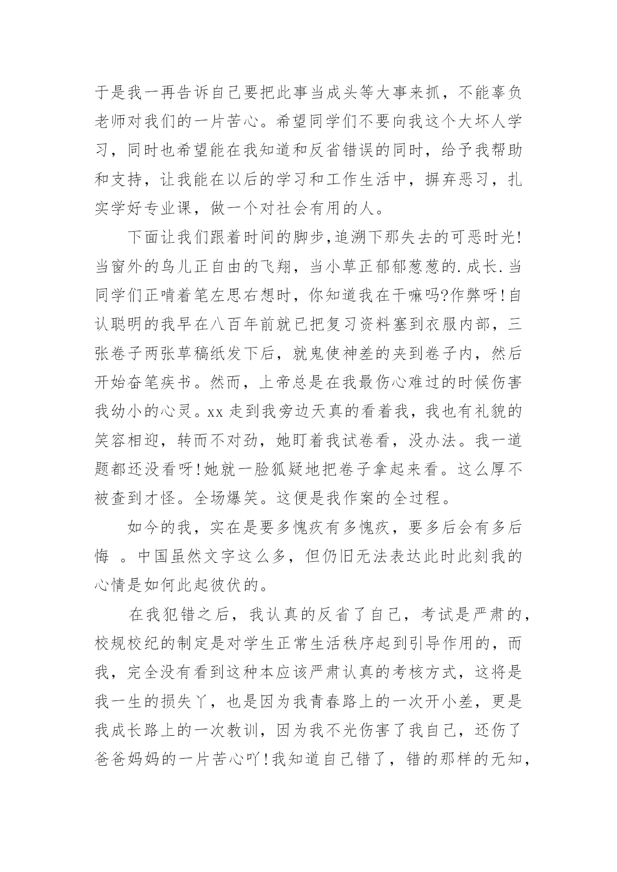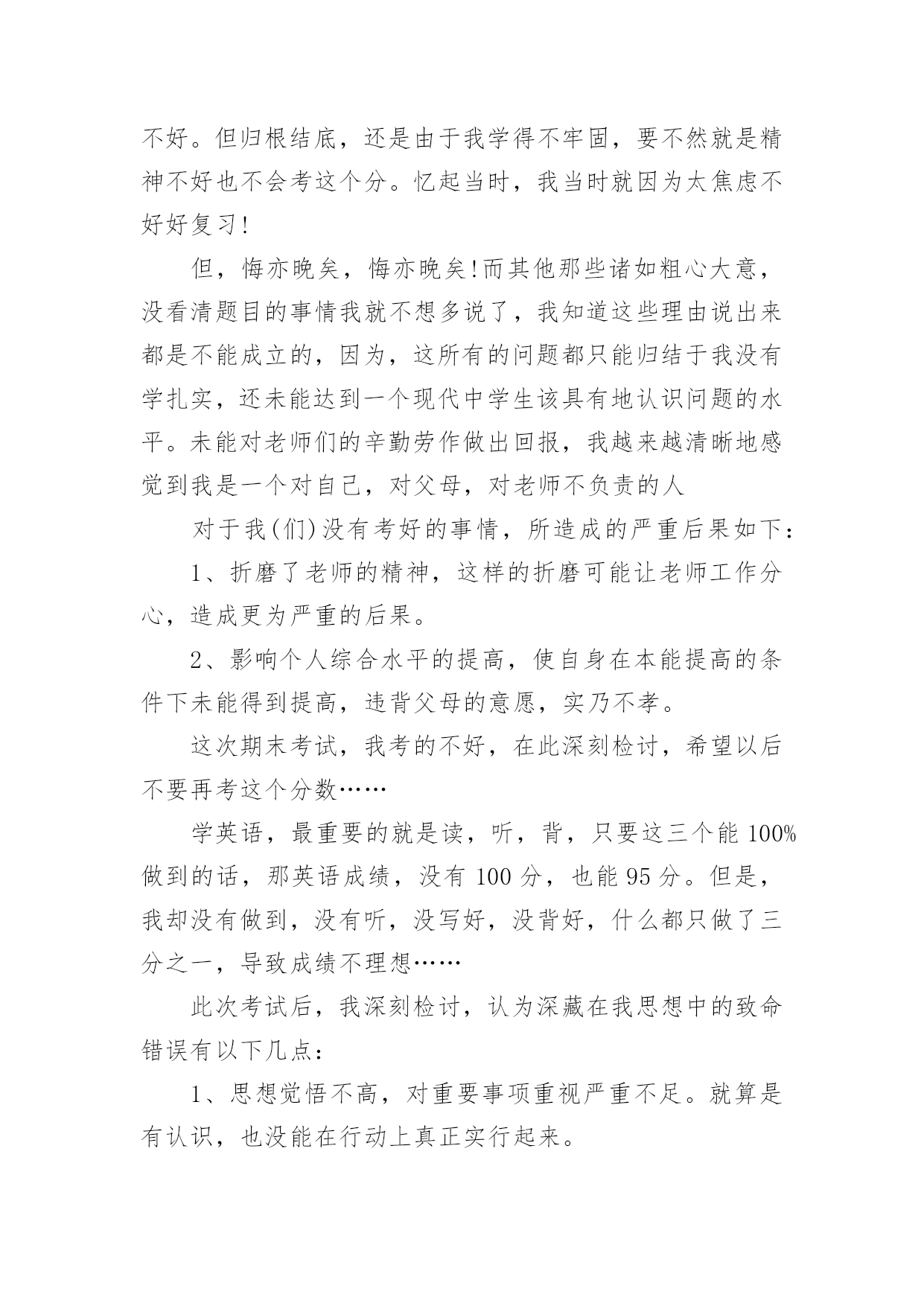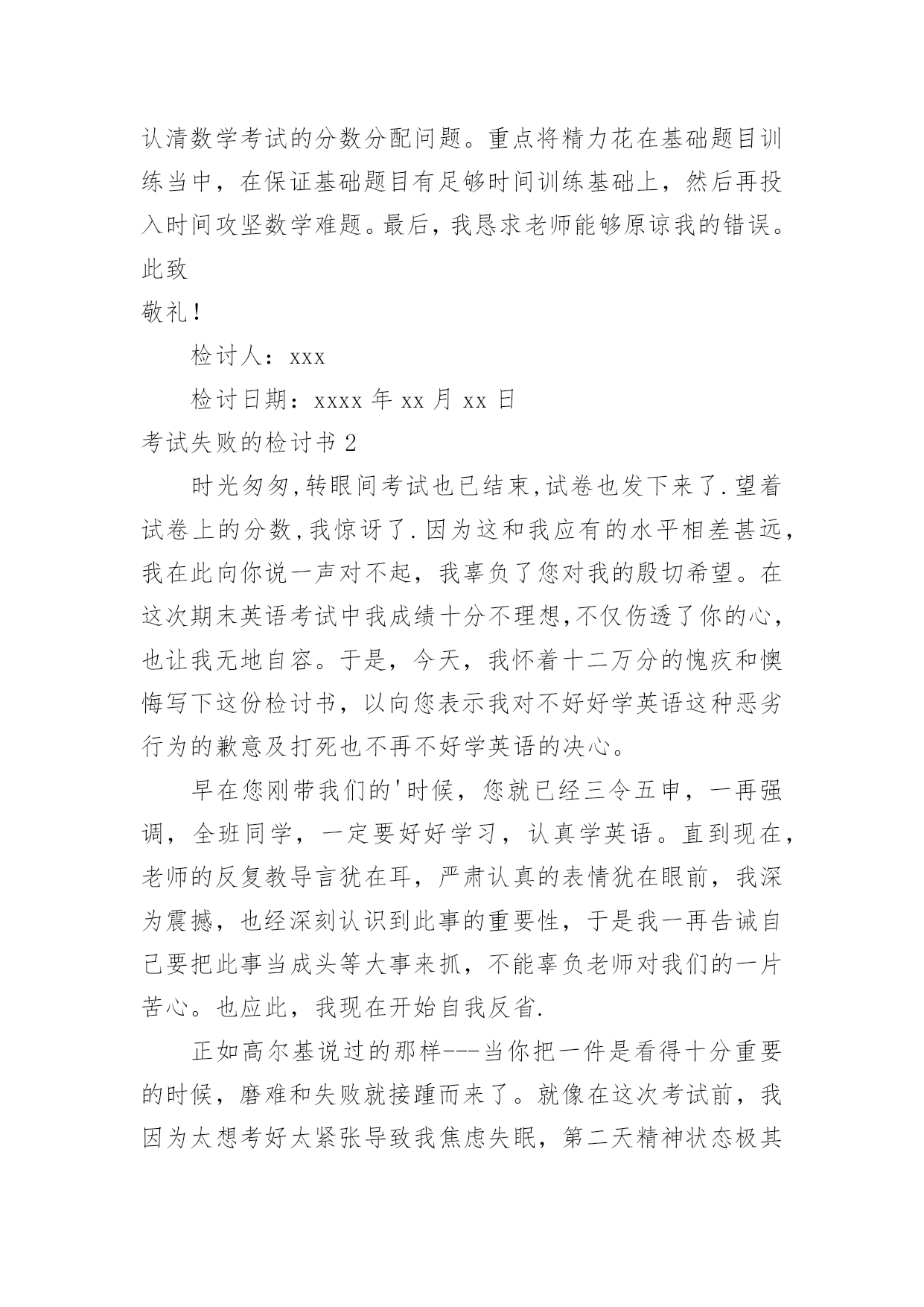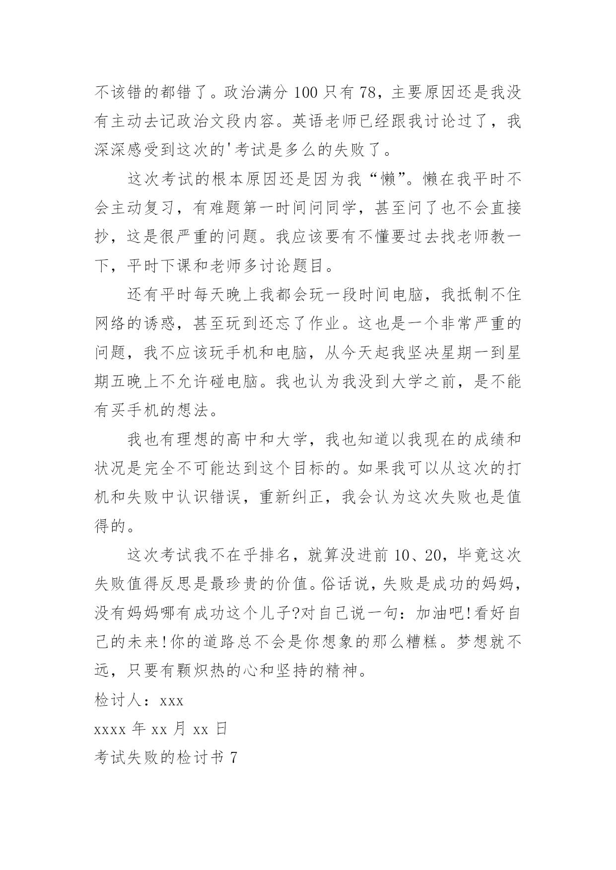 考试失败的检讨书考试失败的检讨书集锦10篇在学习、工作或生活中出现了过错后,为了表明自己悔改的决心,往往被要求写检讨书来自我检讨,在写检讨书的时候,我们的用语要非常注意。但是你知道怎样才能写的好吗?以下是小编为大家整理的考试失败的检讨书,仅供参考,希望能够帮助到大家。考试失败的检讨书1尊敬的数学老师:您好!此番我在数学考试当中基础题目失分太大,这导致我虽然在后面的难题部分取得了还算可以的分数,但是却因为基础题目失分太大,导致我的数学成绩位于班级倒数几名。回顾错误,我深刻地意识到了您对我的批评是对我的.。向我这样的错误是很愚蠢的,相当于有点“捡芝麻扔西瓜”的情况。众所周知,数学的难题部分往往是不好拿分的,往往绞尽脑汁也只能够得一点点分。可是数学的基础题目就很简单可以拿分啊,简直就是在送分,我为什么要丢失呢。很显然,我这样的错误发生,充分地暴露出我平时不注意基础知识的积累,片面地追求难题攻坚,这是导致我错误的主要原因。现如今,我知道自身错误所在了。从今往后,我一定要认清数学考试的分数分配问题。重点将精力花在基础题目训练当中,在保证基础题目有足够时间训练基础上,然后再投入时间攻坚数学难题。最后,我恳求老师能够原谅我的错误。此致敬礼!检讨人:xxx检讨日期:xxxx年xx月xx日考试失败的检讨书2时光匆匆,转眼间考试也已结束,试卷也发下来了.望着试卷上的分数,我惊讶了.因为这和我应有的水平相差甚远,我在此向你说一声对不起,我辜负了您对我的殷切希望。在这次期末英语考试中我成绩十分不理想,不仅伤透了你的心,也让我无地自容。于是,今天,我怀着十二万分的愧疚和懊悔写下这份检讨书,以向您表示我对不好好学英语这种恶劣行为的歉意及打死也不再不好学英语的决心。早在您刚带我们的'时候,您就已经三令五申,一再强调,全班同学,一定要好好学习,认真学英语。直到现在,老师的反复教导言犹在耳,严肃认真的表情犹在眼前,我深为震撼,也经深刻认识到此事的重要性,于是我一再告诫自己要把此事当成头等大事来抓,不能辜负老师对我们的一片苦心。也应此,我现在开始自我反省.正如高尔基说过的那样---当你把一件是看得十分重要的时候,磨难和失败就接踵而来了。就像在这次考试前,我因为太想考好太紧张导致我焦虑失眠,第二天精神状态极其不好。但归根结底,还是由于我学得不牢固,要不然就是精神不好也不会考这个分。忆起当时,我当时就因为太焦虑不好好复习!但,悔亦晚矣,悔亦晚矣!而其他那些诸如粗心大意,没看清题目的事情我就不想多说了,我知道这些理由说出来都是不能成立的,因为,这所有的问题都只能归结于我没有学扎实,还未能达到一个现代中学生该具有地认识问题的水平。未能对老师们的辛勤劳作做出回报,我越来越清晰地感觉到我是一个对自己,对父母,对老师不负责的人对于我(们)没有考好的事情,所造成的严重后果如下:1、折磨了老师的精神,这样的折磨可能让老师工作分心,造成更为严重的后果。2、影响个人综合水平的提高,使自身在本能提高的条件下未能得到提高,违背父母的意愿,实乃不孝。这次期末考试,我考的不好,在此深刻检讨,希望以后不要再考这个分数……学英语,最重要的就是读,听,背,只要这三个能100%做到的话,那英语成绩,没有100分,也能95分。但是,我却没有做到,没有听,没写好,没背好,什么都只做了三分之一,导致成绩不理想……此次考试后,我深刻检讨,认为深藏在我思想中的致命错误有以下几点:1、思想觉悟不高,对重要事项重视严重不足。就算是有认识,也没能在行动上真正实行起来。2、平时生活懒散。如果不是因为懒散、粗心大意、记忆力水平低,我怎么会把老师教的东西学不扎实?又怎么会考不出分?我平时学习不认真,考试成绩便很好地回报了我,为此,我决定以后好好学。检讨人:日期:考试失败的检讨书3尊敬的生物老师:我要含情脉脉地向您递交我的这篇生物考试失利的检讨书。我这次生物考试仅仅取得了32分,严重地拖累了班级后腿,让您的脸上无光,也让您为我感到失望与伤心。我知道自己成绩不好,归根结底的原因是自己平时不注意认真学习生物。诚然,我在平时真的是没有花多少时间与精力在生物科目的学习上,这才最终导致我的生物成绩不及格。其次,这次考试的`失利也有原因在我的考试态度上。考试当中我存在马虎大意的情况,就连一些很基础的题目也没有做对,这就很说不过去了。身为一名理科学生,理综的三门课物理、化学、生物是缺一不可的。而我竟然没有把握好生物的基础知识,我知道自己犯了错误。这次考试我如此失利,在我个人心头上也是非常懊恼的。我恰恰是败给了自己,假如我平时多注意巩固一下生物知识,这次考试也不会如此糟糕。可是我坚信:“一次失利不会永久失利”。请老师相信我,我一定要从此次错误当中吸取经验教训,今后努力学习一定要在生物科目上取得优良学习成绩。此致敬礼!检讨人:20xx年