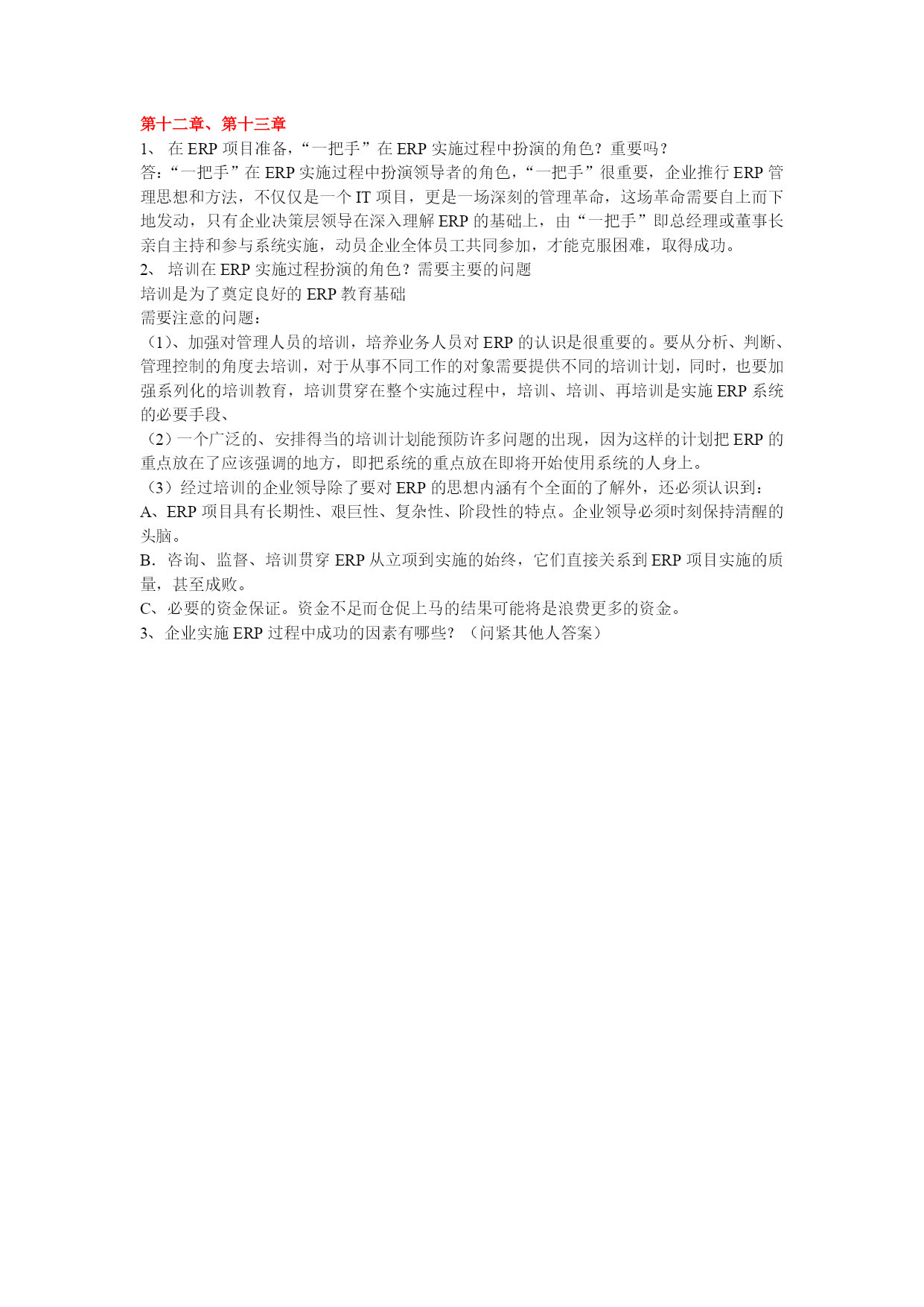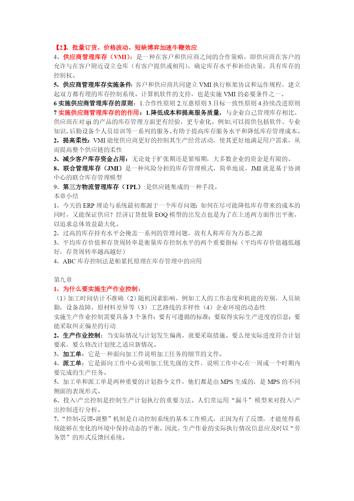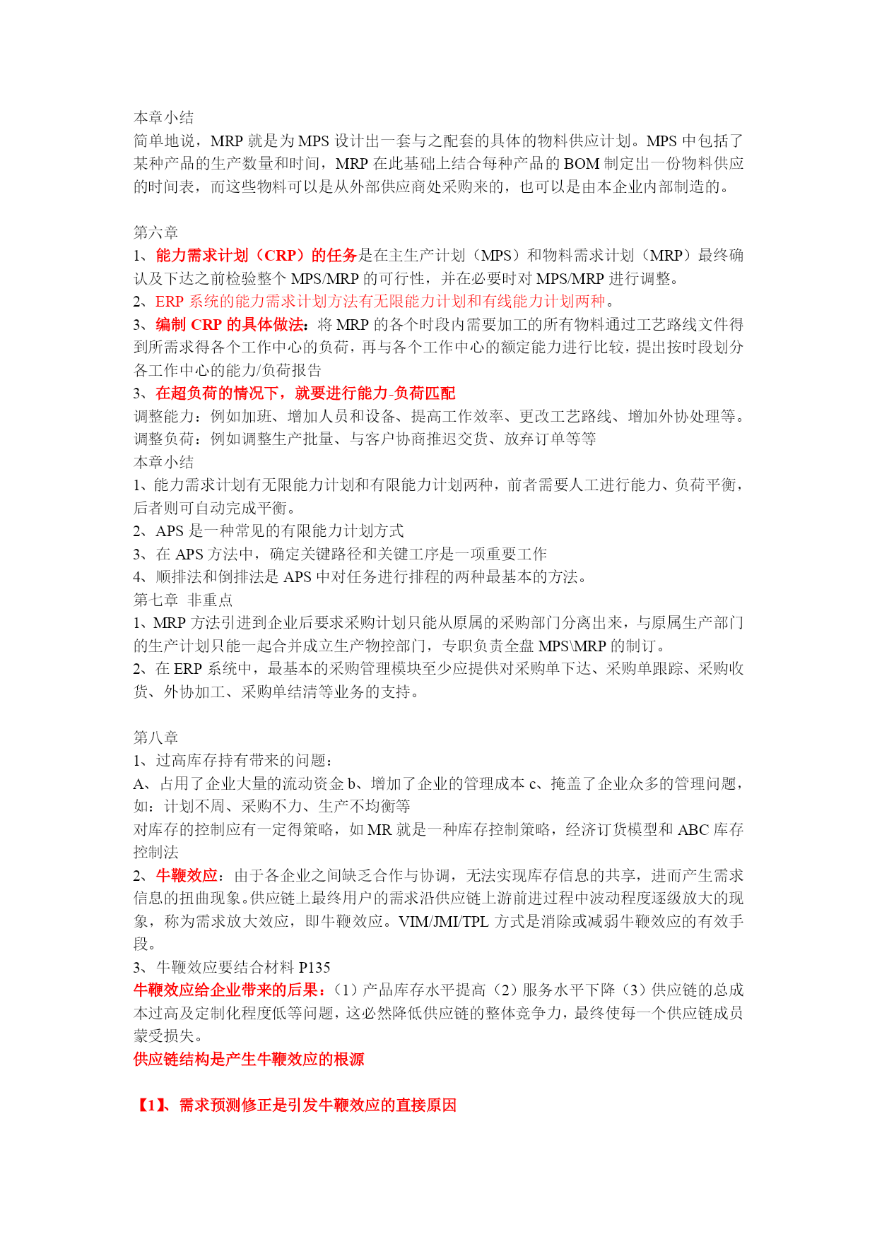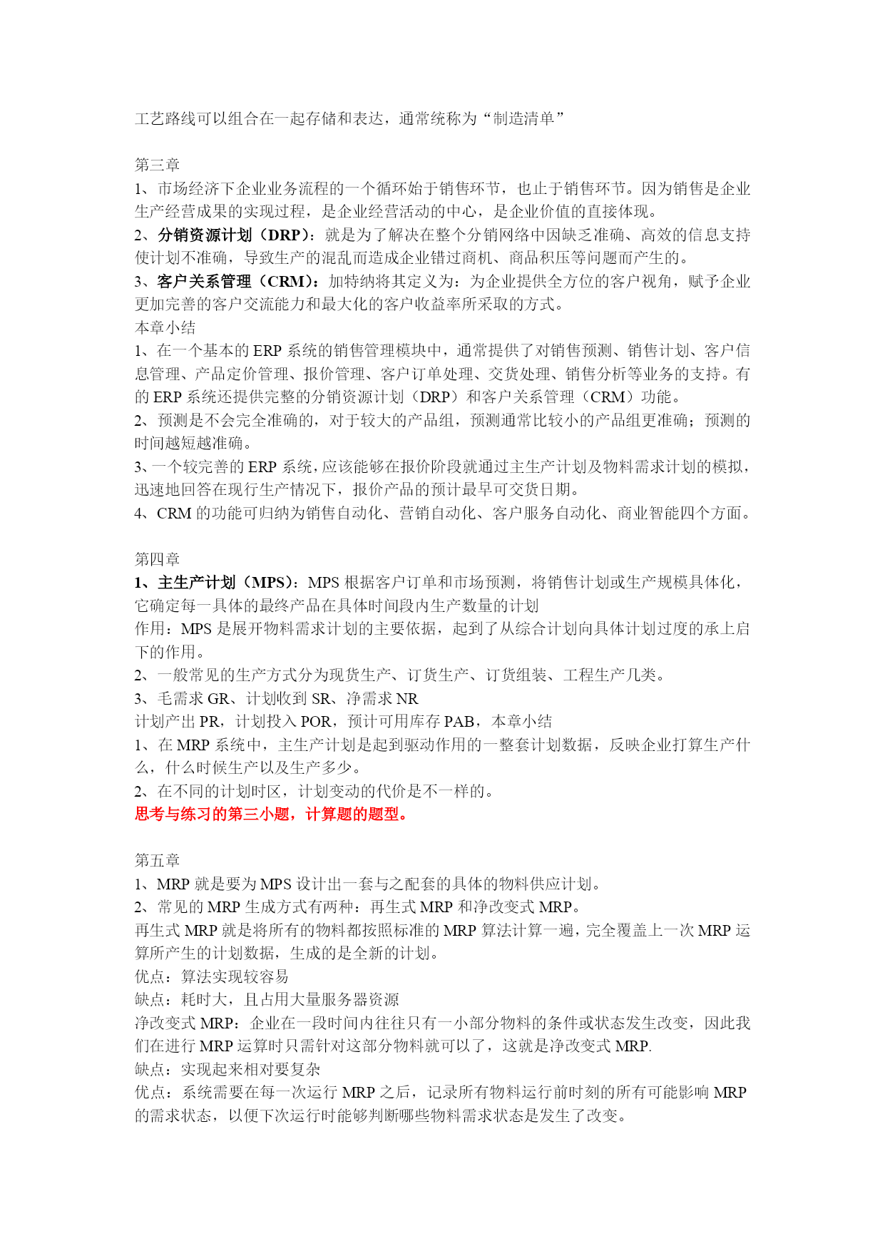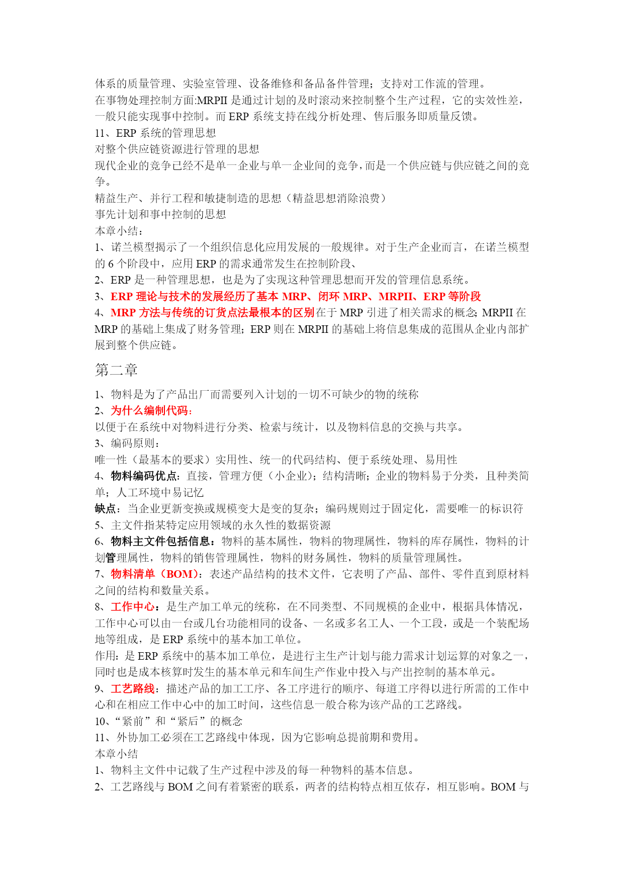 ERP复习资料第一章1.诺兰模型将一个组织信息化的阶段2、诺兰认为,控制阶段设计实现从计算机管理为主到数据管理为主的转换的关键。3、ERP为企业带来的效益通过实施ERP,优化管理流程,规范管理程序,细化管理对象,强化管理力度,实现资金的集中管理和有效监控,减少决策的盲目性,将会大大提高企业的管理效率和水平。直接效益:1.库存下降30%-50%这使一般用户的库存周转率何流动比率提高50%,2.延期交货减少80%,3.采购提前期缩短50%,4.停工待料减少60%,5.制造成本降低12%,6.管理人员减少10%生产能力提高10%-15%间接效益:1.使企业的基本数据更加完备和精细,准确度大为提高,2.使企业高层的决策更加快捷科学,企业对市场的应变能力和速度得到提高,3.使企业的员工从繁琐的手工管理中解脱出来,从而能有更多的时间从事真正有意义的管理工作,4.理顺了企业的业务流程,打破了企业各部门之前条块分割的格局,增强了员工的全局观念,是部门间的协同工作能力得到提升,5.使企业的管理跟家规范,减少企业管理中的随意性,提高计划性。4、首次提出的ERP概念主要内涵是在制造资源计划的基础上5、ERP的概念:是一种以销售、采购、制造、成本、财务、服务和质量等管理功能为一体,以市场需求为导向,以实现企业内外资源优化配置、消除生产经营中一切无效的劳动和资源,实现信息流、物流、资金流的集成与提高企业竞争力未目标,以计划与控制为主线,以网络和信息技术为平台,面向供应链管理的现代企业管理思想、方法和工具。6、订货点模型的优点:确定安全库存,防止缺货现象。缺点:(1)盲目性:对需求的情况不了解,盲目地维持一定量的库存会造成资金积压。(2)高库存和低服务水平:订货点模型使得低库存和高服务水平两者不可兼得(3)形成“快状”需求。订货点模型假定需求是均匀,但是在制造过程中形成的需求常常是非均匀的,导致库存的上升。7、独立需求:指与其他任何项目中的物料需求无关的物料的需求。典型例子如客户对成品、半成品或配件的订货。相关需求:指与其他物料或产品需求相关的物料需求。典型例子如原材料、不用于直接销售的采购或自制的零件或部件。8、闭环MRP系统除了物料需求计划外,还将生产能力需求计划、车间作业计划和采购作业计划也全部纳入MRP,形成一个闭合系统。9、MRPⅡ:人们把生产、财务、销售、工程技术、采购等各个子系统集成为一个一体化的系统。10、ERP与MRPII的主要区别在资源管理范围方面:MRPII主要侧重于企业内部人、财、物等资源的管理,ERP系统在MRPII的基础上扩展了管理范围,它把客户需求和企业内部的制造活动、以及供应商的制造资源整合在一起在生产方式管理方面:MRPII系统把企业归类为几种典型的生产方式进行管理,对每一种类型都有一套管理标准。在20世界80年代末到90年代初,生产方式由单一的向混合型生产发展,ERP则能很好地支持和管理混合型制造环境,满足了企业的这种多角化经营的需求。在管理功能方面:ERP除了MRPII系统的制造、分销、财务管理功能外,还增加了支持整个供应链上物料流通体系中供、产、需各个环节之间的运输管理和仓库管理;支持生产保障体系的质量管理、实验室管理、设备维修和备品备件管理;支持对工作流的管理。在事物处理控制方面:MRPII是通过计划的及时滚动来控制整个生产过程,它的实效性差,一般只能实现事中控制。而ERP系统支持在线分析处理、售后服务即质量反馈。11、ERP系统的管理思想对整个供应链资源进行管理的思想现代企业的竞争已经不是单一企业与单一企业间的竞争,而是一个供应链与供应链之间的竞争。精益生产、并行工程和敏捷制造的思想(精益思想消除浪费)事先计划和事中控制的思想本章小结:1、诺兰模型揭示了一个组织信息化应用发展的一般规律。对于生产企业而言,在诺兰模型的6个阶段中,应用ERP的需求通常发生在控制阶段、2、ERP是一种管理思想,也是为了实现这种管理思想而开发的管理信息系统。3、ERP理论与技术的发展经历了基本MRP、闭环MRP、MRPII、ERP等阶段4、MRP方法与传统的订货点法最根本的区别在于MRP引进了相关需求的概念;MRPII在MRP的基础上集成了财务管理;ERP则在MRPII的基础上将信息集成的范围从企业内部扩展到整个供应链。第二章1、物料是为了产品出厂而需要列入计划的一切不可缺少的物的统称2、为什么编制代码:以便于在系统中对物料进行分类、检索与统计,以及物料信息的交换与共享。3、编码原则:唯一性(最基本的要求)实用性、统一的代码结构、便于系统处理、易用性4、物料编码优点:直接,管理方便(小企业);结构清晰;企业的物料易于分类,且种类简单;人工环境中易