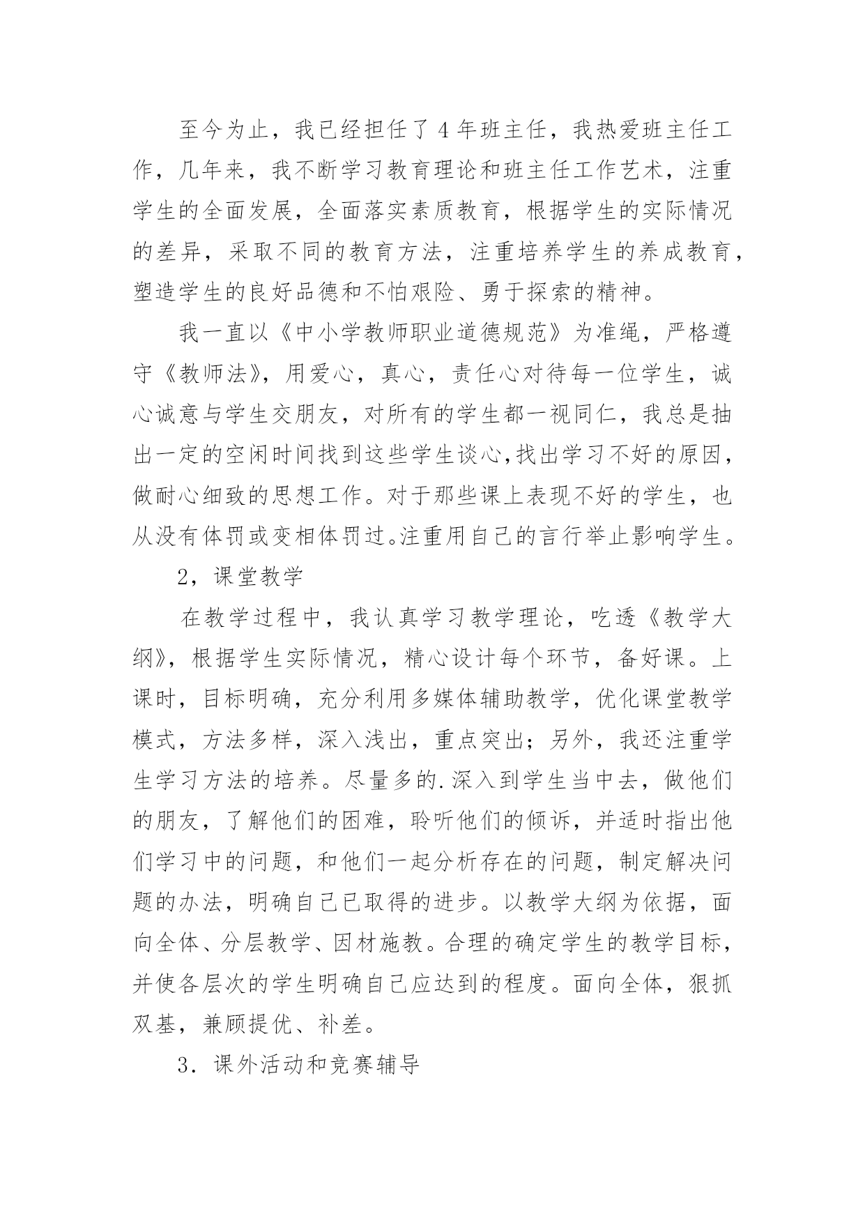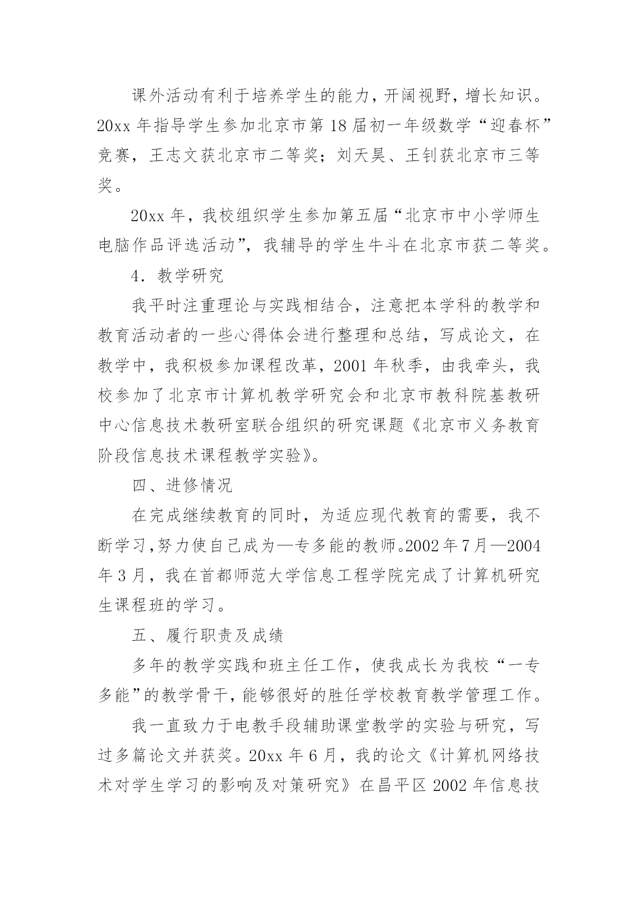 政治的教学反思政治的教学反思我自19xx年参加工作至今已经8年了,任职以来,我—直兢兢业业的工作着,受到了学校领导和老师们的一致好评。下面将我的工作总结如下:一、政治思想自任职以来,我—直以《中小学教师职业道德规范》为准绳,严格遵守《教师法》,努力坚持理论学习,勤奋工作。为人师表,教书育人,重视教育理论的学习和研究,爱岗敬业,严谨治学,把培养学生的能力和提高教育教学水~平作为自己的追求。二、业务水平作为一名光荣的人民教师,担负着教书育人的重任,教师的素质直接影响着学生。我于1998年毕业于首都师范大学数学系数学教育专业本科班,为了进—步提高自己的专业知识水~平,参加工作以来,我一直积极进取,利用各种机会努力学习,充实自己。多年来,我虚心学习,不仅完成了数学继续教育学习任务,而且还完成了计算机研究生课程班的进修,现在已经结业。另外,我还利用一切机会抓紧自学成才,熟练的掌握了计算机网络,目前担任我校网管,并且负责网站的设计、制作和维护。三、教育教学能力1.班主任工作至今为止,我已经担任了4年班主任,我热爱班主任工作,几年来,我不断学习教育理论和班主任工作艺术,注重学生的全面发展,全面落实素质教育,根据学生的实际情况的差异,采取不同的教育方法,注重培养学生的养成教育,塑造学生的良好品德和不怕艰险、勇于探索的精神。我一直以《中小学教师职业道德规范》为准绳,严格遵守《教师法》,用爱心,真心,责任心对待每一位学生,诚心诚意与学生交朋友,对所有的学生都一视同仁,我总是抽出一定的空闲时间找到这些学生谈心,找出学习不好的原因,做耐心细致的思想工作。对于那些课上表现不好的学生,也从没有体罚或变相体罚过。注重用自己的言行举止影响学生。2,课堂教学在教学过程中,我认真学习教学理论,吃透《教学大纲》,根据学生实际情况,精心设计每个环节,备好课。上课时,目标明确,充分利用多媒体辅助教学,优化课堂教学模式,方法多样,深入浅出,重点突出;另外,我还注重学生学习方法的培养。尽量多的.深入到学生当中去,做他们的朋友,了解他们的困难,聆听他们的倾诉,并适时指出他们学习中的问题,和他们一起分析存在的问题,制定解决问题的办法,明确自己已取得的进步。以教学大纲为依据,面向全体、分层教学、因材施教。合理的确定学生的教学目标,并使各层次的学生明确自己应达到的程度。面向全体,狠抓双基,兼顾提优、补差。3.课外活动和竞赛辅导课外活动有利于培养学生的能力,开阔视野,增长知识。20xx年指导学生参加北京市第18届初一年级数学“迎春杯”竞赛,王志文获北京市二等奖;刘天昊、王钊获北京市三等奖。20xx年,我校组织学生参加第五届“北京市中小学师生电脑作品评选活动”,我辅导的学生牛斗在北京市获二等奖。4.教学研究我平时注重理论与实践相结合,注意把本学科的教学和教育活动者的一些心得体会进行整理和总结,写成论文,在教学中,我积极参加课程改革,2001年秋季,由我牵头,我校参加了北京市计算机教学研究会和北京市教科院基教研中心信息技术教研室联合组织的研究课题《北京市义务教育阶段信息技术课程教学实验》。四、进修情况在完成继续教育的同时,为适应现代教育的需要,我不断学习,努力使自己成为—专多能的教师。2002年7月—2004年3月,我在首都师范大学信息工程学院完成了计算机研究生课程班的学习。五、履行职责及成绩多年的教学实践和班主任工作,使我成长为我校“一专多能”的教学骨干,能够很好的胜任学校教育教学管理工作。我一直致力于电教手段辅助课堂教学的实验与研究,写过多篇论文并获奖。20xx年6月,我的论文《计算机网络技术对学生学习的影响及对策研究》在昌平区2002年信息技术教学论文评选中,荣获二等奖;20xx年9月,我为教育部教育管理中心投递的论文《浅谈昌平二中信息化建设和信息技术教育》被专家组评审会评审通过,编入《中国教育信息化建设与应用指南》,并在全国出版发行。展望教育的未来,我充满了信心和憧憬。我将加倍努力,我祖国的教育事业做出自己的无私奉献。