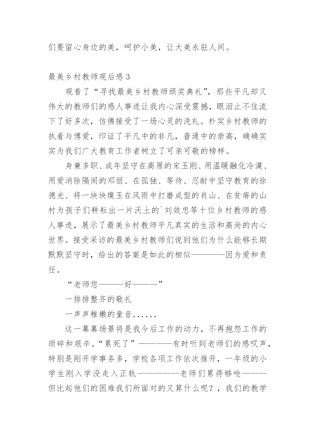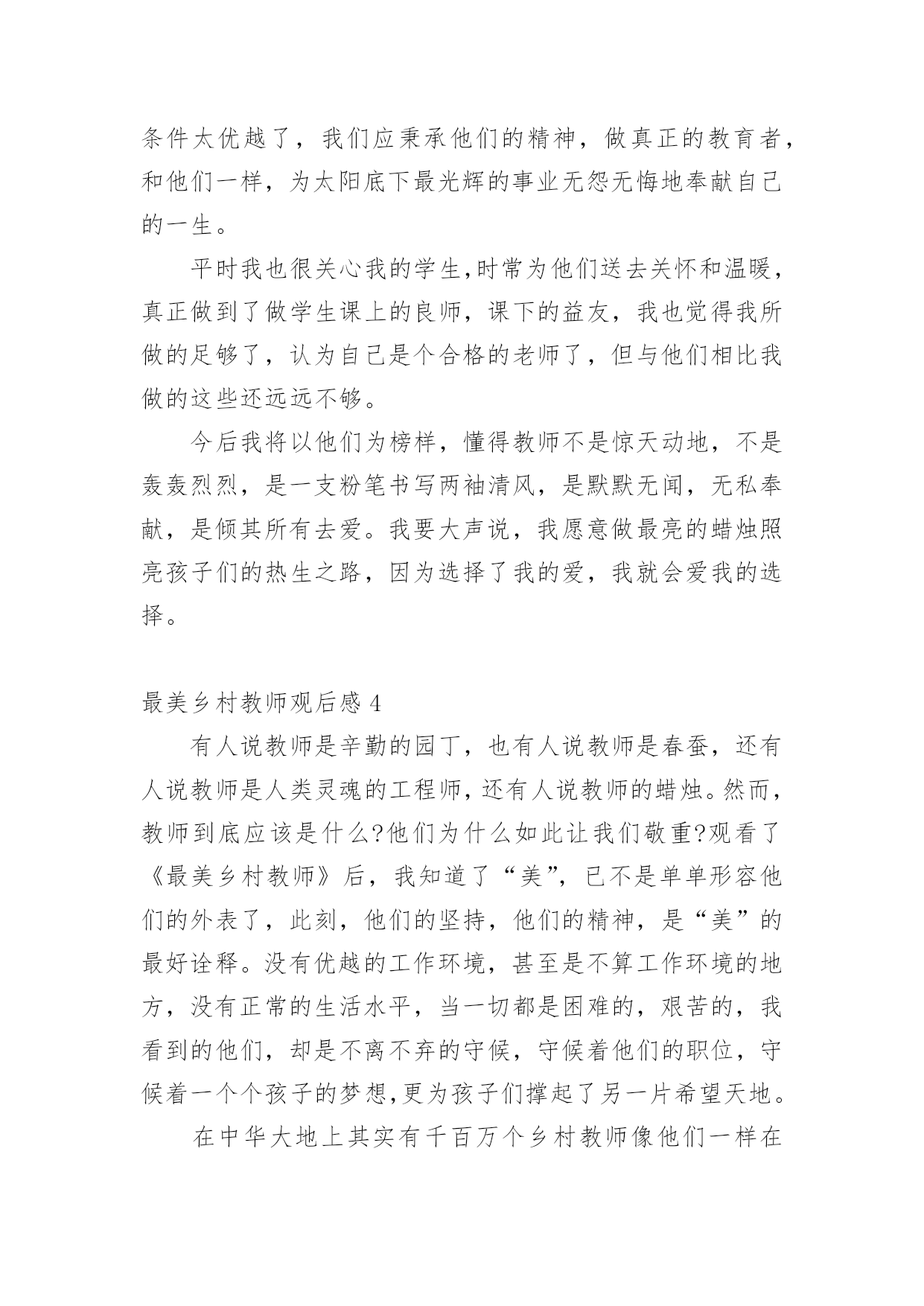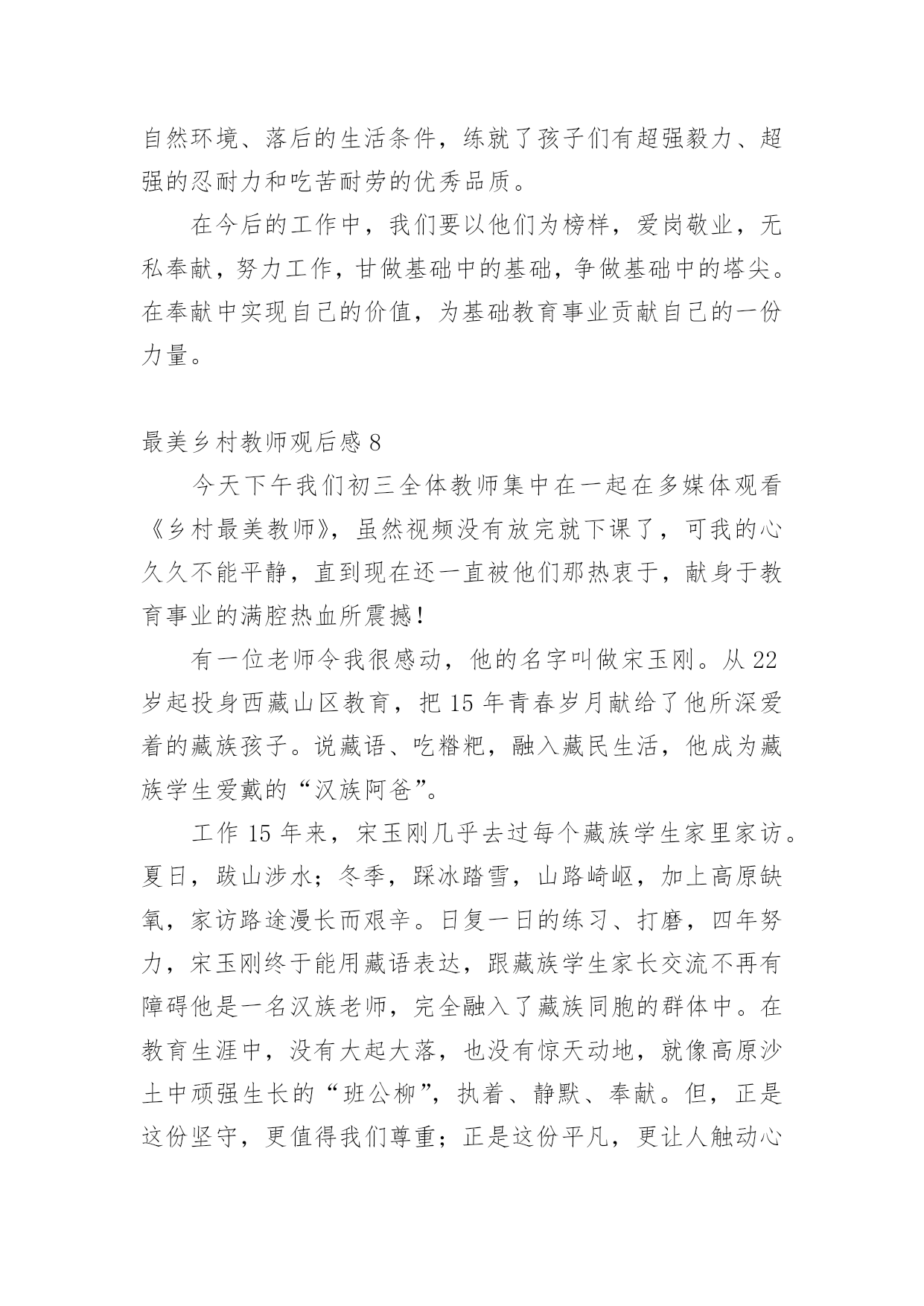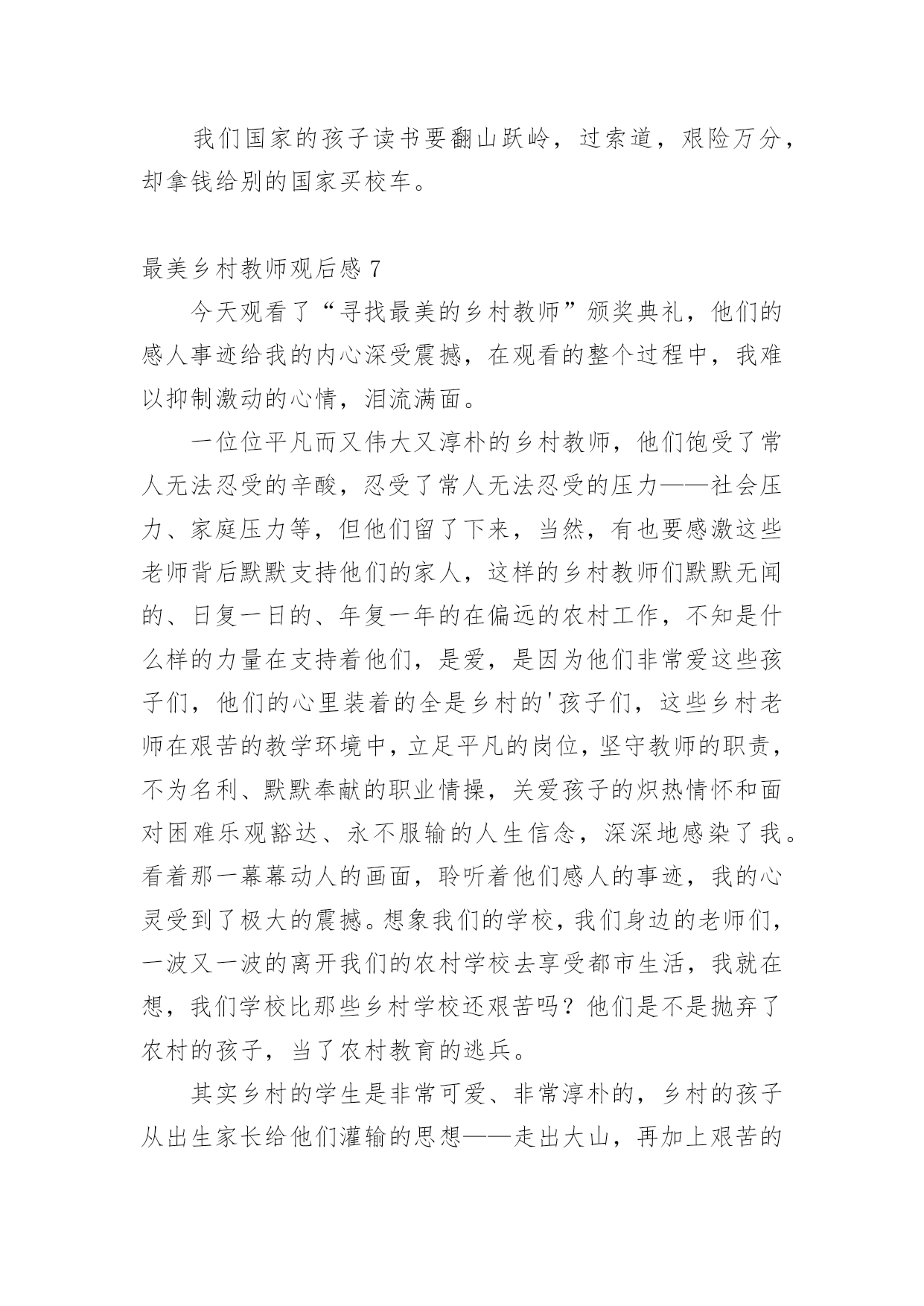 最美乡村教师观后感最美乡村教师观后感[精品]看完一部作品以后,相信大家一定领会了不少东西,不能光会看哦,写一篇观后感吧。到底应如何写观后感呢?下面是小编为大家收集的最美乡村教师观后感,仅供参考,大家一起来看看吧。最美乡村教师观后感1“教师是世界上最芬芳的职业”,这是我看完“寻找最美乡村教师”颁奖典礼晚会后最强烈的感受。这些教师们虽然没有豪言壮语,也没有惊天动地,但他们用淡泊名利、执着坚守、甘于奉献的精神品格和高尚情操给我们展现了一个伟大教师的形象,也是对最美乡村教师最好的诠释。其中让我最感动的是邓丽教师。湖北恩施高原小学的邓丽教师,在她来到这所学校前,这里没有女老师,7位男老师的平均年龄是52岁。邓老师20xx年从中南民族大学工商学院毕业,在来到高原小学前是武汉一家知名的培训机构的老师,每天出入写字楼,月收入4000元左右。一年后,邓丽参加了“农村教师资助行动计划”,并主动要求到海拔1800多米的高原小学任教。高原小学的老师们知识结构老化,不会说普通话,更不会教英语,学生流失比较严重,邓丽来的第一件事就是家访,说服家长把辍学的孩子送来,哪怕一个学期先看看效果。结果从那以后,高原小学的学生减少不超过1人。邓丽让孩子们的学习成绩大幅度提高,尤其是英语成了孩子们最喜欢的课程。最美教师"邓丽"老师去山里教那些山里娃,带领高原的学生度过了四年的课程,虽然其中有一位聋哑学生,邓老师仍然坚持教他们,邓老师创造了很多手语,尽量能让那位学生看懂。其中有一句我印象是最深的,那就是:“我们永远和你在一起”。这句话后来成为了全校师生的座右铭。看完“寻找最美乡村教师”颁奖典礼晚会后,我对教师这份工作有了新的理解,那就是:不要和别人比,尽自己的能力去做,哪怕别人看不到自己的'工作,有一份光,发一份热。这些乡村教师,用自己朴素的心对抗者恶劣的生存环境;用自己执着的信念引领着一批批的孩子叩响求知的大门;用自己无私的付出,成就了山里孩子的人生。正如歌曲所唱“我们眼里你最美,我们眼里你最好……”清新简单的旋律、朗朗上口的歌词唱出了孩子们的心声,也唱出了我的心声,这是我对教师们的崇高敬意。最美乡村教师观后感2有一种美是风花雪月,它是一种小美。还有一种美它有道德,传递信念,坚持和谐,这是大美。在年的开学第一课中我们看到了最美的妈妈、最美的司机等等,他们的行为是大美、是大爱!让我最喜欢的是山村女教师邓丽老师。邓丽老师在湖北恩施海拔一千八百多米的高原小学里是唯一一位年轻女教师,学校地处深山,环境恶劣,到了气候严寒的季节孩子们洗不了澡,她和乡亲们一起动手为孩子们改造了学校的第一个洗澡间,她希望给孩子们带来温暖,带来一个开心的童年,也希望给他们带来改变。在一节美术课上孩子们认真地画画,还是把心目中最美的老师不是画成了老太太就是画成了一个“男人”,她没有责备,而是一直鼓励孩子们去观察美,用画笔把心中的`美留下来,慢慢地孩子们画得越来越好,当镜头中两个学生将自己亲手制作的卡片送给她们心中最美的老师时,我不禁为之动容。在孩子们眼里的邓丽老师是一个善良、心灵美的亲人,我看到她用自己最宝贵的青春换来了大山中辍学孩子迈出探索世界的脚步!从邓丽老师身上,我想到了千千万万位默默无闻、无私奉献的老师们。他们默默坚守,不计报酬、辛劳和回报,有的还像邓丽老师一样,放弃了城市优裕舒适的生活,到偏远贫穷的基层学校手执教鞭,用他们的大美来成就孩子们无数的小美!是啊,老师们就像园丁,培养着祖国的花朵;老师们就是一支支红烛,燃烧自己为我们贡献出光和热;老师们无愧于人类灵魂工程师的称号,他们为我们搭建了知识的桥梁,他们日出而行,日落才归,传播知识,播种希望,用博大的胸襟包容、关爱着年幼无知的'我们。我想用“桃李满天下,春晖遍四方”这句诗,是对老师们最好回报罢!邓丽老师用自己的言行告诉我们生活中处处都有美,我们要留心身边的美,呵护小美,让大美永驻人间。最美乡村教师观后感3观看了“寻找最美乡村教师颁奖典礼”,那些平凡却又伟大的教师们的感人事迹让我内心深受震撼,眼泪止不住流下了好多次,仿佛接受了一场心灵的洗礼。朴实乡村教师的执着与博爱,印证了平凡中的非凡,普通中的崇高,确确实实为我们广大教育工作者树立了可亲可敬的榜样。身兼多职、成年坚守在高原的宋玉刚、用温暖融化冷漠、用爱消除隔阂的邓丽、在孤独、等待、忍耐中坚守教育的徐德光、将一块块璞玉在风雨中打磨成型的肖山、在贫瘠的山村为孩子们耕耘出一片沃土的`刘效忠等十位乡村教师的感人事迹,展示了最美乡村教师平凡真实的生活和高尚的内心世界。接受采访的最美乡村教师们说到他们为什么能够长期默默坚守时,给出的答案是如此的相似————因为爱和责任。“老师您———好———”一排排整齐的敬礼一声声稚嫩的童音......这一幕幕场景将是我今后工作的动力,不再抱怨工作的琐碎和艰辛。“累死