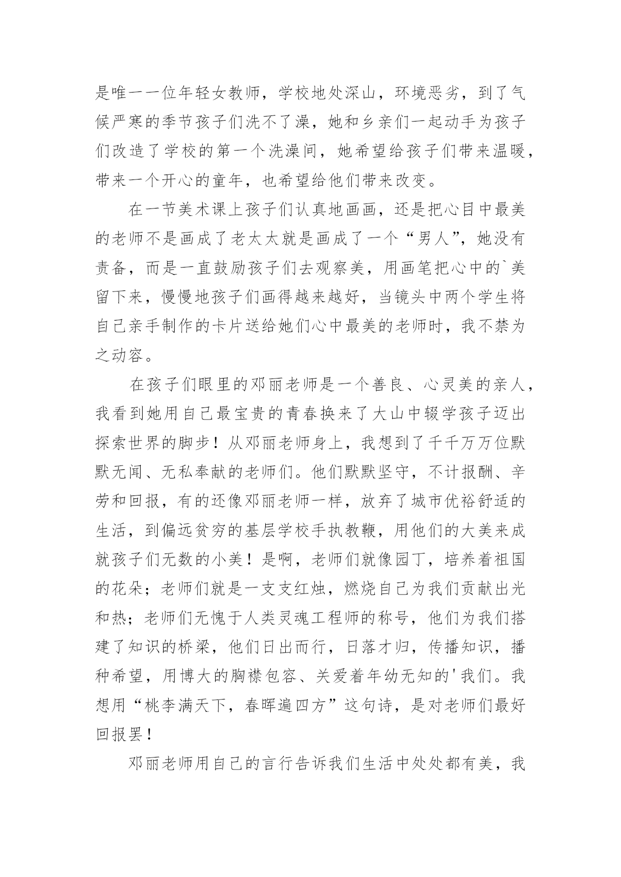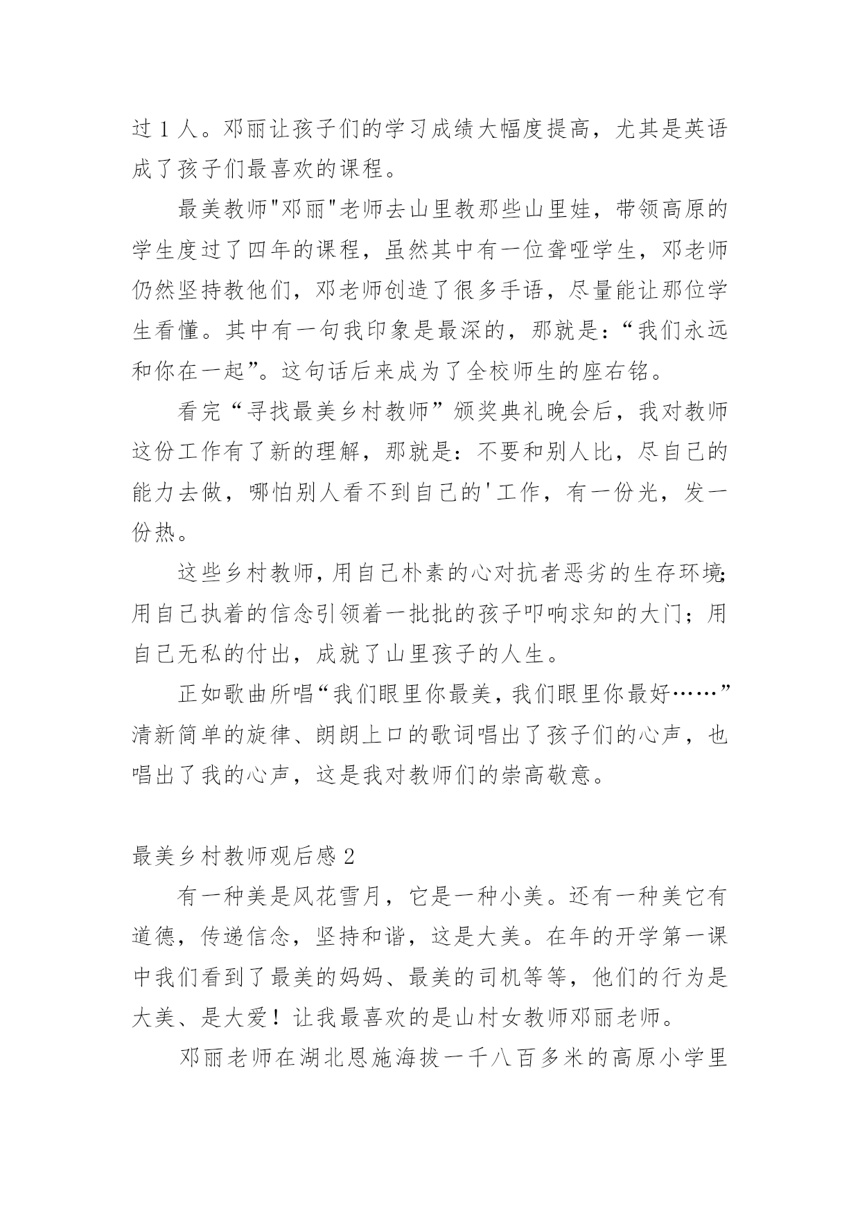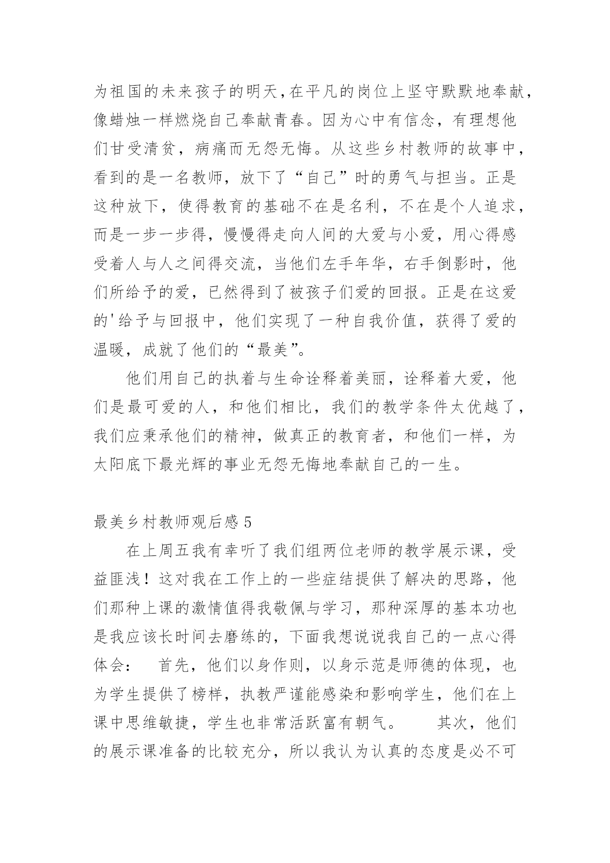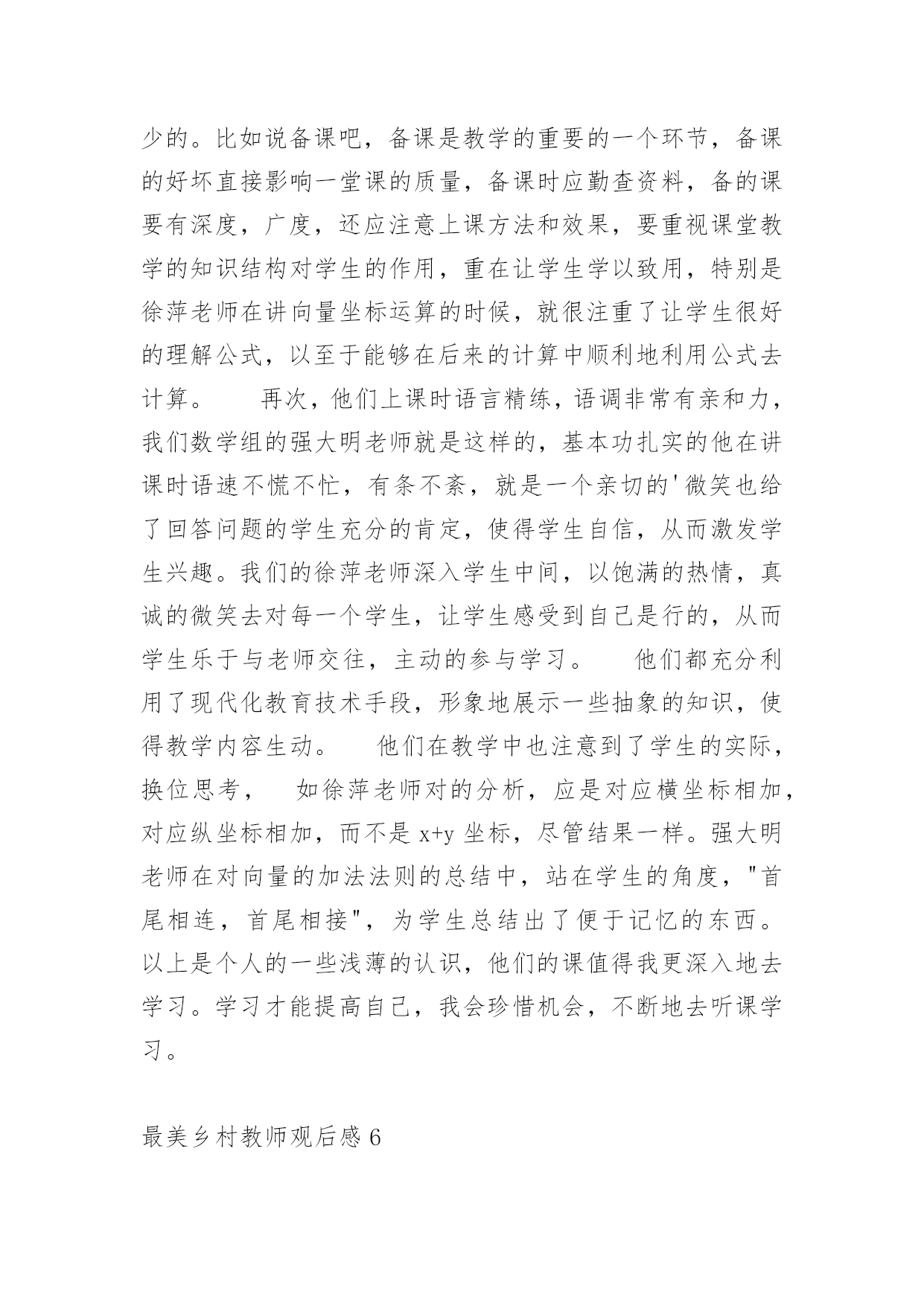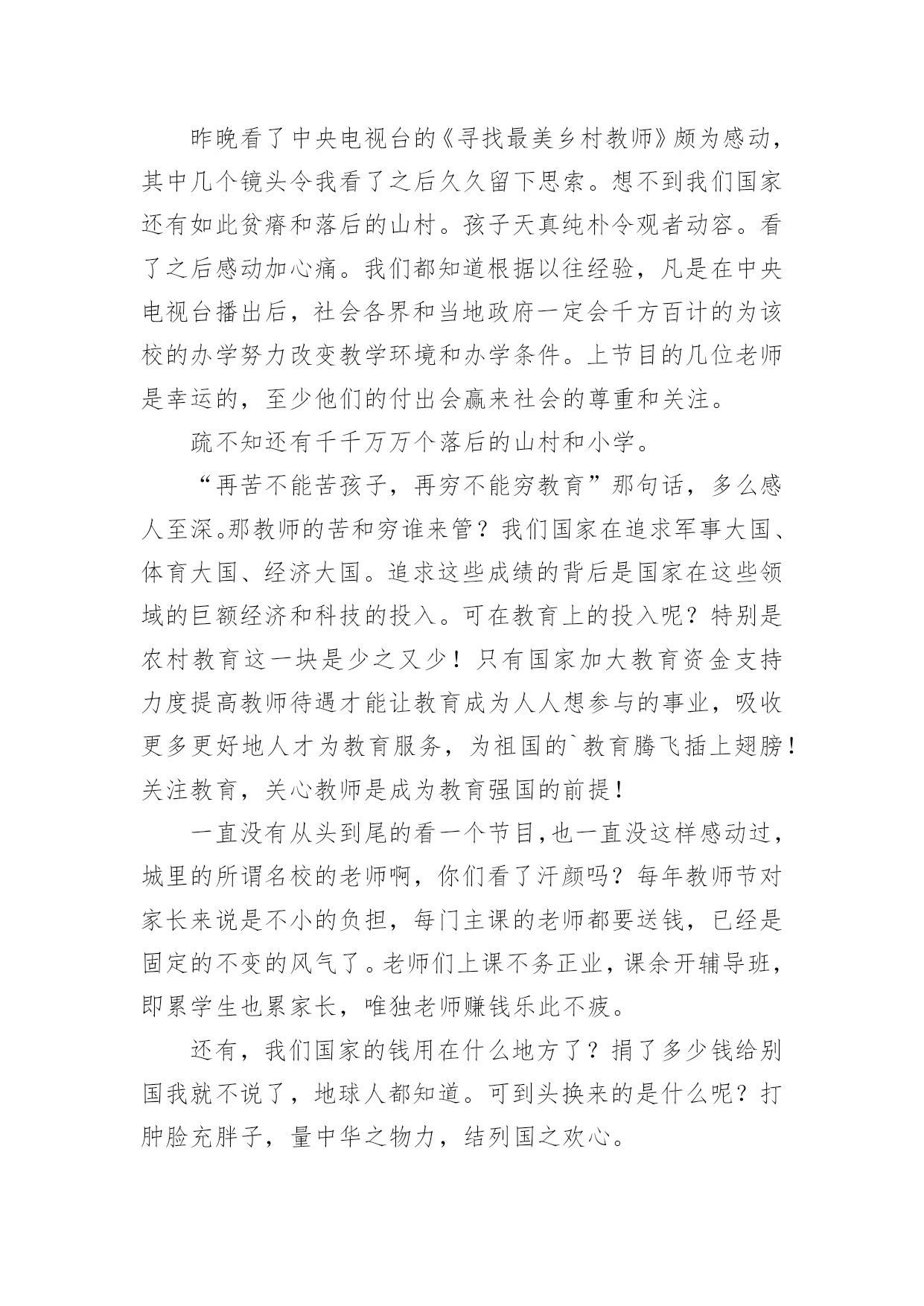 最美乡村教师观后感最美乡村教师观后感[精品]看完一部作品以后,相信大家一定领会了不少东西,不能光会看哦,写一篇观后感吧。到底应如何写观后感呢?下面是小编为大家收集的最美乡村教师观后感,仅供参考,大家一起来看看吧。最美乡村教师观后感1“教师是世界上最芬芳的职业”,这是我看完“寻找最美乡村教师”颁奖典礼晚会后最强烈的感受。这些教师们虽然没有豪言壮语,也没有惊天动地,但他们用淡泊名利、执着坚守、甘于奉献的精神品格和高尚情操给我们展现了一个伟大教师的形象,也是对最美乡村教师最好的诠释。其中让我最感动的是邓丽教师。湖北恩施高原小学的邓丽教师,在她来到这所学校前,这里没有女老师,7位男老师的平均年龄是52岁。邓老师20xx年从中南民族大学工商学院毕业,在来到高原小学前是武汉一家知名的培训机构的老师,每天出入写字楼,月收入4000元左右。一年后,邓丽参加了“农村教师资助行动计划”,并主动要求到海拔1800多米的高原小学任教。高原小学的老师们知识结构老化,不会说普通话,更不会教英语,学生流失比较严重,邓丽来的第一件事就是家访,说服家长把辍学的孩子送来,哪怕一个学期先看看效果。结果从那以后,高原小学的学生减少不超过1人。邓丽让孩子们的学习成绩大幅度提高,尤其是英语成了孩子们最喜欢的课程。最美教师"邓丽"老师去山里教那些山里娃,带领高原的学生度过了四年的课程,虽然其中有一位聋哑学生,邓老师仍然坚持教他们,邓老师创造了很多手语,尽量能让那位学生看懂。其中有一句我印象是最深的,那就是:“我们永远和你在一起”。这句话后来成为了全校师生的座右铭。看完“寻找最美乡村教师”颁奖典礼晚会后,我对教师这份工作有了新的理解,那就是:不要和别人比,尽自己的能力去做,哪怕别人看不到自己的'工作,有一份光,发一份热。这些乡村教师,用自己朴素的心对抗者恶劣的生存环境;用自己执着的信念引领着一批批的孩子叩响求知的大门;用自己无私的付出,成就了山里孩子的人生。正如歌曲所唱“我们眼里你最美,我们眼里你最好……”清新简单的旋律、朗朗上口的歌词唱出了孩子们的心声,也唱出了我的心声,这是我对教师们的崇高敬意。最美乡村教师观后感2有一种美是风花雪月,它是一种小美。还有一种美它有道德,传递信念,坚持和谐,这是大美。在年的开学第一课中我们看到了最美的妈妈、最美的司机等等,他们的行为是大美、是大爱!让我最喜欢的是山村女教师邓丽老师。邓丽老师在湖北恩施海拔一千八百多米的高原小学里是唯一一位年轻女教师,学校地处深山,环境恶劣,到了气候严寒的季节孩子们洗不了澡,她和乡亲们一起动手为孩子们改造了学校的第一个洗澡间,她希望给孩子们带来温暖,带来一个开心的童年,也希望给他们带来改变。在一节美术课上孩子们认真地画画,还是把心目中最美的老师不是画成了老太太就是画成了一个“男人”,她没有责备,而是一直鼓励孩子们去观察美,用画笔把心中的`美留下来,慢慢地孩子们画得越来越好,当镜头中两个学生将自己亲手制作的卡片送给她们心中最美的老师时,我不禁为之动容。在孩子们眼里的邓丽老师是一个善良、心灵美的亲人,我看到她用自己最宝贵的青春换来了大山中辍学孩子迈出探索世界的脚步!从邓丽老师身上,我想到了千千万万位默默无闻、无私奉献的老师们。他们默默坚守,不计报酬、辛劳和回报,有的还像邓丽老师一样,放弃了城市优裕舒适的生活,到偏远贫穷的基层学校手执教鞭,用他们的大美来成就孩子们无数的小美!是啊,老师们就像园丁,培养着祖国的花朵;老师们就是一支支红烛,燃烧自己为我们贡献出光和热;老师们无愧于人类灵魂工程师的称号,他们为我们搭建了知识的桥梁,他们日出而行,日落才归,传播知识,播种希望,用博大的胸襟包容、关爱着年幼无知的'我们。我想用“桃李满天下,春晖遍四方”这句诗,是对老师们最好回报罢!邓丽老师用自己的言行告诉我们生活中处处都有美,我们要留心身边的美,呵护小美,让大美永驻人间。最美乡村教师观后感3观看了“寻找最美乡村教师颁奖典礼”,那些平凡却又伟大的教师们的感人事迹让我内心深受震撼,眼泪止不住流下了好多次,仿佛接受了一场心灵的洗礼。朴实乡村教师的执着与博爱,印证了平凡中的非凡,普通中的崇高,确确实实为我们广大教育工作者树立了可亲可敬的榜样。身兼多职、成年坚守在高原的宋玉刚、用温暖融化冷漠、用爱消除隔阂的邓丽、在孤独、等待、忍耐中坚守教育的徐德光、将一块块璞玉在风雨中打磨成型的肖山、在贫瘠的山村为孩子们耕耘出一片沃土的`刘效忠等十位乡村教师的感人事迹,展示了最美乡村教师平凡真实的生活和高尚的内心世界。接受采访的最美乡村教师们说到他们为什么能够长期默默坚守时,给出的答案是如此的相似————因为爱和责任。“老师您———好———”一排排整齐的敬礼一声声稚嫩的童音......这一幕幕场景将是我今后工作的动力,不再抱怨工作的琐碎和艰辛。“累死