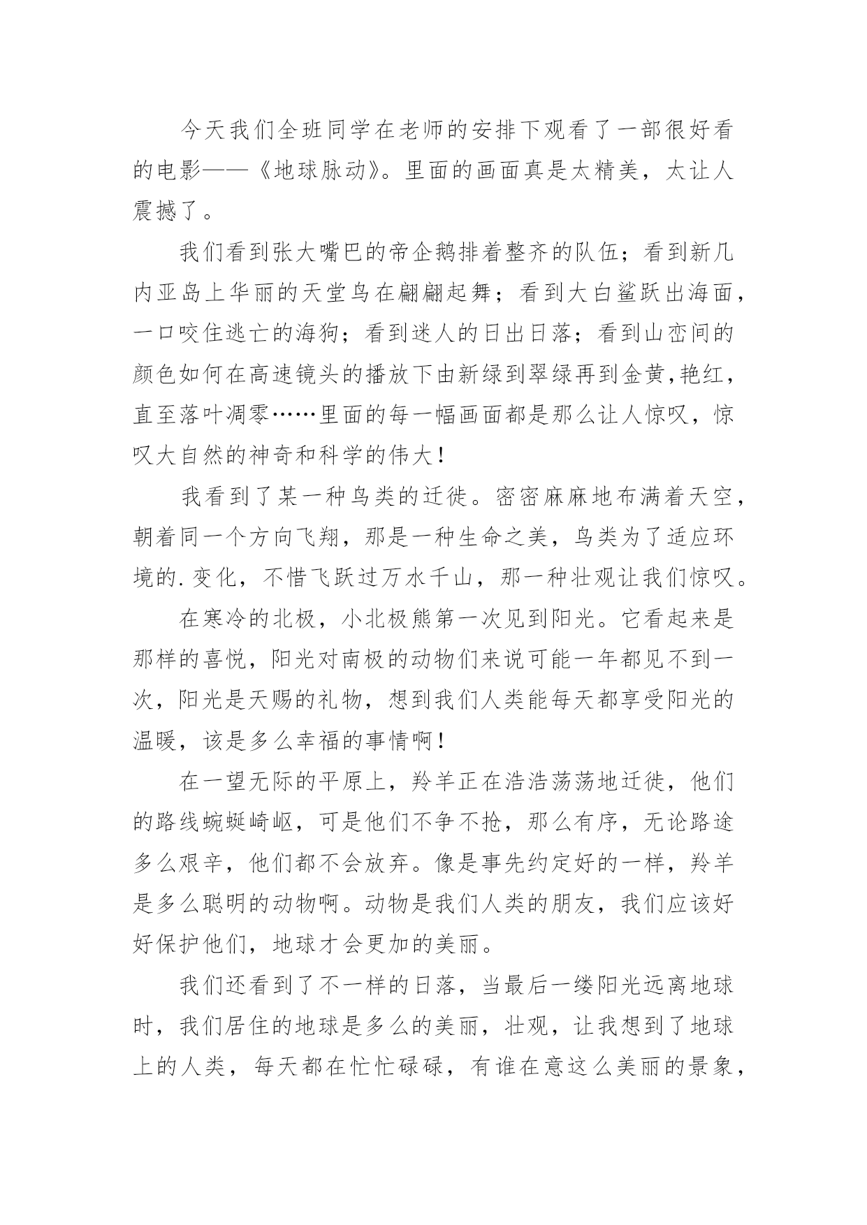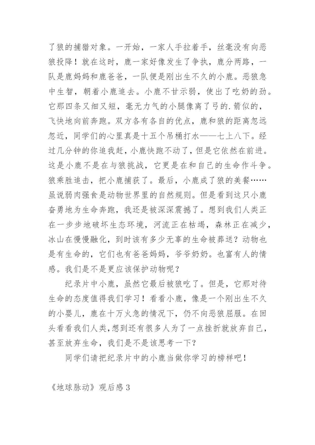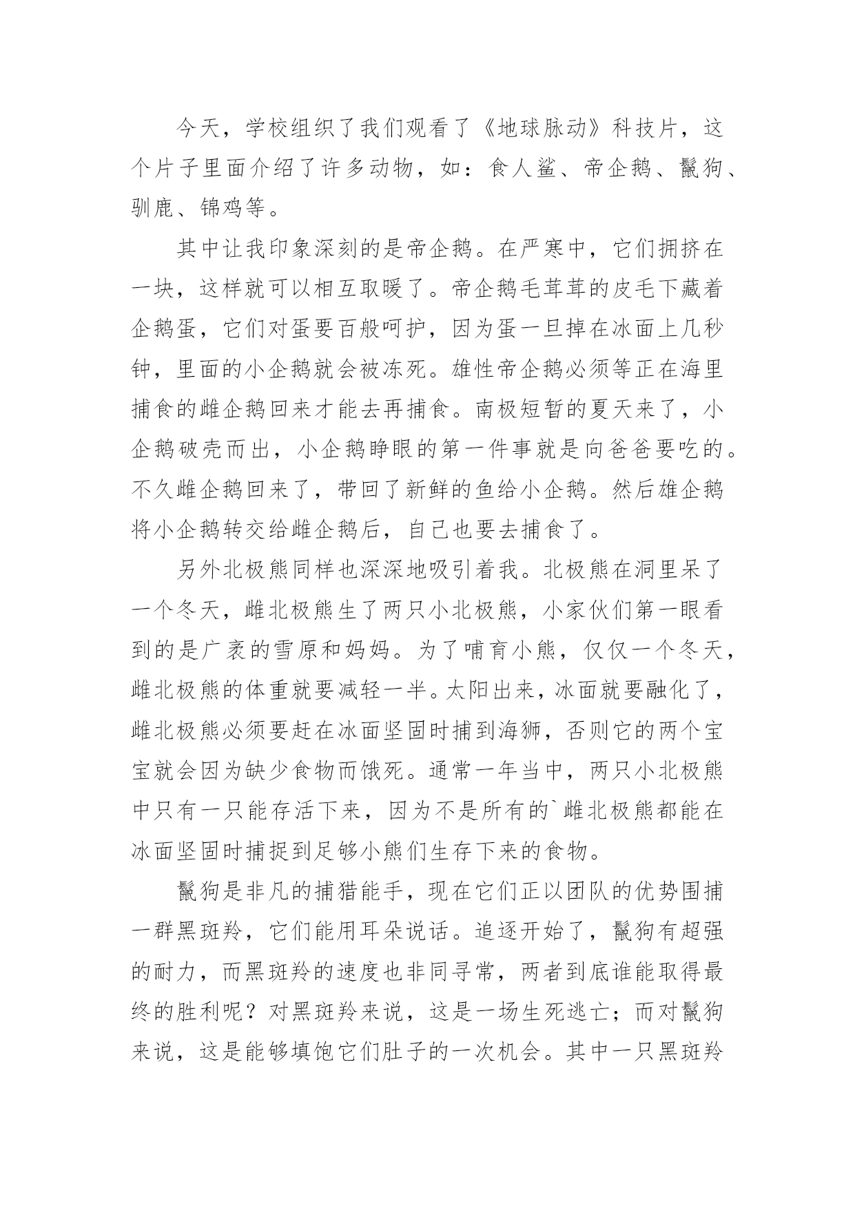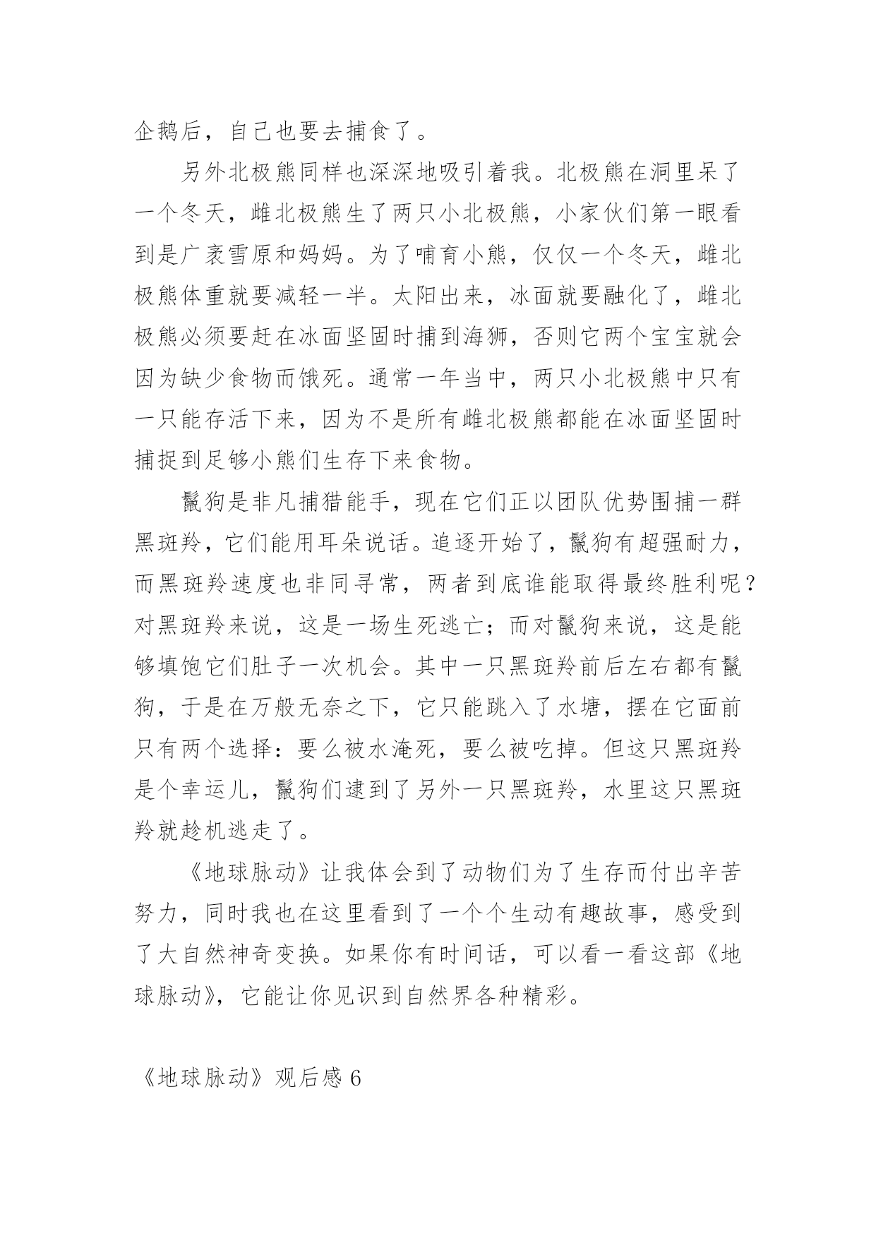 《地球脉动》观后感《地球脉动》观后感15篇当品味完一部作品后,相信大家的视野一定开拓了不少吧,不能光会看哦,写一篇观后感吧。那么你真的懂得怎么写观后感吗?以下是小编收集整理的《地球脉动》观后感,希望对大家有所帮助。《地球脉动》观后感1在地球上生存着许许多多的生物,它们有强者有弱者,但是它们在地球上都有自己的生存环境和生存能力。印度的孟买生活着一群跟人类差不多的猴子,它们为了填饱肚子,每天都要按照平时的生活习惯,去菜市场拿些东西吃,它们往往不会引起人们的注意,但是它们这些拿东西的行为,使得菜市场的老板很不满意。印度西郊有一群花豹,它们猎食农家的猪,它们往往会以迅雷不及掩耳之势,从它们埋伏的地点而出,这样它们就不会引起公猪的注意,从而可以轻而易举的将小猪叼在嘴里,然后跳上高楼,使得公猪追不到它们。澳大利亚有一群鸟,它们的巢生活在地面下,它们的巢往往会建在人们扔掉垃圾的地方,它们需要将自己的巢填得丰满,就必须到别人的巢上去偷些东西,它们有些时候会拿一个玩具汽车或者是一个红桃心。有一只鸟,为了求偶,将它的红桃心给了一只不知道性别的鸟,但是那只鸟是一只小雄鸟,它和一只雌性的鸟看去上去差不多,所以在自然界中求偶也是有风险的。夏天意大利的上空往往会有许许多多的鸟从四面八方赶来,它们在意大利的上空飞翔,排泄,它们的排泄物可以将整个意大利淹没,但是意大利的.人们对这些鸟并没有产生恶感,因为他们认为,这些鸟是天神派来的吉祥鸟,对他们有好处,这也给这些鸟在城市生活中带来了极大的方便。动物在城市生活中往往也会有许许多多的不便利,但是它们也会有许许多多的办法,将这些不便利转为它们非常为之熟悉的环境,这也就是动物们比人类强的地方了。《地球脉动》让我们体会到了动物们为了生存而付出的辛苦努力,同时我也在这里看到了一个个生动有趣的故事,感受到了大自然的神奇变换。相对人类而言,也许这地球上的许许多多生物是弱者,但是这许许多多的生物用自己的适应力,竞争力,创造力成为生活的强者,它们和人类一起在这个地球上共存,繁衍生息,我被它们顽强的生命力深深地感动了。《地球脉动》观后感2看完《地球脉动》这部纪录片,中间有一个片段给我留下了深刻的印象。片段中有一个刚出身不久的小鹿,它那种顽强的意志,在残酷的自然环境下永不放弃的精神深深的打动了我。事情经过是这样的:有一群鹿在河边喝水。突然,有一只狼打破了这安详的画面。鹿群开始分散。有一家三口成为了狼的捕猎对象。一开始,一家人手拉着手,丝毫没有向恶狼投降!就在这时,鹿一家好像发生了争执,鹿分两路,一队是鹿妈妈和鹿爸爸,一队便是刚出生不久的小鹿。恶狼急中生智,朝着小鹿追去。小鹿不甘示弱,使出了吃奶的劲。它那四条又细又短,毫无力气的小腿像离了弓的.箭似的,飞快地向前奔跑。双方各有各自的优点,鹿和狼的距离忽远忽近,同学们的心里真是十五个吊桶打水——七上八下。经过几分钟的你追我赶,小鹿快跑不动了,但是它依然在前进。这是小鹿不是在与狼挑战,它更是在和自己的生命作斗争。狼乘胜追击,把小鹿捕获了。最后,小鹿成了狼的美餐……虽说弱肉强食是动物世界里的自然规则。但是看到这只小鹿奋勇地为生命奔跑,我还是被深深震撼了。想到我们人类正在一步步地破坏生态环境,河流正在枯竭,森林正在减少,冰山在慢慢融化,到时该有多少无辜的生命被葬送?动物也是有生命的,它们也有爸爸妈妈,爷爷奶奶。也富有人的情感。我们是不是更应该保护动物呢?纪录片中小鹿,虽然它最后被狼吃了。但是,它那对待生命的态度值得我们学习!看看小鹿,像是一个刚出生不久的小婴儿,鹿在十万火急的情况下,仍不向恶狼屈服。在回头看看我们人类,想到还有很多人为了一点挫折就放弃自己,甚至放弃生命,我们是不是该思考一下?同学们请把纪录片中的小鹿当做你学习的榜样吧!《地球脉动》观后感3今天我们全班同学在老师的安排下观看了一部很好看的电影——《地球脉动》。里面的画面真是太精美,太让人震撼了。我们看到张大嘴巴的帝企鹅排着整齐的队伍;看到新几内亚岛上华丽的天堂鸟在翩翩起舞;看到大白鲨跃出海面,一口咬住逃亡的海狗;看到迷人的日出日落;看到山峦间的颜色如何在高速镜头的播放下由新绿到翠绿再到金黄,艳红,直至落叶凋零……里面的每一幅画面都是那么让人惊叹,惊叹大自然的神奇和科学的伟大!我看到了某一种鸟类的迁徙。密密麻麻地布满着天空,朝着同一个方向飞翔,那是一种生命之美,鸟类为了适应环境的.变化,不惜飞跃过万水千山,那一种壮观让我们惊叹。在寒冷的北极,小北极熊第一次见到阳光。它看起来是那样的喜悦,阳光对南极的动物们来说可能一年都见不到一次,阳光是天赐的礼物,想到我们人类能每天都享受阳光的温暖,该是多么幸福的事情啊!在一望无际的平原上,羚羊正在浩浩荡荡地迁徙,他们的路线蜿蜒崎岖,可是他们不争不抢,那么有序,无论路途多么艰辛,他们都不会放弃。