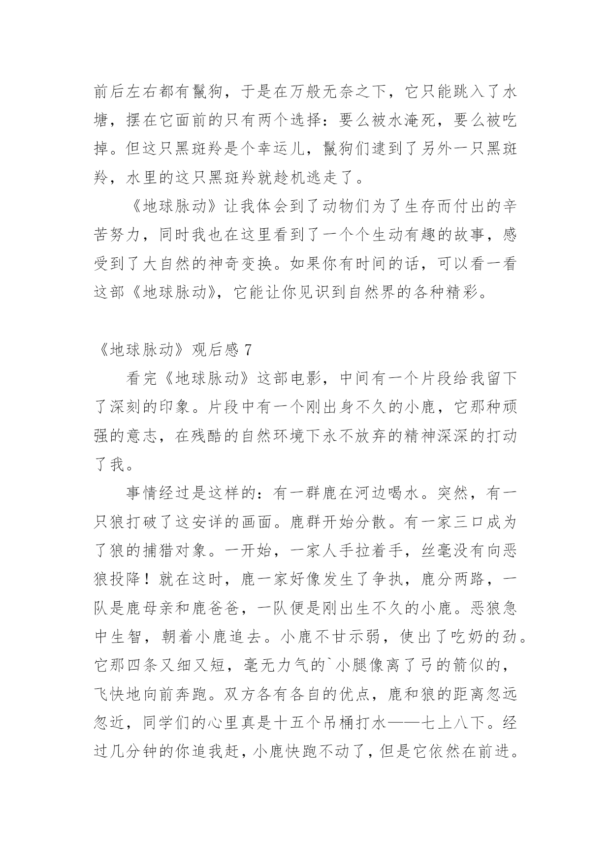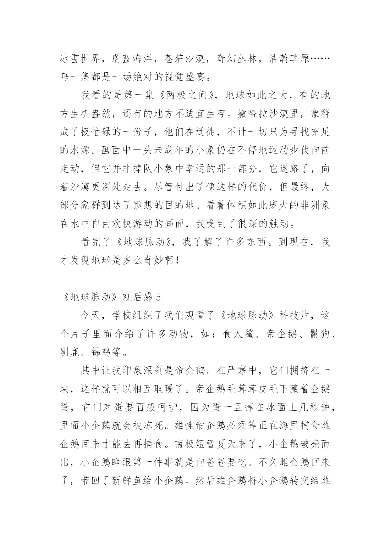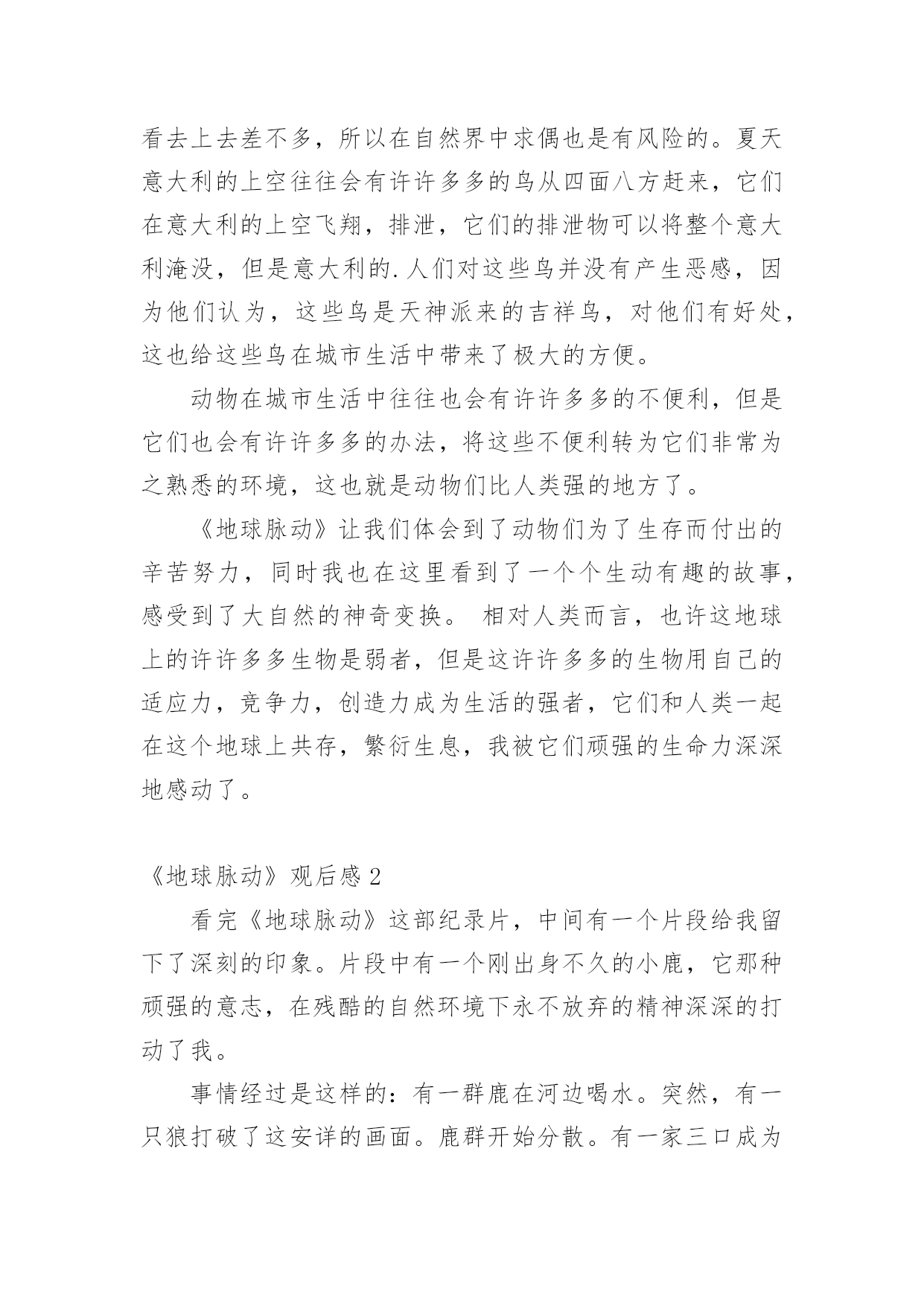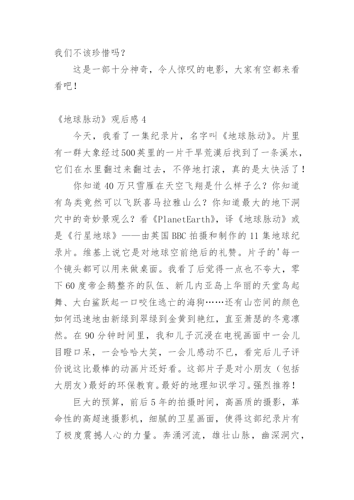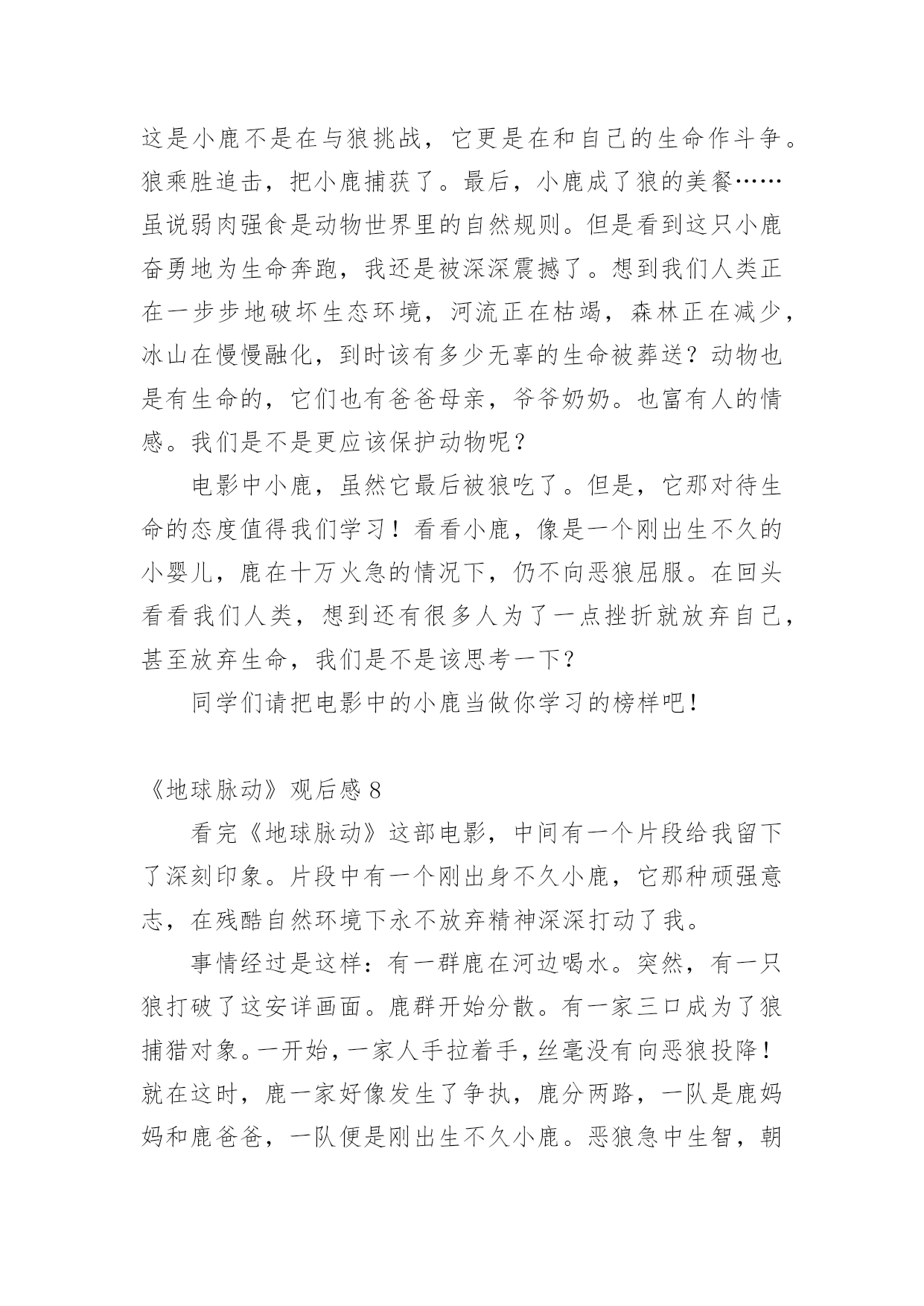 《地球脉动》观后感《地球脉动》观后感15篇当品味完一部作品后,相信大家的视野一定开拓了不少吧,不能光会看哦,写一篇观后感吧。那么你真的懂得怎么写观后感吗?以下是小编收集整理的《地球脉动》观后感,希望对大家有所帮助。《地球脉动》观后感1在地球上生存着许许多多的生物,它们有强者有弱者,但是它们在地球上都有自己的生存环境和生存能力。印度的孟买生活着一群跟人类差不多的猴子,它们为了填饱肚子,每天都要按照平时的生活习惯,去菜市场拿些东西吃,它们往往不会引起人们的注意,但是它们这些拿东西的行为,使得菜市场的老板很不满意。印度西郊有一群花豹,它们猎食农家的猪,它们往往会以迅雷不及掩耳之势,从它们埋伏的地点而出,这样它们就不会引起公猪的注意,从而可以轻而易举的将小猪叼在嘴里,然后跳上高楼,使得公猪追不到它们。澳大利亚有一群鸟,它们的巢生活在地面下,它们的巢往往会建在人们扔掉垃圾的地方,它们需要将自己的巢填得丰满,就必须到别人的巢上去偷些东西,它们有些时候会拿一个玩具汽车或者是一个红桃心。有一只鸟,为了求偶,将它的红桃心给了一只不知道性别的鸟,但是那只鸟是一只小雄鸟,它和一只雌性的鸟看去上去差不多,所以在自然界中求偶也是有风险的。夏天意大利的上空往往会有许许多多的鸟从四面八方赶来,它们在意大利的上空飞翔,排泄,它们的排泄物可以将整个意大利淹没,但是意大利的.人们对这些鸟并没有产生恶感,因为他们认为,这些鸟是天神派来的吉祥鸟,对他们有好处,这也给这些鸟在城市生活中带来了极大的方便。动物在城市生活中往往也会有许许多多的不便利,但是它们也会有许许多多的办法,将这些不便利转为它们非常为之熟悉的环境,这也就是动物们比人类强的地方了。《地球脉动》让我们体会到了动物们为了生存而付出的辛苦努力,同时我也在这里看到了一个个生动有趣的故事,感受到了大自然的神奇变换。相对人类而言,也许这地球上的许许多多生物是弱者,但是这许许多多的生物用自己的适应力,竞争力,创造力成为生活的强者,它们和人类一起在这个地球上共存,繁衍生息,我被它们顽强的生命力深深地感动了。《地球脉动》观后感2看完《地球脉动》这部纪录片,中间有一个片段给我留下了深刻的印象。片段中有一个刚出身不久的小鹿,它那种顽强的意志,在残酷的自然环境下永不放弃的精神深深的打动了我。事情经过是这样的:有一群鹿在河边喝水。突然,有一只狼打破了这安详的画面。鹿群开始分散。有一家三口成为了狼的捕猎对象。一开始,一家人手拉着手,丝毫没有向恶狼投降!就在这时,鹿一家好像发生了争执,鹿分两路,一队是鹿妈妈和鹿爸爸,一队便是刚出生不久的小鹿。恶狼急中生智,朝着小鹿追去。小鹿不甘示弱,使出了吃奶的劲。它那四条又细又短,毫无力气的小腿像离了弓的.箭似的,飞快地向前奔跑。双方各有各自的优点,鹿和狼的距离忽远忽近,同学们的心里真是十五个吊桶打水——七上八下。经过几分钟的你追我赶,小鹿快跑不动了,但是它依然在前进。这是小鹿不是在与狼挑战,它更是在和自己的生命作斗争。狼乘胜追击,把小鹿捕获了。最后,小鹿成了狼的美餐……虽说弱肉强食是动物世界里的自然规则。但是看到这只小鹿奋勇地为生命奔跑,我还是被深深震撼了。想到我们人类正在一步步地破坏生态环境,河流正在枯竭,森林正在减少,冰山在慢慢融化,到时该有多少无辜的生命被葬送?动物也是有生命的,它们也有爸爸妈妈,爷爷奶奶。也富有人的情感。我们是不是更应该保护动物呢?纪录片中小鹿,虽然它最后被狼吃了。但是,它那对待生命的态度值得我们学习!看看小鹿,像是一个刚出生不久的小婴儿,鹿在十万火急的情况下,仍不向恶狼屈服。在回头看看我们人类,想到还有很多人为了一点挫折就放弃自己,甚至放弃生命,我们是不是该思考一下?同学们请把纪录片中的小鹿当做你学习的榜样吧!《地球脉动》观后感3今天我们全班同学在老师的安排下观看了一部很好看的电影——《地球脉动》。里面的画面真是太精美,太让人震撼了。我们看到张大嘴巴的帝企鹅排着整齐的队伍;看到新几内亚岛上华丽的天堂鸟在翩翩起舞;看到大白鲨跃出海面,一口咬住逃亡的海狗;看到迷人的日出日落;看到山峦间的颜色如何在高速镜头的播放下由新绿到翠绿再到金黄,艳红,直至落叶凋零……里面的每一幅画面都是那么让人惊叹,惊叹大自然的神奇和科学的伟大!我看到了某一种鸟类的迁徙。密密麻麻地布满着天空,朝着同一个方向飞翔,那是一种生命之美,鸟类为了适应环境的.变化,不惜飞跃过万水千山,那一种壮观让我们惊叹。在寒冷的北极,小北极熊第一次见到阳光。它看起来是那样的喜悦,阳光对南极的动物们来说可能一年都见不到一次,阳光是天赐的礼物,想到我们人类能每天都享受阳光的温暖,该是多么幸福的事情啊!在一望无际的平原上,羚羊正在浩浩荡荡地迁徙,他们的路线蜿蜒崎岖,可是他们不争不抢,那么有序,无论路途多么艰辛,他们都不会放弃。