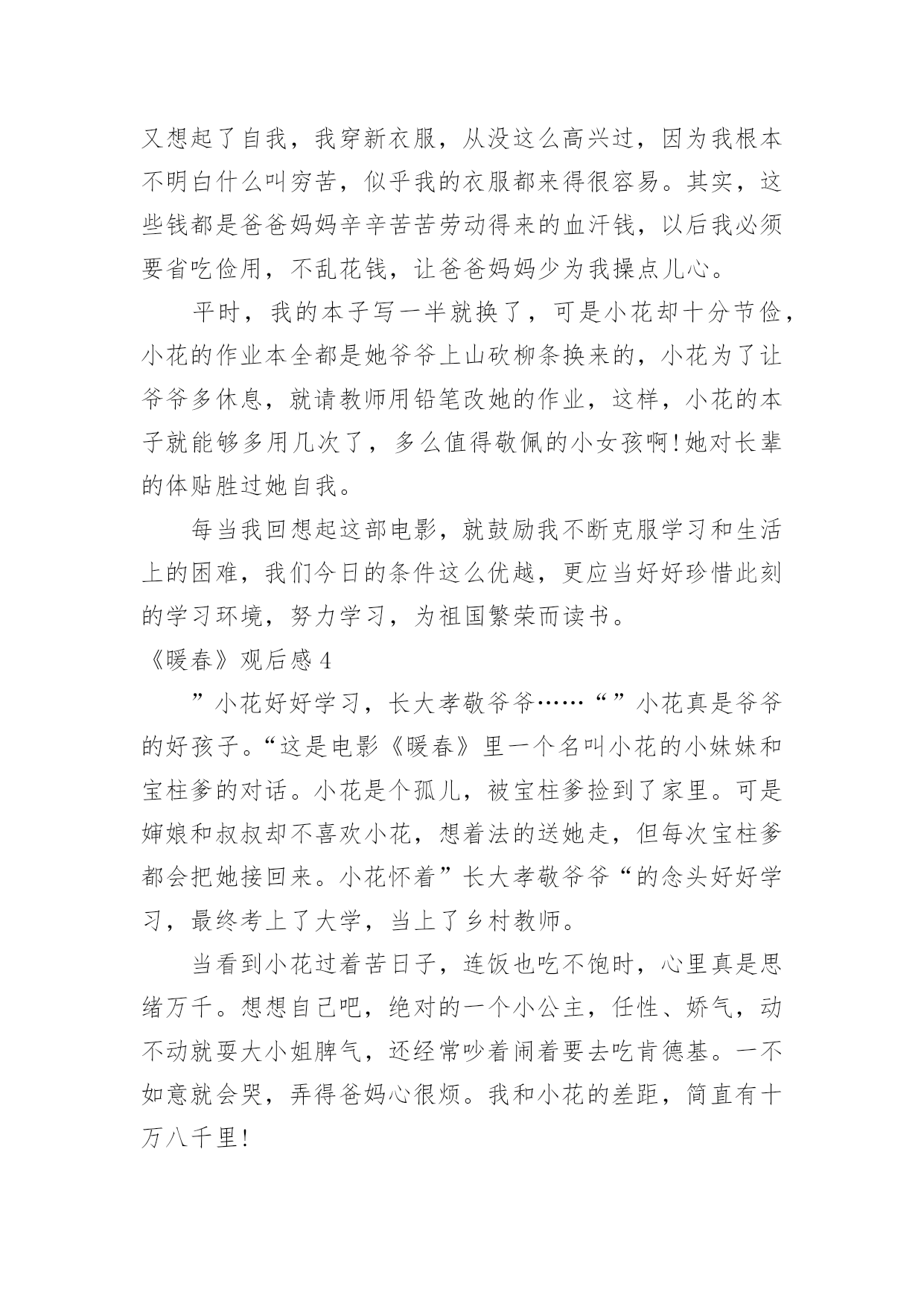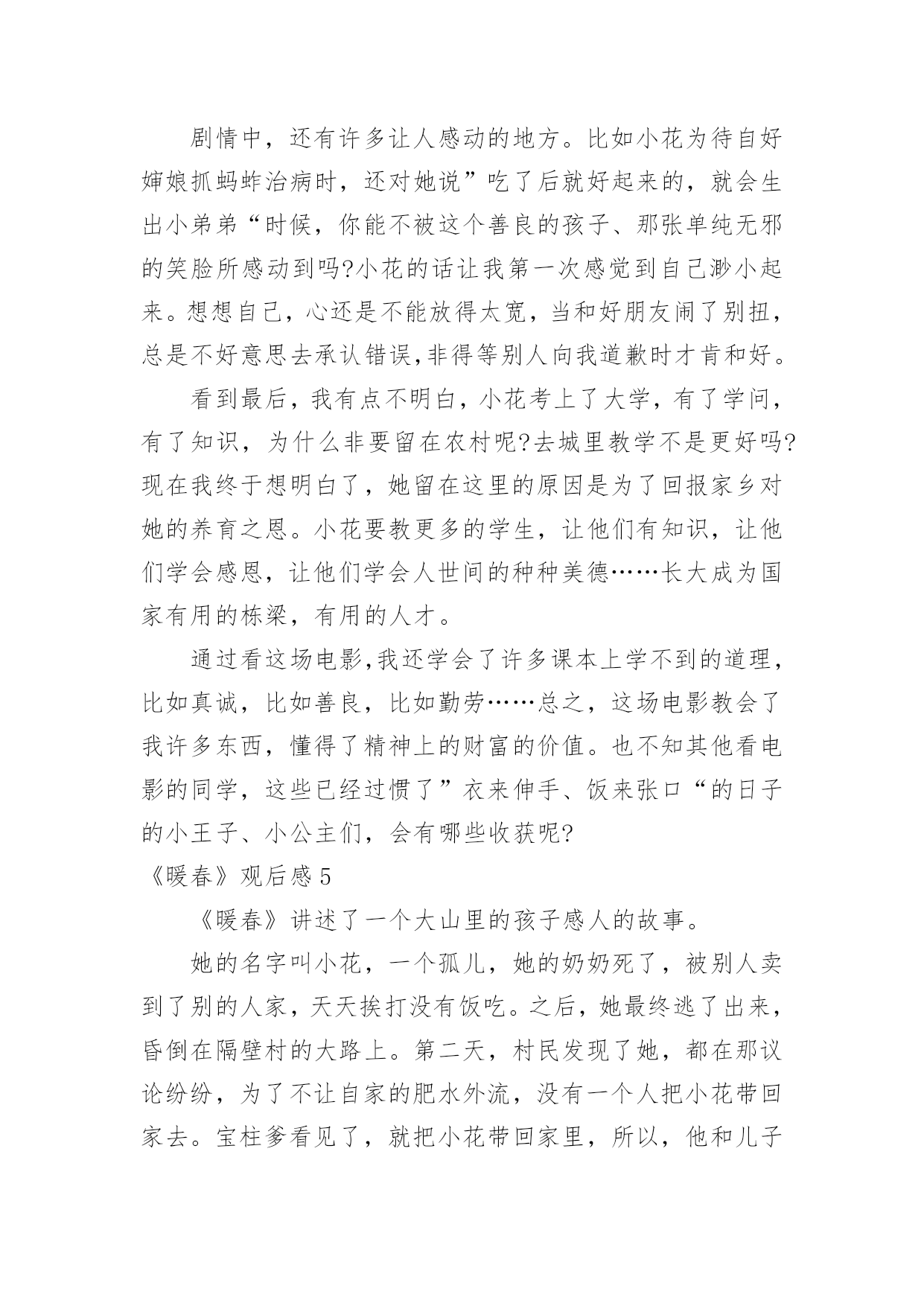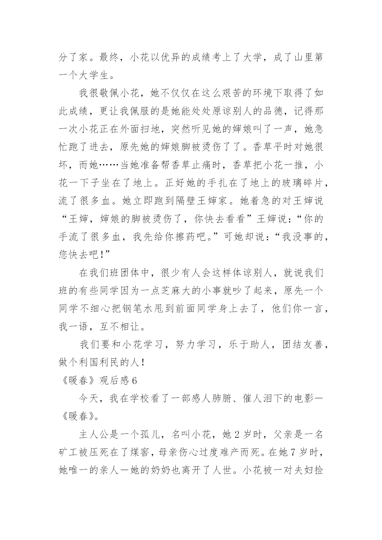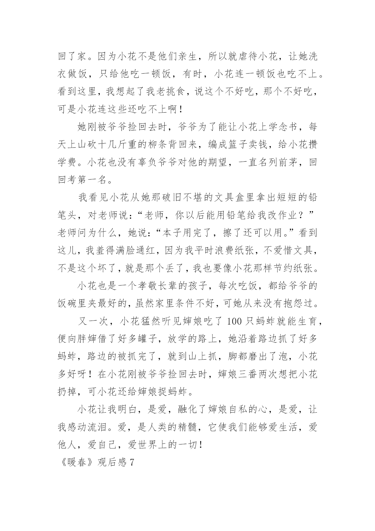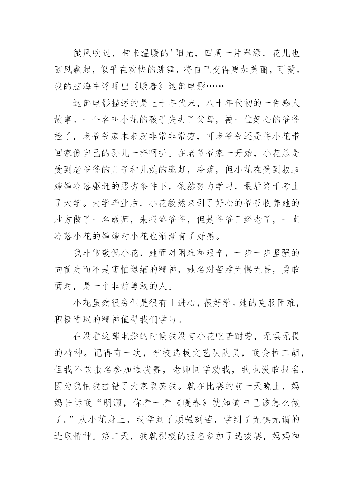 《暖春》观后感《暖春》观后感在看完一部作品以后,这次观看让你心中有什么感想呢?这时候最关键的观后感不能忘了。那么我们该怎么去写观后感呢?下面是小编整理的《暖春》观后感,希望对大家有所帮助。《暖春》观后感1我曾经看过许多电影,而《暖春》这部电影还是我两年前看过的,但现在仍记忆犹新。这是因为这部电影不仅感人肺腑,使人看时泪如雨下,更因为这部电影使我受益匪浅。电影主要讲述了一个老爷爷捡了一个叫小花的7岁女孩。可小花的叔叔和婶娘想要一个自己的孩子,不喜欢她,总想把她卖掉。但最终,小花的无私的善心和博大的胸怀感动了叔叔婶娘,认她做了女儿。小花对学习越来越上进,终于成为了他们村里的第一个大学生的故事。让我印象最深刻的一幕是:婶娘煎药时,一不小心把脚烫伤了。小花听到动静后急忙去扶她,可她却把小花一把推到火炭旁,小花的手被火红的木炭烫伤了,满手的鲜血和水泡,但她不顾自己的伤痛,跑到邻居家去找人来救婶娘。当我看到这里时,我哭了:小花太善良了,婶娘这样对待她,她都一点不记仇。这真是以德抱怨呀!看过电影,我才发现,我和小花的差距太大了:小花无父无母,生活贫困,经历坎坷,但却非常懂事,学习上进,每次考试都是全年级第一名。而我父母双全,生活条件、学习环境不知比小花要好出多少倍,可我却常常不懂事,从来没有考过第一名。跟小花比,我差得太远了。以后我一定要好好学习,以小花为榜样,珍惜现在的生活、学习环境,使自己早日成为一个有用的人才。《暖春》观后感2暖春,就是温暖的春天,那不正是电影《暖春》里那位慈祥的老爷爷吗?一个衣衫褴褛、面黄肌瘦的小女孩在一望无际的原野上奔跑着,她手里的风车不停转动着,好象在述说着一个个凄惨的故事,她叫小花。忽然,小花摔倒昏过去了。好心的农民把她抬到村子里,商量如何安置无家可归的小花。这时,一个衣着朴素、慈眉善目的老人站了出来,说要收养这个孩子。过门多年不生娃的儿媳香草十分妒忌,决定赶走小花。香草在她娘的安排下,一次又一次骗走单纯的小花,但最终都没有得逞。小花不记恨叔叔和婶娘对自己的伤害,还一次次用真诚稚嫩的心去接近他们。她的宽容和善良撞击着宝柱和香草的良心,最后他们悔恨交加,终于流下了忏悔的眼泪……14年后,小花大学毕业,又回到了大山,当上了一名乡村女教师。故事情节虽然简单,但令人感动的镜头却很多。忘不了,小花为婶婶生孩子而去抓蚂蚱;忘不了,爷爷和小花在雨中相依相伴的情景;忘不了,村长抖出宝柱不是爷爷的亲生儿子的情景;忘不了,村民捐出粮食、钱财的情景……忘不了的镜头太多太多,可使我最感动的是一个字:"暖!"人时常应有一颗宽容的心,感恩的心。就像电影里小花那样,小花爷爷的儿子平时讨厌小花,但有一次他仅仅对小花说了一句关心的话,激动得小花一路飞奔到爷爷那里,告诉爷爷。有时候,爱就是这么简单,一个微笑,一句问候,就能给人带来快乐,带来幸福。善待他人就是善待自己,希望真情能永驻!《暖春》观后感3看完《暖春》这部电影,我的眼睛湿润了,电影中那一个个感人肺腑的情节不断浮此刻我眼前。故事讲的是一个名叫小花的小女孩被家人遗弃,之后一位好心的老爷爷收留了她。从此,小花就和老爷爷一齐生活,在极其贫困的条件下,小花勤奋学习,最终成为一名山村教师。当看到“老爷爷为了给小花买鞋子把所有的积蓄都用完了。小花舍不得穿,就拿在手上,脚上却起泡了”的时候,我想到了自我。那天是“六一儿童节”,妈妈让我挑一双鞋子买下,可我还没穿上一星期,就挑三捡四的说鞋子太大了,颜色不好看,样貌也不时髦,必须要重新。想想,心里真惭愧,和小花比起来,我就像一个三四岁的小毛孩似的。当小花看到婶娘给她做新的衣服时,高兴得手舞足蹈,甚至跑遍全村,还大喊:“我有新衣服喽!我有新衣服喽!”我禁不住又想起了自我,我穿新衣服,从没这么高兴过,因为我根本不明白什么叫穷苦,似乎我的衣服都来得很容易。其实,这些钱都是爸爸妈妈辛辛苦苦劳动得来的血汗钱,以后我必须要省吃俭用,不乱花钱,让爸爸妈妈少为我操点儿心。平时,我的本子写一半就换了,可是小花却十分节俭,小花的作业本全都是她爷爷上山砍柳条换来的,小花为了让爷爷多休息,就请教师用铅笔改她的作业,这样,小花的本子就能够多用几次了,多么值得敬佩的小女孩啊!她对长辈的体贴胜过她自我。每当我回想起这部电影,就鼓励我不断克服学习和生活上的困难,我们今日的条件这么优越,更应当好好珍惜此刻的学习环境,努力学习,为祖国繁荣而读书。《暖春》观后感4”小花好好学习,长大孝敬爷爷……“”小花真是爷爷的好孩子。“这是电影《暖春》里一个名叫小花的小妹妹和宝柱爹的对话。小花是个孤儿,被宝柱爹捡到了家里。可是婶娘和叔叔却不喜欢小花,想着法的送她走,但每次宝柱爹都会把她接回来。小花怀着”长大孝敬爷爷“的念头好好学习,最终考上了大学,当上了乡村教师。当看到小花过着苦日子,连饭也吃不饱时,心里