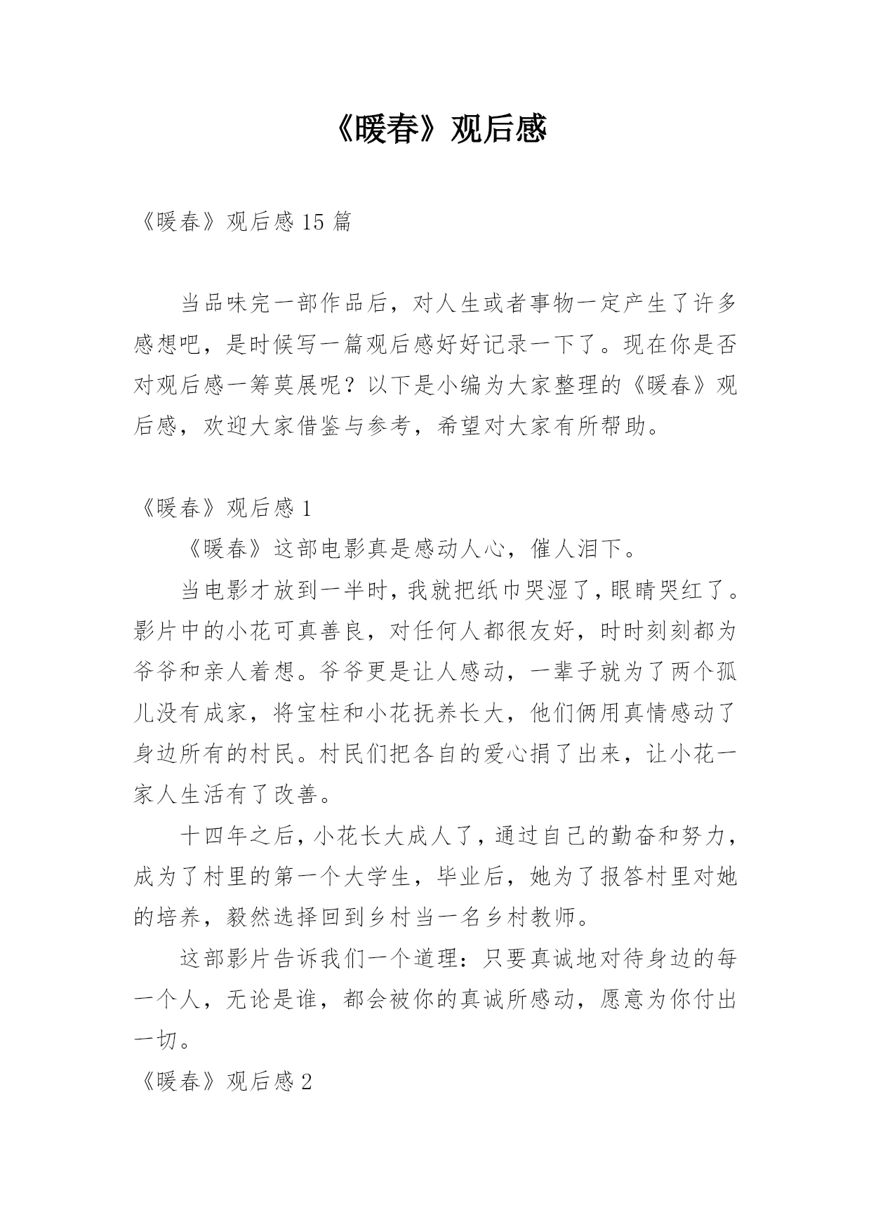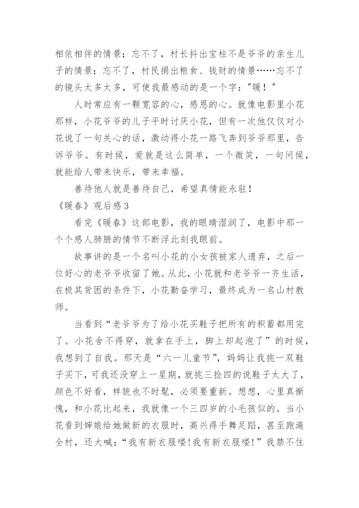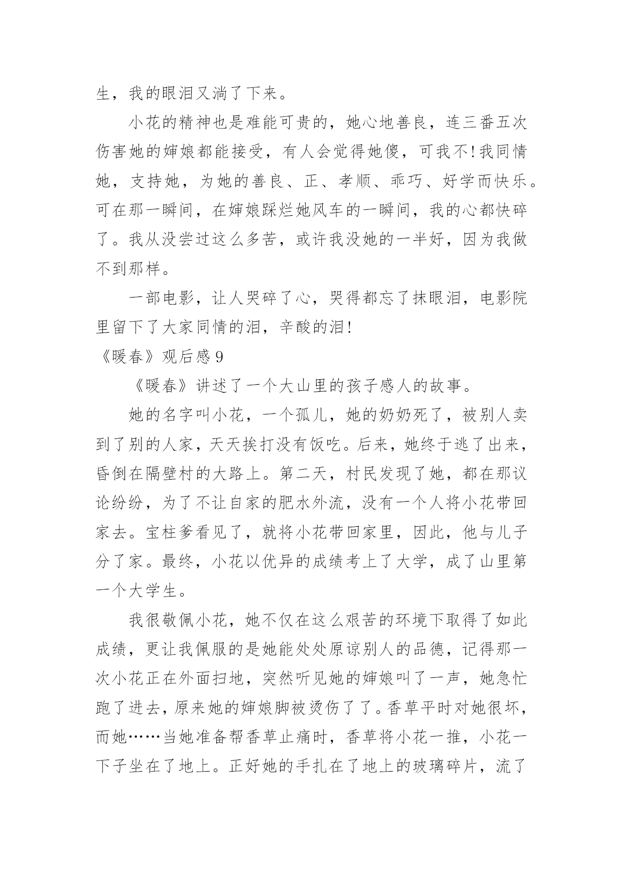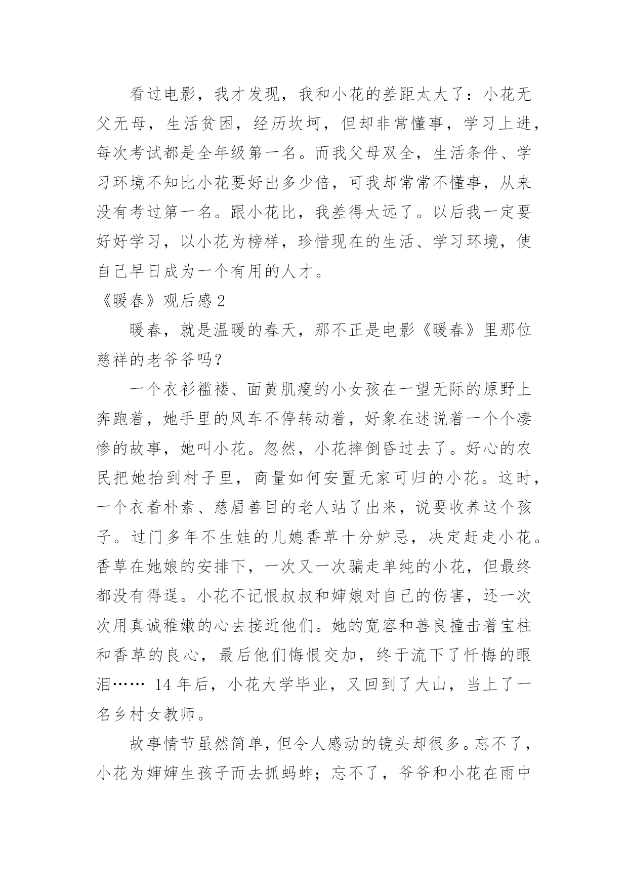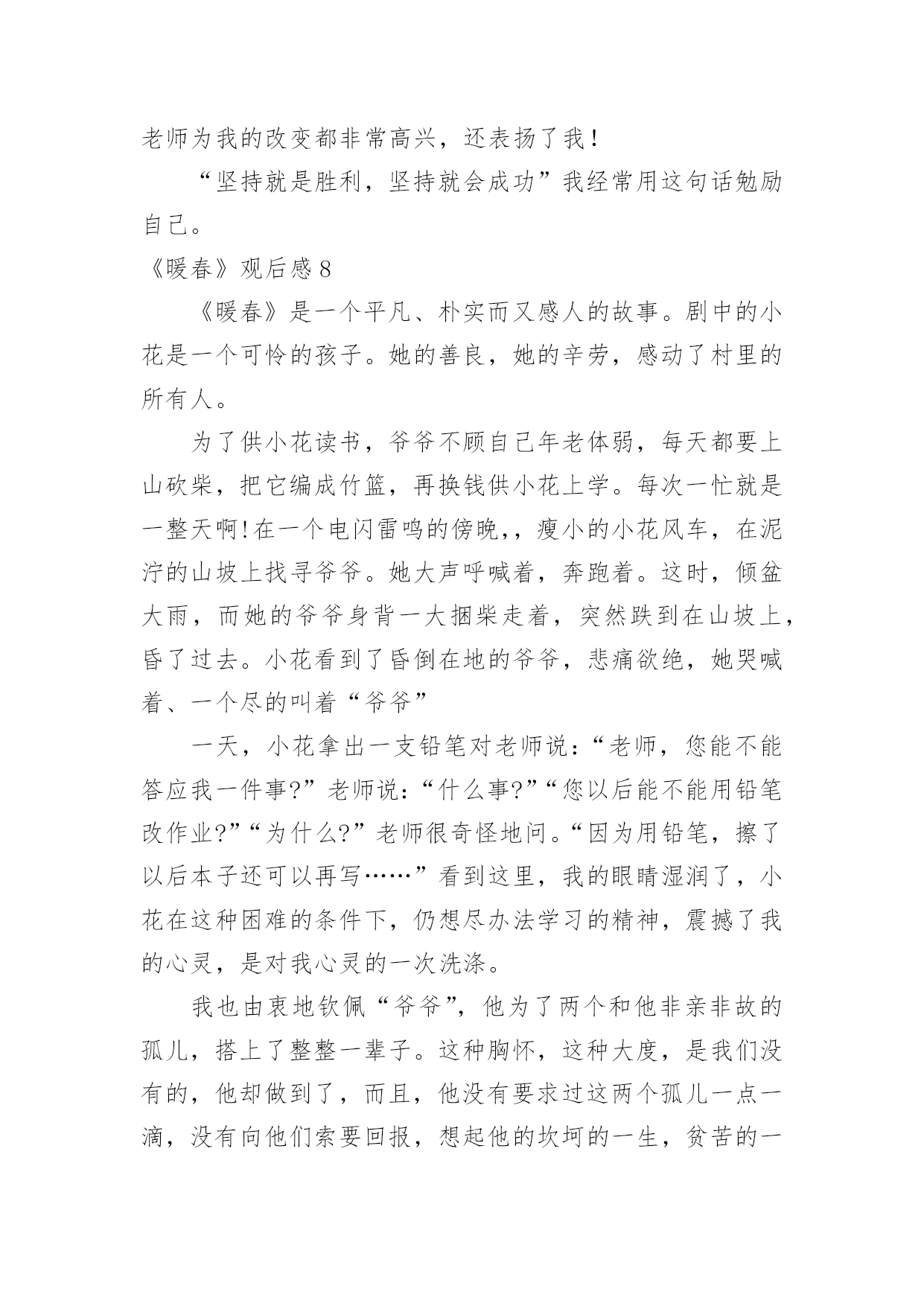 《暖春》观后感《暖春》观后感在看完一部作品以后,这次观看让你心中有什么感想呢?这时候最关键的观后感不能忘了。那么我们该怎么去写观后感呢?下面是小编整理的《暖春》观后感,希望对大家有所帮助。《暖春》观后感1我曾经看过许多电影,而《暖春》这部电影还是我两年前看过的,但现在仍记忆犹新。这是因为这部电影不仅感人肺腑,使人看时泪如雨下,更因为这部电影使我受益匪浅。电影主要讲述了一个老爷爷捡了一个叫小花的7岁女孩。可小花的叔叔和婶娘想要一个自己的孩子,不喜欢她,总想把她卖掉。但最终,小花的无私的善心和博大的胸怀感动了叔叔婶娘,认她做了女儿。小花对学习越来越上进,终于成为了他们村里的第一个大学生的故事。让我印象最深刻的一幕是:婶娘煎药时,一不小心把脚烫伤了。小花听到动静后急忙去扶她,可她却把小花一把推到火炭旁,小花的手被火红的木炭烫伤了,满手的鲜血和水泡,但她不顾自己的伤痛,跑到邻居家去找人来救婶娘。当我看到这里时,我哭了:小花太善良了,婶娘这样对待她,她都一点不记仇。这真是以德抱怨呀!看过电影,我才发现,我和小花的差距太大了:小花无父无母,生活贫困,经历坎坷,但却非常懂事,学习上进,每次考试都是全年级第一名。而我父母双全,生活条件、学习环境不知比小花要好出多少倍,可我却常常不懂事,从来没有考过第一名。跟小花比,我差得太远了。以后我一定要好好学习,以小花为榜样,珍惜现在的生活、学习环境,使自己早日成为一个有用的人才。《暖春》观后感2暖春,就是温暖的春天,那不正是电影《暖春》里那位慈祥的老爷爷吗?一个衣衫褴褛、面黄肌瘦的小女孩在一望无际的原野上奔跑着,她手里的风车不停转动着,好象在述说着一个个凄惨的故事,她叫小花。忽然,小花摔倒昏过去了。好心的农民把她抬到村子里,商量如何安置无家可归的小花。这时,一个衣着朴素、慈眉善目的老人站了出来,说要收养这个孩子。过门多年不生娃的儿媳香草十分妒忌,决定赶走小花。香草在她娘的安排下,一次又一次骗走单纯的小花,但最终都没有得逞。小花不记恨叔叔和婶娘对自己的伤害,还一次次用真诚稚嫩的心去接近他们。她的宽容和善良撞击着宝柱和香草的良心,最后他们悔恨交加,终于流下了忏悔的眼泪……14年后,小花大学毕业,又回到了大山,当上了一名乡村女教师。故事情节虽然简单,但令人感动的镜头却很多。忘不了,小花为婶婶生孩子而去抓蚂蚱;忘不了,爷爷和小花在雨中相依相伴的情景;忘不了,村长抖出宝柱不是爷爷的亲生儿子的情景;忘不了,村民捐出粮食、钱财的情景……忘不了的镜头太多太多,可使我最感动的是一个字:"暖!"人时常应有一颗宽容的心,感恩的心。就像电影里小花那样,小花爷爷的儿子平时讨厌小花,但有一次他仅仅对小花说了一句关心的话,激动得小花一路飞奔到爷爷那里,告诉爷爷。有时候,爱就是这么简单,一个微笑,一句问候,就能给人带来快乐,带来幸福。善待他人就是善待自己,希望真情能永驻!《暖春》观后感3看完《暖春》这部电影,我的眼睛湿润了,电影中那一个个感人肺腑的情节不断浮此刻我眼前。故事讲的是一个名叫小花的小女孩被家人遗弃,之后一位好心的老爷爷收留了她。从此,小花就和老爷爷一齐生活,在极其贫困的条件下,小花勤奋学习,最终成为一名山村教师。当看到“老爷爷为了给小花买鞋子把所有的积蓄都用完了。小花舍不得穿,就拿在手上,脚上却起泡了”的时候,我想到了自我。那天是“六一儿童节”,妈妈让我挑一双鞋子买下,可我还没穿上一星期,就挑三捡四的说鞋子太大了,颜色不好看,样貌也不时髦,必须要重新。想想,心里真惭愧,和小花比起来,我就像一个三四岁的小毛孩似的。当小花看到婶娘给她做新的衣服时,高兴得手舞足蹈,甚至跑遍全村,还大喊:“我有新衣服喽!我有新衣服喽!”我禁不住又想起了自我,我穿新衣服,从没这么高兴过,因为我根本不明白什么叫穷苦,似乎我的衣服都来得很容易。其实,这些钱都是爸爸妈妈辛辛苦苦劳动得来的血汗钱,以后我必须要省吃俭用,不乱花钱,让爸爸妈妈少为我操点儿心。平时,我的本子写一半就换了,可是小花却十分节俭,小花的作业本全都是她爷爷上山砍柳条换来的,小花为了让爷爷多休息,就请教师用铅笔改她的作业,这样,小花的本子就能够多用几次了,多么值得敬佩的小女孩啊!她对长辈的体贴胜过她自我。每当我回想起这部电影,就鼓励我不断克服学习和生活上的困难,我们今日的条件这么优越,更应当好好珍惜此刻的学习环境,努力学习,为祖国繁荣而读书。《暖春》观后感4”小花好好学习,长大孝敬爷爷……“”小花真是爷爷的好孩子。“这是电影《暖春》里一个名叫小花的小妹妹和宝柱爹的对话。小花是个孤儿,被宝柱爹捡到了家里。可是婶娘和叔叔却不喜欢小花,想着法的送她走,但每次宝柱爹都会把她接回来。小花怀着”长大孝敬爷爷“的念头好好学习,最终考上了大学,当上了乡村教师。当看到小花过着苦日子,连饭也吃不饱时,心里