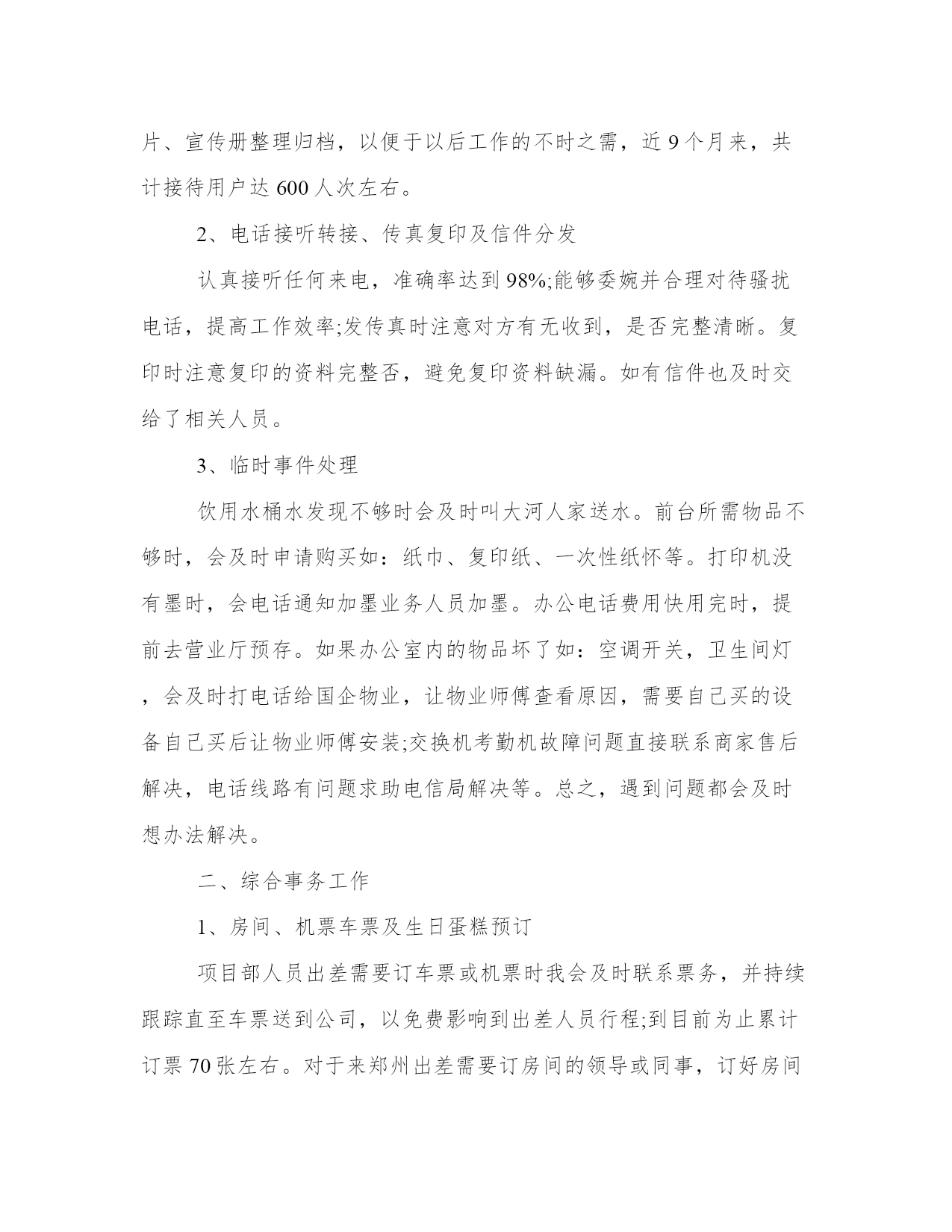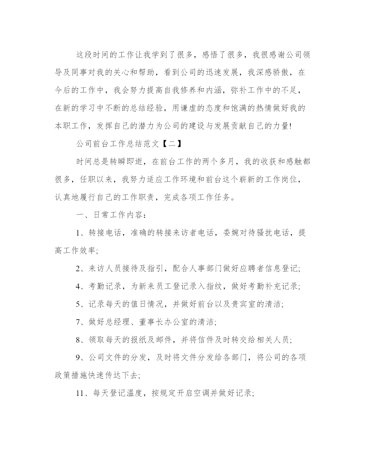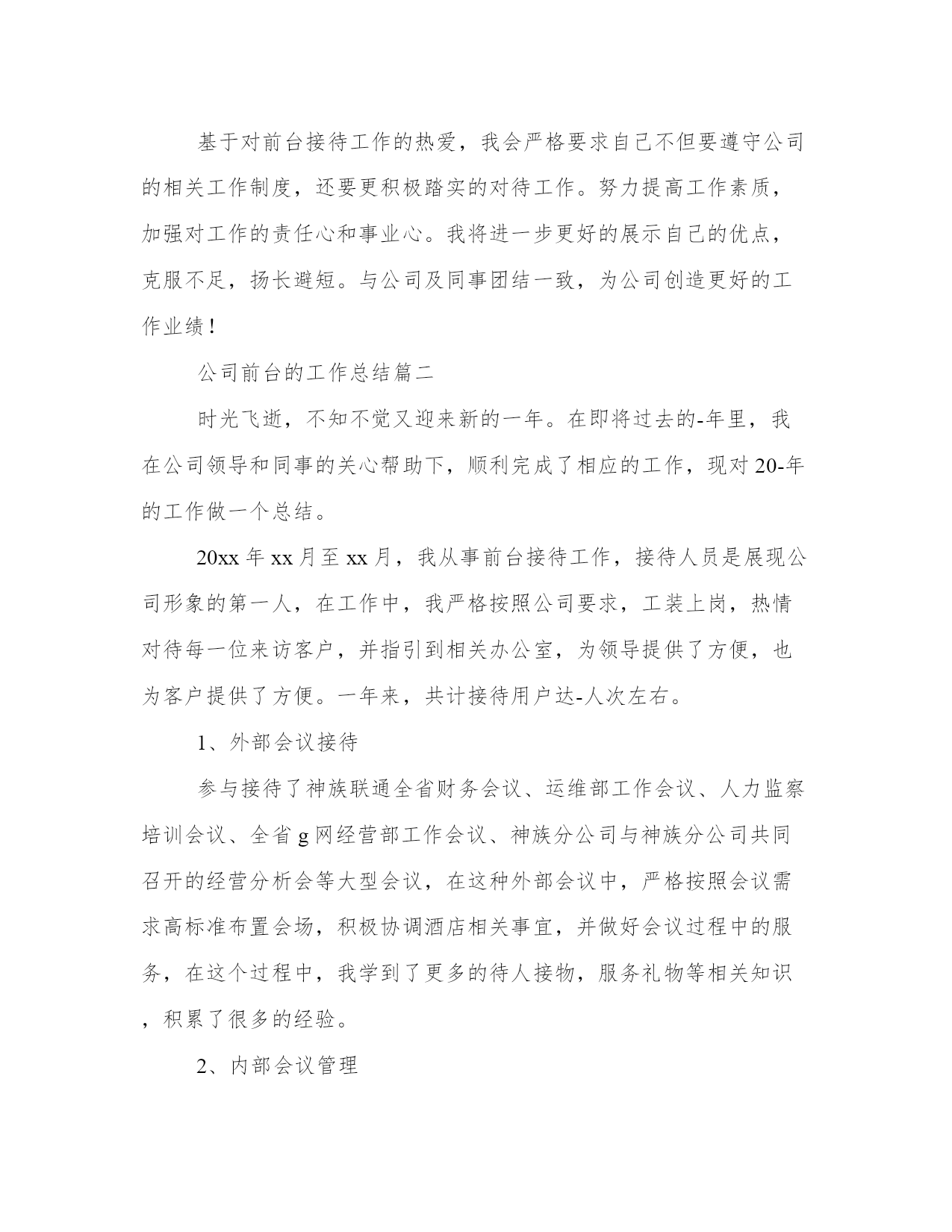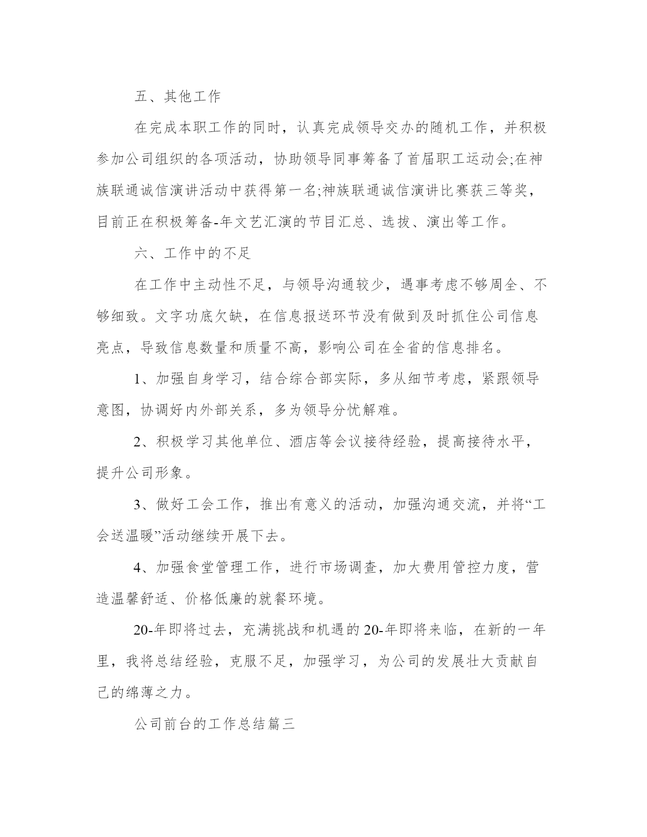 公司前台的工作总结公司前台工作总结(优秀20篇)总结是对过去一定时期的工作、学习或思想情况进行回顾、分析,并做出客观评价的书面材料,它有助于我们寻找工作和事物发展的规律,从而掌握并运用这些规律,是时候写一份总结了。那关于总结格式是怎样的呢?而个人总结又该怎么写呢?下面是我给大家整理的总结范文,欢迎大家阅读分享借鉴,希望对大家能够有所帮助。公司前台的工作总结篇一在即将过去的20xx年里,我在公司领导是同事的关心和热情帮助下,顺利完成了前台接待相应的工作。现在对20xx年的工作作出总结。前台的工作是一个需要有耐心和责任心的岗位,热诚、积极的工作态度很重要。20xx年x月,我开始从事前台接待工作,深知接待人员是展示公司形象的第一人。在工作中,严格按照公司的要求,工装上岗,五官清秀。热情对待每一个来访客户,并热心的指引到相关的办公室。为公司提供了方便,也为客户提供了方便。接电话时,做到耐心听客户的询问,并力所能及的作出相应的解答。在到xx企业工作前,虽然也有过前台接待的工作经验,但是,还是需要不断学习和努力的。比如综合素质方面,责任心和事业心有待进一步提高,服务观念有待进一步深入。在工作期间,让我学会的如何更好的沟通,如何踏实的积极进取。基于对前台接待工作的热爱,我会严格要求自己不但要遵守公司的相关工作制度,还要更积极踏实的对待工作。努力提高工作素质,加强对工作的责任心和事业心。我将进一步更好的展示自己的优点,克服不足,扬长避短。与公司及同事团结一致,为公司创造更好的工作业绩!公司前台的工作总结篇二时光飞逝,不知不觉又迎来新的一年。在即将过去的-年里,我在公司领导和同事的关心帮助下,顺利完成了相应的工作,现对20-年的工作做一个总结。20xx年xx月至xx月,我从事前台接待工作,接待人员是展现公司形象的第一人,在工作中,我严格按照公司要求,工装上岗,热情对待每一位来访客户,并指引到相关办公室,为领导提供了方便,也为客户提供了方便。一年来,共计接待用户达-人次左右。1、外部会议接待参与接待了神族联通全省财务会议、运维部工作会议、人力监察培训会议、全省g网经营部工作会议、神族分公司与神族分公司共同召开的经营分析会等大型会议,在这种外部会议中,严格按照会议需求高标准布置会场,积极协调酒店相关事宜,并做好会议过程中的服务,在这个过程中,我学到了更多的待人接物,服务礼物等相关知识,积累了很多的经验。2、内部会议管理按照各部门的需求合理安排会议室,以免造成会议冲突,并注意做好相关登记,以及会议室的卫生保持,公众物品的善后检查等工作,以便为本部人员提供更好的服务。一年来,共安排内部会议-次以上。3、视讯会议管理在召开总部或省分视讯会议的时候,按照通知要求,提前半小时准时打开视讯系统,确保会议按时接入,本年度无一例会议延时情况出现;在召开对县区会议时,提前进行会议预约,呼叫各终端,确保每个县区都能正常参会。在这方面,严格按照公司要求,周一汇总收集报销单据,周二找领导签字后录入-系统,并做好登记工作。一年来,录入报销单据-余份。合同录入-余份。20xx年xx月,因部门人员变动,我被调至办公室,从事公安查询、外部文件签收、工会、办公耗材、食堂管理等工作。后期,又接手信息采编、会议记录、联通之窗、行政库管理等工作。至-月底,共接待公安查询-次左右,并做到态度热情,严格按照公司规定办理。收发外来文件-份左右,做到及时上传下达,不延时,不误事。报送信息-篇,采编-期。对笔记本、台式机等小型固定资产做好登记与出入库工作,及时联系维修网点,进行电脑维护与维修,与其加强沟通,并要求为我们提供备用机,以免耽误正常工作。五、其他工作在完成本职工作的同时,认真完成领导交办的随机工作,并积极参加公司组织的各项活动,协助领导同事筹备了首届职工运动会;在神族联通诚信演讲活动中获得第一名;神族联通诚信演讲比赛获三等奖,目前正在积极筹备-年文艺汇演的节目汇总、选拔、演出等工作。六、工作中的不足在工作中主动性不足,与领导沟通较少,遇事考虑不够周全、不够细致。文字功底欠缺,在信息报送环节没有做到及时抓住公司信息亮点,导致信息数量和质量不高,影响公司在全省的信息排名。1、加强自身学习,结合综合部实际,多从细节考虑,紧跟领导意图,协调好内外部关系,多为领导分忧解难。2、积极学习其他单位、酒店等会议接待经验,提高接待水平,提升公司形象。3、做好工会工作,推出有意义的活动,加强沟通交流,并将“工会送温暖”活动继续开展下去。4、加强食堂管理工作,进行市场调查,加大费用管控力度,营造温馨舒适、价格低廉的就餐环境。20-年即将过去,充满挑战和机遇的20-年即将来临,在新的一年里,我将总结经验,克服不足,加强学习,为公司的发展壮大贡献自己的绵薄