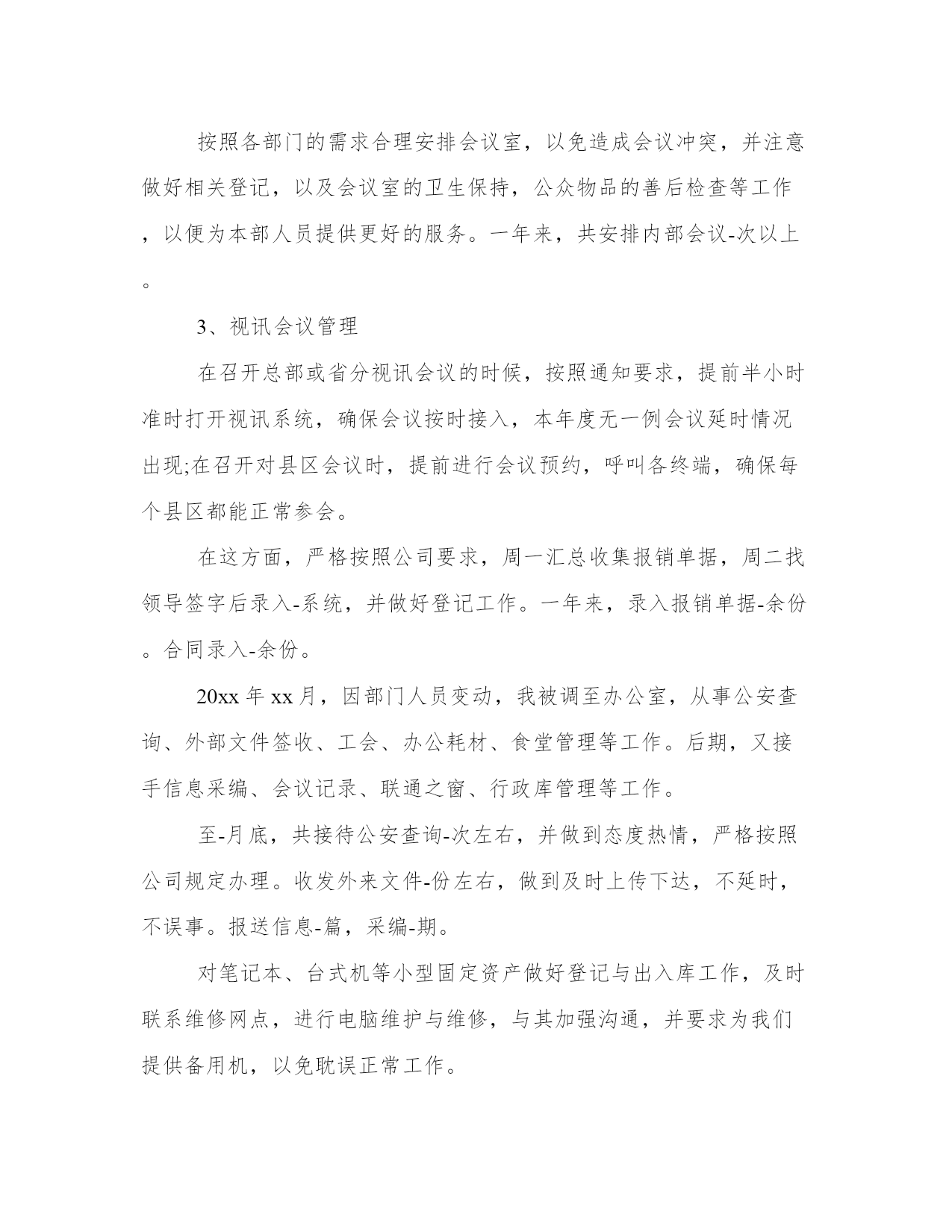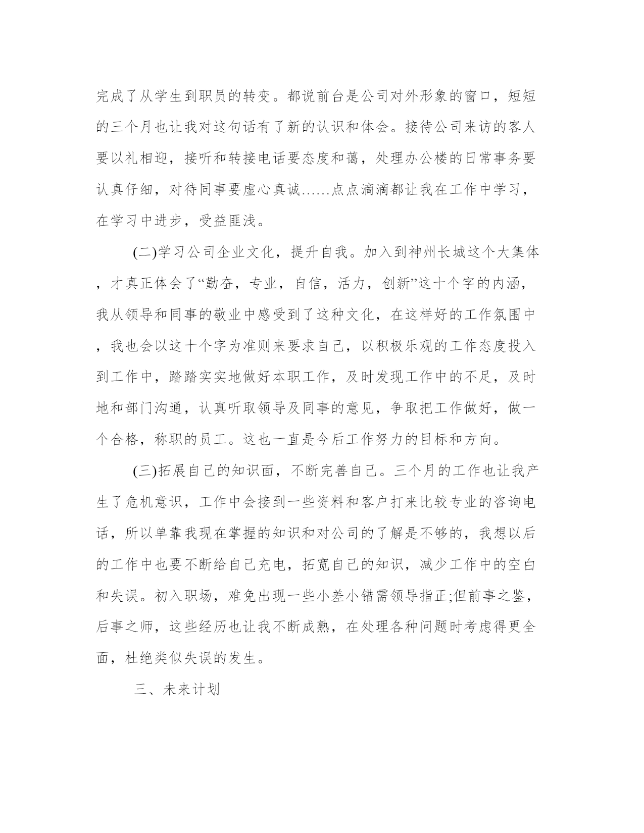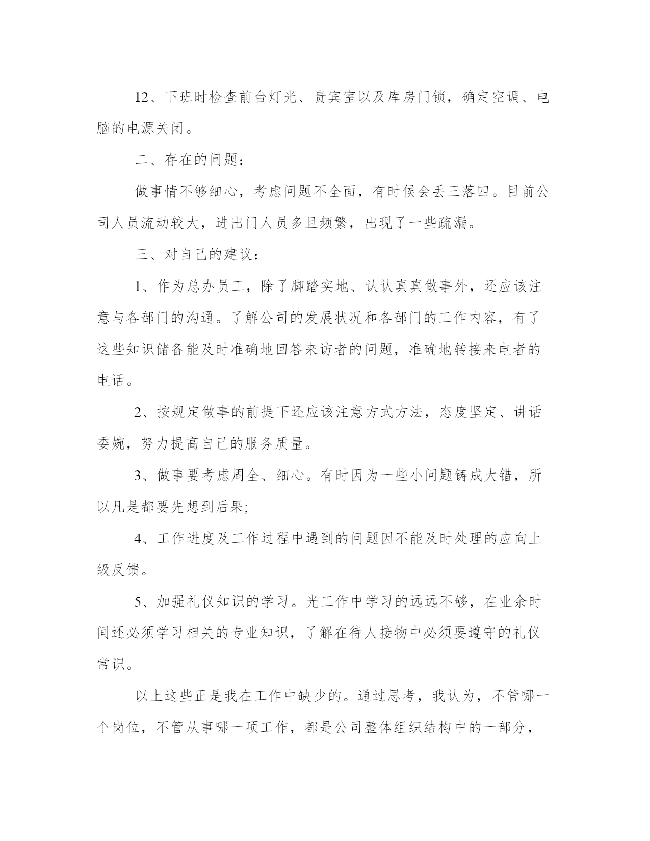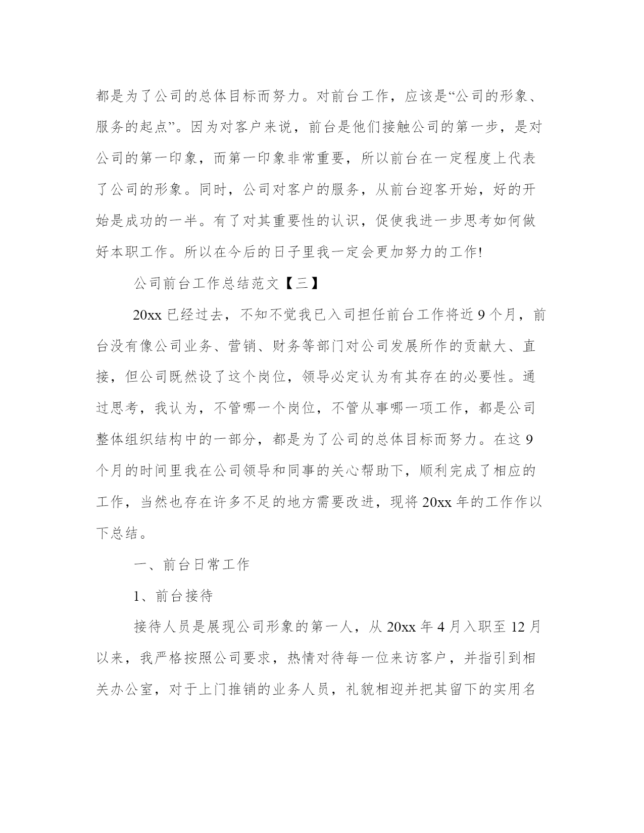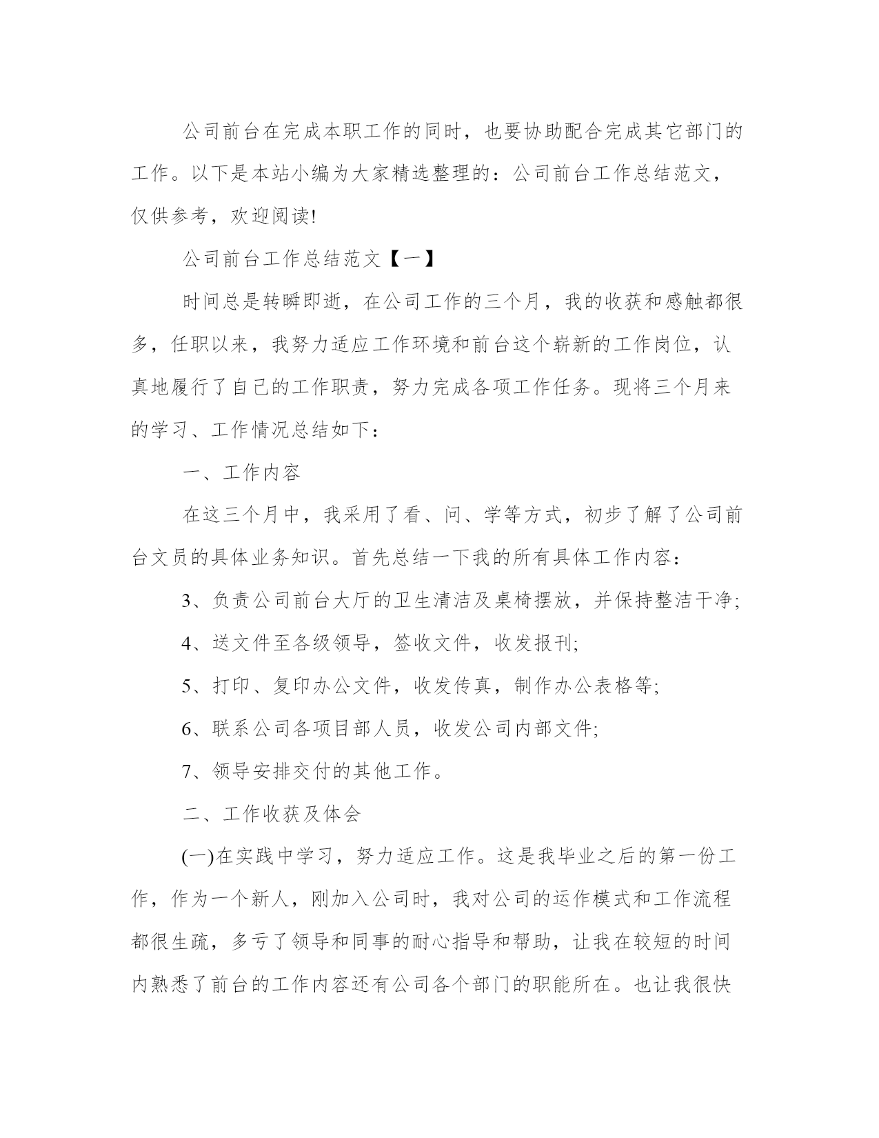公司前台的工作总结公司前台工作总结(优秀20篇)总结是对过去一定时期的工作、学习或思想情况进行回顾、分析,并做出客观评价的书面材料,它有助于我们寻找工作和事物发展的规律,从而掌握并运用这些规律,是时候写一份总结了。那关于总结格式是怎样的呢?而个人总结又该怎么写呢?下面是我给大家整理的总结范文,欢迎大家阅读分享借鉴,希望对大家能够有所帮助。公司前台的工作总结篇一在即将过去的20xx年里,我在公司领导是同事的关心和热情帮助下,顺利完成了前台接待相应的工作。现在对20xx年的工作作出总结。前台的工作是一个需要有耐心和责任心的岗位,热诚、积极的工作态度很重要。20xx年x月,我开始从事前台接待工作,深知接待人员是展示公司形象的第一人。在工作中,严格按照公司的要求,工装上岗,五官清秀。热情对待每一个来访客户,并热心的指引到相关的办公室。为公司提供了方便,也为客户提供了方便。接电话时,做到耐心听客户的询问,并力所能及的作出相应的解答。在到xx企业工作前,虽然也有过前台接待的工作经验,但是,还是需要不断学习和努力的。比如综合素质方面,责任心和事业心有待进一步提高,服务观念有待进一步深入。在工作期间,让我学会的如何更好的沟通,如何踏实的积极进取。基于对前台接待工作的热爱,我会严格要求自己不但要遵守公司的相关工作制度,还要更积极踏实的对待工作。努力提高工作素质,加强对工作的责任心和事业心。我将进一步更好的展示自己的优点,克服不足,扬长避短。与公司及同事团结一致,为公司创造更好的工作业绩!公司前台的工作总结篇二时光飞逝,不知不觉又迎来新的一年。在即将过去的-年里,我在公司领导和同事的关心帮助下,顺利完成了相应的工作,现对20-年的工作做一个总结。20xx年xx月至xx月,我从事前台接待工作,接待人员是展现公司形象的第一人,在工作中,我严格按照公司要求,工装上岗,热情对待每一位来访客户,并指引到相关办公室,为领导提供了方便,也为客户提供了方便。一年来,共计接待用户达-人次左右。1、外部会议接待参与接待了神族联通全省财务会议、运维部工作会议、人力监察培训会议、全省g网经营部工作会议、神族分公司与神族分公司共同召开的经营分析会等大型会议,在这种外部会议中,严格按照会议需求高标准布置会场,积极协调酒店相关事宜,并做好会议过程中的服务,在这个过程中,我学到了更多的待人接物,服务礼物等相关知识,积累了很多的经验。2、内部会议管理按照各部门的需求合理安排会议室,以免造成会议冲突,并注意做好相关登记,以及会议室的卫生保持,公众物品的善后检查等工作,以便为本部人员提供更好的服务。一年来,共安排内部会议-次以上。3、视讯会议管理在召开总部或省分视讯会议的时候,按照通知要求,提前半小时准时打开视讯系统,确保会议按时接入,本年度无一例会议延时情况出现;在召开对县区会议时,提前进行会议预约,呼叫各终端,确保每个县区都能正常参会。在这方面,严格按照公司要求,周一汇总收集报销单据,周二找领导签字后录入-系统,并做好登记工作。一年来,录入报销单据-余份。合同录入-余份。20xx年xx月,因部门人员变动,我被调至办公室,从事公安查询、外部文件签收、工会、办公耗材、食堂管理等工作。后期,又接手信息采编、会议记录、联通之窗、行政库管理等工作。至-月底,共接待公安查询-次左右,并做到态度热情,严格按照公司规定办理。收发外来文件-份左右,做到及时上传下达,不延时,不误事。报送信息-篇,采编-期。对笔记本、台式机等小型固定资产做好登记与出入库工作,及时联系维修网点,进行电脑维护与维修,与其加强沟通,并要求为我们提供备用机,以免耽误正常工作。五、其他工作在完成本职工作的同时,认真完成领导交办的随机工作,并积极参加公司组织的各项活动,协助领导同事筹备了首届职工运动会;在神族联通诚信演讲活动中获得第一名;神族联通诚信演讲比赛获三等奖,目前正在积极筹备-年文艺汇演的节目汇总、选拔、演出等工作。六、工作中的不足在工作中主动性不足,与领导沟通较少,遇事考虑不够周全、不够细致。文字功底欠缺,在信息报送环节没有做到及时抓住公司信息亮点,导致信息数量和质量不高,影响公司在全省的信息排名。1、加强自身学习,结合综合部实际,多从细节考虑,紧跟领导意图,协调好内外部关系,多为领导分忧解难。2、积极学习其他单位、酒店等会议接待经验,提高接待水平,提升公司形象。3、做好工会工作,推出有意义的活动,加强沟通交流,并将“工会送温暖”活动继续开展下去。4、加强食堂管理工作,进行市场调查,加大费用管控力度,营造温馨舒适、价格低廉的就餐环境。20-年即将过去,充满挑战和机遇的20-年即将来临,在新的一年里,我将总结经验,克服不足,加强学习,为公司的发展壮大贡献自己的绵薄