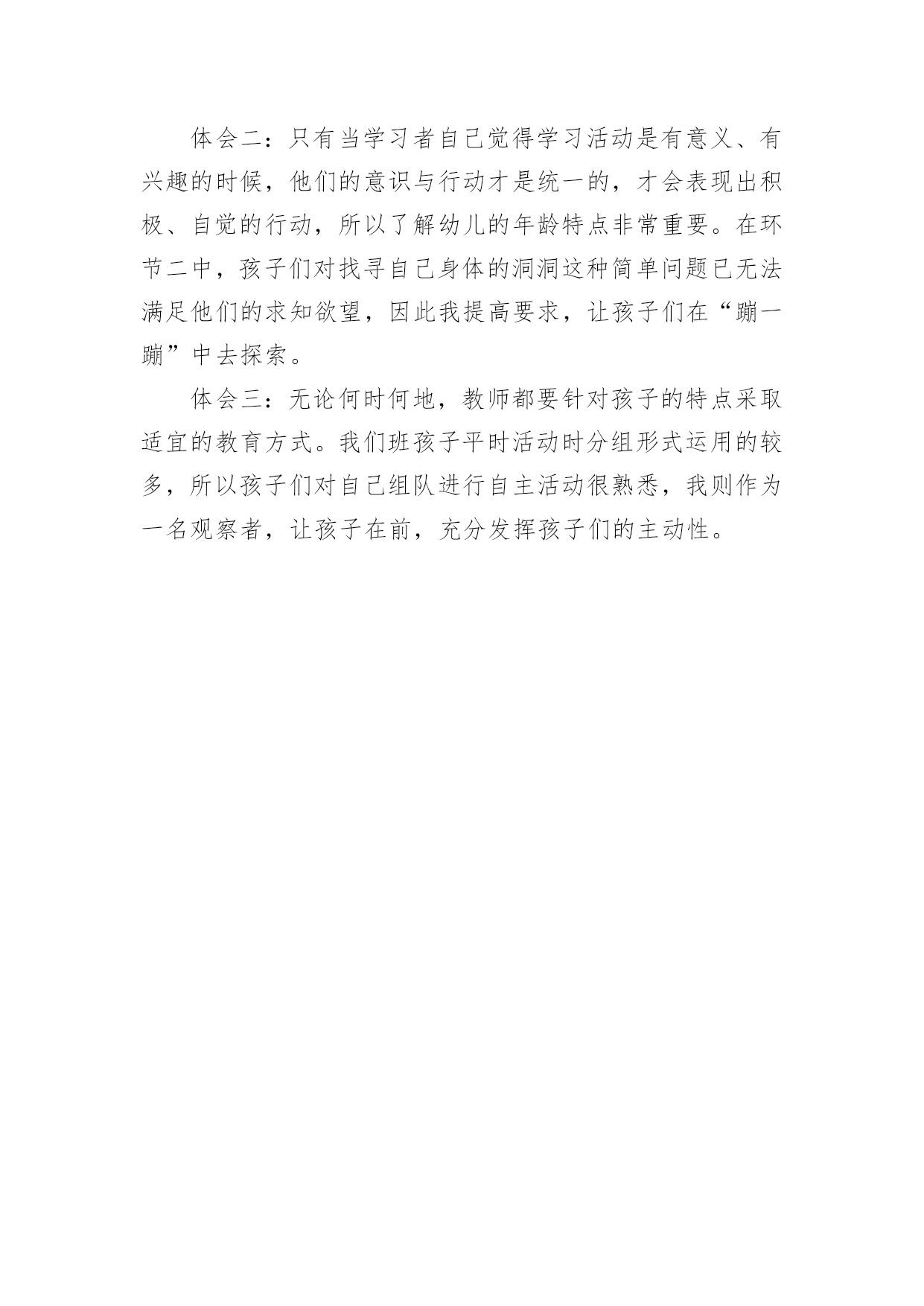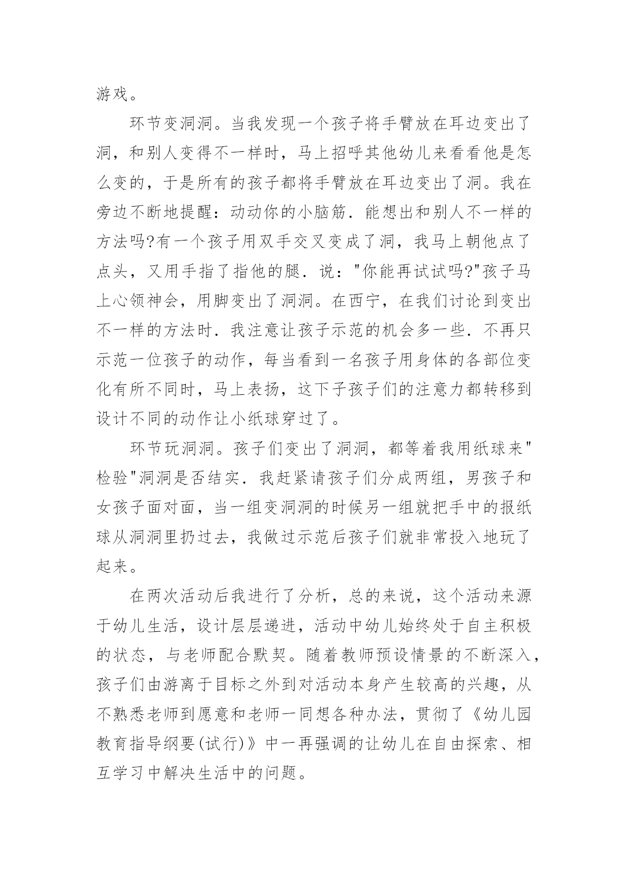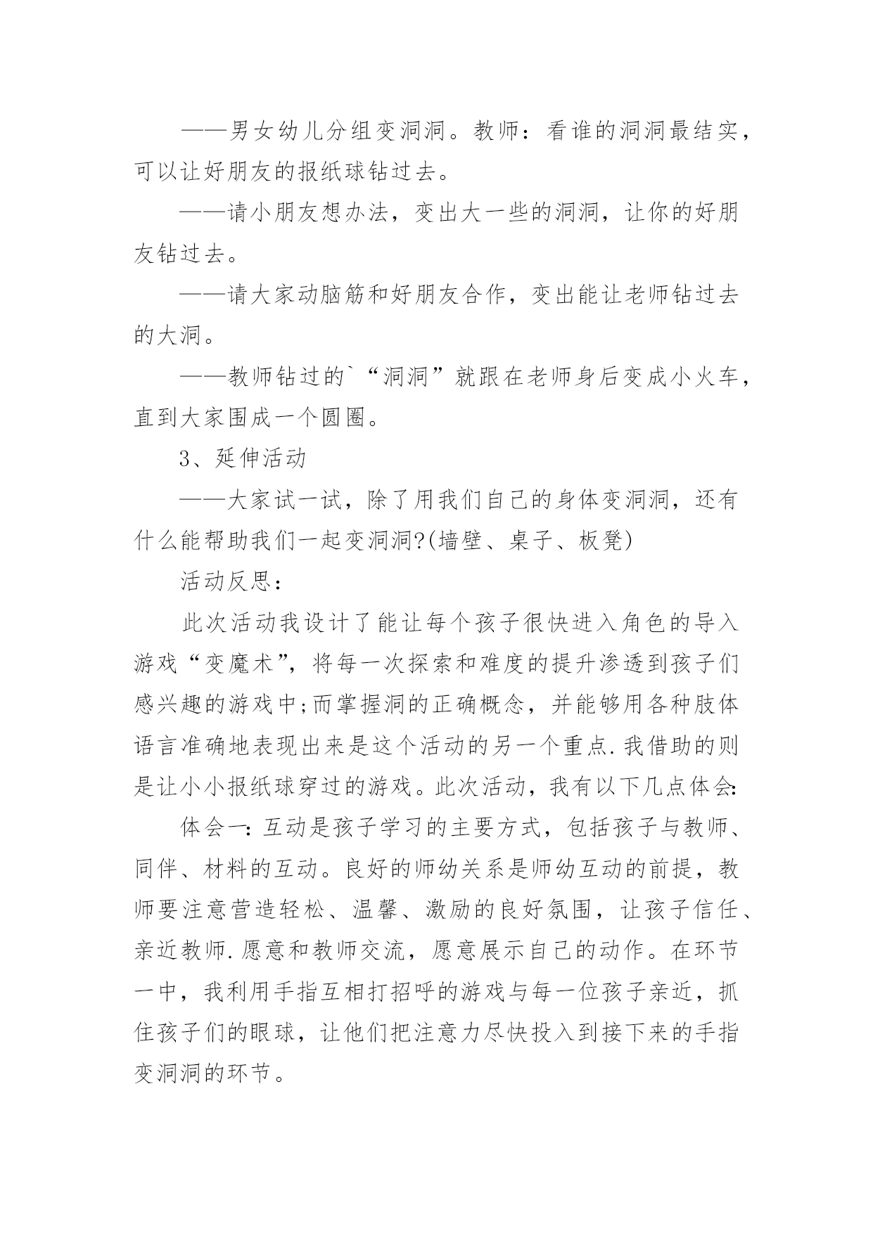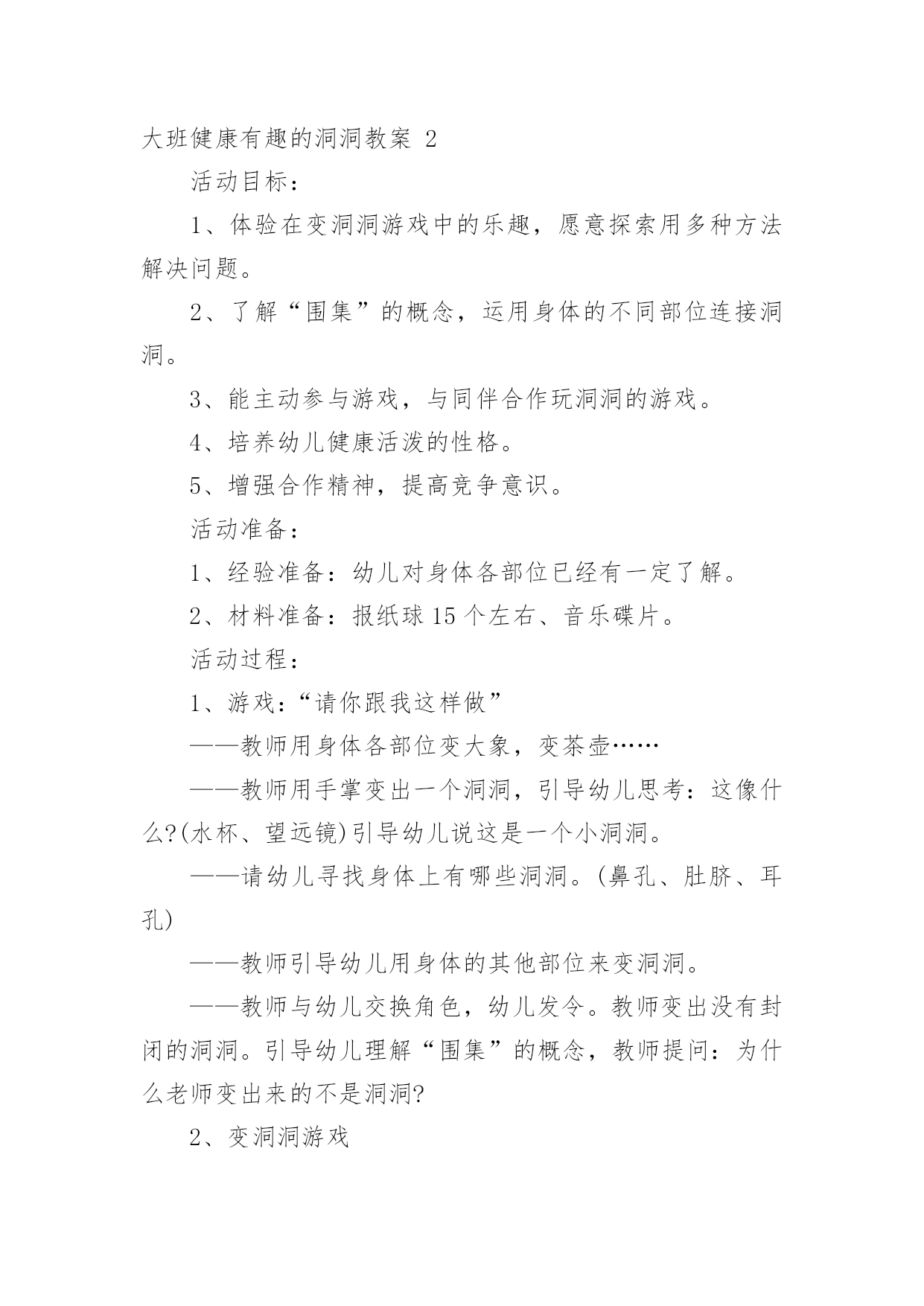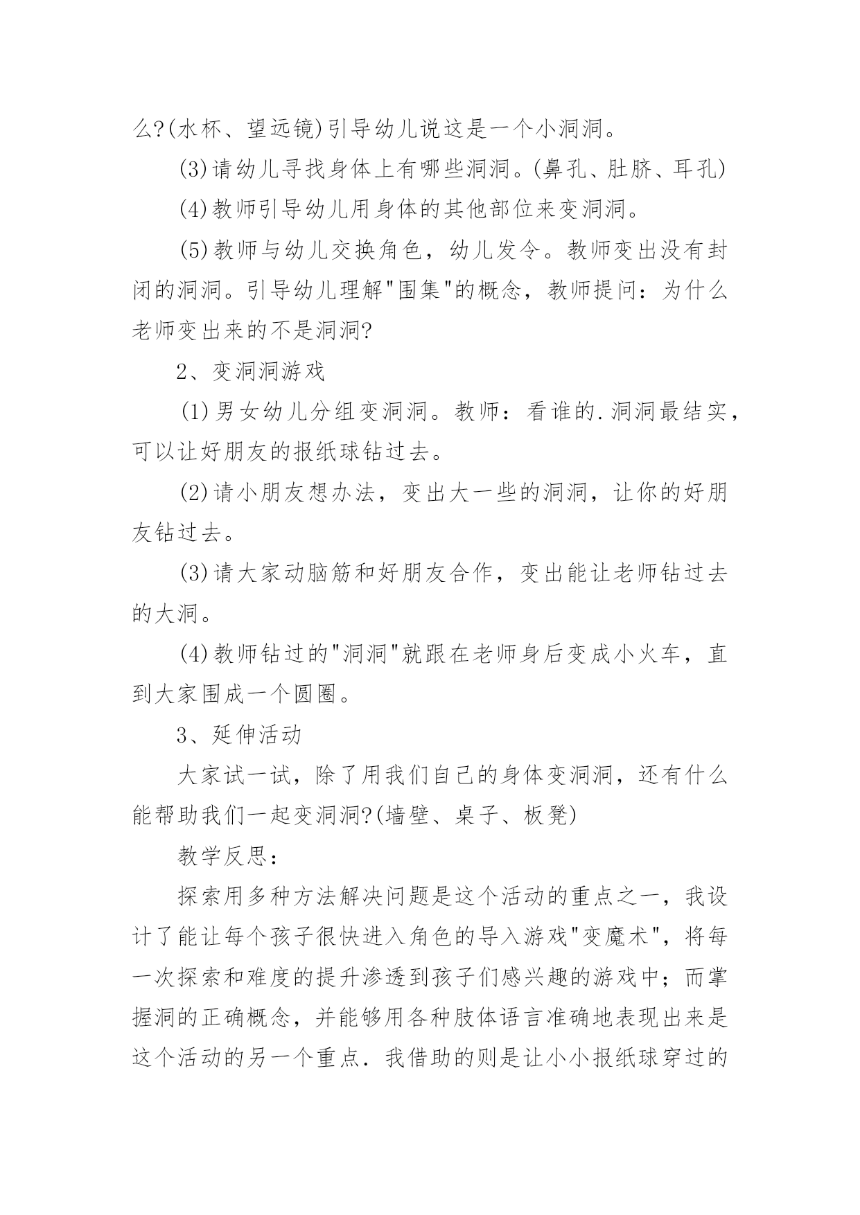 大班健康有趣的洞洞教案大班健康有趣的洞洞教案作为一名优秀的教育工作者,就不得不需要编写教案,教案有利于教学水平的提高,有助于教研活动的开展。写教案需要注意哪些格式呢?下面是小编整理的大班健康有趣的洞洞教案,希望对大家有所帮助。大班健康有趣的洞洞教案1活动目标:1、体验在变洞洞游戏中的乐趣,愿意探索用多种方法解决问题。2、了解"围集"的概念,运用身体的不同部位连接洞洞。3、能主动参与游戏。与同伴合作玩洞洞的游戏。4、学会保持愉快的心情,培养幼儿热爱生活,快乐生活的良好情感。5、积极的参与活动,大胆的说出自己的想法。活动准备:1、经验准备:幼儿对身体各部位已经有一定了解。2、材料准备:报纸球15个左右、音乐碟片。活动过程:1、游戏:"请你跟我这样做"(1)教师用身体各部位变大象,变茶壶……(2)教师用手掌变出一个洞洞,引导幼儿思考:这像什么?(水杯、望远镜)引导幼儿说这是一个小洞洞。(3)请幼儿寻找身体上有哪些洞洞。(鼻孔、肚脐、耳孔)(4)教师引导幼儿用身体的其他部位来变洞洞。(5)教师与幼儿交换角色,幼儿发令。教师变出没有封闭的洞洞。引导幼儿理解"围集"的概念,教师提问:为什么老师变出来的不是洞洞?2、变洞洞游戏(1)男女幼儿分组变洞洞。教师:看谁的.洞洞最结实,可以让好朋友的报纸球钻过去。(2)请小朋友想办法,变出大一些的洞洞,让你的好朋友钻过去。(3)请大家动脑筋和好朋友合作,变出能让老师钻过去的大洞。(4)教师钻过的"洞洞"就跟在老师身后变成小火车,直到大家围成一个圆圈。3、延伸活动大家试一试,除了用我们自己的身体变洞洞,还有什么能帮助我们一起变洞洞?(墙壁、桌子、板凳)教学反思:探索用多种方法解决问题是这个活动的重点之一,我设计了能让每个孩子很快进入角色的导入游戏"变魔术",将每一次探索和难度的提升渗透到孩子们感兴趣的游戏中;而掌握洞的正确概念,并能够用各种肢体语言准确地表现出来是这个活动的另一个重点.我借助的则是让小小报纸球穿过的游戏。环节变洞洞。当我发现一个孩子将手臂放在耳边变出了洞,和别人变得不一样时,马上招呼其他幼儿来看看他是怎么变的,于是所有的孩子都将手臂放在耳边变出了洞。我在旁边不断地提醒:动动你的小脑筋.能想出和别人不一样的方法吗?有一个孩子用双手交叉变成了洞,我马上朝他点了点头,又用手指了指他的腿.说:"你能再试试吗?"孩子马上心领神会,用脚变出了洞洞。在西宁,在我们讨论到变出不一样的方法时.我注意让孩子示范的机会多一些.不再只示范一位孩子的动作,每当看到一名孩子用身体的各部位变化有所不同时,马上表扬,这下子孩子们的注意力都转移到设计不同的动作让小纸球穿过了。环节玩洞洞。孩子们变出了洞洞,都等着我用纸球来"检验"洞洞是否结实.我赶紧请孩子们分成两组,男孩子和女孩子面对面,当一组变洞洞的时候另一组就把手中的报纸球从洞洞里扔过去,我做过示范后孩子们就非常投入地玩了起来。在两次活动后我进行了分析,总的来说,这个活动来源于幼儿生活,设计层层递进,活动中幼儿始终处于自主积极的状态,与老师配合默契。随着教师预设情景的不断深入,孩子们由游离于目标之外到对活动本身产生较高的兴趣,从不熟悉老师到愿意和老师一同想各种办法,贯彻了《幼儿园教育指导纲要(试行)》中一再强调的让幼儿在自由探索、相互学习中解决生活中的问题。大班健康有趣的洞洞教案2活动目标:1、体验在变洞洞游戏中的乐趣,愿意探索用多种方法解决问题。2、了解“围集”的概念,运用身体的不同部位连接洞洞。3、能主动参与游戏,与同伴合作玩洞洞的游戏。4、培养幼儿健康活泼的性格。5、增强合作精神,提高竞争意识。活动准备:1、经验准备:幼儿对身体各部位已经有一定了解。2、材料准备:报纸球15个左右、音乐碟片。活动过程:1、游戏:“请你跟我这样做”——教师用身体各部位变大象,变茶壶……——教师用手掌变出一个洞洞,引导幼儿思考:这像什么?(水杯、望远镜)引导幼儿说这是一个小洞洞。——请幼儿寻找身体上有哪些洞洞。(鼻孔、肚脐、耳孔)——教师引导幼儿用身体的其他部位来变洞洞。——教师与幼儿交换角色,幼儿发令。教师变出没有封闭的洞洞。引导幼儿理解“围集”的概念,教师提问:为什么老师变出来的不是洞洞?2、变洞洞游戏——男女幼儿分组变洞洞。教师:看谁的洞洞最结实,可以让好朋友的报纸球钻过去。——请小朋友想办法,变出大一些的洞洞,让你的好朋友钻过去。——请大家动脑筋和好朋友合作,变出能让老师钻过去的大洞。——教师钻过的`“洞洞”就跟在老师身后变成小火车,直到大家围成一个圆圈。3、延伸活动——大家试一试,除了用我们自己的身体变洞洞,还有什么能帮助我们一起变洞洞?(墙壁、桌子、板凳)活动反思:此次活动我设计了能让每个孩子很快进入角色的导入游戏“变魔术”,将每一次探索和难度的提升渗透到孩子们感兴