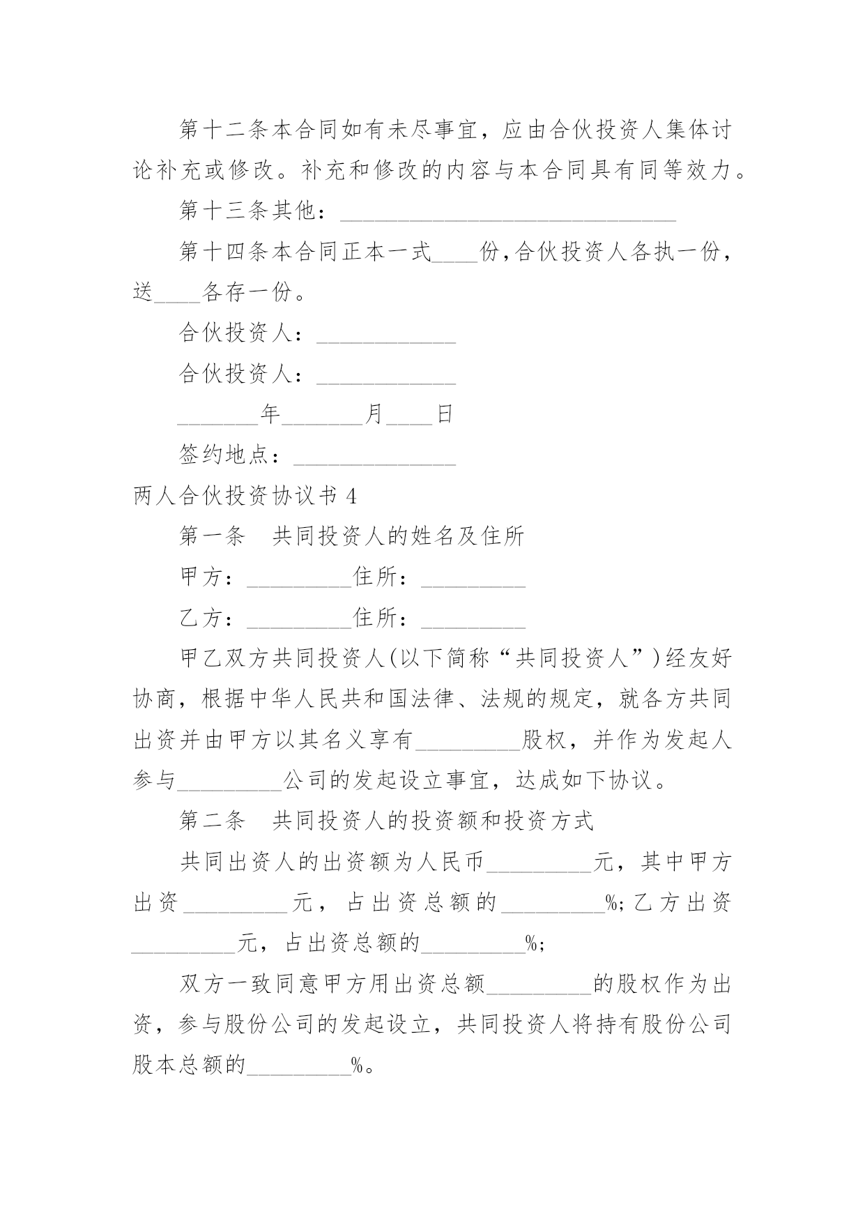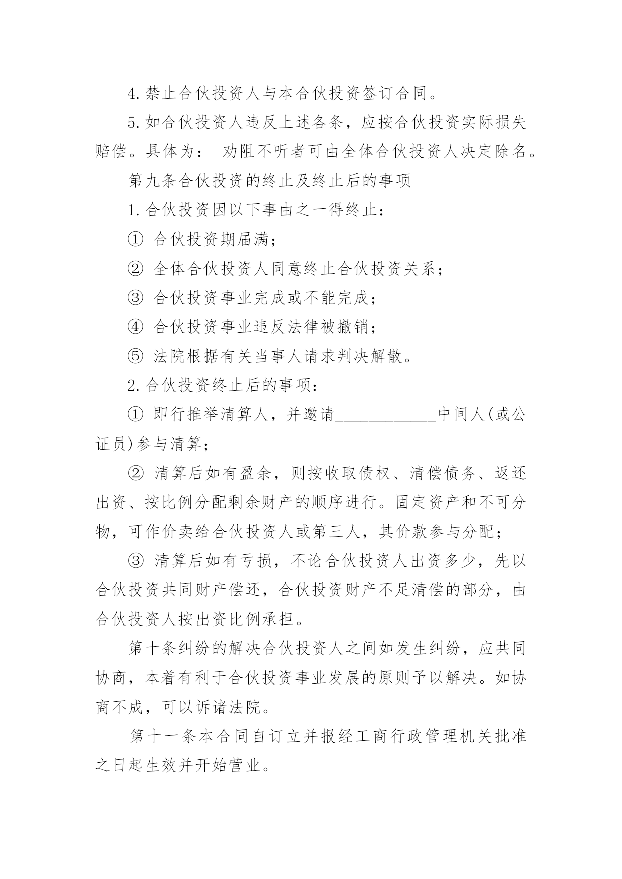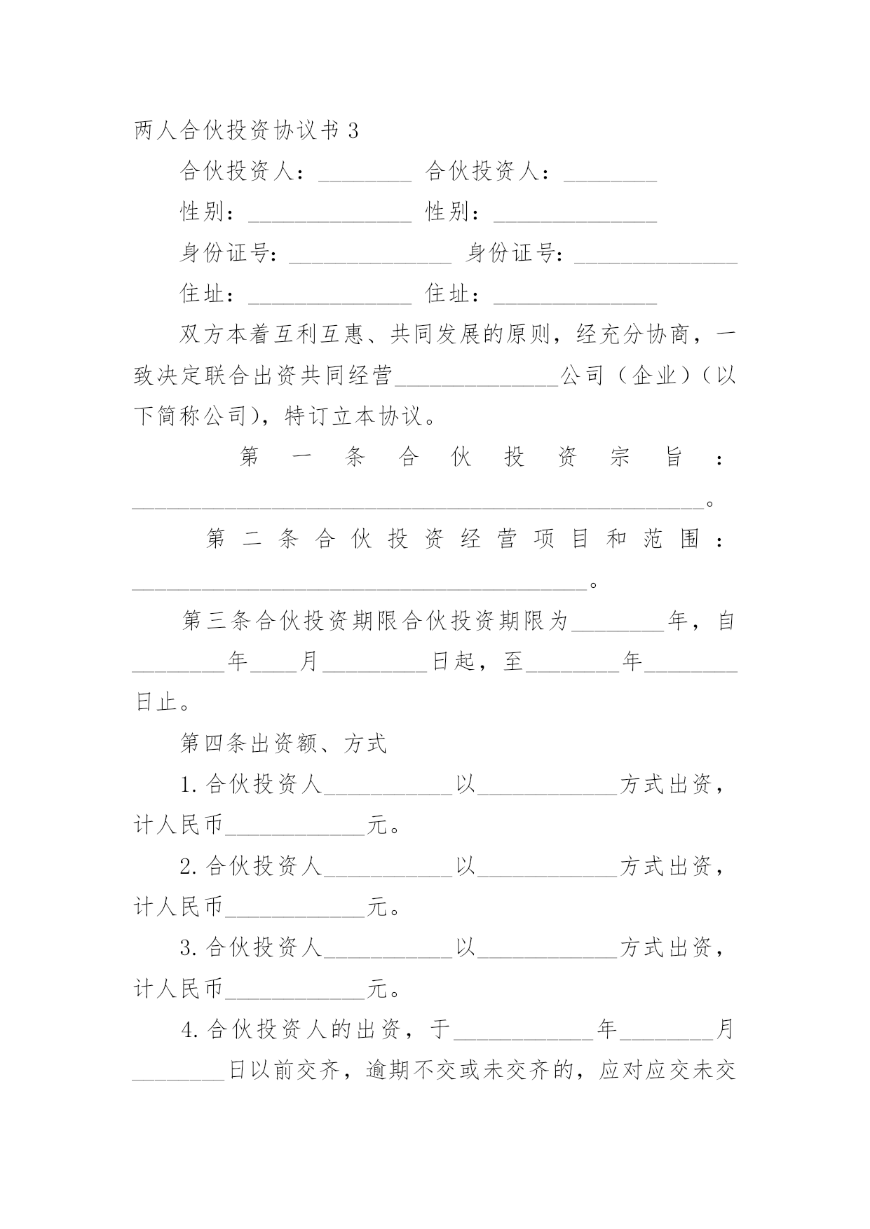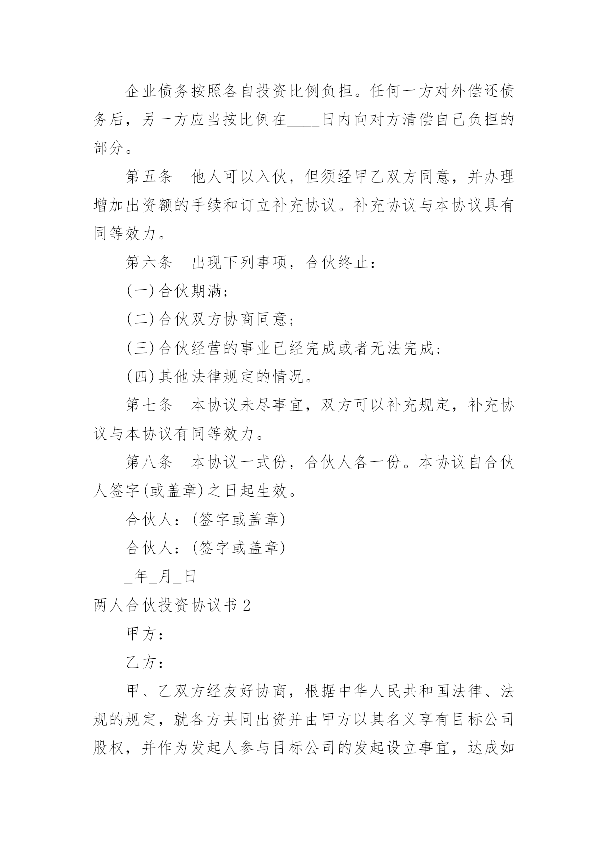 两人合伙投资协议书两人合伙投资协议书在生活中,协议起到的作用越来越大,签订协议是解决纠纷的保障。相信很多朋友都对拟协议感到非常苦恼吧,以下是小编帮大家整理的两人合伙投资协议书,仅供参考,希望能够帮助到大家。两人合伙投资协议书1合伙人:甲(姓名),男(女),_年_月_日出生,现住址:市(县)街道(乡、村)号合伙人:乙(姓名),内容同上(列出合伙人的基本情况)合伙人本着公平、平等、互利的原则订立合伙协议如下:第一条甲乙双方自愿合伙经营(项目名称),总投资为_万元,甲出资_万元,乙出资_万元,各占投资总额的'_%、_%。第二条本合伙依法组成合伙企业,由甲负责办理工商登记。第三条本合伙企业经营期限为________年。如果需要延长期限的,在期满前六个月办理有关手续。第四条合伙双方共同经营、共同劳动,共担风险,共负盈亏。企业盈余按照各自的投资比例分配。企业债务按照各自投资比例负担。任何一方对外偿还债务后,另一方应当按比例在____日内向对方清偿自己负担的部分。第五条他人可以入伙,但须经甲乙双方同意,并办理增加出资额的手续和订立补充协议。补充协议与本协议具有同等效力。第六条出现下列事项,合伙终止:(一)合伙期满;(二)合伙双方协商同意;(三)合伙经营的事业已经完成或者无法完成;(四)其他法律规定的情况。第七条本协议未尽事宜,双方可以补充规定,补充协议与本协议有同等效力。第八条本协议一式份,合伙人各一份。本协议自合伙人签字(或盖章)之日起生效。合伙人:(签字或盖章)合伙人:(签字或盖章)_年_月_日两人合伙投资协议书2甲方:乙方:甲、乙双方经友好协商,根据中华人民共和国法律、法规的规定,就各方共同出资并由甲方以其名义享有目标公司股权,并作为发起人参与目标公司的发起设立事宜,达成如下协议。1、委托事项目标公司名称:教育科技股份有限公司(暂定名)(以下简称”目标公司”)注册资本为人民币_1000_万元,分三个阶段募集,第一阶段300万元,第二阶段300万元,第三阶段400万元。2、目标公司业务范围:课业辅导、文化才艺、外语培训、成人培训、职业技术培训、在线教育、私立中小学校和幼儿园等教育培训机构平台(以下简称“教育平台”)。3、为实现教育平台之远大目标,目标公司通过领投加众筹募集资金的方式招募股东,引进战略投资合伙人。4、目标公司委托乙方作为募集代理人,负责目标公司正式注册前的全部投资事宜。乙方在指定银行开设专门账户供投资人汇款。在目标公司账户正式使用前,乙方专门账户的款项不得作任何挪用或转移。5、投资额和投资方式:甲方的出资额为现金人民币_________万元,占出资总额的_________%。甲方在募集资金的.第二阶段和第三阶段有优先同比例投资出资权。6、双方一致同意甲方用出资总额股权作为出资,参与目标公司的发起设立,持有目标公司股权。按其出资额占出资总额的比例分享共同投资的利润,分担共同投资的亏损。7、甲方以其出资额为限对目标公司承担责任,并享有目标公司财产和权益。若目标公司的股权转让后,各投资人有权按其出资比例取得财产。8、目标公司委托乙方代表全体共同投资人执行共同投资的日常事务,包括但不限于:(1)在目标股份公司发起设立阶段,甲方行使及履行作为股份有限公司发起人的权利和义务;(2)在目标股份公司成立后,甲方行使其作为股份公司股东的权利、履行相应义务;(3)投资目标公司所产生的利息和费用,由目标公司负责承担。9、投资人有权检查日常事务的执行情况,乙方有义务在筹备期向甲方报告共同投资的经营状况和财务状况;10、乙方执行共同投资事务所产生的收益归目标公司,所产生的亏损或者民事责任,由目标公司承担;11、乙方在执行事务时如因其过失或不遵守本协议而造成投资人损失时,应承担赔偿责任。12、甲方等共同投资人可以对乙方执行共同投资事务提出异议。提出异议时,应暂停该项事务的执行。如果发生争议,由全体投资人共同决定;13、目标公司的下列事务必须经全体投资人同意:(1)转让投资于目标股份有限公司的股份;(2)以上述股份对外出质;(3)更换事务执行人。14、甲方向目标公司投资人以外的人转让其在目标公司投资中的全部或部分出资额时,须经全体投资人同意;目标公司投资人之间转让在共同投资中的全部或部分投资额时,应当通知其他共同出资人;16、甲方依法转让其目标公司出资额的,在同等条件下,其他共同投资人有优先受让的权利。甲方及其他共同投资人不得私自转让或者处分共同投资的股份;17、投资人在目标公司登记之日起三年内,不得转让其持有的股份及出资额;目标公司成立后,任一投资人不得在三年内从共同投资中抽回出资额。18、目标公司不能成立时,对设立行为所产生的债务和费用按各共同投资人的出资比例分担。19、目标公司按照总出资款比列的2%作为乙方的募资费用和目标公司前期筹备工商注册