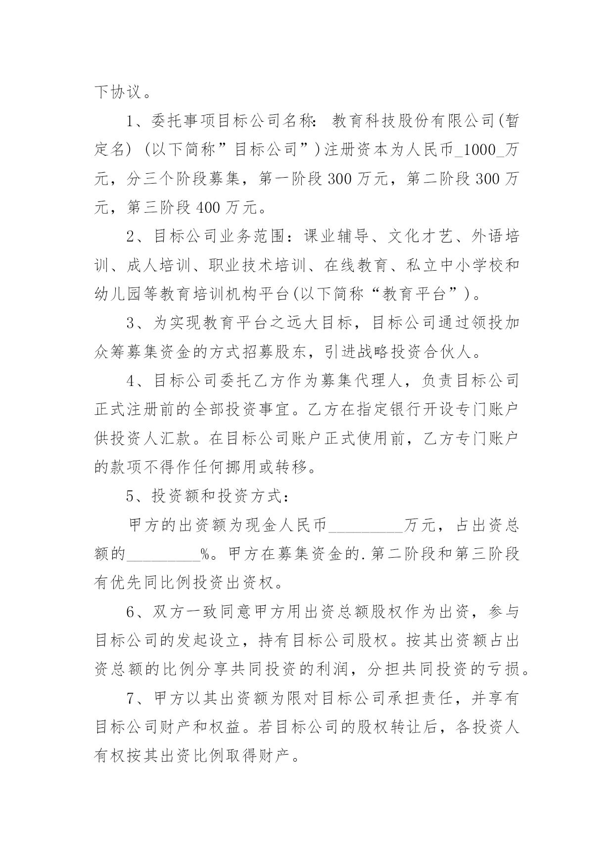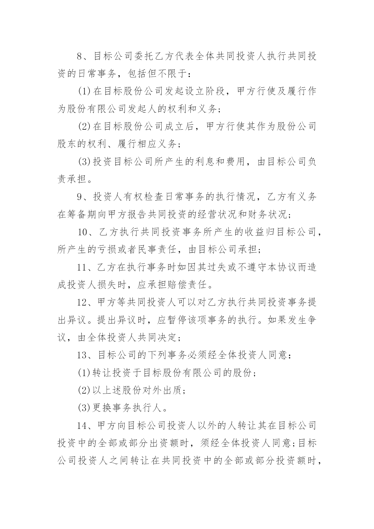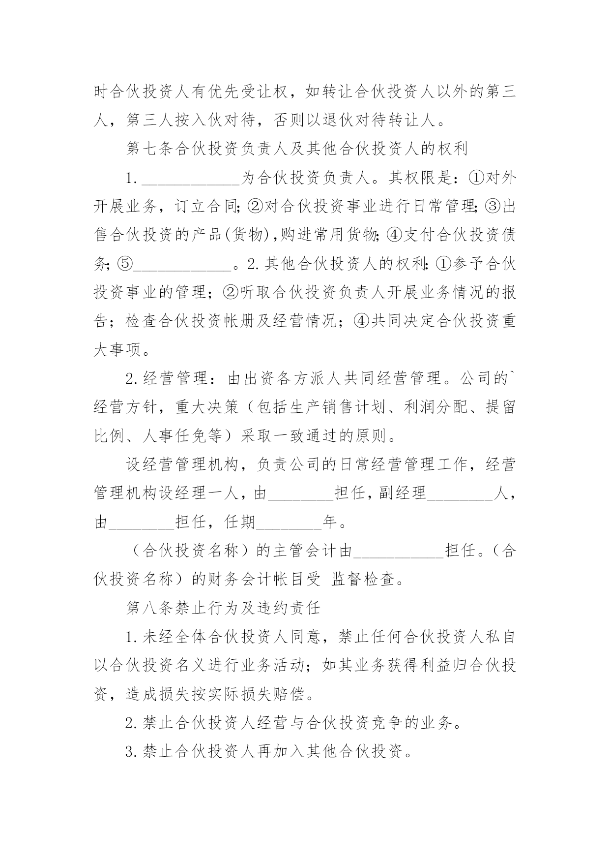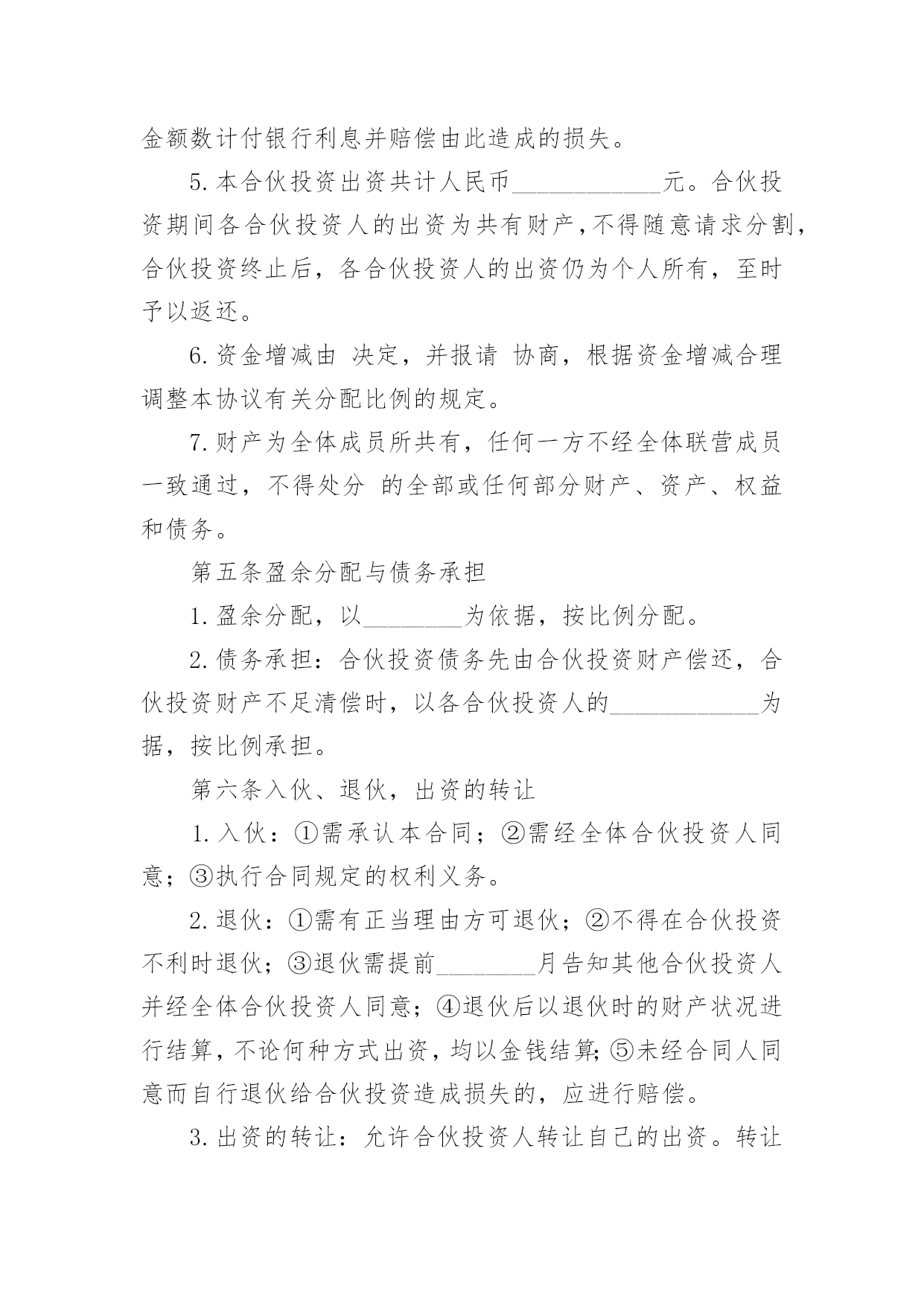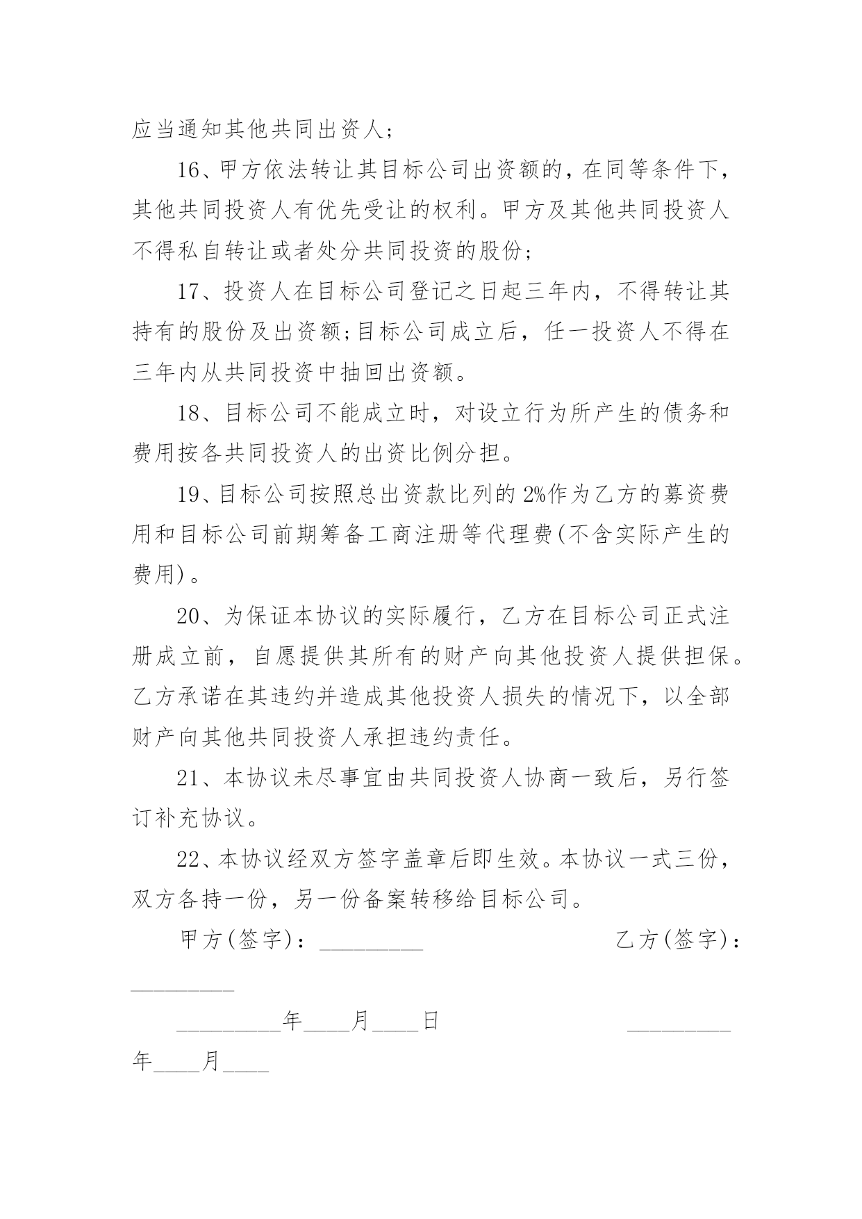 两人合伙投资协议书两人合伙投资协议书在生活中,协议起到的作用越来越大,签订协议是解决纠纷的保障。相信很多朋友都对拟协议感到非常苦恼吧,以下是小编帮大家整理的两人合伙投资协议书,仅供参考,希望能够帮助到大家。两人合伙投资协议书1合伙人:甲(姓名),男(女),_年_月_日出生,现住址:市(县)街道(乡、村)号合伙人:乙(姓名),内容同上(列出合伙人的基本情况)合伙人本着公平、平等、互利的原则订立合伙协议如下:第一条甲乙双方自愿合伙经营(项目名称),总投资为_万元,甲出资_万元,乙出资_万元,各占投资总额的'_%、_%。第二条本合伙依法组成合伙企业,由甲负责办理工商登记。第三条本合伙企业经营期限为________年。如果需要延长期限的,在期满前六个月办理有关手续。第四条合伙双方共同经营、共同劳动,共担风险,共负盈亏。企业盈余按照各自的投资比例分配。企业债务按照各自投资比例负担。任何一方对外偿还债务后,另一方应当按比例在____日内向对方清偿自己负担的部分。第五条他人可以入伙,但须经甲乙双方同意,并办理增加出资额的手续和订立补充协议。补充协议与本协议具有同等效力。第六条出现下列事项,合伙终止:(一)合伙期满;(二)合伙双方协商同意;(三)合伙经营的事业已经完成或者无法完成;(四)其他法律规定的情况。第七条本协议未尽事宜,双方可以补充规定,补充协议与本协议有同等效力。第八条本协议一式份,合伙人各一份。本协议自合伙人签字(或盖章)之日起生效。合伙人:(签字或盖章)合伙人:(签字或盖章)_年_月_日两人合伙投资协议书2甲方:乙方:甲、乙双方经友好协商,根据中华人民共和国法律、法规的规定,就各方共同出资并由甲方以其名义享有目标公司股权,并作为发起人参与目标公司的发起设立事宜,达成如下协议。1、委托事项目标公司名称:教育科技股份有限公司(暂定名)(以下简称”目标公司”)注册资本为人民币_1000_万元,分三个阶段募集,第一阶段300万元,第二阶段300万元,第三阶段400万元。2、目标公司业务范围:课业辅导、文化才艺、外语培训、成人培训、职业技术培训、在线教育、私立中小学校和幼儿园等教育培训机构平台(以下简称“教育平台”)。3、为实现教育平台之远大目标,目标公司通过领投加众筹募集资金的方式招募股东,引进战略投资合伙人。4、目标公司委托乙方作为募集代理人,负责目标公司正式注册前的全部投资事宜。乙方在指定银行开设专门账户供投资人汇款。在目标公司账户正式使用前,乙方专门账户的款项不得作任何挪用或转移。5、投资额和投资方式:甲方的出资额为现金人民币_________万元,占出资总额的_________%。甲方在募集资金的.第二阶段和第三阶段有优先同比例投资出资权。6、双方一致同意甲方用出资总额股权作为出资,参与目标公司的发起设立,持有目标公司股权。按其出资额占出资总额的比例分享共同投资的利润,分担共同投资的亏损。7、甲方以其出资额为限对目标公司承担责任,并享有目标公司财产和权益。若目标公司的股权转让后,各投资人有权按其出资比例取得财产。8、目标公司委托乙方代表全体共同投资人执行共同投资的日常事务,包括但不限于:(1)在目标股份公司发起设立阶段,甲方行使及履行作为股份有限公司发起人的权利和义务;(2)在目标股份公司成立后,甲方行使其作为股份公司股东的权利、履行相应义务;(3)投资目标公司所产生的利息和费用,由目标公司负责承担。9、投资人有权检查日常事务的执行情况,乙方有义务在筹备期向甲方报告共同投资的经营状况和财务状况;10、乙方执行共同投资事务所产生的收益归目标公司,所产生的亏损或者民事责任,由目标公司承担;11、乙方在执行事务时如因其过失或不遵守本协议而造成投资人损失时,应承担赔偿责任。12、甲方等共同投资人可以对乙方执行共同投资事务提出异议。提出异议时,应暂停该项事务的执行。如果发生争议,由全体投资人共同决定;13、目标公司的下列事务必须经全体投资人同意:(1)转让投资于目标股份有限公司的股份;(2)以上述股份对外出质;(3)更换事务执行人。14、甲方向目标公司投资人以外的人转让其在目标公司投资中的全部或部分出资额时,须经全体投资人同意;目标公司投资人之间转让在共同投资中的全部或部分投资额时,应当通知其他共同出资人;16、甲方依法转让其目标公司出资额的,在同等条件下,其他共同投资人有优先受让的权利。甲方及其他共同投资人不得私自转让或者处分共同投资的股份;17、投资人在目标公司登记之日起三年内,不得转让其持有的股份及出资额;目标公司成立后,任一投资人不得在三年内从共同投资中抽回出资额。18、目标公司不能成立时,对设立行为所产生的债务和费用按各共同投资人的出资比例分担。19、目标公司按照总出资款比列的2%作为乙方的募资费用和目标公司前期筹备工商注册