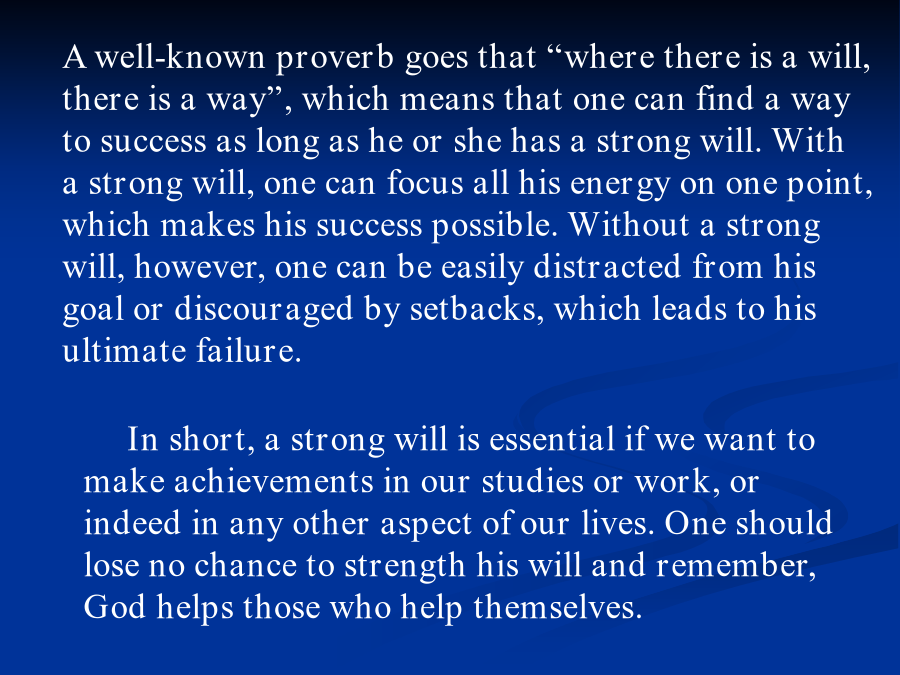 Itisfouryearssinceaheart-breakingearthquakehitWenchuan.Manysurvivals(survivors)haveapositiveattitudetowardslifedespitethefactthattheyoncesufferedalotbothmentallyandphysically.However,manyseniorstudentsingoodconditionareaimless,whichleavesusmuchtothinkabout.Sowhatshouldwedoifwe’refacedwithchallengesinlife?Firstofall,weshouldhaveatough(strong)will.Asanoldsayinggoes,“Onceyouhaveawill,theworldwillmakewayforyou.”Besides,keepingapositiveattitudetowardslifewillhelpyougothroughhardshipseasily.Sodearfriends,don’tbeblankaboutlife.Let’sacceptthechallengesinlifeandbegoodbuildersofoursociety.Inshort,astrongwillisessentialifwewanttomakeachievementsinourstudiesorwork,orindeedinanyotheraspectofourlives.Oneshouldlosenochancetostrengthhiswillandremember,Godhelpsthosewhohelpthemselves.