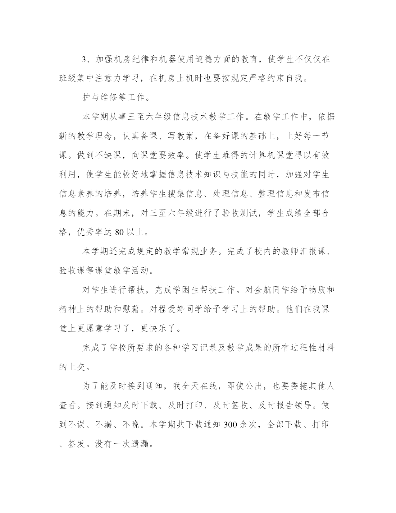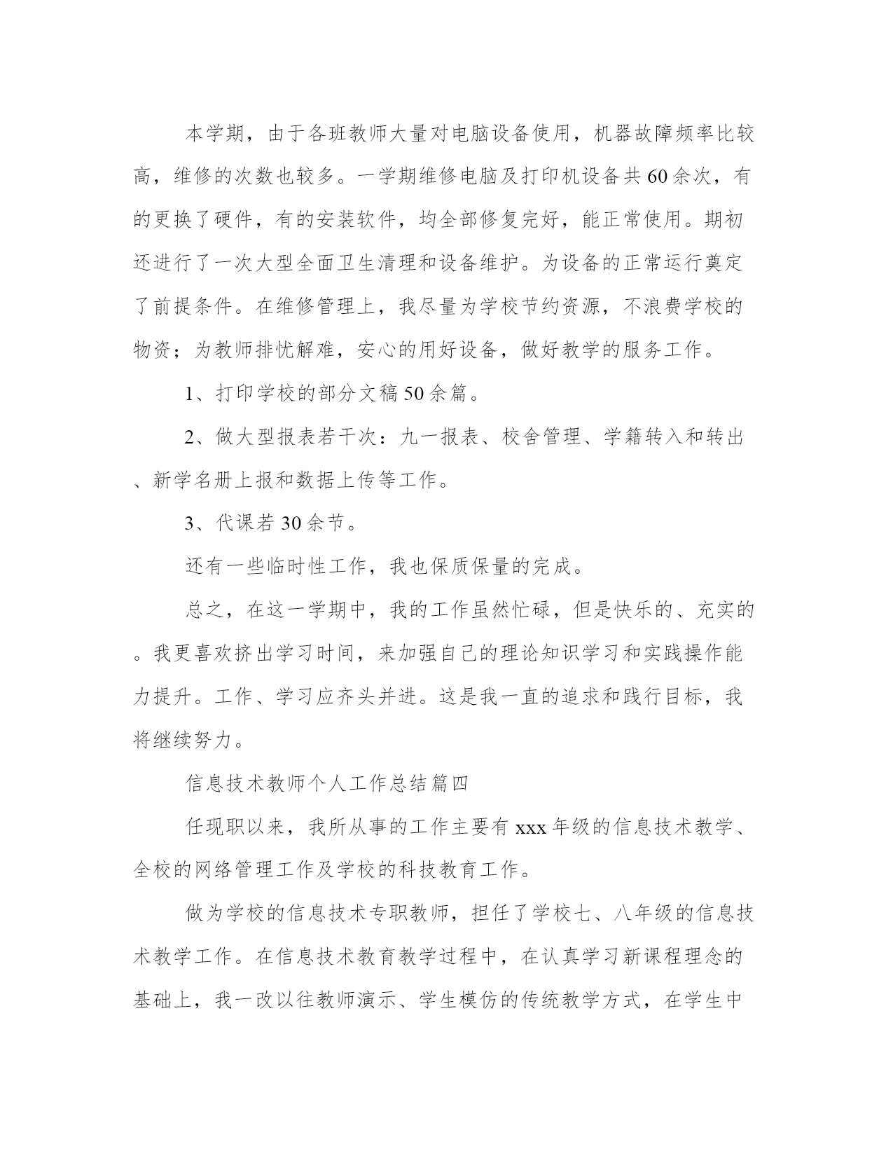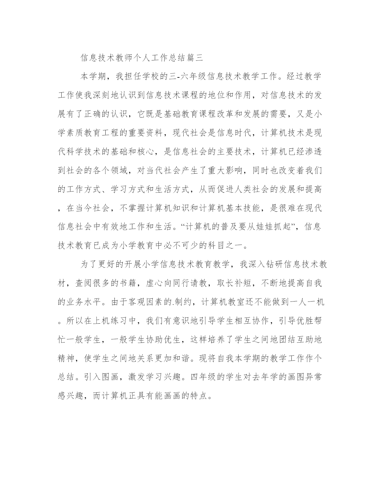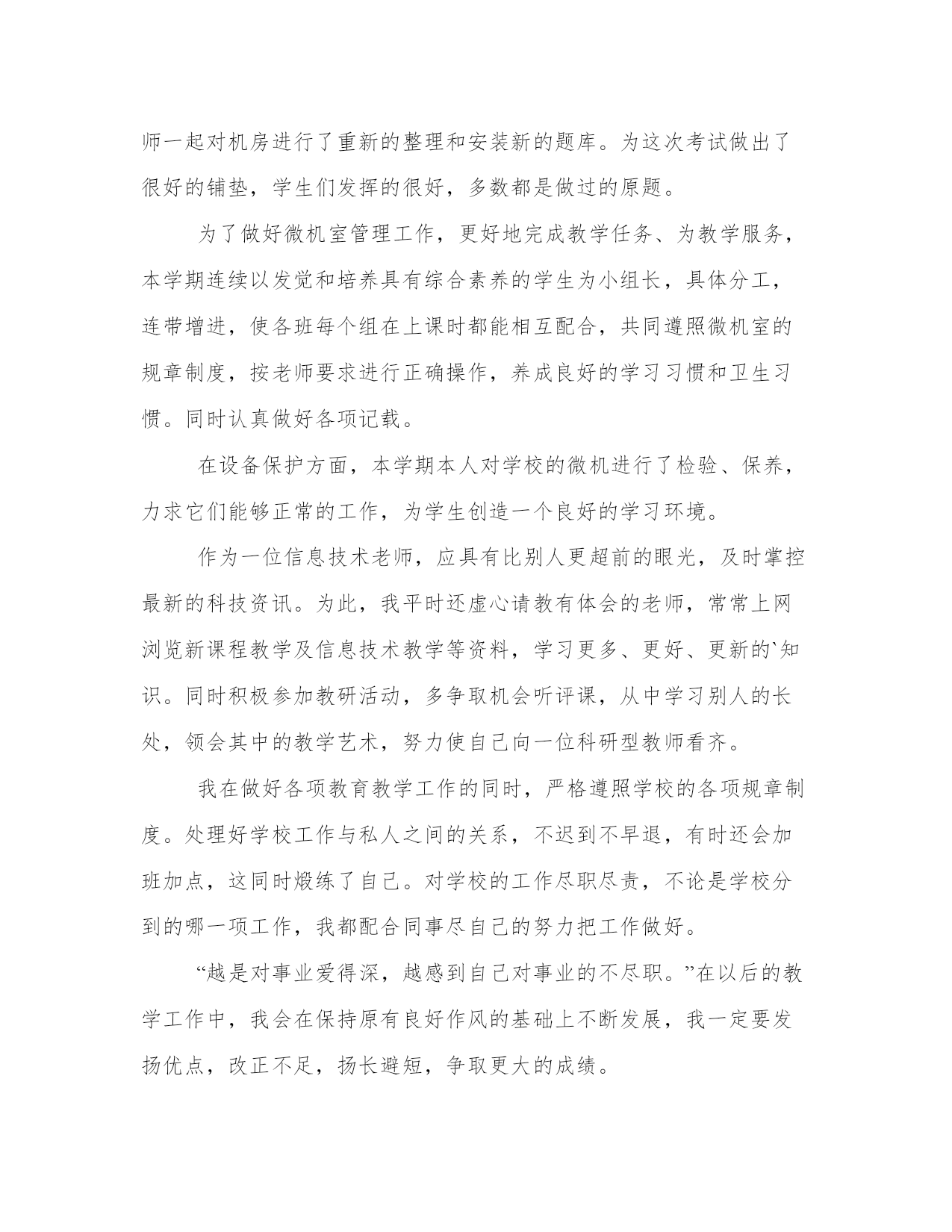 最新信息技术教师个人工作总结范文(通用8篇)总结是对过去一段时间的归纳和梳理,可以帮助我们更清晰地认识自己。写一篇较为完美的总结以下是一些写作大师的总结写作技巧和方法,供大家参考和学习。信息技术教师个人工作总结篇一这学年来,本人在教育教学工作中,始终坚持党的教育方针,面向全体学生,教书育人,为人师表,确立以学生为主体,以培养学生主动发展为中心的'教学思想,重视学生的个性发展,重视激发学生的创新能力,工作责任心强,服从领导的分工,积极做好本职工作,认真备课、上课、听课、评课,广泛获取各种知识,形成比较完整的知识结构,严格要求学生,尊重学生,发扬教学民主,使学生学有所得,不断提高,从而不断提高自己的教学水平,并顺利完成教育教学任务。认真学习新的教育理论,及时更新教育理念。积极参加远程教育培训,及时提交作业及撰写学习反思。我深刻的认识到自己的工作是和祖国的未来发展,国家的繁荣昌盛联系在一起的,自己的日常平凡的工作不是简单的上课、下课,批改作业,而是像陶行知那样把教育事业当作“为一大事来,做一大事去,”,必须做到有了这种认识,才能自觉担负起教书育人这份责任。本人严格遵守学校的各项规章制度,不迟到、不早退、有事主动请假。在工作中,尊敬领导、团结同事,能正确处理好与领导同事之间的关系。平时,勤俭节约、任劳任怨、对人真诚、热爱学生、人际关系和谐融洽,从不闹无原则的纠纷,处处以一名人民教师的要求来规范自己的言行,毫不松懈地培养自己的综合素质和能力。1、认真钻研教材,对教材的基本思想、基本概念,每句话、每个字都弄清楚,了解教材的结构,重点与难点,掌握知识的逻辑,能运用自如,知道应补充哪些资料,怎样才能教好。2、了解学生原有的知识技能的质量,他们的兴趣、需要、方法、习惯,学习新知识可能会有哪些困难,采取相应的预防措施。4、积极参与听课、评课,虚心向同行学习教学方法,博采众长,提高教学水平。5、热爱学生,平等的对待每一个学生,让他们都感受到老师的关心,良好的师生关系促进了学生的学习。1、加强自身基本功的训练,课堂上做到精讲精练,注重对学生能力的培养。2、对差生多些关心,多点爱心,再多一些耐心,使他们在对计算机的认识上有更大进步。3、加强机房纪律和机器使用道德方面的教育,使学生不仅在班级集中注意力学习,在机房上机时也要按规定严格约束自己。4、利用各种教学方法,提高学生注意力。以上是本人在本学期信息技术教学工作中的总结。社会在发展,时代在前进,学生的特点和问题也在发生着不断的变化。教育教学工作,是一项常做常新、永无止境的工作。作为教育工信息技术教师个人工作总结篇二不知不觉中一个学期就要终止了,回想这个学期的工作,基本上是比较顺利的。我所享有的收获,我会用于下个学期的工作中,我所碰到的问题我会认真摸索,想办法解决。在这个学期中,本人能在保持原有良好工作态度的基础上,不断进步,不断进取,不断学习,虚心向有体会的老师学习。为了保持良好的工作姿势,以使下一学年能以更优秀的面貌去连续工作,现将本人这学期的工作情形进行全面的总结,总结以下:在这学期里,我从思想上,利用师德师风教育活动端正自己;从行动上学电脑技术,学教学技能等;在生活上注意形象,为人师表。一学期来,我积极参加政治学习,努力提高自身的思想觉悟,服从学校的工作安排,默默无闻地配合领导和老师们做好校内外的各项工作,得到了领导和同事的肯定。这些肯定使我在以后的工作中变得更有信心、有动力去做好每一样工作。这学期我担负高一x班和高二xx两个班的信息技术课的教学,由于xx月中下旬高二学生要参加xx省学业水平测试,后期在高二的教学上又增加了近x倍的课时,使得工作量加大,我与同学科的邢老师一起对机房进行了重新的整理和安装新的题库。为这次考试做出了很好的铺垫,学生们发挥的很好,多数都是做过的原题。为了做好微机室管理工作,更好地完成教学任务、为教学服务,本学期连续以发觉和培养具有综合素养的学生为小组长,具体分工,连带增进,使各班每个组在上课时都能相互配合,共同遵照微机室的规章制度,按老师要求进行正确操作,养成良好的学习习惯和卫生习惯。同时认真做好各项记载。在设备保护方面,本学期本人对学校的微机进行了检验、保养,力求它们能够正常的工作,为学生创造一个良好的学习环境。作为一位信息技术老师,应具有比别人更超前的眼光,及时掌控最新的科技资讯。为此,我平时还虚心请教有体会的老师,常常上网浏览新课程教学及信息技术教学等资料,学习更多、更好、更新的`知识。同时积极参加教研活动,多争取机会听评课,从中学习别人的长处,领会其中的教学艺术,努力使自己向一位科研型教师看齐。我在做好各项教育教学工作的同时,严格遵照学校的各项规章制度。处理好学校工作与私人之间的关系,不迟到不早退,有时还会加班加点,这