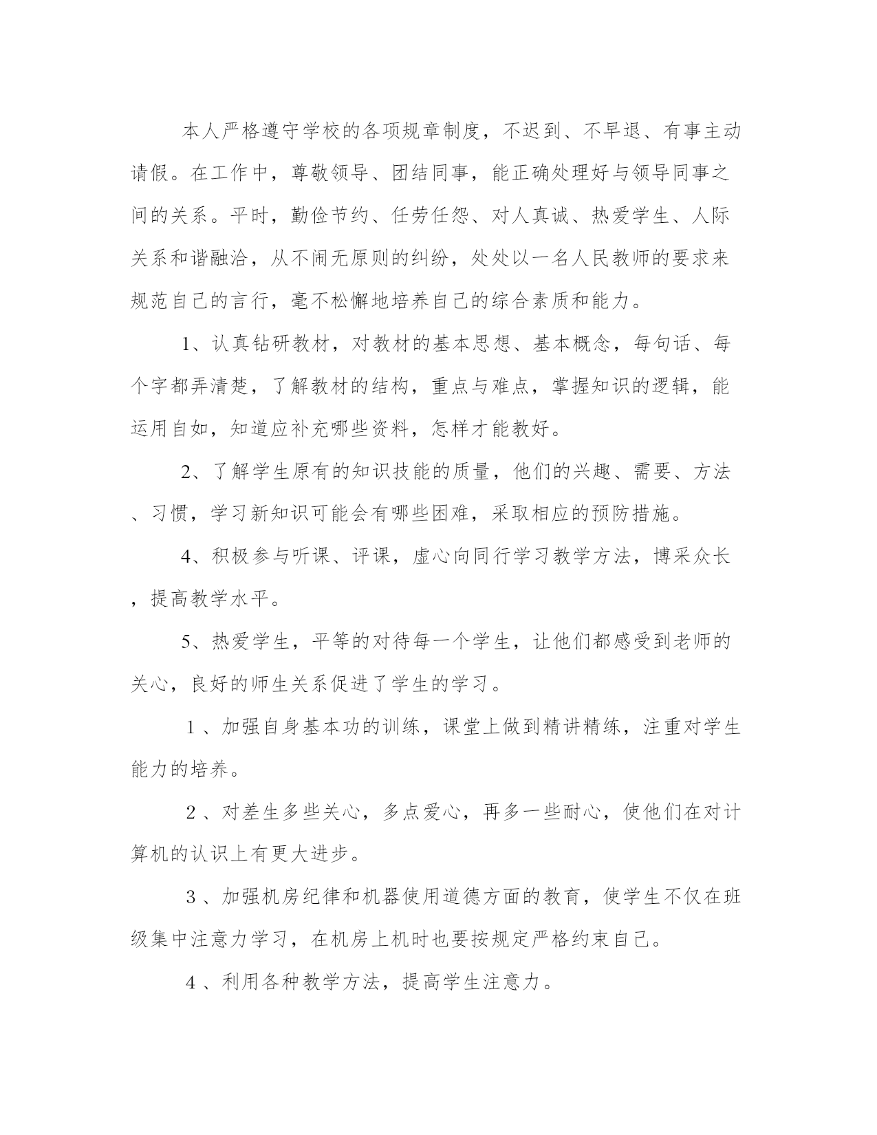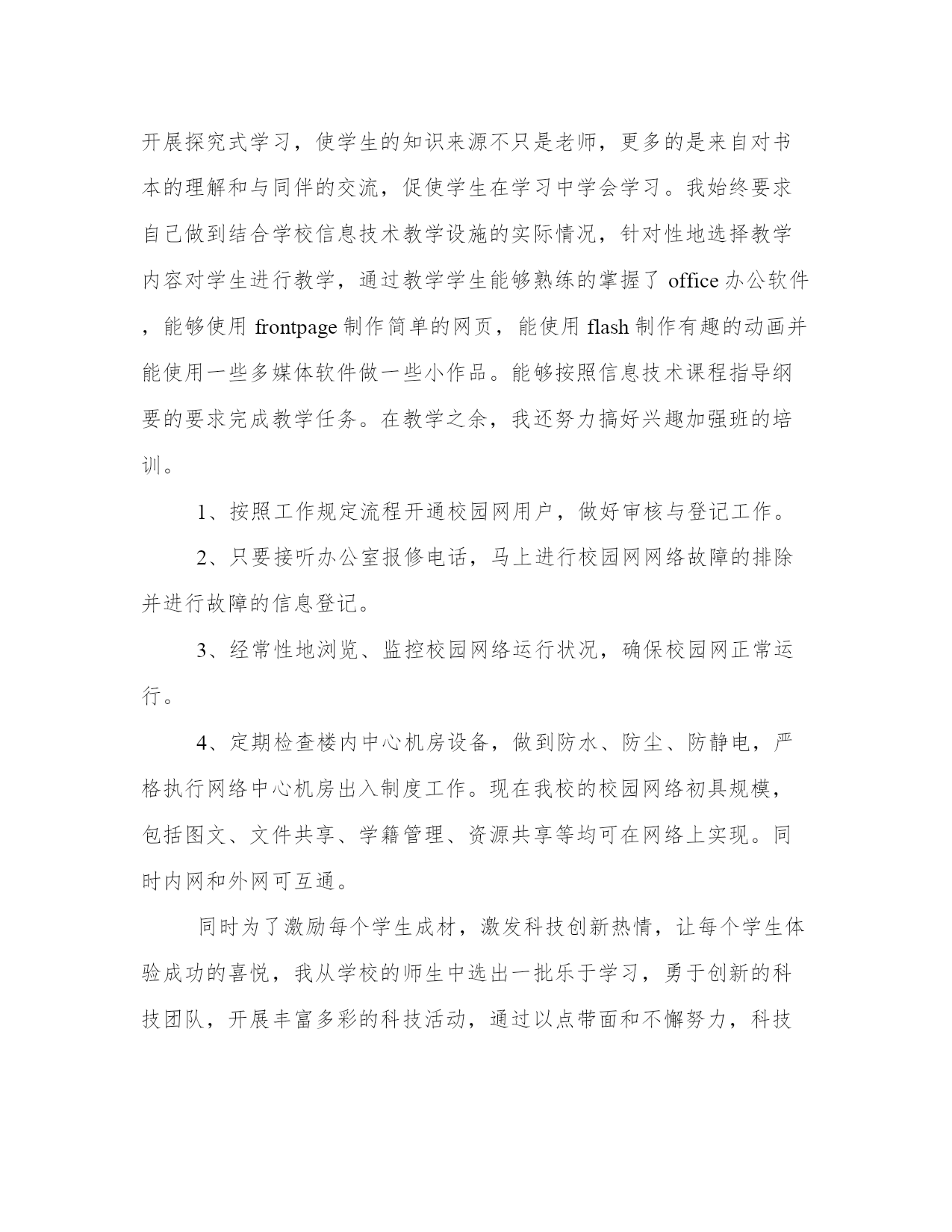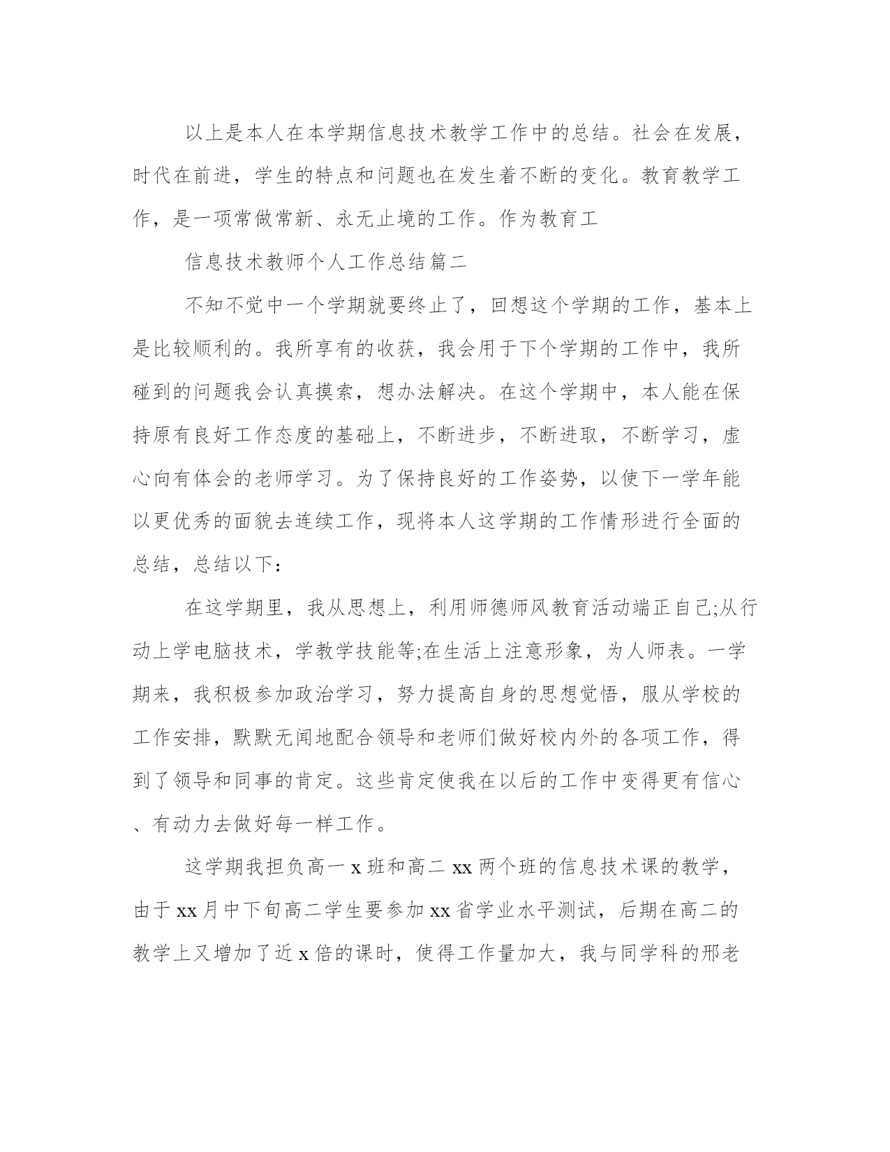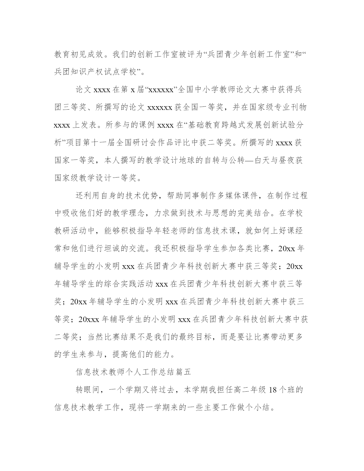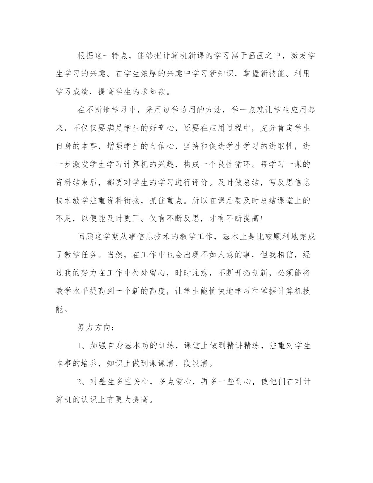 最新信息技术教师个人工作总结范文(通用8篇)总结是对过去一段时间的归纳和梳理,可以帮助我们更清晰地认识自己。写一篇较为完美的总结以下是一些写作大师的总结写作技巧和方法,供大家参考和学习。信息技术教师个人工作总结篇一这学年来,本人在教育教学工作中,始终坚持党的教育方针,面向全体学生,教书育人,为人师表,确立以学生为主体,以培养学生主动发展为中心的'教学思想,重视学生的个性发展,重视激发学生的创新能力,工作责任心强,服从领导的分工,积极做好本职工作,认真备课、上课、听课、评课,广泛获取各种知识,形成比较完整的知识结构,严格要求学生,尊重学生,发扬教学民主,使学生学有所得,不断提高,从而不断提高自己的教学水平,并顺利完成教育教学任务。认真学习新的教育理论,及时更新教育理念。积极参加远程教育培训,及时提交作业及撰写学习反思。我深刻的认识到自己的工作是和祖国的未来发展,国家的繁荣昌盛联系在一起的,自己的日常平凡的工作不是简单的上课、下课,批改作业,而是像陶行知那样把教育事业当作“为一大事来,做一大事去,”,必须做到有了这种认识,才能自觉担负起教书育人这份责任。本人严格遵守学校的各项规章制度,不迟到、不早退、有事主动请假。在工作中,尊敬领导、团结同事,能正确处理好与领导同事之间的关系。平时,勤俭节约、任劳任怨、对人真诚、热爱学生、人际关系和谐融洽,从不闹无原则的纠纷,处处以一名人民教师的要求来规范自己的言行,毫不松懈地培养自己的综合素质和能力。1、认真钻研教材,对教材的基本思想、基本概念,每句话、每个字都弄清楚,了解教材的结构,重点与难点,掌握知识的逻辑,能运用自如,知道应补充哪些资料,怎样才能教好。2、了解学生原有的知识技能的质量,他们的兴趣、需要、方法、习惯,学习新知识可能会有哪些困难,采取相应的预防措施。4、积极参与听课、评课,虚心向同行学习教学方法,博采众长,提高教学水平。5、热爱学生,平等的对待每一个学生,让他们都感受到老师的关心,良好的师生关系促进了学生的学习。1、加强自身基本功的训练,课堂上做到精讲精练,注重对学生能力的培养。2、对差生多些关心,多点爱心,再多一些耐心,使他们在对计算机的认识上有更大进步。3、加强机房纪律和机器使用道德方面的教育,使学生不仅在班级集中注意力学习,在机房上机时也要按规定严格约束自己。4、利用各种教学方法,提高学生注意力。以上是本人在本学期信息技术教学工作中的总结。社会在发展,时代在前进,学生的特点和问题也在发生着不断的变化。教育教学工作,是一项常做常新、永无止境的工作。作为教育工信息技术教师个人工作总结篇二不知不觉中一个学期就要终止了,回想这个学期的工作,基本上是比较顺利的。我所享有的收获,我会用于下个学期的工作中,我所碰到的问题我会认真摸索,想办法解决。在这个学期中,本人能在保持原有良好工作态度的基础上,不断进步,不断进取,不断学习,虚心向有体会的老师学习。为了保持良好的工作姿势,以使下一学年能以更优秀的面貌去连续工作,现将本人这学期的工作情形进行全面的总结,总结以下:在这学期里,我从思想上,利用师德师风教育活动端正自己;从行动上学电脑技术,学教学技能等;在生活上注意形象,为人师表。一学期来,我积极参加政治学习,努力提高自身的思想觉悟,服从学校的工作安排,默默无闻地配合领导和老师们做好校内外的各项工作,得到了领导和同事的肯定。这些肯定使我在以后的工作中变得更有信心、有动力去做好每一样工作。这学期我担负高一x班和高二xx两个班的信息技术课的教学,由于xx月中下旬高二学生要参加xx省学业水平测试,后期在高二的教学上又增加了近x倍的课时,使得工作量加大,我与同学科的邢老师一起对机房进行了重新的整理和安装新的题库。为这次考试做出了很好的铺垫,学生们发挥的很好,多数都是做过的原题。为了做好微机室管理工作,更好地完成教学任务、为教学服务,本学期连续以发觉和培养具有综合素养的学生为小组长,具体分工,连带增进,使各班每个组在上课时都能相互配合,共同遵照微机室的规章制度,按老师要求进行正确操作,养成良好的学习习惯和卫生习惯。同时认真做好各项记载。在设备保护方面,本学期本人对学校的微机进行了检验、保养,力求它们能够正常的工作,为学生创造一个良好的学习环境。作为一位信息技术老师,应具有比别人更超前的眼光,及时掌控最新的科技资讯。为此,我平时还虚心请教有体会的老师,常常上网浏览新课程教学及信息技术教学等资料,学习更多、更好、更新的`知识。同时积极参加教研活动,多争取机会听评课,从中学习别人的长处,领会其中的教学艺术,努力使自己向一位科研型教师看齐。我在做好各项教育教学工作的同时,严格遵照学校的各项规章制度。处理好学校工作与私人之间的关系,不迟到不早退,有时还会加班加点,这