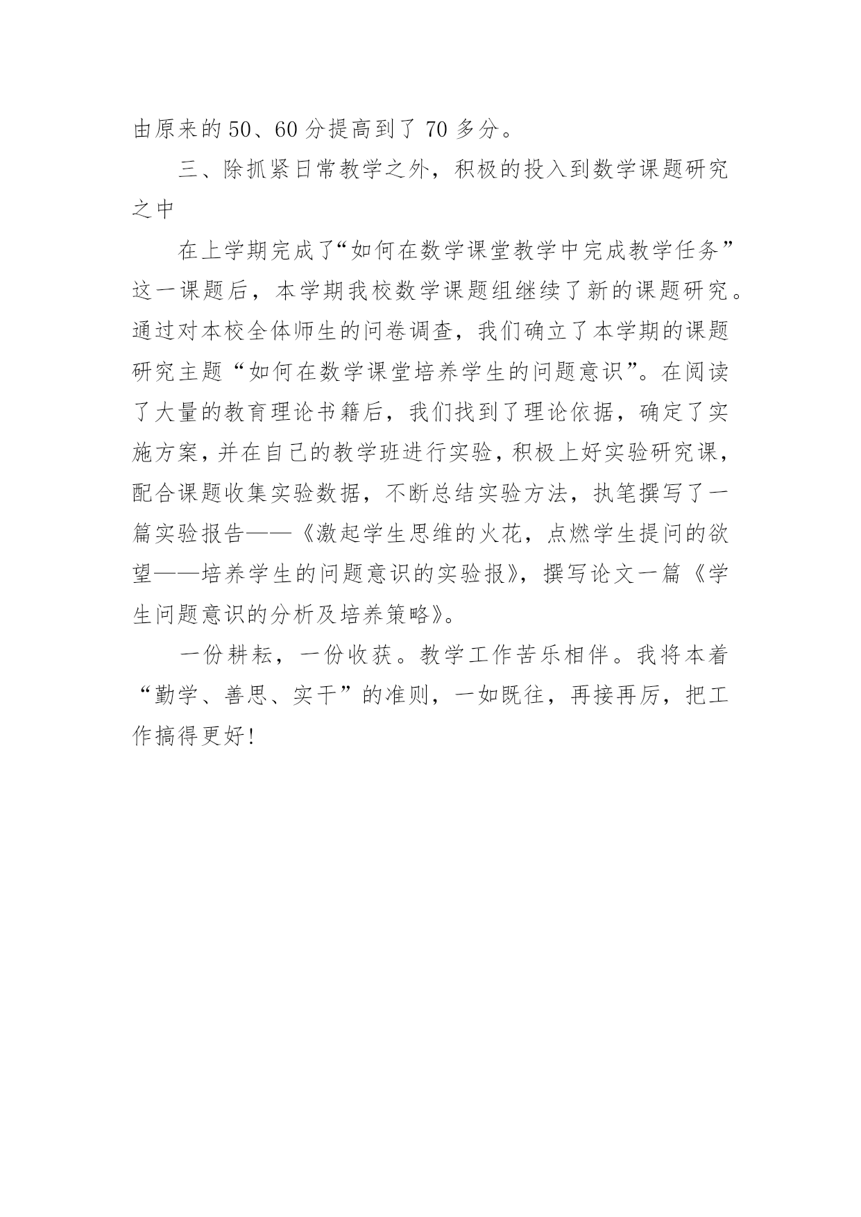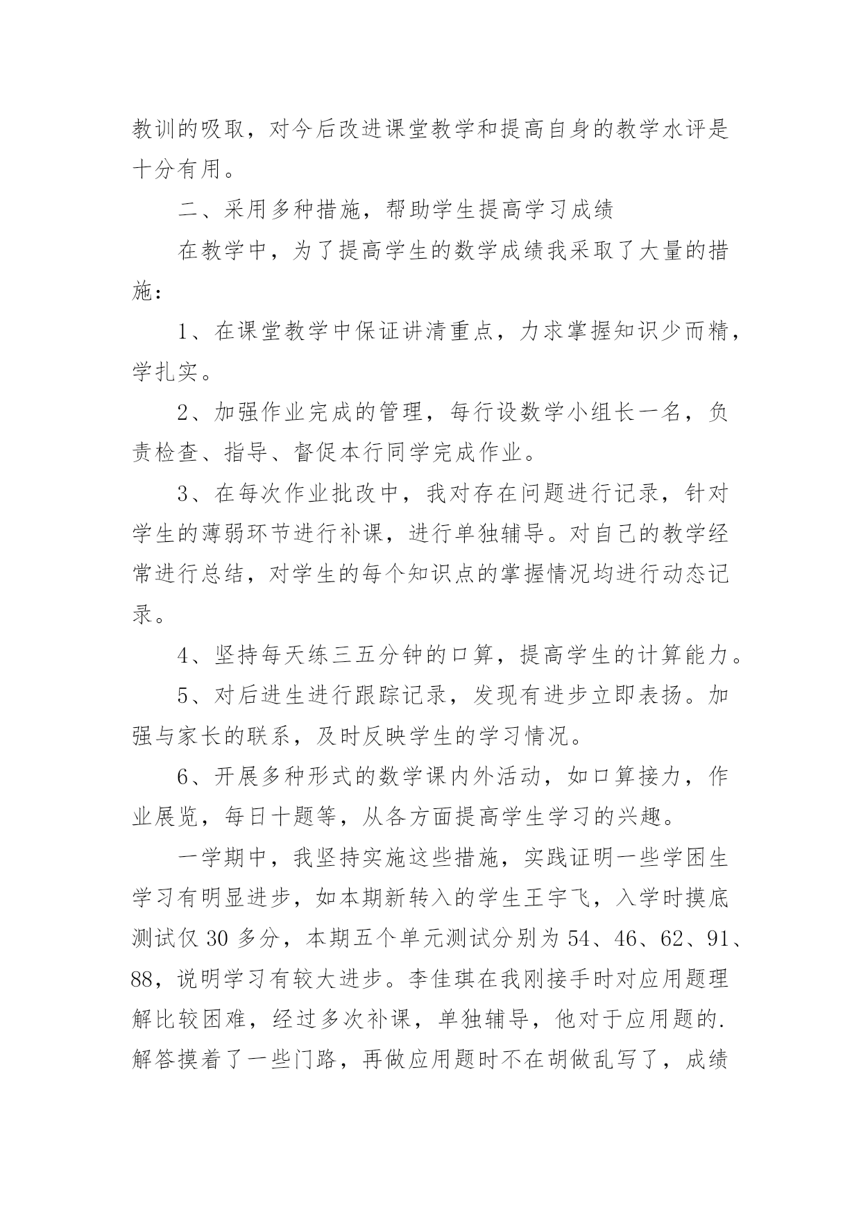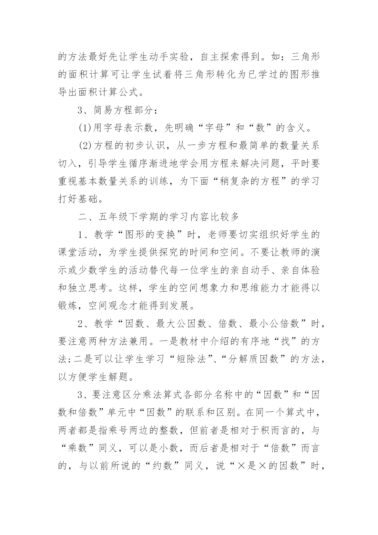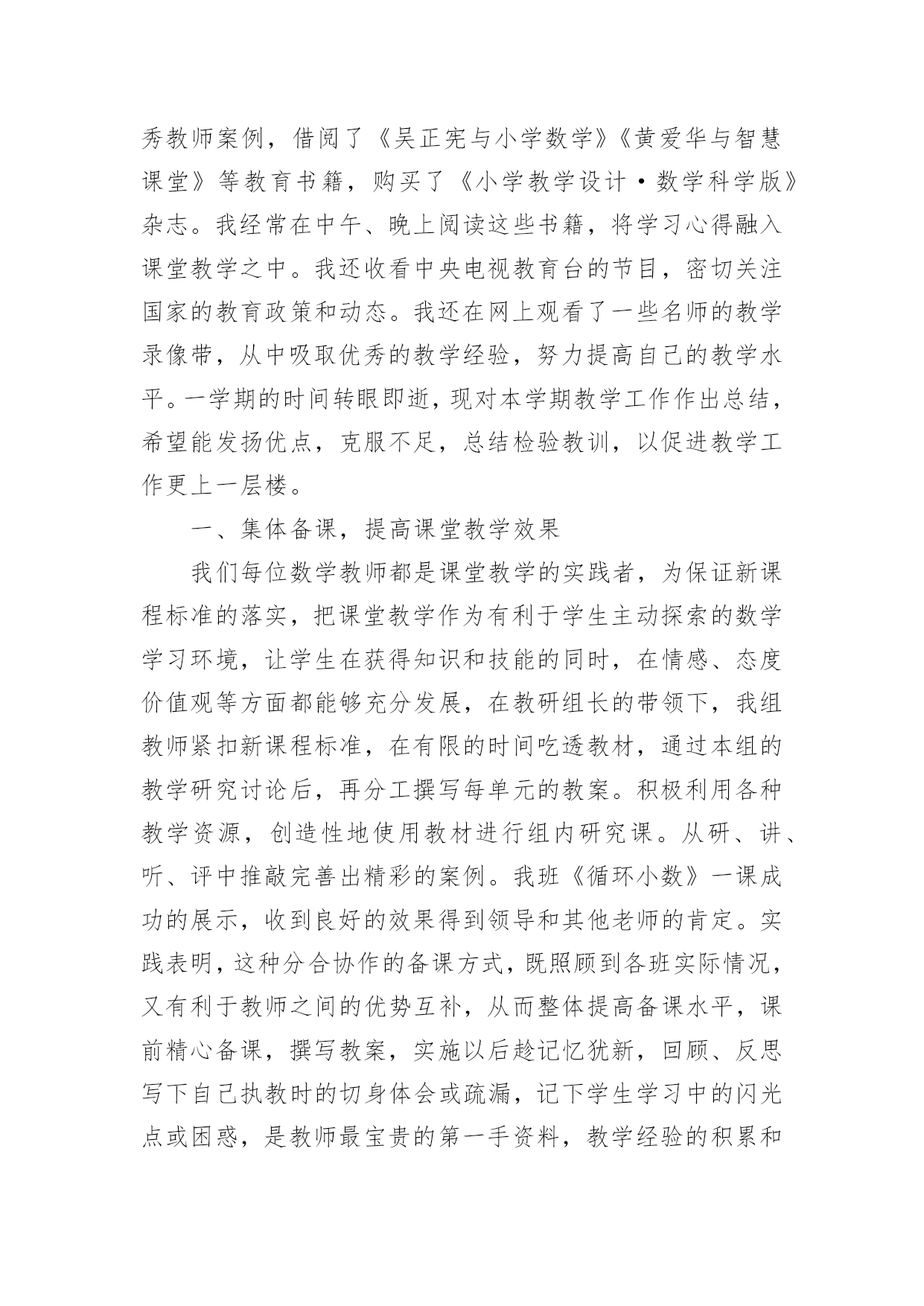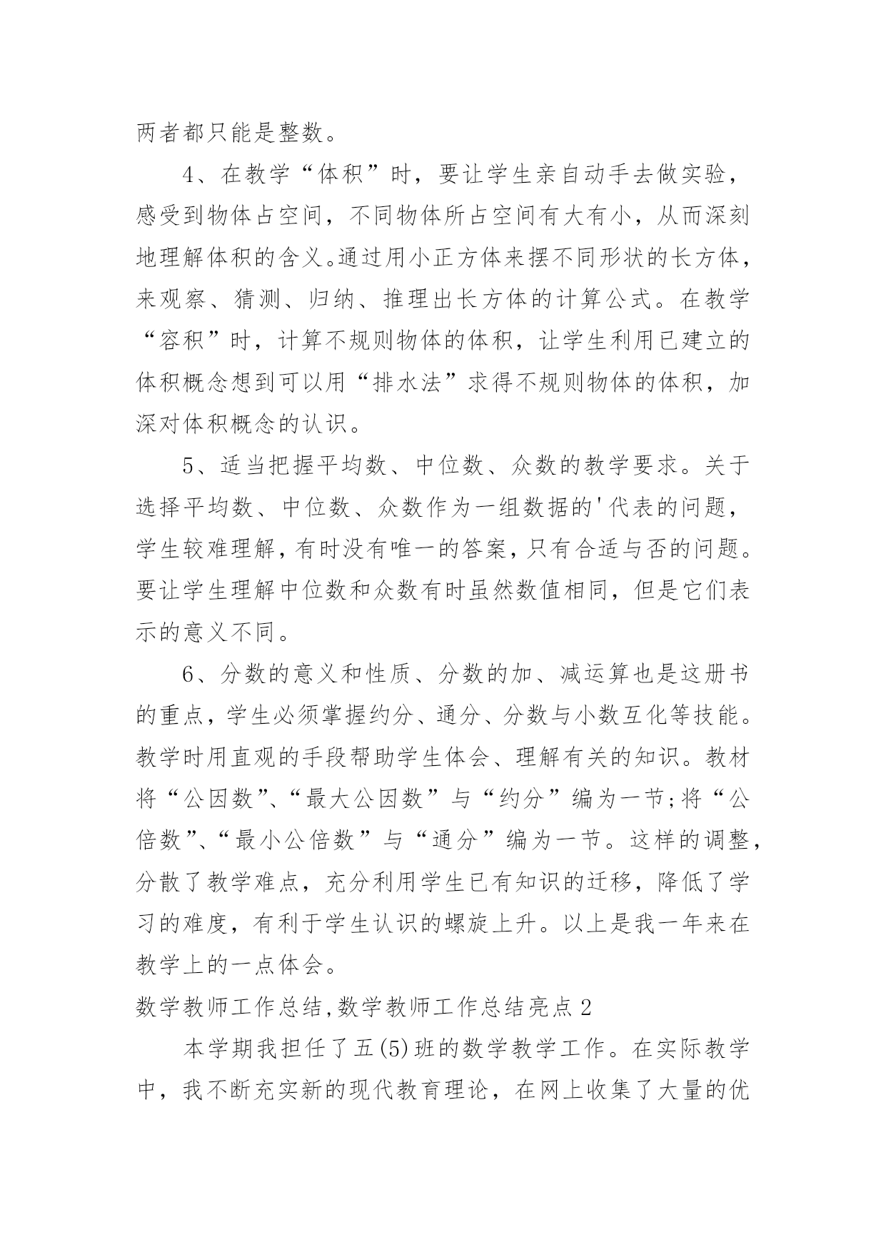 数学教师工作总结,数学教师工作总结亮点数学教师工作总结,数学教师工作总结亮点总结是事后对某一时期、某一项目或某些工作进行回顾和分析,从而做出带有规律性的结论,他能够提升我们的书面表达能力,不妨让我们认真地完成总结吧。那么总结应该包括什么内容呢?以下是小编帮大家整理的数学教师工作总结,数学教师工作总结亮点,仅供参考,希望能够帮助到大家。数学教师工作总结,数学教师工作总结亮点1上学年,我担任小学五年级数学教学工作。由于我是第一次教五年级数学,因此没有什么经验,在这里只是说一说自己的一些教学体会:一、五年级上学期由于相隔的时间比较长,所以简单说一说:1、小数的计算部分:(1)重视口算。(2)弄清算理与法则。(3)掌握运算定律与性质。(4)最好每天进行计算的训练。2、面积计算部分:既要重视基础知识的基本技能,又不能停留在让学生死记硬背、照搬硬套。每种图形面积计算的方法最好先让学生动手实验,自主探索得到。如:三角形的面积计算可让学生试着将三角形转化为已学过的图形推导出面积计算公式。3、简易方程部分:(1)用字母表示数,先明确“字母”和“数”的含义。(2)方程的初步认识,从一步方程和最简单的数量关系切入,引导学生循序渐进地学会用方程来解决问题,平时要重视基本数量关系的训练,为下面“稍复杂的方程”的学习打好基础。二、五年级下学期的学习内容比较多1、教学“图形的变换”时,老师要切实组织好学生的课堂活动,为学生提供探究的时间和空间。不要让教师的演示或少数学生的活动替代每一位学生的亲自动手、亲自体验和独立思考。这样,学生的空间想象力和思维能力才能得以锻炼,空间观念才能得到发展。2、教学“因数、最大公因数、倍数、最小公倍数”时,要注意两种方法兼用。一是教材中介绍的有序地“找”的方法;二是可以让学生学习“短除法”、“分解质因数”的方法,以方便学生解题。3、要注意区分乘法算式各部分名称中的“因数”和“因数和倍数”单元中“因数”的联系和区别。在同一个算式中,两者都是指乘号两边的整数,但前者是相对于积而言的,与“乘数”同义,可以是小数,而后者是相对于“倍数”而言的,与以前所说的“约数”同义,说“×是×的因数”时,两者都只能是整数。4、在教学“体积”时,要让学生亲自动手去做实验,感受到物体占空间,不同物体所占空间有大有小,从而深刻地理解体积的含义。通过用小正方体来摆不同形状的长方体,来观察、猜测、归纳、推理出长方体的计算公式。在教学“容积”时,计算不规则物体的体积,让学生利用已建立的体积概念想到可以用“排水法”求得不规则物体的体积,加深对体积概念的认识。5、适当把握平均数、中位数、众数的教学要求。关于选择平均数、中位数、众数作为一组数据的'代表的问题,学生较难理解,有时没有唯一的答案,只有合适与否的问题。要让学生理解中位数和众数有时虽然数值相同,但是它们表示的意义不同。6、分数的意义和性质、分数的加、减运算也是这册书的重点,学生必须掌握约分、通分、分数与小数互化等技能。教学时用直观的手段帮助学生体会、理解有关的知识。教材将“公因数”、“最大公因数”与“约分”编为一节;将“公倍数”、“最小公倍数”与“通分”编为一节。这样的调整,分散了教学难点,充分利用学生已有知识的迁移,降低了学习的难度,有利于学生认识的螺旋上升。以上是我一年来在教学上的一点体会。数学教师工作总结,数学教师工作总结亮点2本学期我担任了五(5)班的数学教学工作。在实际教学中,我不断充实新的现代教育理论,在网上收集了大量的优秀教师案例,借阅了《吴正宪与小学数学》《黄爱华与智慧课堂》等教育书籍,购买了《小学教学设计·数学科学版》杂志。我经常在中午、晚上阅读这些书籍,将学习心得融入课堂教学之中。我还收看中央电视教育台的节目,密切关注国家的教育政策和动态。我还在网上观看了一些名师的教学录像带,从中吸取优秀的教学经验,努力提高自己的教学水平。一学期的时间转眼即逝,现对本学期教学工作作出总结,希望能发扬优点,克服不足,总结检验教训,以促进教学工作更上一层楼。一、集体备课,提高课堂教学效果我们每位数学教师都是课堂教学的实践者,为保证新课程标准的落实,把课堂教学作为有利于学生主动探索的数学学习环境,让学生在获得知识和技能的同时,在情感、态度价值观等方面都能够充分发展,在教研组长的带领下,我组教师紧扣新课程标准,在有限的时间吃透教材,通过本组的教学研究讨论后,再分工撰写每单元的教案。积极利用各种教学资源,创造性地使用教材进行组内研究课。从研、讲、听、评中推敲完善出精彩的案例。我班《循环小数》一课成功的展示,收到良好的效果得到领导和其他老师的肯定。实践表明,这种分合协作的备课方式,既照顾到各班实际情况,又有利于教师之间的优势互补,从而整体提高备课水平,课前精心备课,撰写教案,实施以后趁记忆犹新,回顾、反思写下自