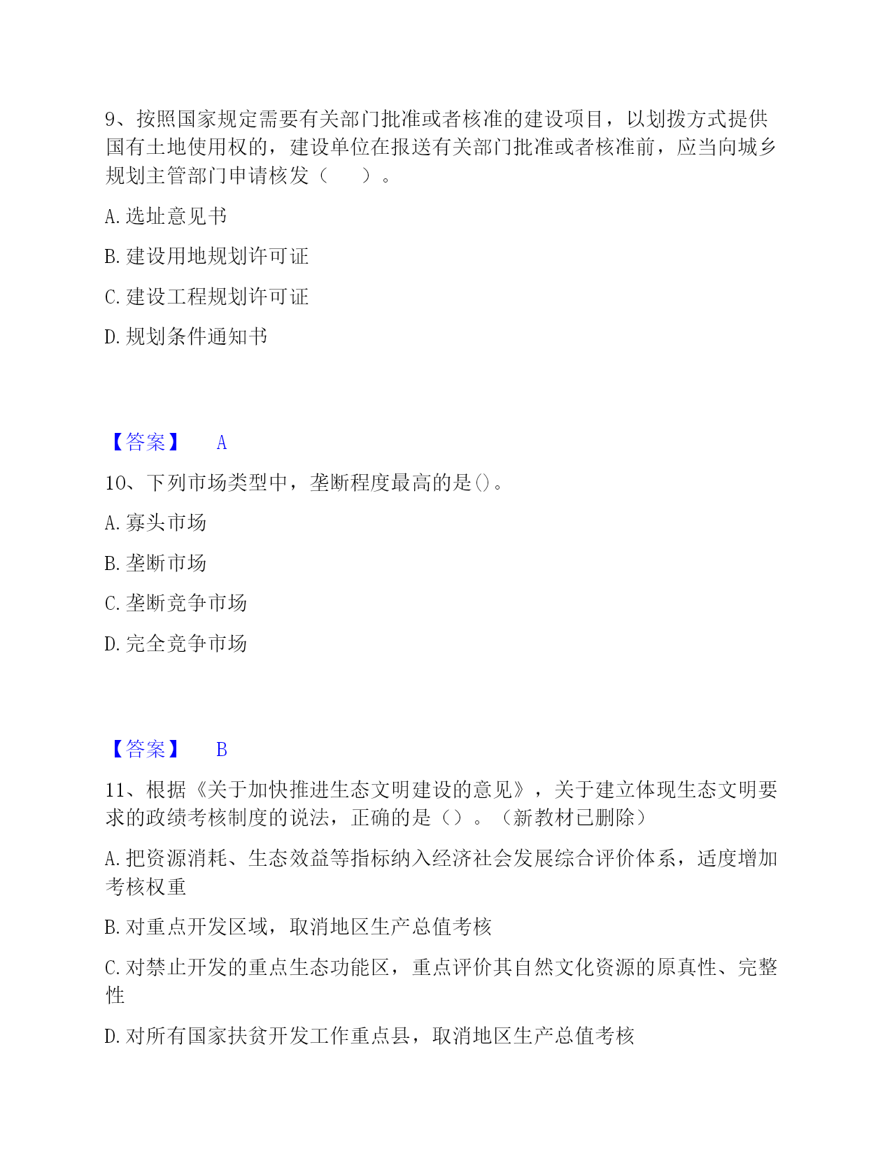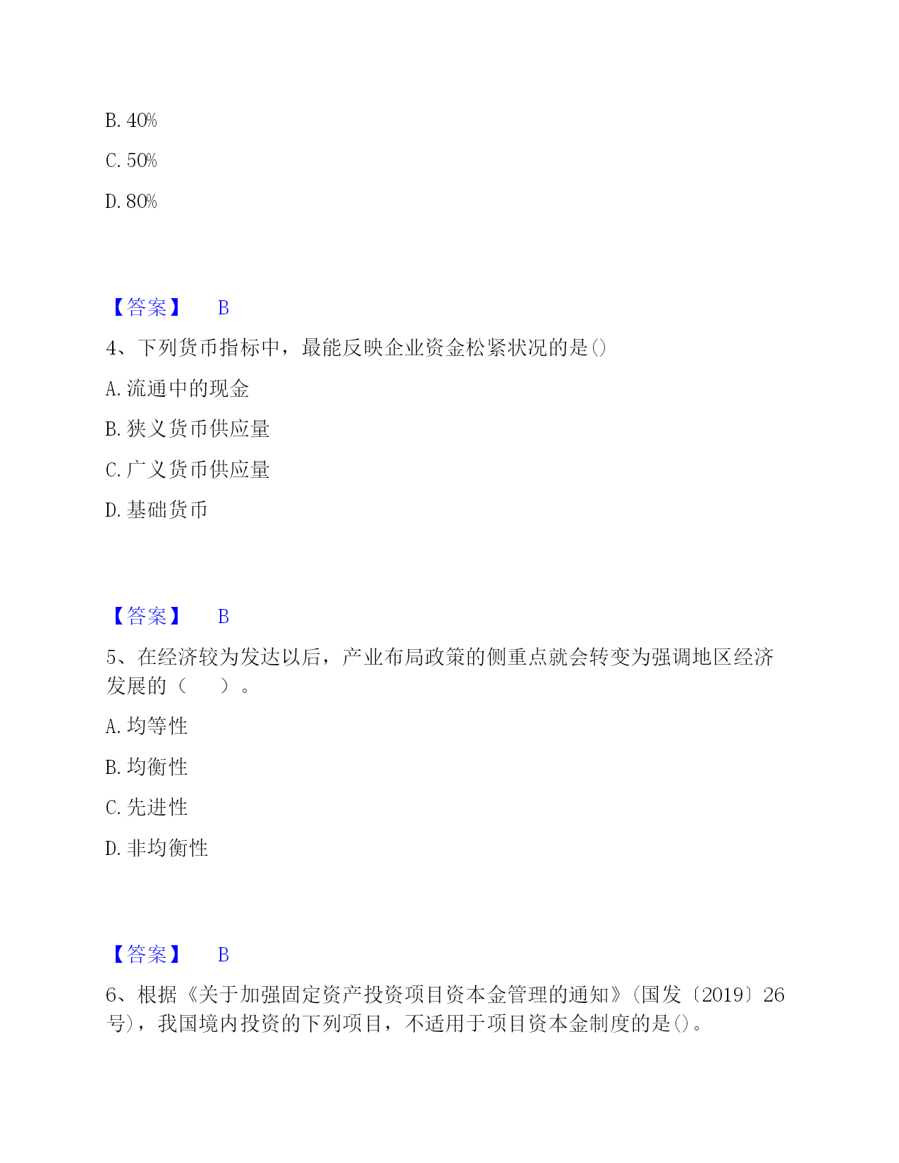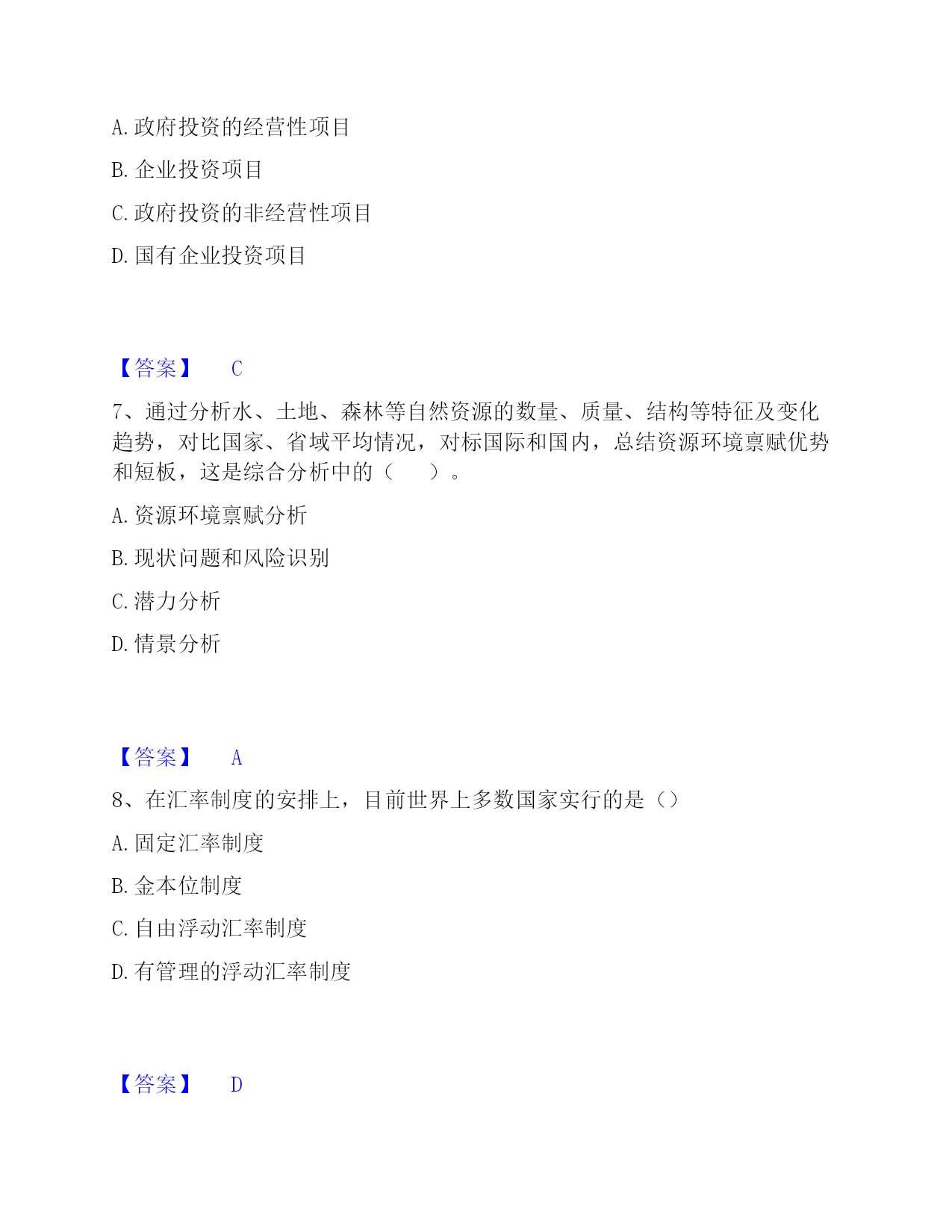 2023年咨询工程师之宏观经济政策与发展规划高分通关题库A4可打印版单选题(共50题)1、根据宏观经济理论,政府稳定经济的政策主要是通过影响()而发生作用。A.价格水平B.生产率C.经济结构D.总需求【答案】D2、集成电路产业和()是信息产业的核心。A.芯片产业B.软件产业C.硬件产业D.制造产业【答案】B3、设某一年度固定资产价值为2OOO亿元,上一年度固定资产价值为1000亿元;同期新增国内生产总值5000亿元,投资完成总额为2500亿元。则当年固定资产交付使用率为()A.20%B.40%C.50%D.80%【答案】B4、下列货币指标中,最能反映企业资金松紧状况的是()A.流通中的现金B.狭义货币供应量C.广义货币供应量D.基础货币【答案】B5、在经济较为发达以后,产业布局政策的侧重点就会转变为强调地区经济发展的()。A.均等性B.均衡性C.先进性D.非均衡性【答案】B6、根据《关于加强固定资产投资项目资本金管理的通知》(国发〔2019〕26号),我国境内投资的下列项目,不适用于项目资本金制度的是()。A.政府投资的经营性项目B.企业投资项目C.政府投资的非经营性项目D.国有企业投资项目【答案】C7、通过分析水、土地、森林等自然资源的数量、质量、结构等特征及变化趋势,对比国家、省域平均情况,对标国际和国内,总结资源环境禀赋优势和短板,这是综合分析中的()。A.资源环境禀赋分析B.现状问题和风险识别C.潜力分析D.情景分析【答案】A8、在汇率制度的安排上,目前世界上多数国家实行的是()A.固定汇率制度B.金本位制度C.自由浮动汇率制度D.有管理的浮动汇率制度【答案】D9、按照国家规定需要有关部门批准或者核准的建设项目,以划拨方式提供国有土地使用权的,建设单位在报送有关部门批准或者核准前,应当向城乡规划主管部门申请核发()。A.选址意见书B.建设用地规划许可证C.建设工程规划许可证D.规划条件通知书【答案】A10、下列市场类型中,垄断程度最高的是()。A.寡头市场B.垄断市场C.垄断竞争市场D.完全竞争市场【答案】B11、根据《关于加快推进生态文明建设的意见》,关于建立体现生态文明要求的政绩考核制度的说法,正确的是()。(新教材已删除)A.把资源消耗、生态效益等指标纳入经济社会发展综合评价体系,适度增加考核权重B.对重点开发区域,取消地区生产总值考核C.对禁止开发的重点生态功能区,重点评价其自然文化资源的原真性、完整性D.对所有国家扶贫开发工作重点县,取消地区生产总值考核【答案】C12、《城乡规划法》规定,规划条件未纳入国有土地使用权出让合同的,该国有土地使用权出让合同()。A.效力待定B.无效C.有效D.可撤销【答案】B13、下列行为中,属于经济学意义的投资是()。A.购买股票B.土地使用权转让C.购买新设备D.发行债券【答案】C14、《中共中央国务院关于深化投融资体制改革的意见》提出,坚持企业投资核准范围最小化,在一定领域、区域内先行试点推行的制度是()。A.项目承诺制B.首问负责制C.项目备案制D.项目责任制【答案】A15、主体功能区按层级,分为()。A.国家和省级两个层面B.国家、省级和市级三个层面C.省级和市级两个层面D.国家、省级、市级和县级四个层面【答案】A16、经济学中用于说明国民收入变动对投资变动影响的理论是()。A.加速数原理B.乘数原理C.边际原理D.效用原理【答案】A17、我国实行项目法人责任制的主要目的是()。A.建立投资项目监管长效机制B.建立投资责任约束机制C.建立投资决策科学化机制D.建立投资项目后评价制度【答案】B18、我国对国家重点扶持和鼓励发展的产业和项目,给予企业所得税优惠。其中符合条件的小型微利企业,减按()的税率征收企业所得税。A.25%B.20%C.15%D.10%【答案】B19、根据《中共中央国务院关于支持海南全面深化改革开放的指导意见》,海南全面深化改革开放的战略定位不包括()。A.全面深化改革开放试验区B.国家生态文明试验区C.国际旅游消费中心D.宜居宜业宜游的优质生活圈【答案】D20、现代产权制度基本特征是()。A.归属清晰、权责明确、保护严格、监管有效B.归属清晰、监管有效、保护严格、流转顺畅C.归属清晰、权责明确、保护严格、流转顺畅D.监管有效、权责明确、保护严格、流转顺畅【答案】C21、中国特色社会主义事业战略布局是()。A.四个全面B.五位一体