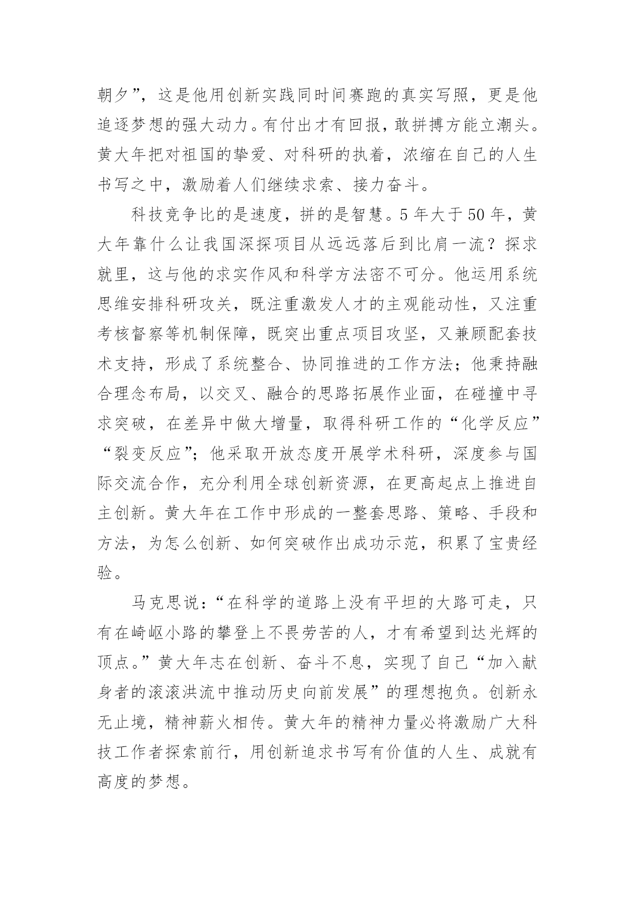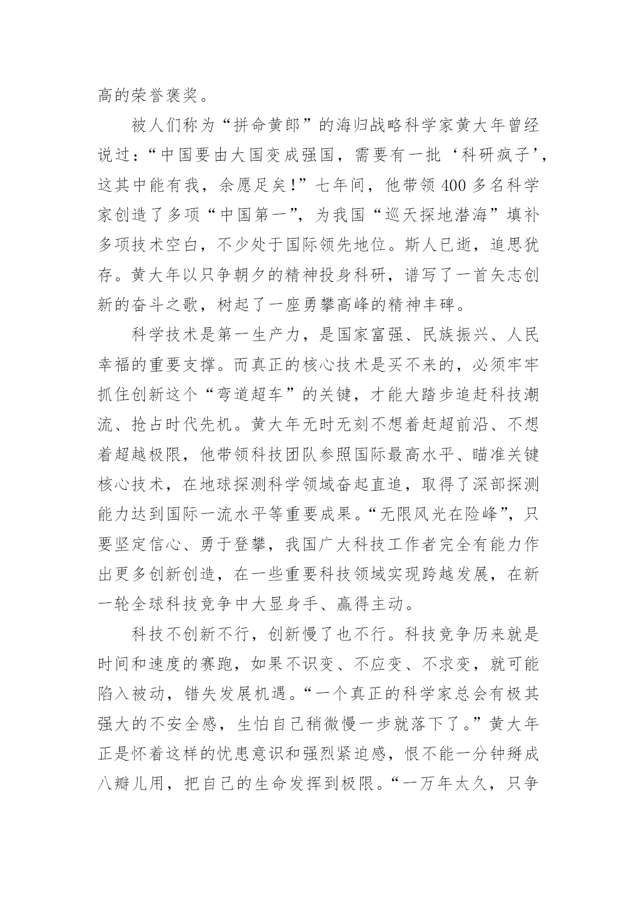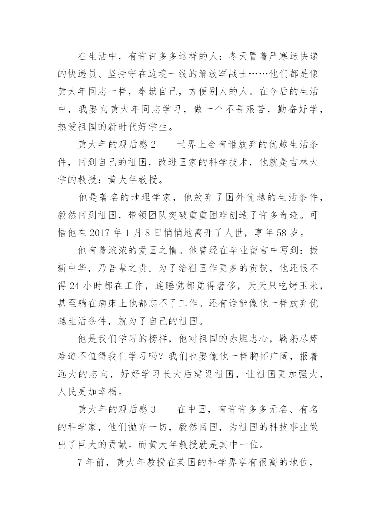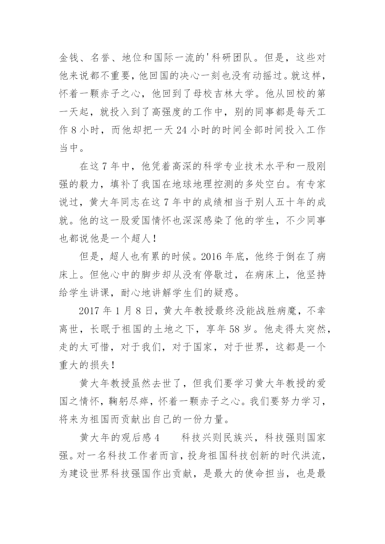 黄大年的观后感2021关于黄大年的观后感范文品味完一部作品后,相信你会有不少感想吧,需要写一篇观后感好好地作记录了。但是观后感有什么要求呢?以下是小编精心整理的2021关于黄大年的观后感范文,欢迎大家借鉴与参考,希望对大家有所帮助。黄大年的观后感1有多少人可以放弃优越的条件,来到穷苦地方艰苦奋斗?有多少人可以不畏艰难,恨不得一天都在工作,连睡觉都觉得奢侈,连煮饭都觉得浪费时间?他,就是吉林大学教授,一位以生命来教导学生的战士:黄大年。黄大年是享誉世界的地球物理学专家,2009年,他放弃国外优越条件,怀着一腔爱国热血,毅然回到祖国。担任母校吉林大学地球探测学教授,博士生导师。他在工作上与时间赛跑,一刻也不停歇,带领团队攻克难关,创造了一个又一个的重大突破,为国家创造了一个又一个世界性的奇迹。而然就是这样一个伟人,却得了癌症,但这也没有阻挡他工作的脚步。2017年1月8日,黄大年因病去世。这件事情给我的感触很深:在国外优越的条件下,还能想着处于水深火热之中的祖国,有多少人能做到?而黄大年同志,放弃国外优越条件,回来祖国做出伟大贡献,难道这种精神不值得我们学习吗?他带病坚持工作,创造了一个又一个奇迹,这种精神值得我们学习。在生活中,有许许多多这样的人:冬天冒着严寒送快递的快递员、坚持守在边境一线的解放军战士……他们都是像黄大年同志一样,奉献自己,方便别人的人。在今后的生活中,我要向黄大年同志学习,做一个不畏艰苦,勤奋好学,热爱祖国的新时代好学生。黄大年的观后感2世界上会有谁放弃的优越生活条件,回到自己的祖国,改进国家的科学技术,他就是吉林大学的教授:黄大年教授。他是著名的地理学家,他放弃了国外优越的生活条件,毅然回到祖国,带领团队突破重重困难创造了许多奇迹。可惜他在2017年1月8日悄悄地离开了人世,享年58岁。他有着浓浓的爱国之情。他曾经在毕业留言中写到:振新中华,乃吾辈之责。为了给祖国作更多的贡献,他还恨不得24小时都在工作,连睡觉都觉得奢侈,天天只吃烤玉米,甚至躺在病床上他都忘不了工作。还有谁能像他一样放弃优越生活条件,就为了自己的祖国。他是我们学习的榜样,他对祖国的赤胆忠心,鞠躬尽瘁难道不值得我们学习吗?我们也要像他一样胸怀广阔,报着远大的志向,好好学习长大后建设祖国,让祖国更加强大,人民更加幸福。黄大年的观后感3在中国,有许许多多无名、有名的科学家,他们抛弃一切,毅然回国,为祖国的科技事业做出了巨大的贡献。而黄大年教授就是其中一位。7年前,黄大年教授在英国的科学界享有很高的地位,金钱、名誉、地位和国际一流的'科研团队。但是,这些对他来说都不重要,他回国的决心一刻也没有动摇过。就这样,怀着一颗赤子之心,他回到了母校吉林大学。他从回校的第一天起,就投入到了高强度的工作中,别的同事都是每天工作8小时,而他却把一天24小时的时间全部时间投入工作当中。在这7年中,他凭着高深的科学专业技术水平和一股刚强的毅力,填补了我国在地球地理控测的多处空白。有专家说过,黄大年同志在这7年中的成绩相当于别人五十年的成就。他的这一股爱国情怀也深深感染了他的学生,不少同事也都说他是一个超人!但是,超人也有累的时候。2016年底,他终于倒在了病床上。但他心中的脚步却从没有停歇过,在病床上,他坚持给学生讲课,耐心地讲解学生们的疑惑。2017年1月8日,黄大年教授最终没能战胜病魔,不幸离世,长眠于祖国的土地之下,享年58岁。他走得太突然,走的太可惜,对于我们,对于国家,对于世界,这都是一个重大的损失!黄大年教授虽然去世了,但我们要学习黄大年教授的爱国之情怀,鞠躬尽瘁,怀着一颗赤子之心。我们要努力学习,将来为祖国而贡献出自己的一份力量。黄大年的观后感4科技兴则民族兴,科技强则国家强。对一名科技工作者而言,投身祖国科技创新的时代洪流,为建设世界科技强国作出贡献,是最大的使命担当,也是最高的荣誉褒奖。被人们称为“拼命黄郎”的海归战略科学家黄大年曾经说过:“中国要由大国变成强国,需要有一批‘科研疯子’,这其中能有我,余愿足矣!”七年间,他带领400多名科学家创造了多项“中国第一”,为我国“巡天探地潜海”填补多项技术空白,不少处于国际领先地位。斯人已逝,追思犹存。黄大年以只争朝夕的精神投身科研,谱写了一首矢志创新的奋斗之歌,树起了一座勇攀高峰的精神丰碑。科学技术是第一生产力,是国家富强、民族振兴、人民幸福的重要支撑。而真正的核心技术是买不来的,必须牢牢抓住创新这个“弯道超车”的关键,才能大踏步追赶科技潮流、抢占时代先机。黄大年无时无刻不想着赶超前沿、不想着超越极限,他带领科技团队参照国际最高水平、瞄准关键核心技术,在地球探测科学领域奋起直追,取得了深部探测能力达到国际一流水平等重要成果。“无限风光在险峰”,只要坚定信心、勇于登攀,我国广大科技工作者完全有能力作出更