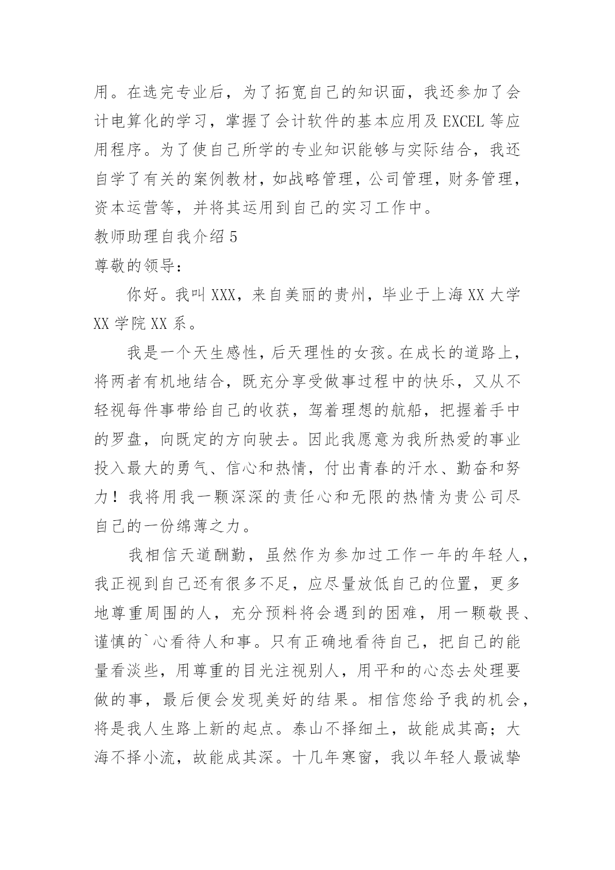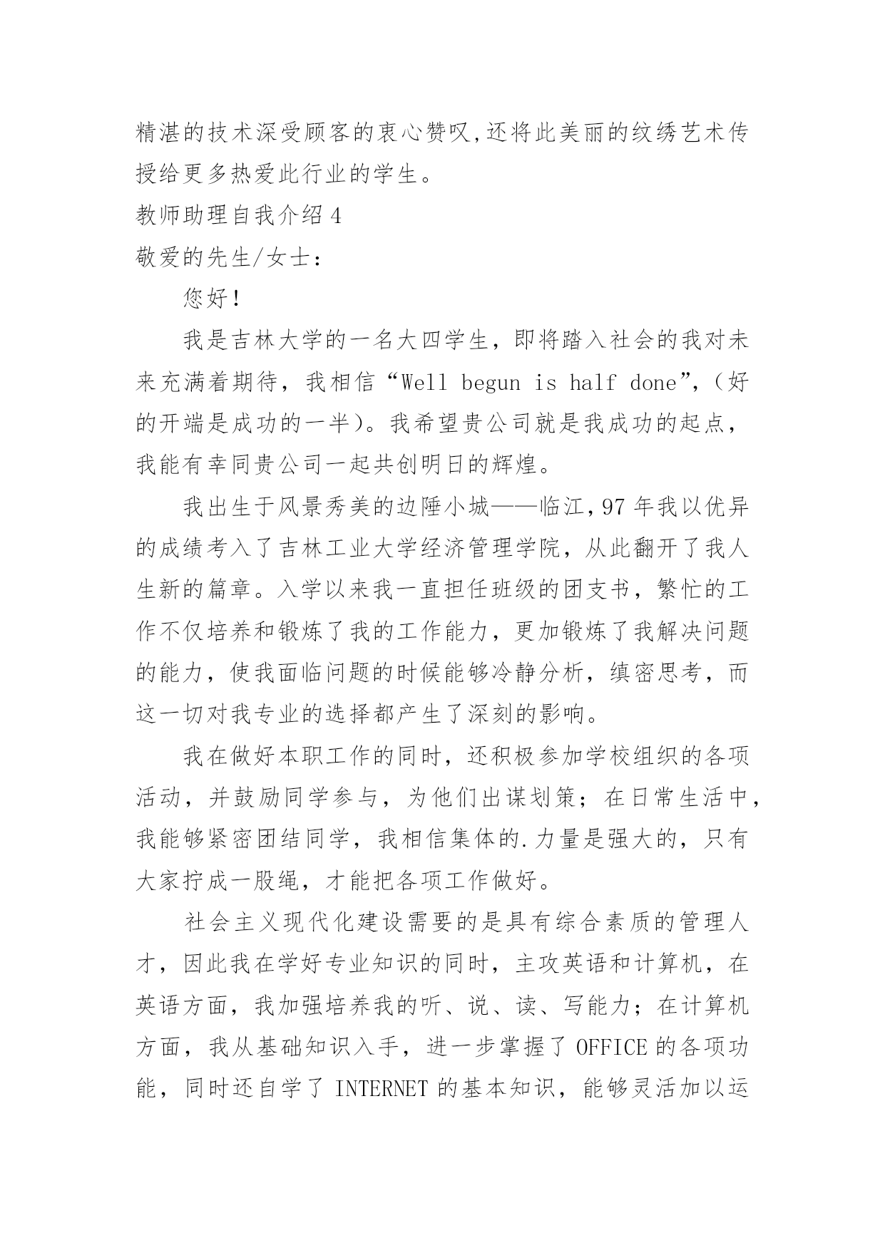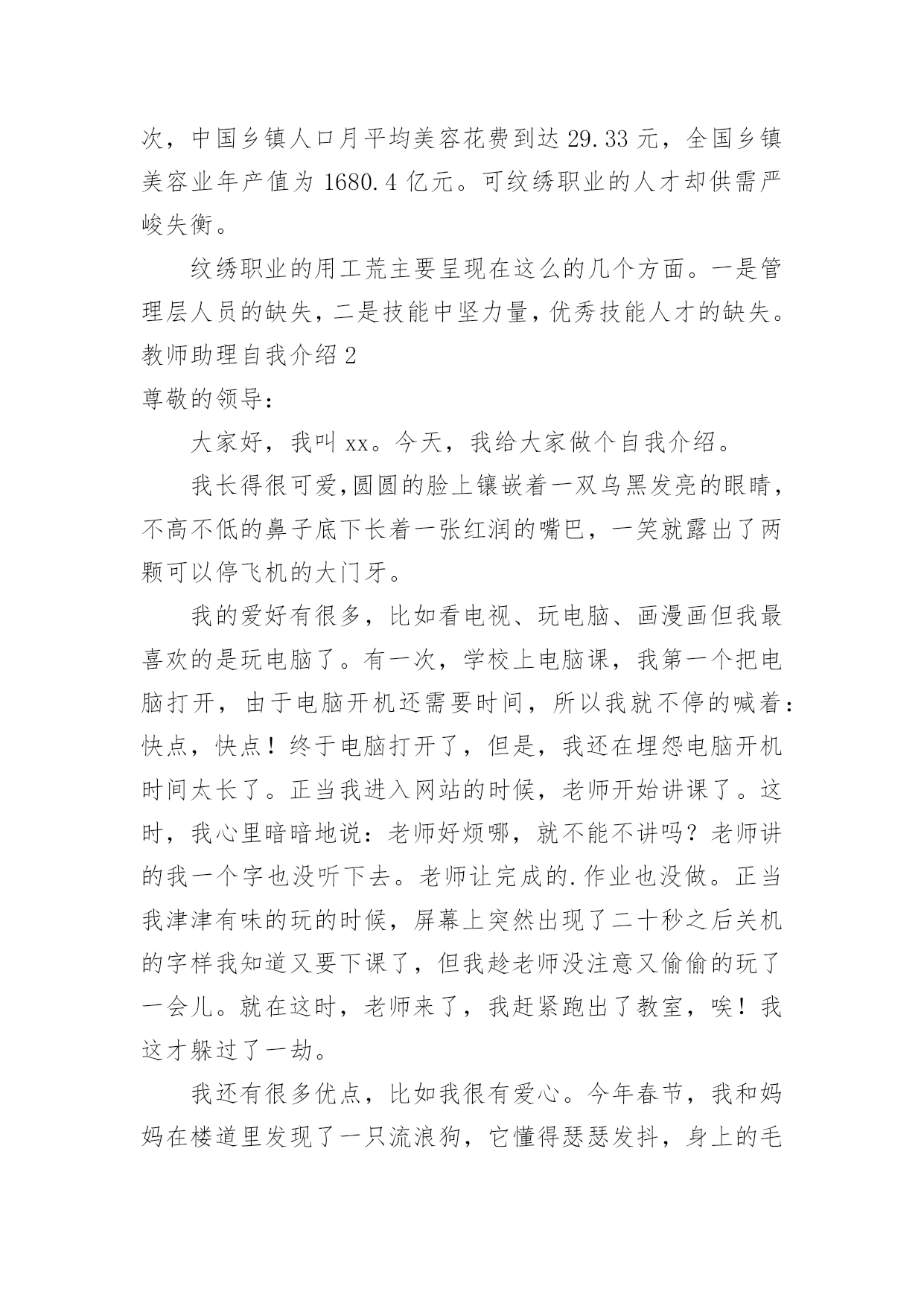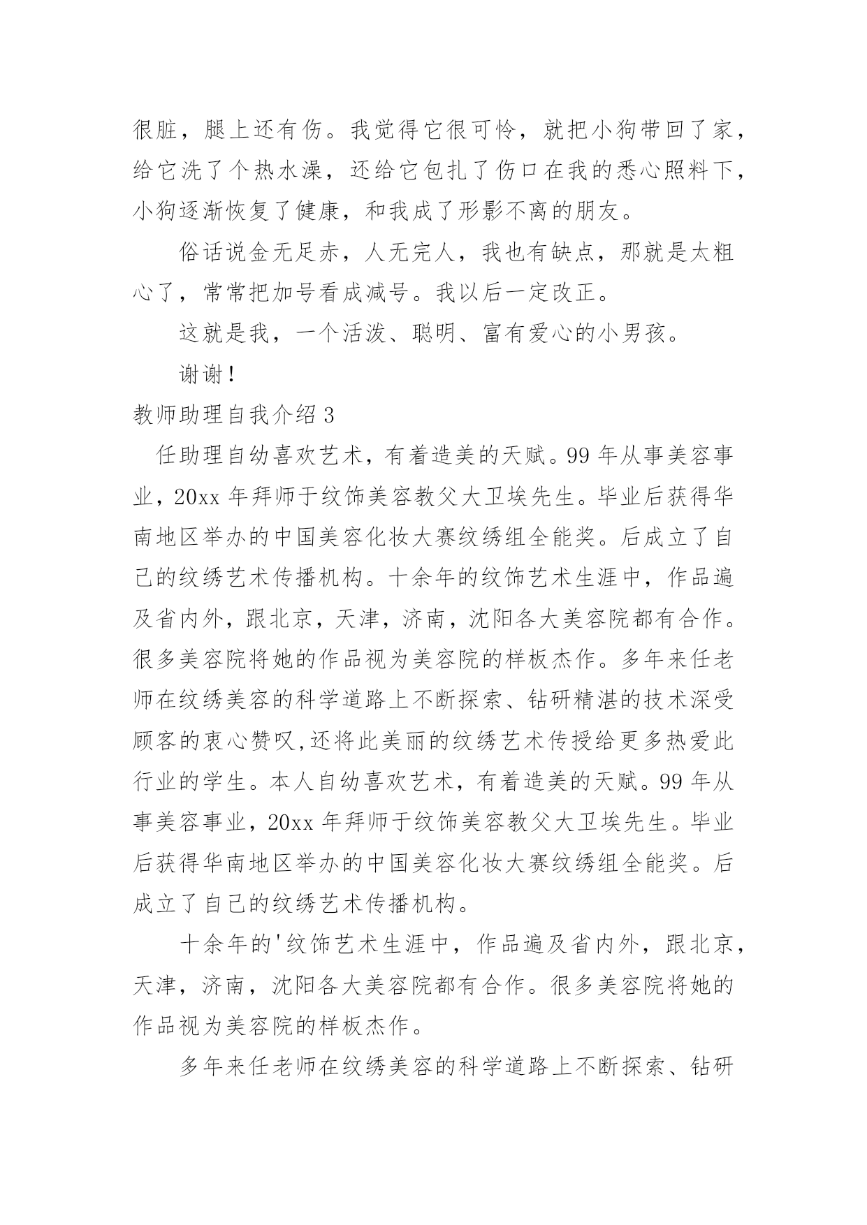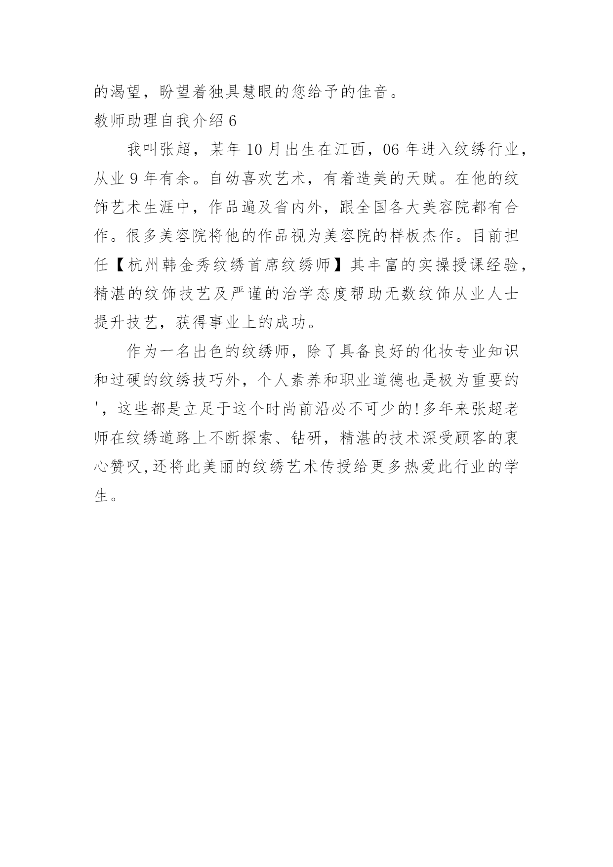 教师助理自我介绍教师助理自我介绍处在一个陌生场合时,进行自我介绍是必不可少的,自我介绍有助于自我宣传、自我展示。那么你真的会写自我介绍吗?下面是小编精心整理的教师助理自我介绍,仅供参考,希望能够帮助到大家。教师助理自我介绍1我是一名纹绣师助理,作为纹绣菜鸟要藏着操练的手稿,一开端的操练是一个枯燥无味的进程,因为过了这个时段你今后就没有心气再来练了,许多人成不了高水平即是因为耐不住这孤寂,所谓游刃有余,每个纹绣大师都必须经过的进程。在咱们画好一边眉毛的时分,可以让没有画的对照着画好的来对照,如果是前面画欠好的欠好就可以放弃掉。在这一个期间咱们要做的`是让两边眉毛对称,别的即是进步自个手感,酝酿娴熟度。许多时分对称性是得花许多时刻精力去堆积,这时不要使用任何工具,当练到凭感觉画出来就可以说根本把握了,总的来说只要打好这些根底才干成果高造就的纹绣水平。纹绣职业的用工荒主要呈现在这么的几个方面。一是管理层人员的缺失,二是技能中坚力量,优秀技能人才的缺失。近来两年,中国进入美容花费的人数现已到达3亿多人次,中国乡镇人口月平均美容花费到达29.33元,全国乡镇美容业年产值为1680.4亿元。可纹绣职业的人才却供需严峻失衡。纹绣职业的用工荒主要呈现在这么的几个方面。一是管理层人员的缺失,二是技能中坚力量,优秀技能人才的缺失。教师助理自我介绍2尊敬的领导:大家好,我叫xx。今天,我给大家做个自我介绍。我长得很可爱,圆圆的脸上镶嵌着一双乌黑发亮的眼睛,不高不低的鼻子底下长着一张红润的嘴巴,一笑就露出了两颗可以停飞机的大门牙。我的爱好有很多,比如看电视、玩电脑、画漫画但我最喜欢的是玩电脑了。有一次,学校上电脑课,我第一个把电脑打开,由于电脑开机还需要时间,所以我就不停的喊着:快点,快点!终于电脑打开了,但是,我还在埋怨电脑开机时间太长了。正当我进入网站的时候,老师开始讲课了。这时,我心里暗暗地说:老师好烦哪,就不能不讲吗?老师讲的我一个字也没听下去。老师让完成的.作业也没做。正当我津津有味的玩的时候,屏幕上突然出现了二十秒之后关机的字样我知道又要下课了,但我趁老师没注意又偷偷的玩了一会儿。就在这时,老师来了,我赶紧跑出了教室,唉!我这才躲过了一劫。我还有很多优点,比如我很有爱心。今年春节,我和妈妈在楼道里发现了一只流浪狗,它懂得瑟瑟发抖,身上的毛很脏,腿上还有伤。我觉得它很可怜,就把小狗带回了家,给它洗了个热水澡,还给它包扎了伤口在我的悉心照料下,小狗逐渐恢复了健康,和我成了形影不离的朋友。俗话说金无足赤,人无完人,我也有缺点,那就是太粗心了,常常把加号看成减号。我以后一定改正。这就是我,一个活泼、聪明、富有爱心的小男孩。谢谢!教师助理自我介绍3任助理自幼喜欢艺术,有着造美的天赋。99年从事美容事业,20xx年拜师于纹饰美容教父大卫埃先生。毕业后获得华南地区举办的中国美容化妆大赛纹绣组全能奖。后成立了自己的纹绣艺术传播机构。十余年的纹饰艺术生涯中,作品遍及省内外,跟北京,天津,济南,沈阳各大美容院都有合作。很多美容院将她的作品视为美容院的样板杰作。多年来任老师在纹绣美容的科学道路上不断探索、钻研精湛的技术深受顾客的衷心赞叹,还将此美丽的纹绣艺术传授给更多热爱此行业的学生。本人自幼喜欢艺术,有着造美的天赋。99年从事美容事业,20xx年拜师于纹饰美容教父大卫埃先生。毕业后获得华南地区举办的中国美容化妆大赛纹绣组全能奖。后成立了自己的纹绣艺术传播机构。十余年的'纹饰艺术生涯中,作品遍及省内外,跟北京,天津,济南,沈阳各大美容院都有合作。很多美容院将她的作品视为美容院的样板杰作。多年来任老师在纹绣美容的科学道路上不断探索、钻研精湛的技术深受顾客的衷心赞叹,还将此美丽的纹绣艺术传授给更多热爱此行业的学生。教师助理自我介绍4敬爱的先生/女士:您好!我是吉林大学的一名大四学生,即将踏入社会的我对未来充满着期待,我相信“Wellbegunishalfdone”,(好的开端是成功的一半)。我希望贵公司就是我成功的起点,我能有幸同贵公司一起共创明日的辉煌。我出生于风景秀美的边陲小城——临江,97年我以优异的成绩考入了吉林工业大学经济管理学院,从此翻开了我人生新的篇章。入学以来我一直担任班级的团支书,繁忙的工作不仅培养和锻炼了我的工作能力,更加锻炼了我解决问题的能力,使我面临问题的时候能够冷静分析,缜密思考,而这一切对我专业的选择都产生了深刻的影响。我在做好本职工作的同时,还积极参加学校组织的各项活动,并鼓励同学参与,为他们出谋划策;在日常生活中,我能够紧密团结同学,我相信集体的.力量是强大的,只有大家拧成一股绳,才能把各项工作做好。社会主义现代化建设需要的是具有综合素质的管理人才,因此我在学好专业知识的同时,主攻英语和计算机,在英语方面,我加强培养我的听、说、