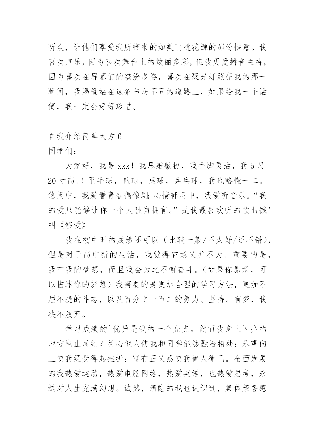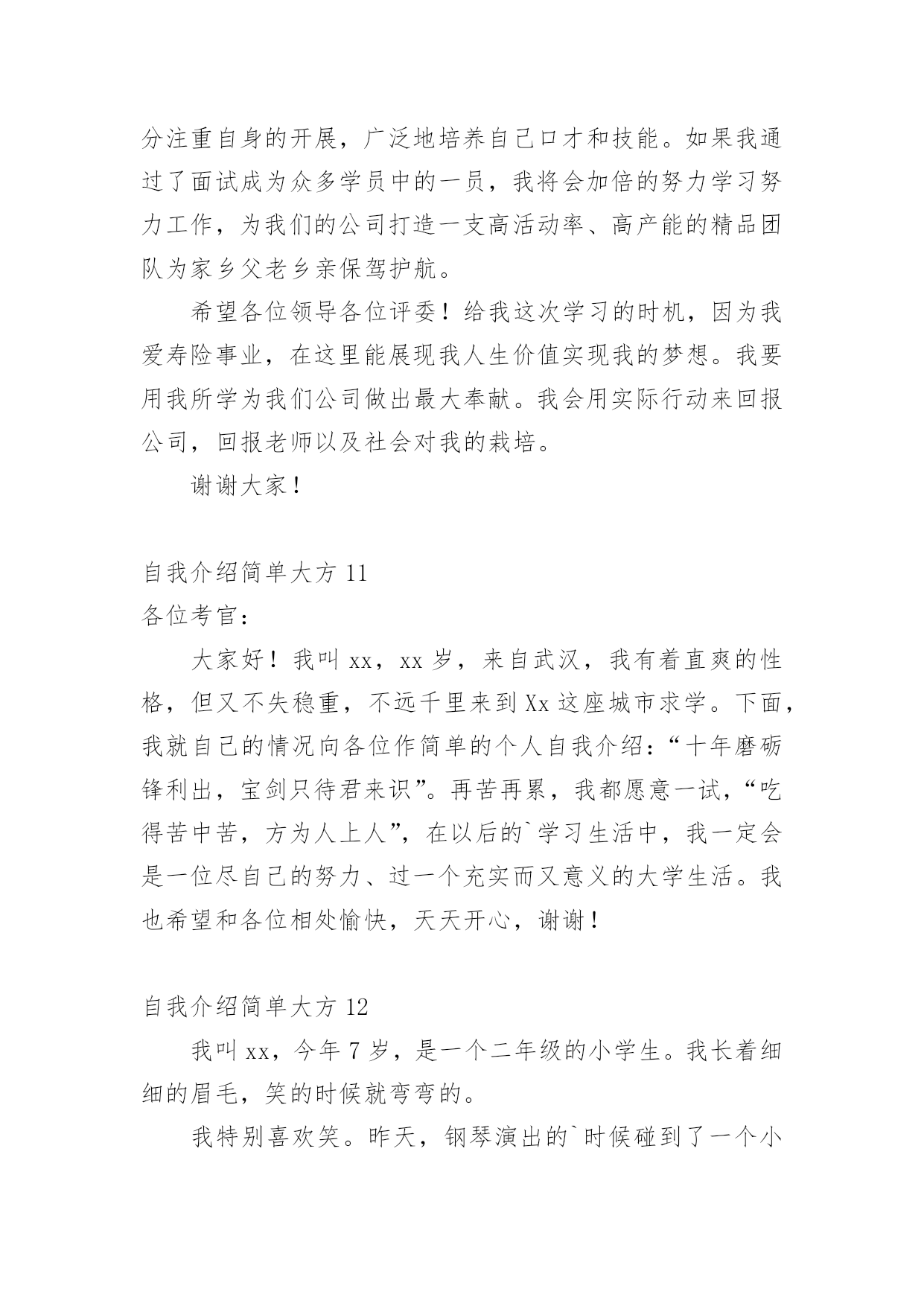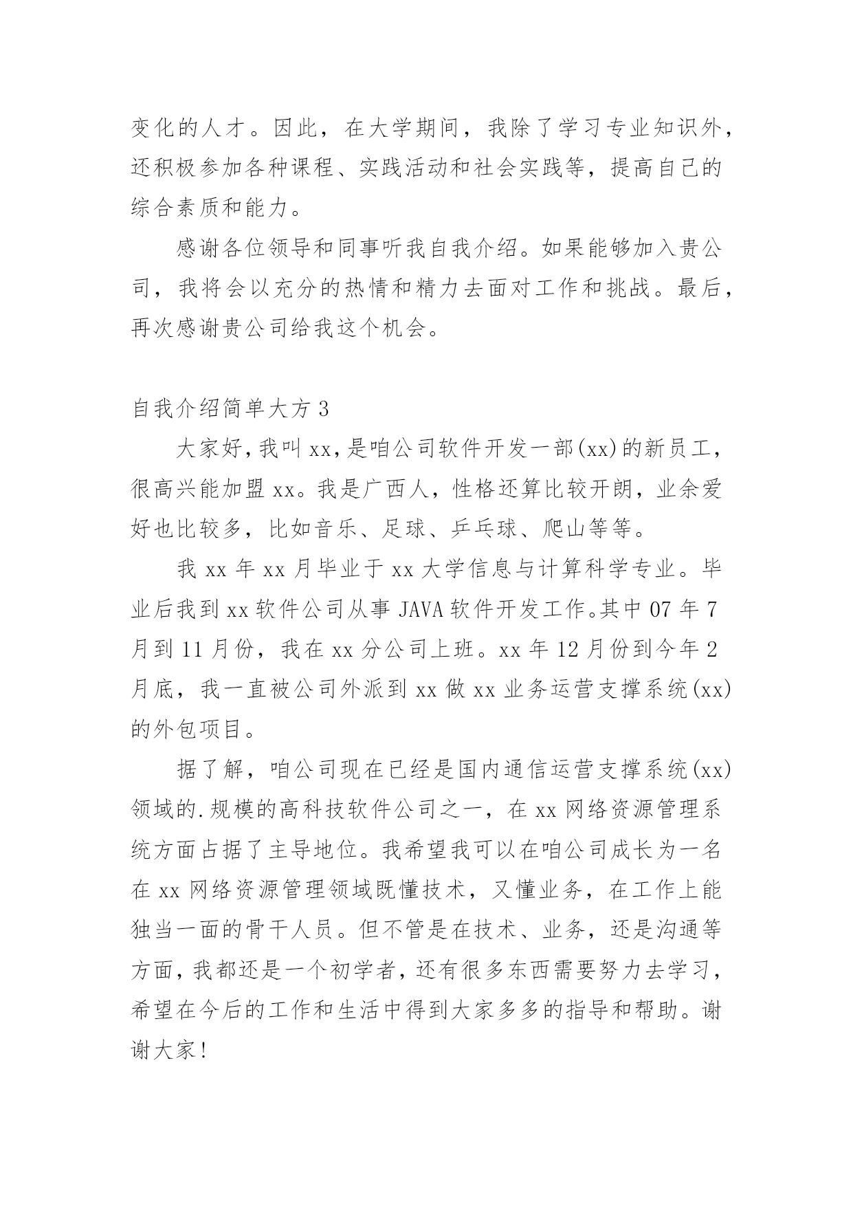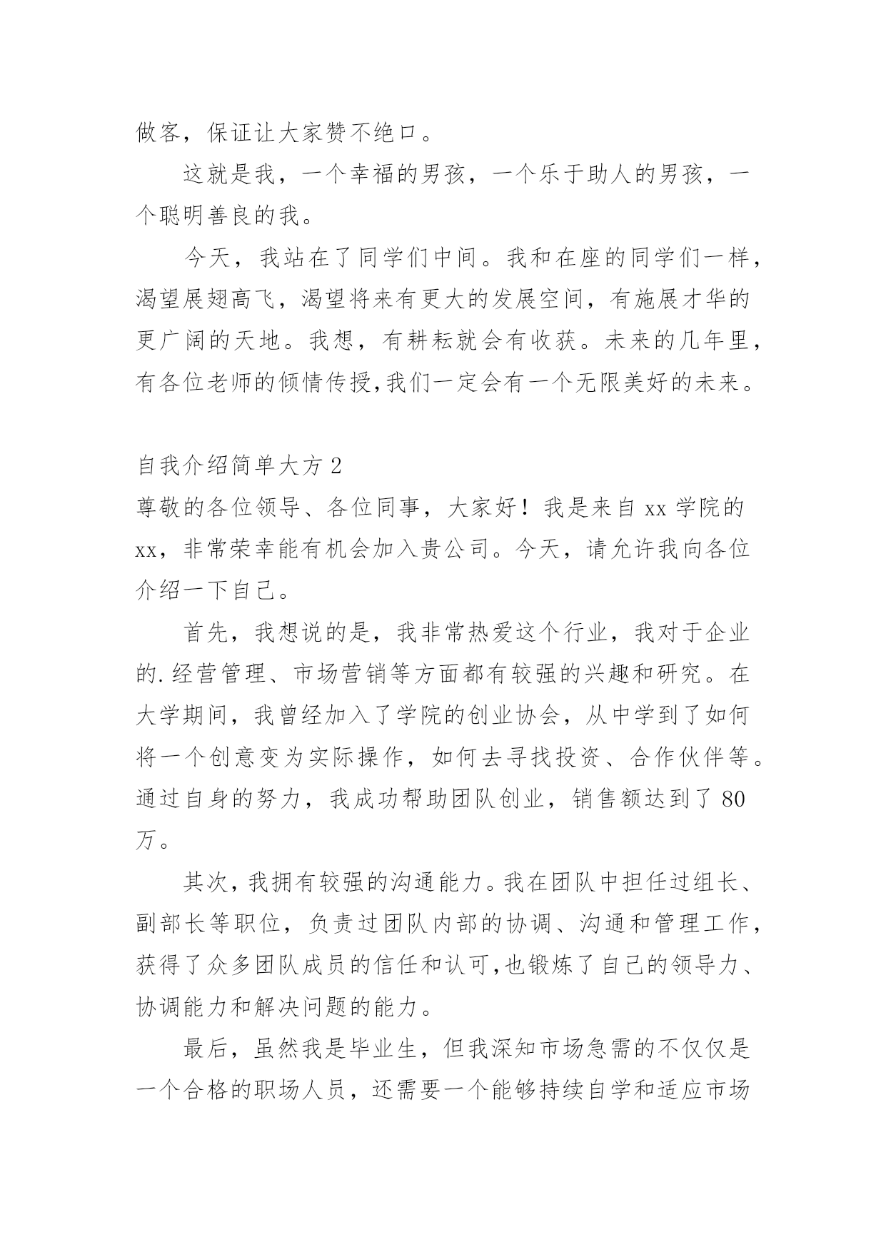 自我介绍简单大方处在一个陌生场合时,我们通常会被要求作自我介绍,自我介绍是一种认识自我的手段。那么自我介绍要注意有什么内容呢?下面是小编整理的自我介绍简单大方,希望能够帮助到大家。自我介绍简单大方1大家好!我幼年时曾作过许多色彩斑斓的梦,当个xxx是我其中之一的梦想。我有一个远大的理想,那就是我要当一名xxx,所以我还喜欢天蓝色和银白色,它代表着我要飞向天空。我身高xxx,是一个性格内向的人,所以我很喜欢读书,各种书都喜欢。有广泛爱好的我的优点是乐于助人,我这个人就是典型的热肠子,以后你们如果谁有困难,只要我能帮到你们的,尽管说,我一定在所不辞!古道热肠来称呼再合适不过了,我这个人很好相处,你们会慢慢了解我的。呵呵。我呢,最喜欢冬天,没有什么特别的原因,秋太过于伤感,夏太过于热情,而春天却太过于温和,冬再好不过了,介于四者之间,可以使人冷静,使人回味。我最喜欢冬天的`傲梅,顽强不屈的品质是我学习的目标,我最喜欢雪花的坚持,为达目的地勇往直前。对了,我最喜欢吃的食物是我妈妈做的,她的手艺非常好,做的食物让我食胃大开,口齿留香,欢迎大家到我家来做客,保证让大家赞不绝口。这就是我,一个幸福的男孩,一个乐于助人的男孩,一个聪明善良的我。今天,我站在了同学们中间。我和在座的同学们一样,渴望展翅高飞,渴望将来有更大的发展空间,有施展才华的更广阔的天地。我想,有耕耘就会有收获。未来的几年里,有各位老师的倾情传授,我们一定会有一个无限美好的未来。自我介绍简单大方2尊敬的各位领导、各位同事,大家好!我是来自xx学院的xx,非常荣幸能有机会加入贵公司。今天,请允许我向各位介绍一下自己。首先,我想说的是,我非常热爱这个行业,我对于企业的.经营管理、市场营销等方面都有较强的兴趣和研究。在大学期间,我曾经加入了学院的创业协会,从中学到了如何将一个创意变为实际操作,如何去寻找投资、合作伙伴等。通过自身的努力,我成功帮助团队创业,销售额达到了80万。其次,我拥有较强的沟通能力。我在团队中担任过组长、副部长等职位,负责过团队内部的协调、沟通和管理工作,获得了众多团队成员的信任和认可,也锻炼了自己的领导力、协调能力和解决问题的能力。最后,虽然我是毕业生,但我深知市场急需的不仅仅是一个合格的职场人员,还需要一个能够持续自学和适应市场变化的人才。因此,在大学期间,我除了学习专业知识外,还积极参加各种课程、实践活动和社会实践等,提高自己的综合素质和能力。感谢各位领导和同事听我自我介绍。如果能够加入贵公司,我将会以充分的热情和精力去面对工作和挑战。最后,再次感谢贵公司给我这个机会。自我介绍简单大方3大家好,我叫xx,是咱公司软件开发一部(xx)的新员工,很高兴能加盟xx。我是广西人,性格还算比较开朗,业余爱好也比较多,比如音乐、足球、乒乓球、爬山等等。我xx年xx月毕业于xx大学信息与计算科学专业。毕业后我到xx软件公司从事JAVA软件开发工作。其中07年7月到11月份,我在xx分公司上班。xx年12月份到今年2月底,我一直被公司外派到xx做xx业务运营支撑系统(xx)的外包项目。据了解,咱公司现在已经是国内通信运营支撑系统(xx)领域的.规模的高科技软件公司之一,在xx网络资源管理系统方面占据了主导地位。我希望我可以在咱公司成长为一名在xx网络资源管理领域既懂技术,又懂业务,在工作上能独当一面的骨干人员。但不管是在技术、业务,还是沟通等方面,我都还是一个初学者,还有很多东西需要努力去学习,希望在今后的工作和生活中得到大家多多的指导和帮助。谢谢大家!自我介绍简单大方4我叫xxxxxx,今年xxxxxx岁,刚上xxxxxx,小学生演讲自我介绍。我个子中等,身高xxxxxx长脸短鼻子,手大脚也大,一双眼睛不大也不小,眼珠子特别有神,一张大嘴巴特别能说,只要一说起来,说上一个小时也没问题,个子不高不矮,身体不胖不瘦。总的来说还是比较帅的。我在xxxxxx上学,我们的校服不好看,全是xxxxxx,所以特别好认,一看就是xxxxxx学生。我的优点就是爱动,每天早上我都到外面锻炼,跑跑步,玩玩单杠等,所以,我在学校的体育特别好,我的学习也是不可质疑的,数学考试从来没下过90分,我的英语也不错。所以,我的脸上总是洋溢者喜悦的表情。我的.缺点就是不会打篮球,也不知到是怎么一回事,就是不喜欢,而且,我上课还总走神,不注意听讲。所以,老师叫我后,我还满有信心的站起来,百分之八十都是对的,害的老师又气又笑。这就是我,只要一见到我,我总是笑,我会热情的和你打招呼,来吧!自我介绍简单大方5大家好,我叫**,来自诗情画意的常德,虽然刚l8岁,却有着一颗成熟的心,我渴望用我独特的声音征服所有的'听众,让他们享受我所带来的如美丽桃花源的那份惬意。我喜欢声乐,因为喜欢舞台上的炫丽多彩,但我更爱播音