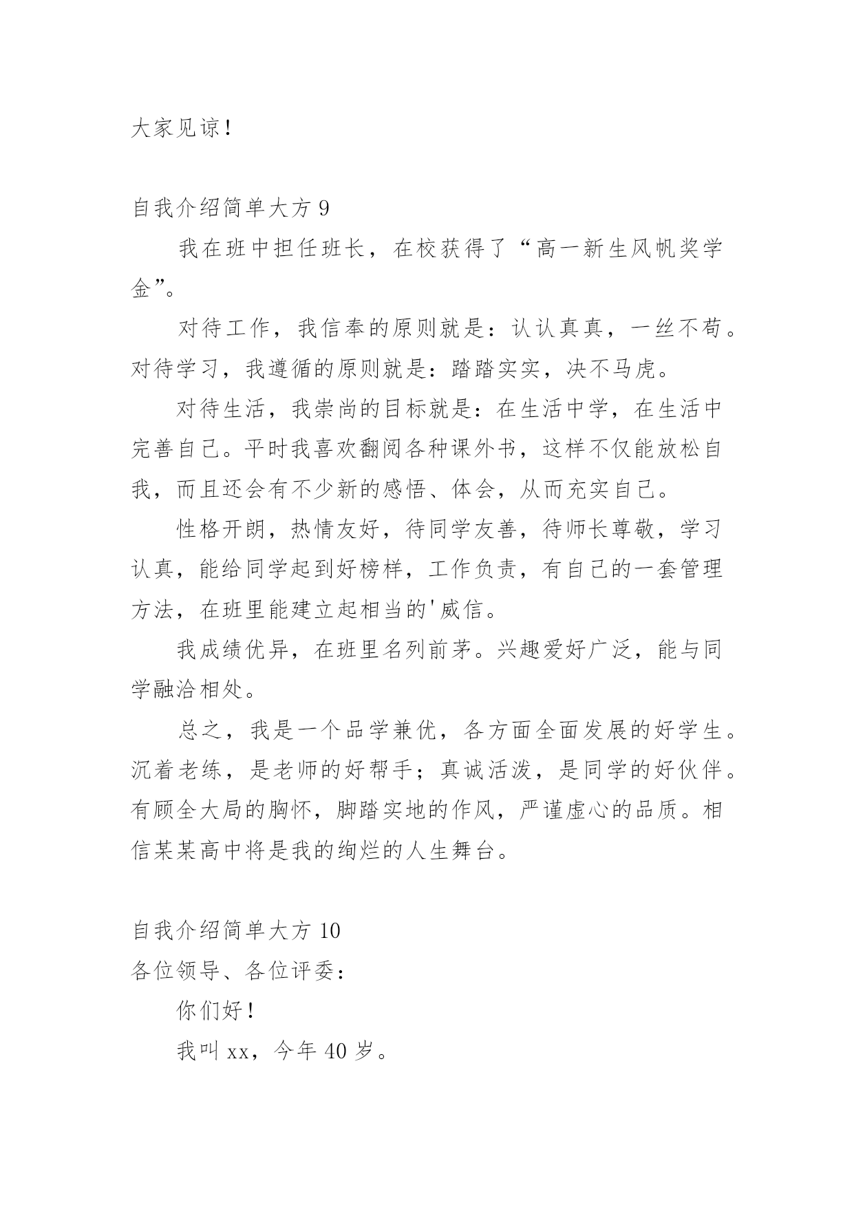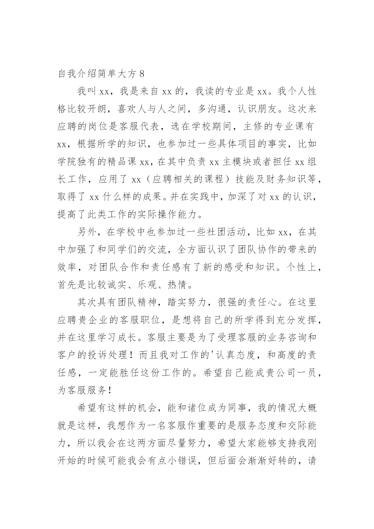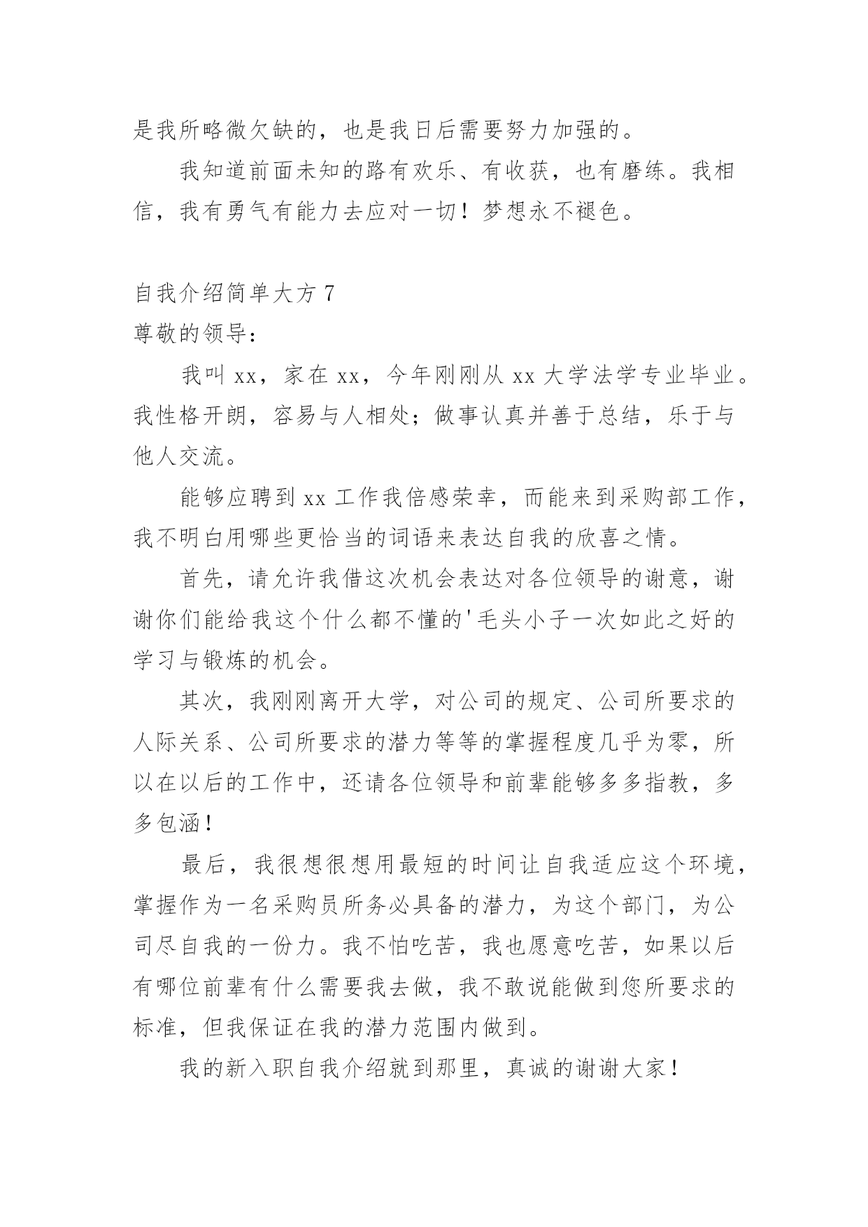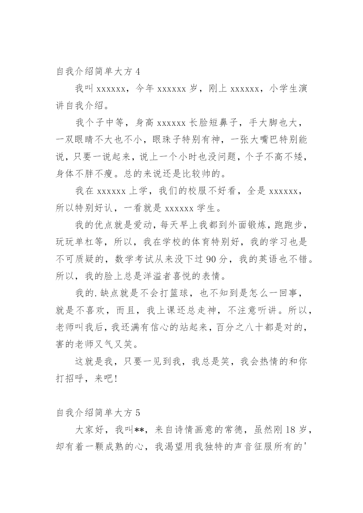 自我介绍简单大方处在一个陌生场合时,我们通常会被要求作自我介绍,自我介绍是一种认识自我的手段。那么自我介绍要注意有什么内容呢?下面是小编整理的自我介绍简单大方,希望能够帮助到大家。自我介绍简单大方1大家好!我幼年时曾作过许多色彩斑斓的梦,当个xxx是我其中之一的梦想。我有一个远大的理想,那就是我要当一名xxx,所以我还喜欢天蓝色和银白色,它代表着我要飞向天空。我身高xxx,是一个性格内向的人,所以我很喜欢读书,各种书都喜欢。有广泛爱好的我的优点是乐于助人,我这个人就是典型的热肠子,以后你们如果谁有困难,只要我能帮到你们的,尽管说,我一定在所不辞!古道热肠来称呼再合适不过了,我这个人很好相处,你们会慢慢了解我的。呵呵。我呢,最喜欢冬天,没有什么特别的原因,秋太过于伤感,夏太过于热情,而春天却太过于温和,冬再好不过了,介于四者之间,可以使人冷静,使人回味。我最喜欢冬天的`傲梅,顽强不屈的品质是我学习的目标,我最喜欢雪花的坚持,为达目的地勇往直前。对了,我最喜欢吃的食物是我妈妈做的,她的手艺非常好,做的食物让我食胃大开,口齿留香,欢迎大家到我家来做客,保证让大家赞不绝口。这就是我,一个幸福的男孩,一个乐于助人的男孩,一个聪明善良的我。今天,我站在了同学们中间。我和在座的同学们一样,渴望展翅高飞,渴望将来有更大的发展空间,有施展才华的更广阔的天地。我想,有耕耘就会有收获。未来的几年里,有各位老师的倾情传授,我们一定会有一个无限美好的未来。自我介绍简单大方2尊敬的各位领导、各位同事,大家好!我是来自xx学院的xx,非常荣幸能有机会加入贵公司。今天,请允许我向各位介绍一下自己。首先,我想说的是,我非常热爱这个行业,我对于企业的.经营管理、市场营销等方面都有较强的兴趣和研究。在大学期间,我曾经加入了学院的创业协会,从中学到了如何将一个创意变为实际操作,如何去寻找投资、合作伙伴等。通过自身的努力,我成功帮助团队创业,销售额达到了80万。其次,我拥有较强的沟通能力。我在团队中担任过组长、副部长等职位,负责过团队内部的协调、沟通和管理工作,获得了众多团队成员的信任和认可,也锻炼了自己的领导力、协调能力和解决问题的能力。最后,虽然我是毕业生,但我深知市场急需的不仅仅是一个合格的职场人员,还需要一个能够持续自学和适应市场变化的人才。因此,在大学期间,我除了学习专业知识外,还积极参加各种课程、实践活动和社会实践等,提高自己的综合素质和能力。感谢各位领导和同事听我自我介绍。如果能够加入贵公司,我将会以充分的热情和精力去面对工作和挑战。最后,再次感谢贵公司给我这个机会。自我介绍简单大方3大家好,我叫xx,是咱公司软件开发一部(xx)的新员工,很高兴能加盟xx。我是广西人,性格还算比较开朗,业余爱好也比较多,比如音乐、足球、乒乓球、爬山等等。我xx年xx月毕业于xx大学信息与计算科学专业。毕业后我到xx软件公司从事JAVA软件开发工作。其中07年7月到11月份,我在xx分公司上班。xx年12月份到今年2月底,我一直被公司外派到xx做xx业务运营支撑系统(xx)的外包项目。据了解,咱公司现在已经是国内通信运营支撑系统(xx)领域的.规模的高科技软件公司之一,在xx网络资源管理系统方面占据了主导地位。我希望我可以在咱公司成长为一名在xx网络资源管理领域既懂技术,又懂业务,在工作上能独当一面的骨干人员。但不管是在技术、业务,还是沟通等方面,我都还是一个初学者,还有很多东西需要努力去学习,希望在今后的工作和生活中得到大家多多的指导和帮助。谢谢大家!自我介绍简单大方4我叫xxxxxx,今年xxxxxx岁,刚上xxxxxx,小学生演讲自我介绍。我个子中等,身高xxxxxx长脸短鼻子,手大脚也大,一双眼睛不大也不小,眼珠子特别有神,一张大嘴巴特别能说,只要一说起来,说上一个小时也没问题,个子不高不矮,身体不胖不瘦。总的来说还是比较帅的。我在xxxxxx上学,我们的校服不好看,全是xxxxxx,所以特别好认,一看就是xxxxxx学生。我的优点就是爱动,每天早上我都到外面锻炼,跑跑步,玩玩单杠等,所以,我在学校的体育特别好,我的学习也是不可质疑的,数学考试从来没下过90分,我的英语也不错。所以,我的脸上总是洋溢者喜悦的表情。我的.缺点就是不会打篮球,也不知到是怎么一回事,就是不喜欢,而且,我上课还总走神,不注意听讲。所以,老师叫我后,我还满有信心的站起来,百分之八十都是对的,害的老师又气又笑。这就是我,只要一见到我,我总是笑,我会热情的和你打招呼,来吧!自我介绍简单大方5大家好,我叫**,来自诗情画意的常德,虽然刚l8岁,却有着一颗成熟的心,我渴望用我独特的声音征服所有的'听众,让他们享受我所带来的如美丽桃花源的那份惬意。我喜欢声乐,因为喜欢舞台上的炫丽多彩,但我更爱播音