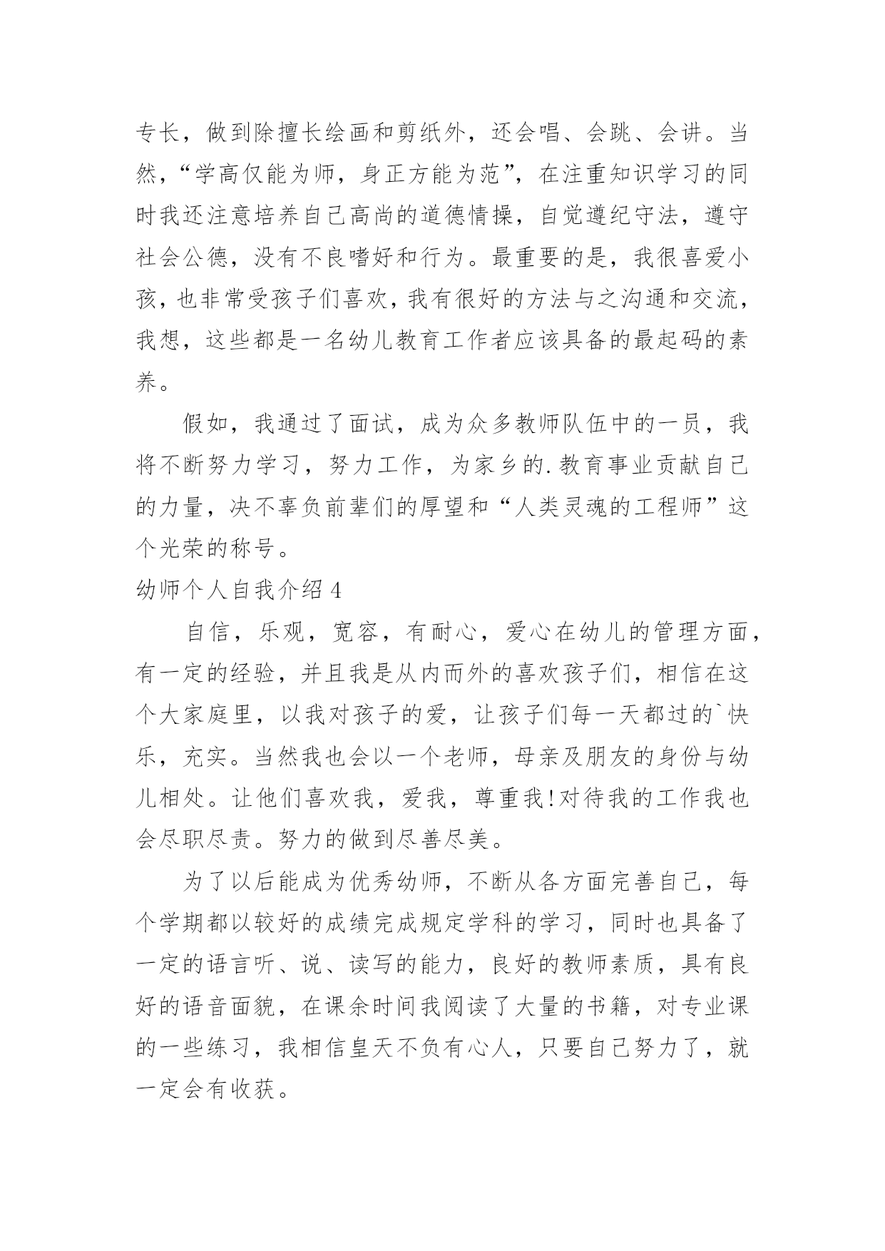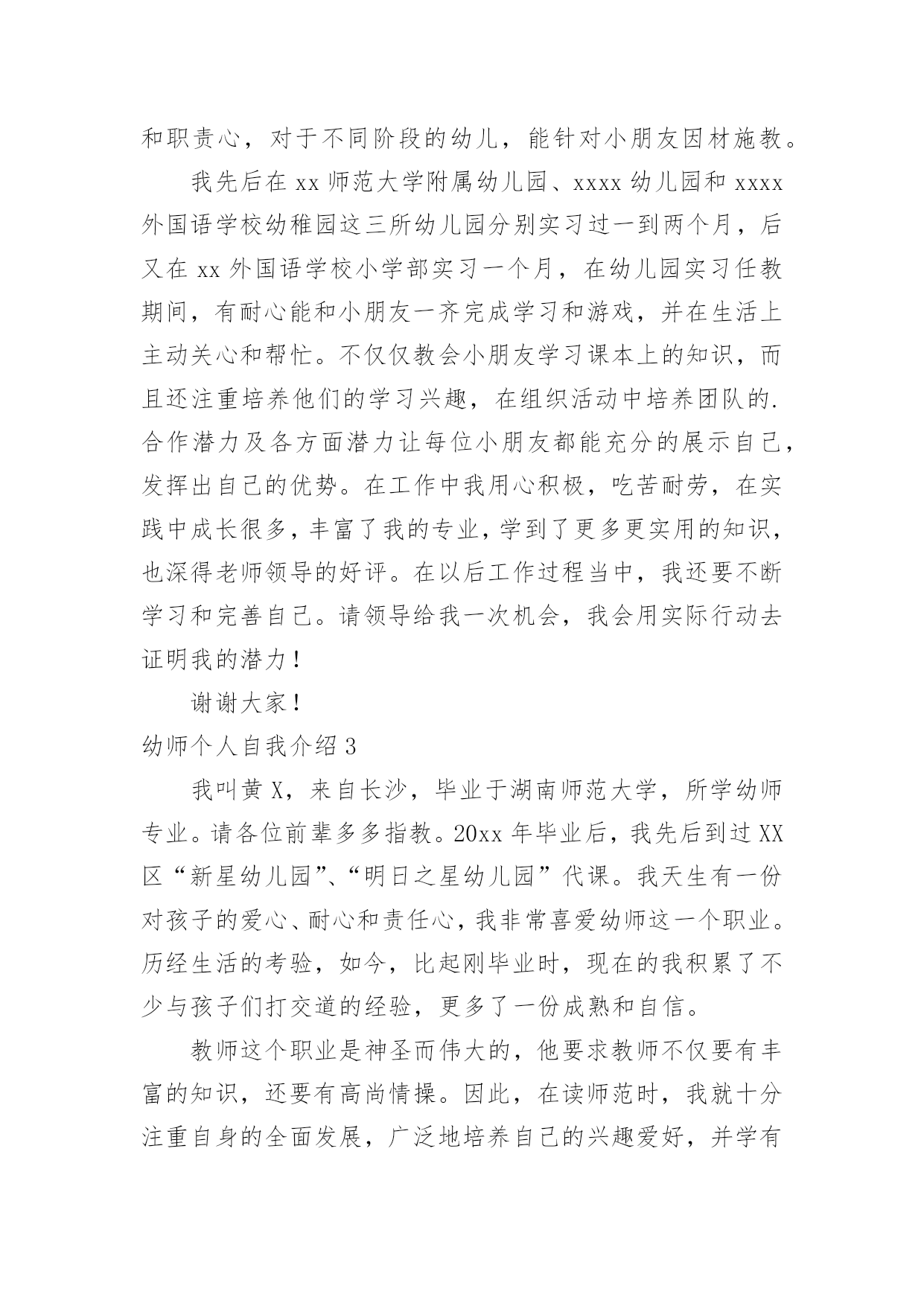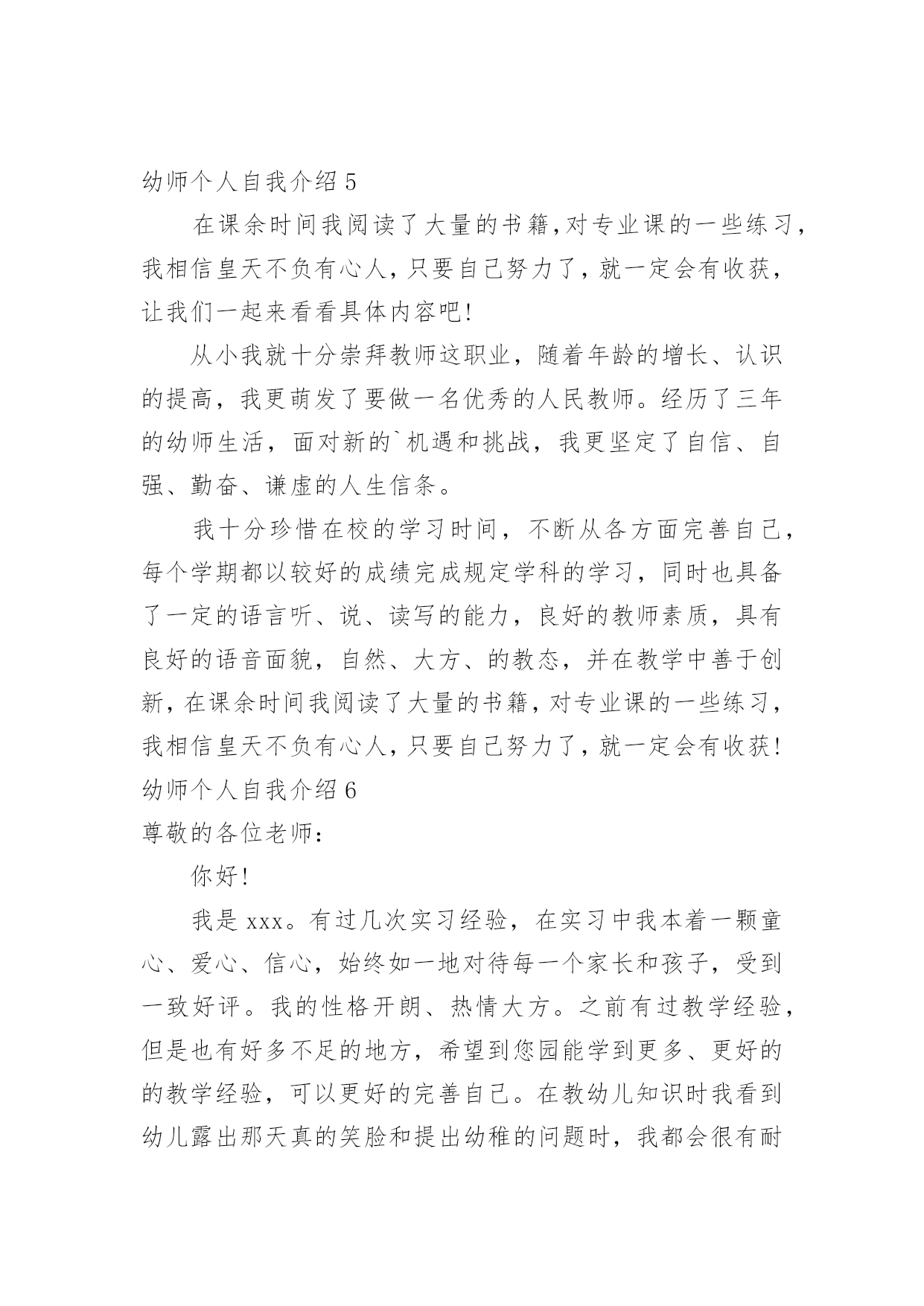 幼师个人自我介绍幼师个人自我介绍当来到一个新环境中,我们总少不了要向他人介绍自己,用自我介绍往往可以向他人介绍自己。那么我们该怎么去写自我介绍呢?下面是小编精心整理的幼师个人自我介绍,希望对大家有所帮助。幼师个人自我介绍1本人毕业于xx师范学院幼师专业,今年21岁,有爱心和责任心,对于不同阶段的幼儿,能针对小朋友因材施教。我先后在xx附属幼儿园、xx幼儿园和xx国际幼稚园这三所幼儿园分别实习过一到两个月,在幼儿园实习任教期间,有耐心能和小朋友一起完成学习和游戏,并在生活上主动关心和帮助。不仅教会小朋友学习课本上的知识,而且还注重培养他们的学习兴趣,在组织活动中培养团队的合作能力及各方面能力让每位小朋友都能充分的展示自己,发挥出自己的优势。在工作中我积极进取,吃苦耐劳,在实践中成长很多,丰富了我的专业,学到了更多更实用的'知识,也深得老师领导的好评。在以后工作过程中,我还要不断学习和完善自己。请领导给我一次机会,我会用实际行动去证明我的能力!幼师个人自我介绍2本人毕业于x师范学院幼师专业,今年22岁,有爱心和职责心,对于不同阶段的幼儿,能针对小朋友因材施教。我先后在xx师范大学附属幼儿园、xxxx幼儿园和xxxx外国语学校幼稚园这三所幼儿园分别实习过一到两个月,后又在xx外国语学校小学部实习一个月,在幼儿园实习任教期间,有耐心能和小朋友一齐完成学习和游戏,并在生活上主动关心和帮忙。不仅仅教会小朋友学习课本上的知识,而且还注重培养他们的学习兴趣,在组织活动中培养团队的.合作潜力及各方面潜力让每位小朋友都能充分的展示自己,发挥出自己的优势。在工作中我用心积极,吃苦耐劳,在实践中成长很多,丰富了我的专业,学到了更多更实用的知识,也深得老师领导的好评。在以后工作过程当中,我还要不断学习和完善自己。请领导给我一次机会,我会用实际行动去证明我的潜力!谢谢大家!幼师个人自我介绍3我叫黄X,来自长沙,毕业于湖南师范大学,所学幼师专业。请各位前辈多多指教。20xx年毕业后,我先后到过XX区“新星幼儿园”、“明日之星幼儿园”代课。我天生有一份对孩子的爱心、耐心和责任心,我非常喜爱幼师这一个职业。历经生活的考验,如今,比起刚毕业时,现在的我积累了不少与孩子们打交道的经验,更多了一份成熟和自信。教师这个职业是神圣而伟大的,他要求教师不仅要有丰富的知识,还要有高尚情操。因此,在读师范时,我就十分注重自身的全面发展,广泛地培养自己的兴趣爱好,并学有专长,做到除擅长绘画和剪纸外,还会唱、会跳、会讲。当然,“学高仅能为师,身正方能为范”,在注重知识学习的同时我还注意培养自己高尚的道德情操,自觉遵纪守法,遵守社会公德,没有不良嗜好和行为。最重要的是,我很喜爱小孩,也非常受孩子们喜欢,我有很好的方法与之沟通和交流,我想,这些都是一名幼儿教育工作者应该具备的最起码的素养。假如,我通过了面试,成为众多教师队伍中的一员,我将不断努力学习,努力工作,为家乡的.教育事业贡献自己的力量,决不辜负前辈们的厚望和“人类灵魂的工程师”这个光荣的称号。幼师个人自我介绍4自信,乐观,宽容,有耐心,爱心在幼儿的管理方面,有一定的经验,并且我是从内而外的喜欢孩子们,相信在这个大家庭里,以我对孩子的爱,让孩子们每一天都过的`快乐,充实。当然我也会以一个老师,母亲及朋友的身份与幼儿相处。让他们喜欢我,爱我,尊重我!对待我的工作我也会尽职尽责。努力的做到尽善尽美。为了以后能成为优秀幼师,不断从各方面完善自己,每个学期都以较好的成绩完成规定学科的学习,同时也具备了一定的语言听、说、读写的能力,良好的教师素质,具有良好的语音面貌,在课余时间我阅读了大量的书籍,对专业课的一些练习,我相信皇天不负有心人,只要自己努力了,就一定会有收获。幼师个人自我介绍5在课余时间我阅读了大量的书籍,对专业课的一些练习,我相信皇天不负有心人,只要自己努力了,就一定会有收获,让我们一起来看看具体内容吧!从小我就十分崇拜教师这职业,随着年龄的增长、认识的提高,我更萌发了要做一名优秀的人民教师。经历了三年的幼师生活,面对新的`机遇和挑战,我更坚定了自信、自强、勤奋、谦虚的人生信条。我十分珍惜在校的学习时间,不断从各方面完善自己,每个学期都以较好的成绩完成规定学科的学习,同时也具备了一定的语言听、说、读写的能力,良好的教师素质,具有良好的语音面貌,自然、大方、的教态,并在教学中善于创新,在课余时间我阅读了大量的书籍,对专业课的一些练习,我相信皇天不负有心人,只要自己努力了,就一定会有收获!幼师个人自我介绍6尊敬的各位老师:你好!我是xxx。有过几次实习经验,在实习中我本着一颗童心、爱心、信心,始终如一地对待每一个家长和孩子,受到一致好评。我的性格开朗、热情大方。之前有过教学经验,但是也有好多不足的地方,希望到您园能学到更多、