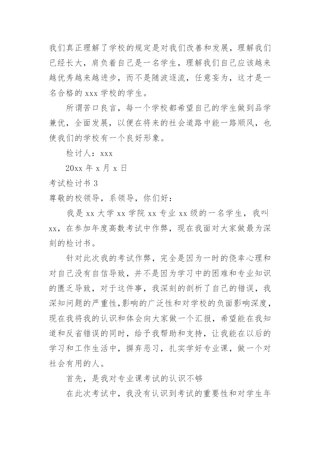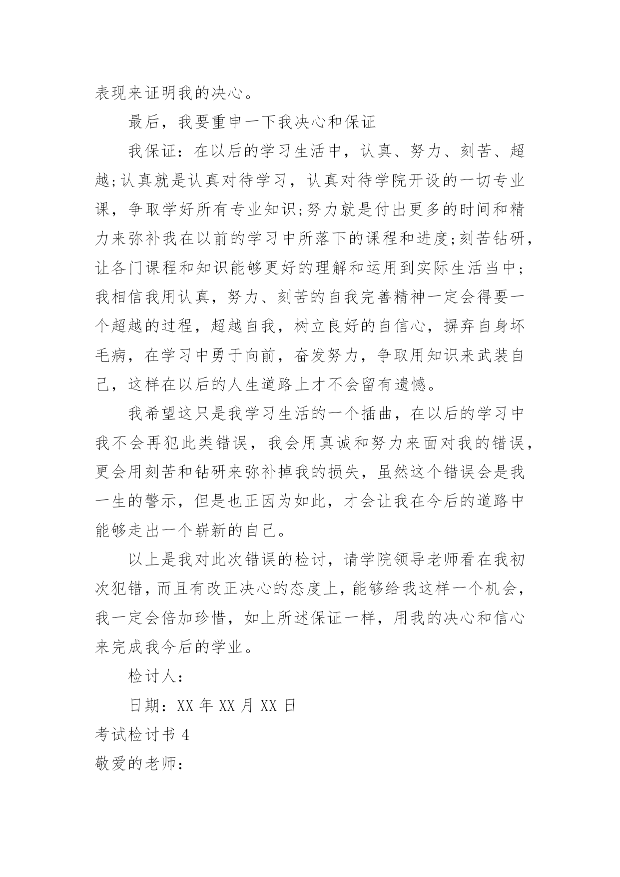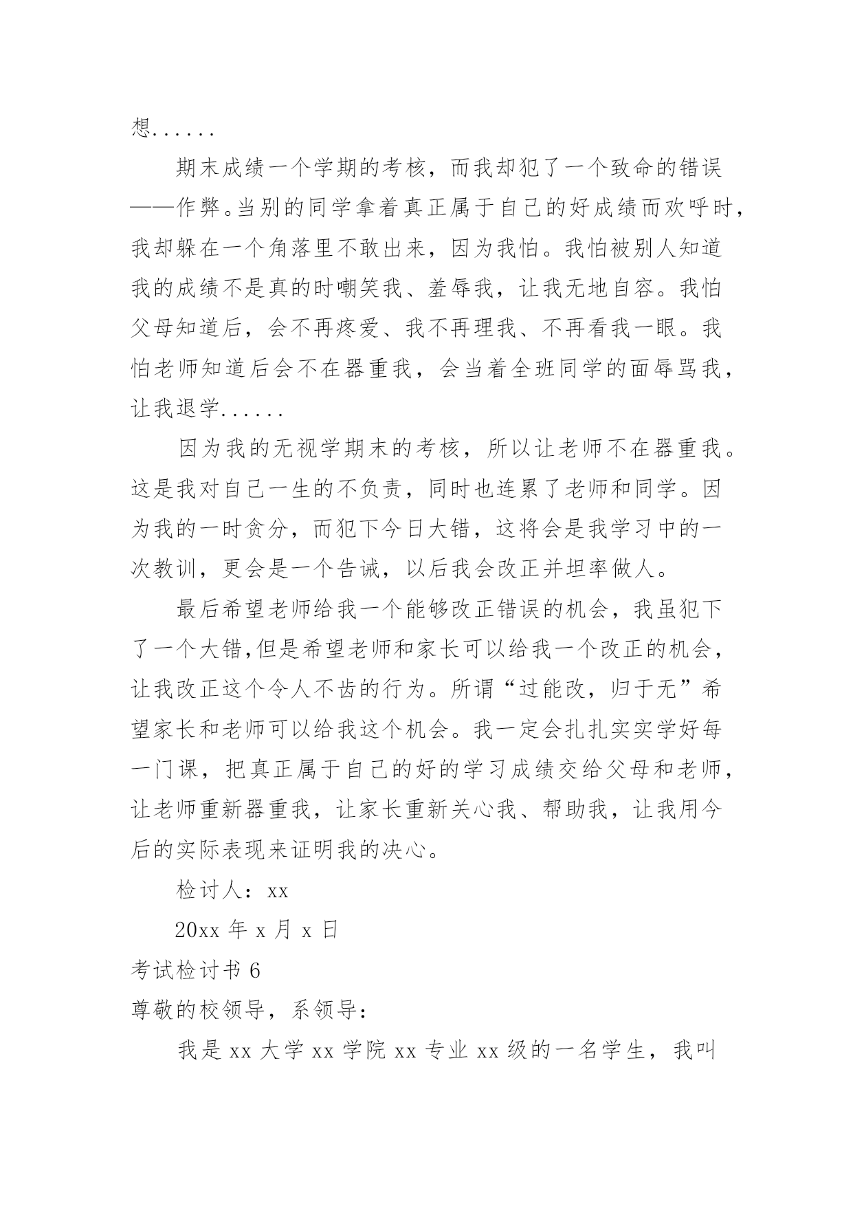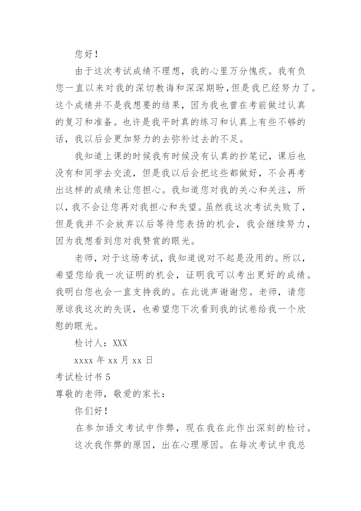 考试检讨书考试检讨书在学习、工作或生活中出现了过错后,为了表明自己悔改的决心,我们通常要用检讨书来悔过自新,我们在写检讨书的时候要注意语言的得体性。那么问题来了,到底应如何写检讨书呢?下面是小编为大家收集的考试检讨书,仅供参考,大家一起来看看吧。考试检讨书1尊敬的老师:您好!期末考试结束了,成绩也经过老师的认真批改出来了,当我看到自己的成绩,那触目惊心的排名,感到非常的失落,老师您对我的期望挺高的,但我却让您失望了,对不起。骄傲使人自满是的,我被期中的成绩蒙蔽了双眼,在期中考试获得了好成绩后就对自己放松了,对自己的要求也降低了,没有以往的那种拼搏精神,也没有了以前的刻苦。期末考试检验了我这段时间的情况,让我从那不可一世的傲慢中苏醒,让我从堕落中抬头,奋进。失败不可怕,可怕的是一次跌倒,永远都爬不起来,顺境让我一路高歌,没有遇到过挫折,也使我慢慢变了,变得没有以前纯粹。老师虽然这次我成绩倒退了但这次的考试也给我敲响了钟声,我向您道歉,我辜负了您的辛苦培养,没能用好成绩报答您,怨天时运不济,怨老师教的不好?那都是借口,为自己开脱的借口,您多次教导我,任何事情都要多方面考虑,尤其是从自身考虑,因为很多时候我们忽视的往往就是自己。从自身出发我认真思考了我这段时间的学习状况,在学习上,虽然认真的听老师讲课,但会时不时走神,会在课下和同学说话,这是我学习不到位的原因之一,课堂的每一次讲授,每一分钟都是宝贵的,一旦开小差就会让我不知不觉落下功课,作业我有些应付差事,不懂得问题并没有及时解决,虽然能做出答案但是题型变了不会灵活运用没有深入的研究和向老师请教也是使得我这次失败的原因。态度没有以前那么良好,有些傲慢,有些手高眼低,也变得懒惰,不在愿意去拼搏,想多玩会给自己放宽限制。这是我考试退步的主要原因。遇到问题就要解决问题,学习要认真,课堂上学好做好,课后保证作业质量,有问题及时问,改正骄傲自满的心态,用一颗坚定的心去学习去开拓,我有这么好的学习条件就应该好好珍惜更加努力。我不会忘记这次的教训,努力去改正自身的毛病,以一个全新的姿态再次出现在您的面前,得到您的认可。坚持不懈刻苦学习不可忘,虚心好学不可弃,我让您失望了一次,但是这并不代表以后也不代表将来,我会向您证明我在这里摔倒,就一定会从这里再次爬起,从新成为您的骄傲。此致敬礼检讨人:日期:考试检讨书2尊敬的老师:在昨天的xx考试中,我与同学交换答案,然后被老师发现了,收缴了试卷。老师经常教育我们做人要诚信,不应该在考试中作弊,而我没有听从老师的教诲,考试作弊不仅让自己难堪,更让班级丢脸,让班主任丢脸。考试作弊说明我是一个不讲诚信的人,同学会从此看扁我,老师会看轻我,走上社会,人人都会看不起我,这样对自己影响实在太大了,但自己毕竟已经犯了这样的错误了,后悔也没什么用了。只有好好读书,不再犯错,希望早日找回诚信,早日得到同学们的信任,早日恳求学校的原谅,因为我真的知道错了。学校的学风规定已经进行了这么久,经过这次教训,我又对学校的良苦用心多了一些理解,作为一名学生你永远不能停止学习,永远不能自我满足,学校的学风规定不是为了为难我们学生,却是要将我们从吊儿郎当,无所谓的自以为是的思想中拉出来,而当局者迷旁观者清,我们有时候却会以为这是学校故意在为难我们,而用我们那看似冠冕堂皇实则鼠目寸光的理由去推卸我们本该自己承担的责任。只有当我们真正理解了学校的规定是对我们改善和发展,理解我们已经长大,肩负着自己是一名学生,理解我们自己应该越来越优秀越来越进步,而不是随波逐流,任意妄为,这才是一名合格的xxx学校的学生。所谓苦口良言,每一个学校都希望自己的学生做到品学兼优,全面发展,以便在将来的社会道路中能一路顺风,也使我们的学校有一个良好形象。检讨人:xxx20xx年x月x日考试检讨书3尊敬的校领导,系领导,你们好:我是xx大学xx学院xx专业xx级的一名学生,我叫xx,在参加年度高数考试中作弊,现在我面对大家做最为深刻的检讨书。针对此次我的考试作弊,完全是因为一时的侥幸心理和对自己没有自信导致,并不是因为学习中的困难和专业知识的匮乏导致,对于这件事,我深刻的剖析了自己的错误,我深知问题的严重性,影响的广泛性和对学校的负面影响深度,现在我将我的认识和体会向大家做一个汇报,希望能在我知道和反省错误的同时,给予我帮助和支持,让我能在以后的学习和工作生活中,摒弃恶习,扎实学好专业课,做一个对社会有用的人。首先,是我对专业课考试的认识不够在此次考试中,我没有认识到考试的重要性和对学生年度知识考核的严肃性,针对考试评估,我没有端正自己的态度,采用了投机取巧的方式来应付,完全忽视了学校对学生在德治上的引导和教育,同时也辜负了在远方遥望着我学业有成的父母,对我等谆谆教诲的师长的教育,在生活中耐心帮助过我的学长和同学,