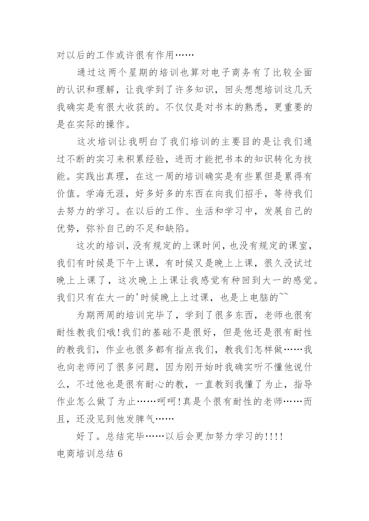 电商培训总结电商培训总结总结是对某一阶段的工作、学习或思想中的经验或情况进行分析研究的书面材料,他能够提升我们的书面表达能力,为此我们要做好回顾,写好总结。你想知道总结怎么写吗?下面是小编收集整理的电商培训总结,欢迎大家分享。电商培训总结13天的杭州学习,让我对农村电商有了更进一步的理解。20xx年是农村电商初始之年,20xx将会是农村电商摸索前行的一年。我理解中的农村电商有以下几点:为什么要搞农村电商:为了解决农村买难卖难问题,提高农民收入,改善农民生活,缩短城乡差距,更好的服务农民,创新农业,让农村更美好,构建农村现代流通体系,拓展电子商务及相关配套服务在农村的服务领域和服务深度。怎么搞农村电商:原则是企业运营、政府推动、市场运作、惠及三农,通过搭建县村两级服务网络,充分发挥电子商务优势,突破物流、信息流的瓶颈,实现“网货下乡”和“农产品进城”的.双向流通功能。具体步骤:先行选定一个试点县,5-10个村服务站;重点围绕团队组建,搭建县村两级服务网络,县村本地物流配送体系的建设和运营支撑,开展代购代销,打造几个农产品特色品牌,开展原产地直供等活动,促进品牌线上活跃。在电子商务进农村发展的过程中,政府、平台、网商、供应商、服务商五个主体组成部分需求网状交织在一起,这需要一个强有力的平台保障,从政策、市场等各个方面入手,针对政府、平台、网商、供应商的不同需求、成立信阳电子商务公共服务中心,以本地化电子商务综合服务商作为驱动,带动县域电子商务生态发展,促进地方传统产业,尤其是农业及农产品加工业实现电子商务化。电商培训总结2近日,为宣传和普及“电商”知识,公司工会协调市总工会培训学校邀请“电商”资深人士对事业部中层以上管理人员进行了专题培训,经过两个多小时的讲解培训,我对电商有了初步的认识,现结合事业部实际浅谈一下:一、理念的确立电商经营理念对公司而言是在“道路客运”特别是中长途公路客运全面萎缩、企业转型过程中出现的一项“选择性”尝试,一如集团“传统客运”转型“旅游客运”的“旅游+”模式。在市场经济环境下,公司的发展顺应“大环境”,结合公司实际加入并力图在新的“营商”模式下取得“一瓢羹”,通俗的`说法就是“多种经营”。作为公司的一员,我们理应为公司的发展“建言献策”,也应为公司新经营理念的实现“增砖添瓦”,贡献自己的力量。二、“微商”框架构建的想法通过培训学习,我的理解是:电商主要靠加入平台运作、吸聚流量取胜、多种方式造势这一模式来实现利益的最大化。至于所谓“线上线下、实体、操盘、”等等都是手段而已。结合公司各业务板块实际,我认为在各方面条件尚未具备的条件下,我们主要方向是“微商”,待“势与量”具备时再做大或进入“电商”平台。具体想法是:一是利用现有场地资源,利用汽车站、换乘站等实体作为阵地,利用车辆运输优势先期对集团旗下诸如“交运啤酒、黄酒等”产品的宣介与配送;二是做好职工“人脉”资源利用,做量作势;三是搭建“微信的公众号”平台,加强信息宣传;四是精选特色产品(物品、旅游线路),适时安排上线与上架;五是坚持“用专业的人做专业的事”原则,做好电商人员的选配工作,这也是最重要的一点。电商也好,微商也罢,这只是企业发展过程中一项开拓性工作,我们要在“主业”的做大做强的道路上,多做一些“开源”性增收渠道工作,正所谓“一枝梅数朵花”!电商培训总结3在这个经济高速发展的时代,传统的购物方式、消费习惯,将会慢慢的被时代所淘汰,取而代之的是网上购物。网上购物是以后发展的趋势,然而网上购物必须依托发达的电子商务平台。电子商务是指利用计算机技术、网络技术和远程通信技术,实现整个商务过程中的电子化、数字化和网络化。人们不再是面对面的、看着实实在在的货物、靠现金进行买卖交易,而是通过网络,通过网上琳琅满目的商品信息、完善的物流配送系统和方便安全的资金结算系统进行交易。非常荣幸,能够进入学校电商培训团队,在寒假期间进行了线上培训,聆听各个学院电子商务专家的讲授,让我受益匪浅。20xx年1月12日,参加了《国家职业技能标准与职业教育专业教学标准联动开发机制》培训,主要学习了国家职业分类(主要从目的性、社会性、技术性、稳定性、规范性、群体性六个方面了解职业基本特征)、职业技能标准、专业技能标准(职业标准与专业教学标准之间,各自独立,服务于不同主体;目标指向和开发路径一致;适用对象的区别与连续;反应与被反应,是一种互动关系)以及标准联动开发探索。连续三天的培训,让我了解了电商专业职业教育发展现状,电子商务专业变成电子商务类,贯穿职业教育中高本;构建了电子商务专业中高本衔接的人才培养框架,打通了电子商务职业教育上升通道;通过老师对大量数据的分析,了解到电子商务专业体量已经很大,各类职业教育集团像成立,电子商务装也建设实践产教融合。由于国家政策导向、现实社会的需