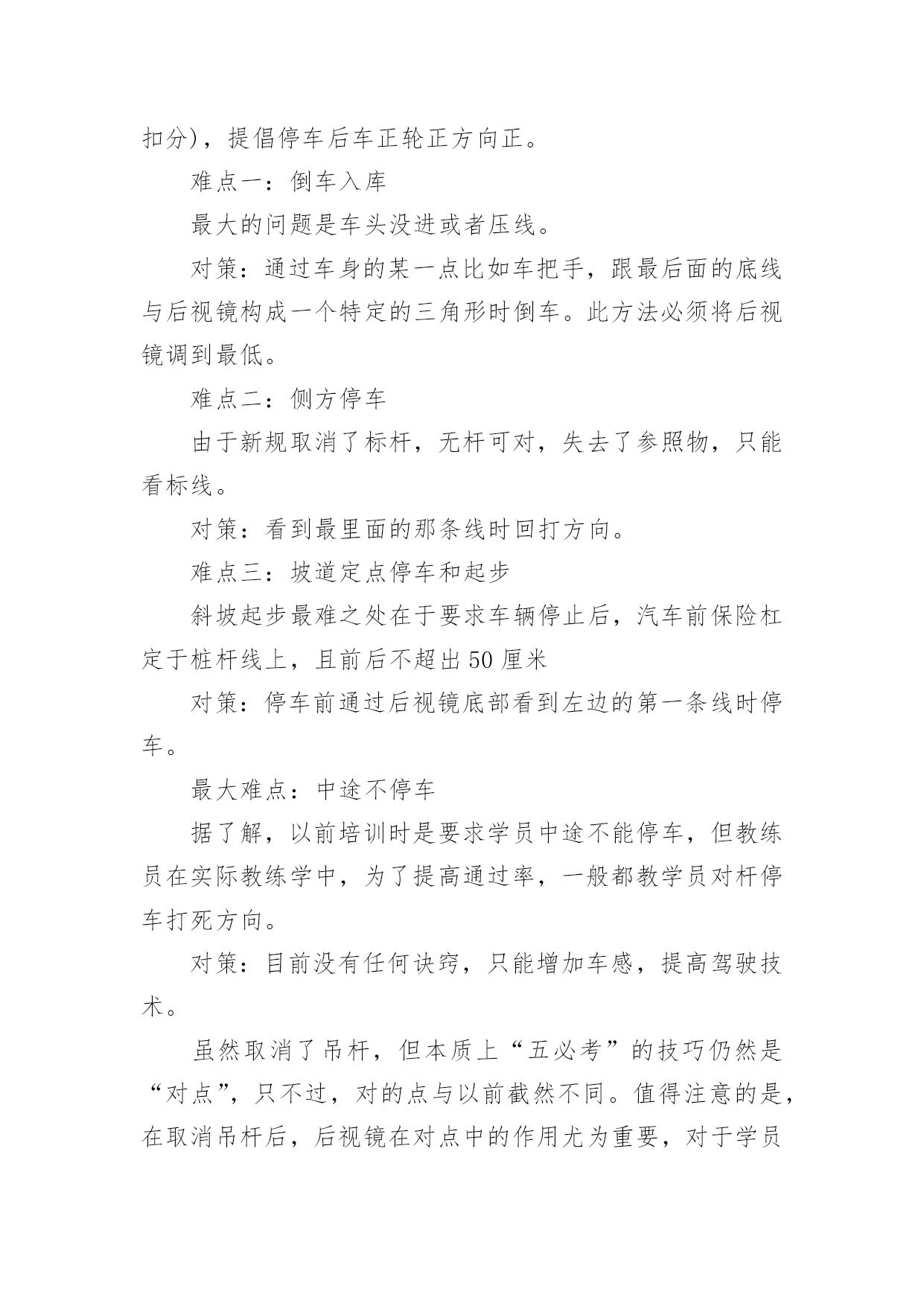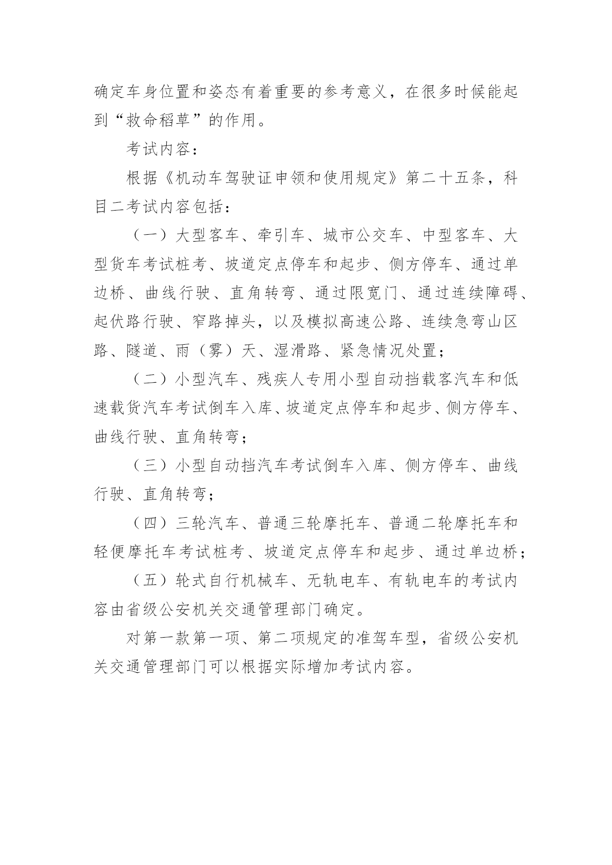 科目二的考试内容科目二的考试内容在驾考中科目二考试应该说是比较难的了,当然如果都会了,车开的熟练了,哪个也不难,这只是相对而言罢了。下面是小编为你准备的科目二的考试内容,希望对你有帮助!科目二考试项目包括:倒车入库、侧方停车、坡道定点停车和起步、直角转弯、曲线行驶。接下来把科目二考试时要注意的事项给大家说一下。1、一定要调整座位、后视镜至自己习惯的合适位置。(左后视镜调整到可以方便看到左后门把手和左后轮的恰当位置,右后视镜要调整到最下,驾驶位看到右前面把手在右后视镜中间位置左右。)记得系安全带。2、养成打转向灯的好习惯(无论进出都打灯)。3、要注意车辆速度的控制(主要通过踩离合的高低,必要时可适当稍踩刹车,但不得踩到停车),“速度慢、方向快”是要点。4、除每项目考试区之间的路段可停车等待,一但进入考试区域就不能在操作时中途停车。5、一定要听清楚语音提示,让电脑评判确认你的操作后(3秒左右)再做下一动作,不能操之过急。6、特别要注意方向不要打错,“前进看车头,倒退看车尾,想哪边就打哪边”不提倡停车后原地打方向,(虽然不扣分),提倡停车后车正轮正方向正。难点一:倒车入库最大的问题是车头没进或者压线。对策:通过车身的某一点比如车把手,跟最后面的底线与后视镜构成一个特定的三角形时倒车。此方法必须将后视镜调到最低。难点二:侧方停车由于新规取消了标杆,无杆可对,失去了参照物,只能看标线。对策:看到最里面的那条线时回打方向。难点三:坡道定点停车和起步斜坡起步最难之处在于要求车辆停止后,汽车前保险杠定于桩杆线上,且前后不超出50厘米对策:停车前通过后视镜底部看到左边的第一条线时停车。最大难点:中途不停车据了解,以前培训时是要求学员中途不能停车,但教练员在实际教练学中,为了提高通过率,一般都教学员对杆停车打死方向。对策:目前没有任何诀窍,只能增加车感,提高驾驶技术。虽然取消了吊杆,但本质上“五必考”的技巧仍然是“对点”,只不过,对的点与以前截然不同。值得注意的是,在取消吊杆后,后视镜在对点中的作用尤为重要,对于学员确定车身位置和姿态有着重要的参考意义,在很多时候能起到“救命稻草”的作用。考试内容:根据《机动车驾驶证申领和使用规定》第二十五条,科目二考试内容包括:(一)大型客车、牵引车、城市公交车、中型客车、大型货车考试桩考、坡道定点停车和起步、侧方停车、通过单边桥、曲线行驶、直角转弯、通过限宽门、通过连续障碍、起伏路行驶、窄路掉头,以及模拟高速公路、连续急弯山区路、隧道、雨(雾)天、湿滑路、紧急情况处置;(二)小型汽车、残疾人专用小型自动挡载客汽车和低速载货汽车考试倒车入库、坡道定点停车和起步、侧方停车、曲线行驶、直角转弯;(三)小型自动挡汽车考试倒车入库、侧方停车、曲线行驶、直角转弯;(四)三轮汽车、普通三轮摩托车、普通二轮摩托车和轻便摩托车考试桩考、坡道定点停车和起步、通过单边桥;(五)轮式自行机械车、无轨电车、有轨电车的考试内容由省级公安机关交通管理部门确定。对第一款第一项、第二项规定的准驾车型,省级公安机关交通管理部门可以根据实际增加考试内容。