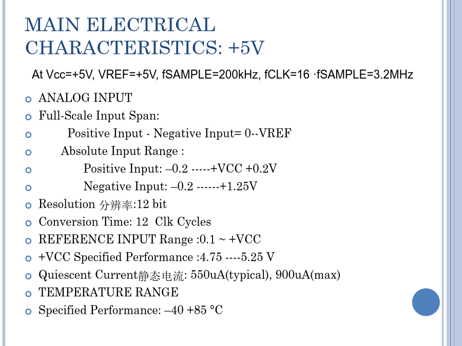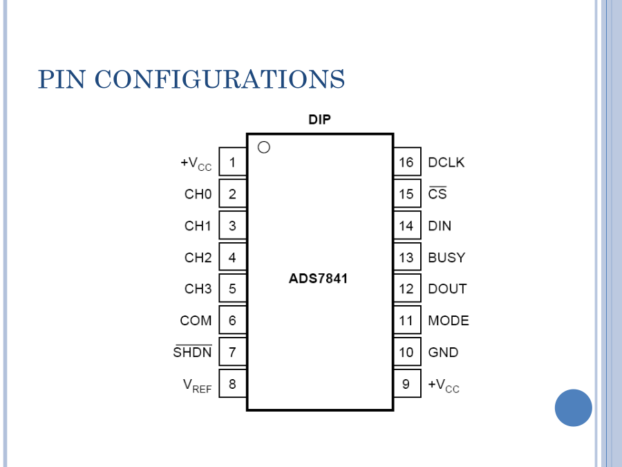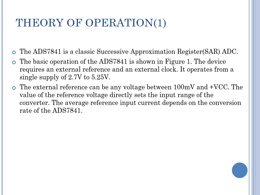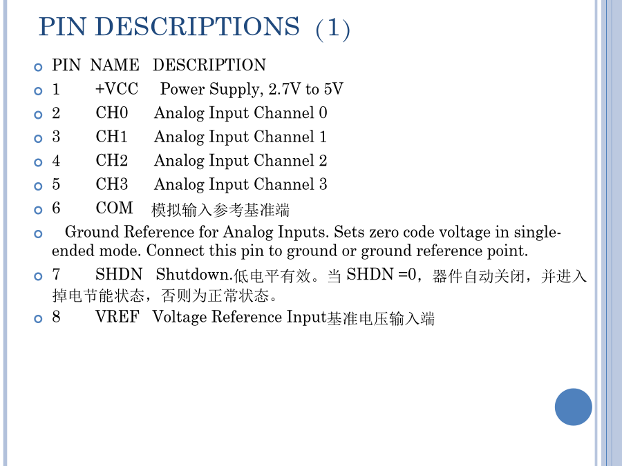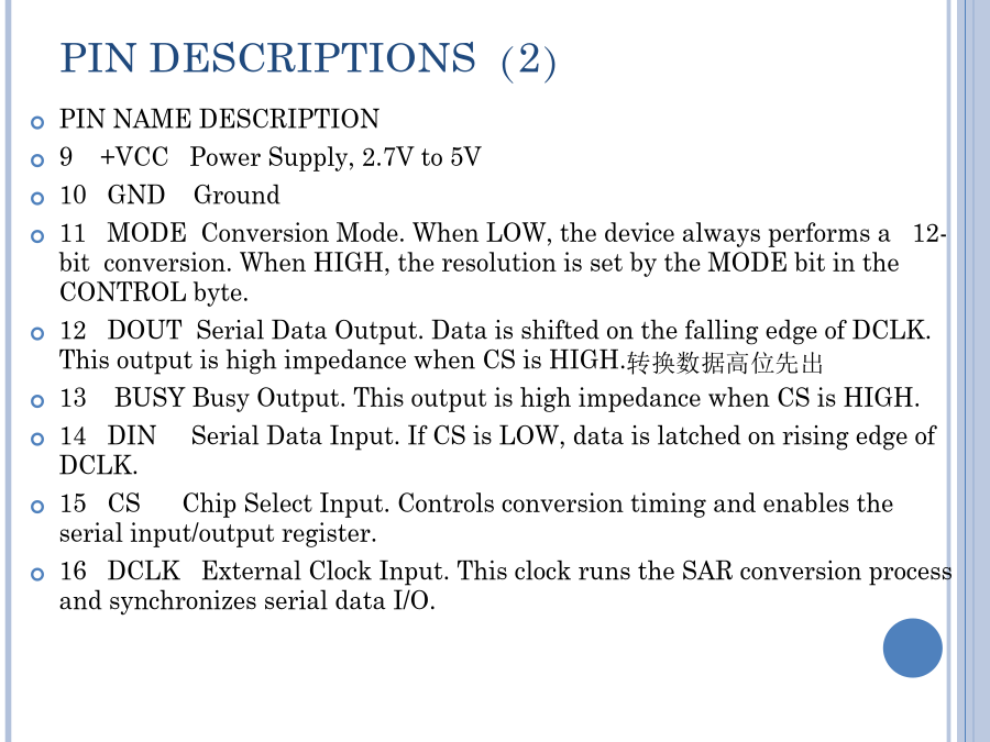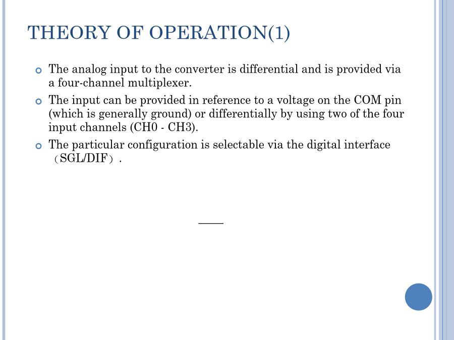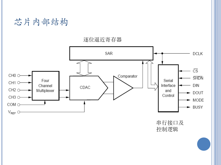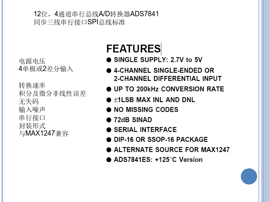 SPI总线A/D接口及程序设计12位,4通道串行总线A/D转换器ADS7841同步三线串行接口SPI总线标准应用领域芯片内部结构PINCONFIGURATIONSPINDESCRIPTIONS(1)PINDESCRIPTIONS(2)MAINELECTRICALCHARACTERISTICS:+5VTHEORYOFOPERATION(1)THEORYOFOPERATION(1)FIGURE1:BASICOPERATIONOFTHEADS7841.FIGURE2.SIMPLIFIEDDIAGRAMOFTHEANALOGINPUT.ANALOGINPUTREFERENCEINPUT(1)REFERENCEINPUT(2)REFERENCEINPUT(3)REFERENCEINPUT(4)FIGURE3.CONVERSIONTIMING,24-CLOCKSPERCONVERSION,8-BITBUSINTERFACE.NODCLKDELAYREQUIREDWITHDEDICATEDDIGITALINTERFACE(1)DIGITALINTERFACE(2)DIGITALINTERFACE(3)FIGURE3.CONVERSIONTIMING,24-CLOCKSPERCONVERSION,8-BITBUSINTERFACE.NODCLKDELAYREQUIREDWITHDEDICATEDCONTROLBYTE控制字节TABLEIV.DESCRIPTIONSOFTHECONTROLBITSWITHINTHECONTROLBYTE.TheMODEbitandtheMODEpinworktogethertodeterminethenumberofbitsforagivenconversion.IftheMODEpinisLOW,theconverteralwaysperformsa12-bitconversionregardlessofthestateoftheMODEbit.IftheMODEpinisHIGH,thentheMODEbitdeterminesthenumberofbitsforeachconversion,either12bits(LOW)or8bits(HIGH).TheSGL/DIFbitcontrolsthemultiplexerinputmode:eithersingle-ended(HIGH)ordifferential(LOW).Insingle-endedmode,theselectedinputchannelisreferencedtotheCOMpin.Indifferentialmode,thetwoselectedinputsprovideadifferentialinput.SeeTablesIandIIandFigure2formoreinformation.Thelasttwobits(PD1-PD0)selectthepowerdownmode,asshowninTableV.IfbothinputsareHIGH,thedeviceisalwayspoweredup.IfbothinputsareLOW,thedeviceentersapower-downmodebetweenconversions.Whenanewconversionisinitiated,thedevicewillresumenormaloperationinstantly—nodelayisneededtoallowthedevicetopowerupandtheveryfirstconversionwillbevalid.读取AD转换结果流程程序举例(1)写一个字节程序举例(2)读一个字节
