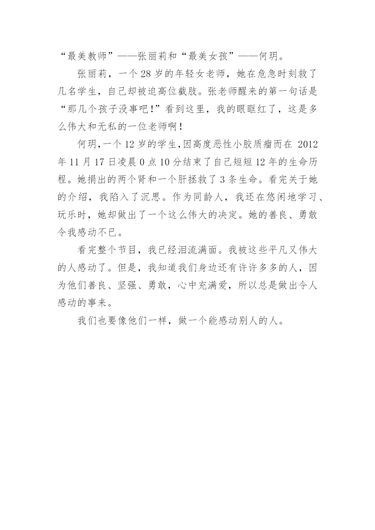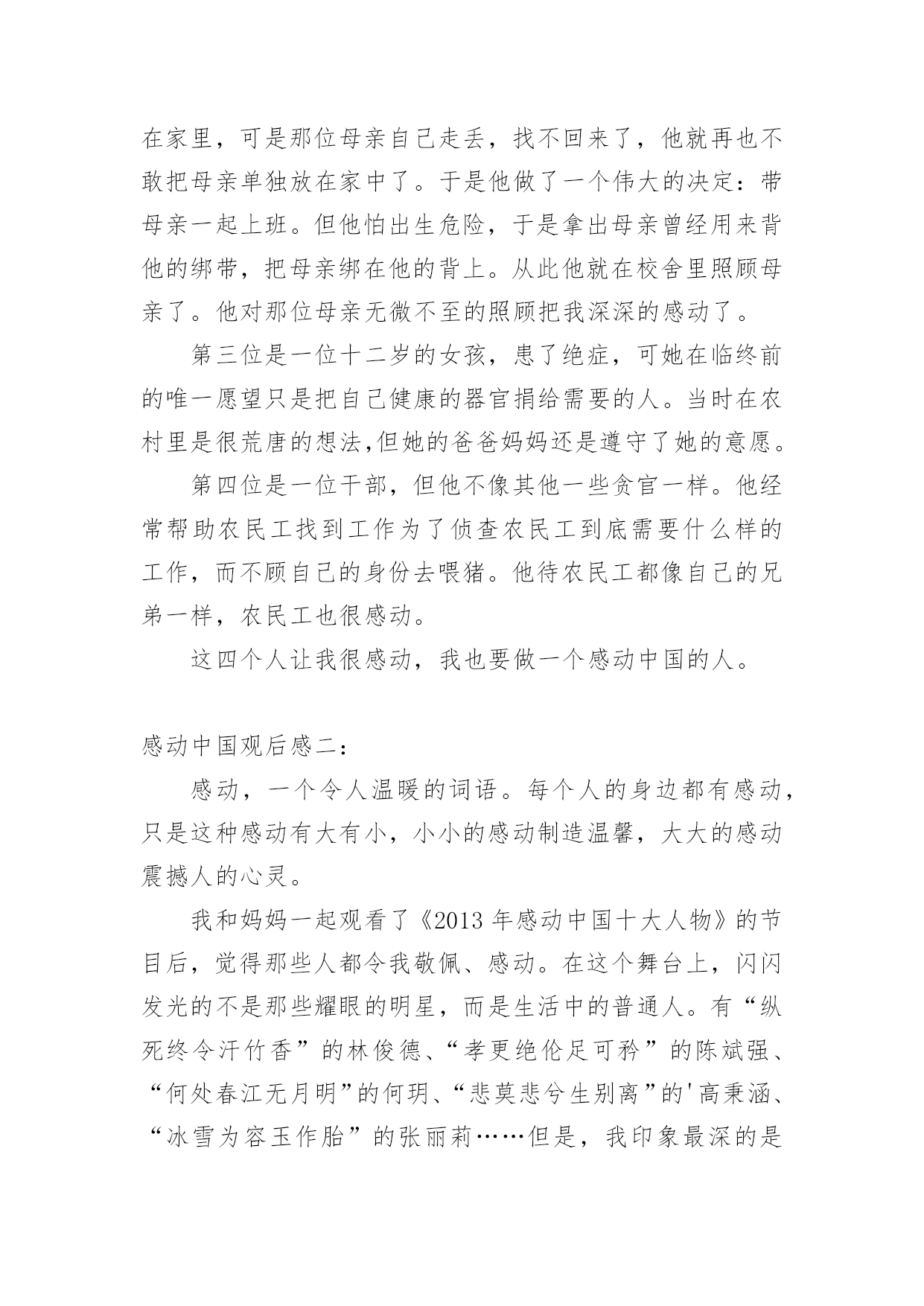 感动中国观后感参考2018感动中国观后感参考感动中国是中央电视台打造的一个精神品牌栏目,由新闻中心社会专题部活动直播组承办,每年元宵节前后推出,已经连续举办多年,通过多种投票方式选取年度具有震撼人心、令人感动的人物和团队,主持人自开播以来由白岩松&敬一丹担任。下面,小编为大家分享感动中国观后感,希望对大家有所帮助!感动中国观后感一:今天老师给我们看了感动中国这个片子,我看了以后,觉得很感动。第一位感动中国的人是一位老爷爷,他已经病逝了,可他的故事却在后代里广为流传:他是一位从事原子核试验的军人,他制造的原子核成功了,他欣喜若狂。可是,现在的他已经患上了严重的疾病,当他得知自己的病情时,坦然极了,直接问医生:“我还有多少时间?”这位老爷爷的病情一天天恶化,但他一直坚持工作。到最后的时刻,如果不做手术就支撑不下来了,可是老爷爷还是拒绝了医生的建议,他说了一声“我们坐核研究的人,一不怕苦,二不怕死。”老爷爷晚上那一觉就再也没有醒来,永远的`与世长辞了。第二位感动中国的人是一位中学教师,她的母亲患了老年痴呆症,不能自理。之前,那一位教师把他的母亲单独放在家里,可是那位母亲自己走丢,找不回来了,他就再也不敢把母亲单独放在家中了。于是他做了一个伟大的决定:带母亲一起上班。但他怕出生危险,于是拿出母亲曾经用来背他的绑带,把母亲绑在他的背上。从此他就在校舍里照顾母亲了。他对那位母亲无微不至的照顾把我深深的感动了。第三位是一位十二岁的女孩,患了绝症,可她在临终前的唯一愿望只是把自己健康的器官捐给需要的人。当时在农村里是很荒唐的想法,但她的爸爸妈妈还是遵守了她的意愿。第四位是一位干部,但他不像其他一些贪官一样。他经常帮助农民工找到工作为了侦查农民工到底需要什么样的工作,而不顾自己的身份去喂猪。他待农民工都像自己的兄弟一样,农民工也很感动。这四个人让我很感动,我也要做一个感动中国的人。感动中国观后感二:感动,一个令人温暖的词语。每个人的身边都有感动,只是这种感动有大有小,小小的感动制造温馨,大大的感动震撼人的心灵。我和妈妈一起观看了《2013年感动中国十大人物》的节目后,觉得那些人都令我敬佩、感动。在这个舞台上,闪闪发光的不是那些耀眼的明星,而是生活中的普通人。有“纵死终令汗竹香”的林俊德、“孝更绝伦足可矜”的陈斌强、“何处春江无月明”的何玥、“悲莫悲兮生别离”的'高秉涵、“冰雪为容玉作胎”的张丽莉……但是,我印象最深的是“最美教师”——张丽莉和“最美女孩”——何玥。张丽莉,一个28岁的年轻女老师,她在危急时刻救了几名学生,自己却被迫高位截肢。张老师醒来的第一句话是“那几个孩子没事吧!”看到这里,我的眼眶红了,这是多么伟大和无私的一位老师啊!何玥,一个12岁的学生,因高度恶性小胶质瘤而在2012年11月17日凌晨0点10分结束了自己短短12年的生命历程。她捐出的两个肾和一个肝拯救了3条生命。看完关于她的介绍,我陷入了沉思。作为同龄人,我还在悠闲地学习、玩乐时,她却做出了一个这么伟大的决定。她的善良、勇敢令我感动不已。看完整个节目,我已经泪流满面。我被这些平凡又伟大的人感动了。但是,我知道我们身边还有许许多多的人,因为他们善良、坚强、勇敢,心中充满爱,所以总是做出令人感动的事来。我们也要像他们一样,做一个能感动别人的人。