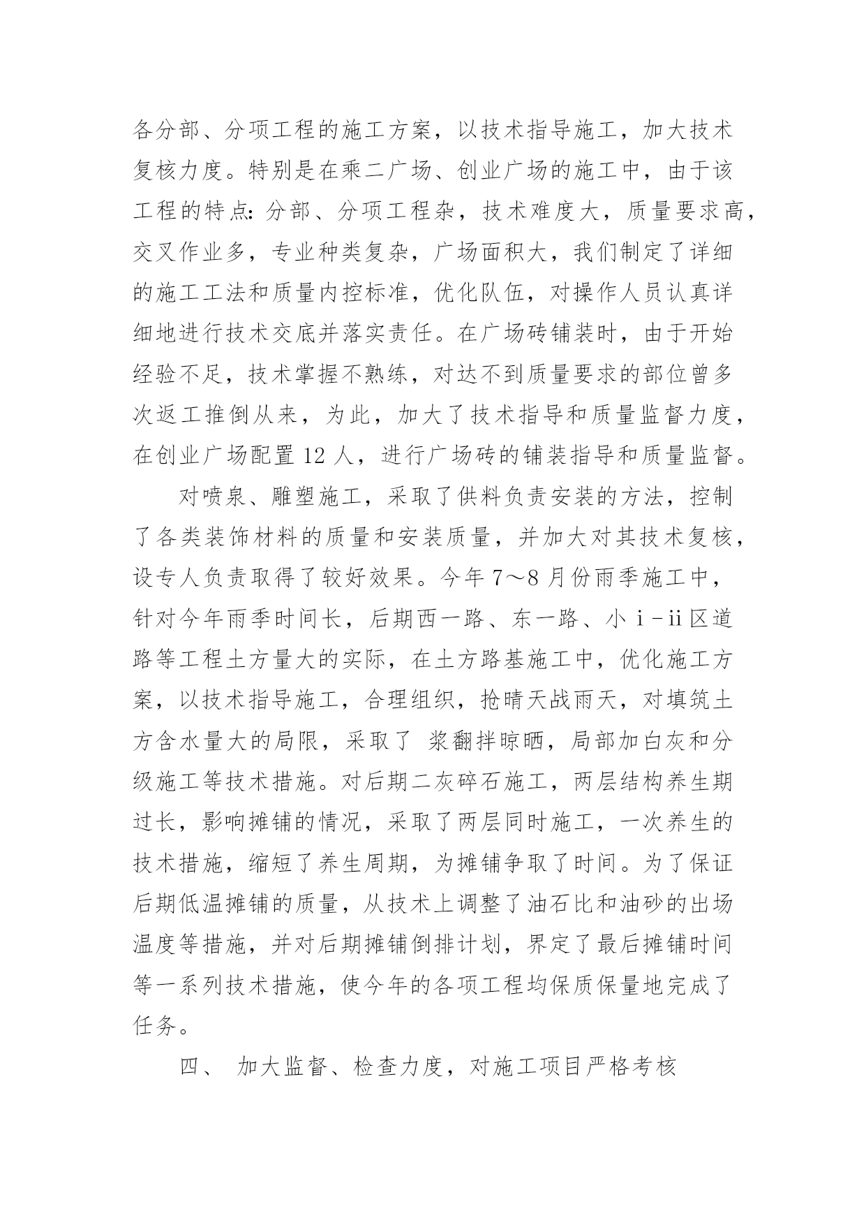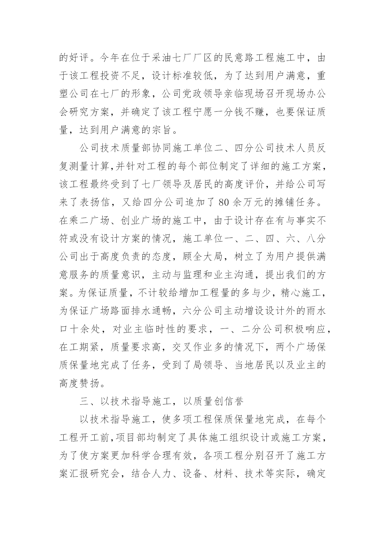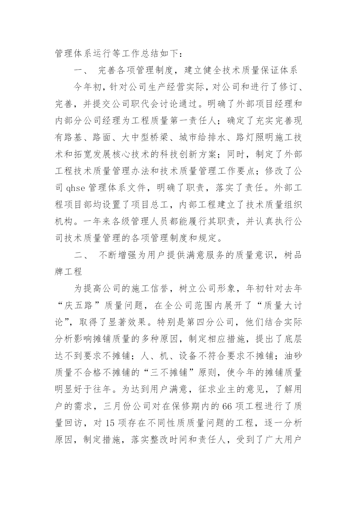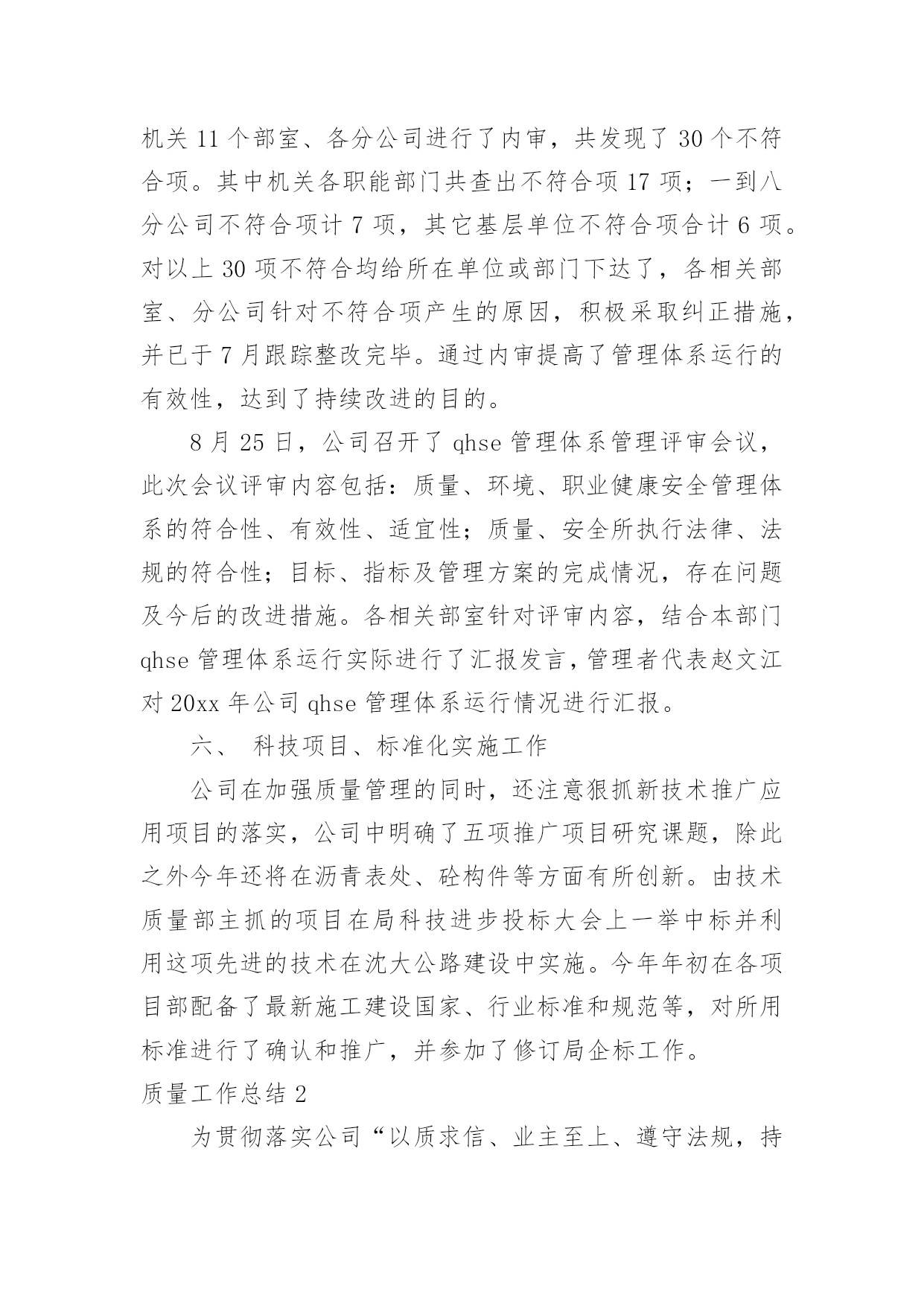 质量工作总结质量工作总结总结是指社会团体、企业单位和个人在自身的某一时期、某一项目或某些工作告一段落或者全部完成后进行回顾检查、分析评价,从而肯定成绩,得到经验,找出差距,得出教训和一些规律性认识的一种书面材料,它能使我们及时找出错误并改正,不妨坐下来好好写写总结吧。那么总结应该包括什么内容呢?下面是小编精心整理的质量工作总结,仅供参考,大家一起来看看吧。质量工作总结1公司技术、质量、科技、标准化、qhse管理体系工作认真贯彻落实管理局和建设集团的工作要求,紧紧围绕公司一届二次职代会精神和公司经营改革总体方案,坚持“遵守承诺让业主满意,追求卓越建优质路桥”的质量方针,夯实技术质量基础工作,完善监督考核约束机制,全面实施名牌战略和科技创新方案,全力打造精品工程,为用户提供满意服务,取得了较好的效果。目前公司内外部工程已有40项通过了竣工验收,一次验交合格率100%,分项工程优良率93.8%,其中已有5项工程申报了局和油田优质工程,创业广场、乘二广场拟申报省优质工程,已完成了年初确定的质量目标。下面就一年来的技术、质量、科技、标准化、qhse管理体系运行等工作总结如下:一、完善各项管理制度,建立健全技术质量保证体系今年初,针对公司生产经营实际,对公司和进行了修订、完善,并提交公司职代会讨论通过。明确了外部项目经理和内部分公司经理为工程质量第一责任人;确定了充实完善现有路基、路面、大中型桥梁、城市给排水、路灯照明施工技术和拓宽发展核心技术的科技创新方案;同时,制定了外部工程技术质量管理办法和技术质量管理工作要点;修改了公司qhse管理体系文件,明确了职责,落实了责任。外部工程项目部均设置了项目总工,内部工程建立了技术质量组织机构。一年来各级管理人员都能履行其职责,并认真执行公司技术质量管理的各项管理制度和规定。二、不断增强为用户提供满意服务的质量意识,树品牌工程为提高公司的施工信誉,树立公司形象,年初针对去年“庆五路”质量问题,在全公司范围内展开了“质量大讨论”,取得了显著效果。特别是第四分公司,他们结合实际分析影响摊铺质量的多种原因,制定相应措施,提出了底层达不到要求不摊铺;人、机、设备不符合要求不摊铺;油砂质量不合格不摊铺的“三不摊铺”原则,使今年的摊铺质量明显好于往年。为达到用户满意,征求业主的意见,了解用户的需求,三月份公司对在保修期内的66项工程进行了质量回访,对15项存在不同性质质量问题的工程,逐一分析原因,制定措施,落实整改时间和责任人,受到了广大用户的好评。今年在位于采油七厂厂区的民意路工程施工中,由于该工程投资不足,设计标准较低,为了达到用户满意,重塑公司在七厂的形象,公司党政领导亲临现场召开现场办公会研究方案,并确定了该工程宁愿一分钱不赚,也要保证质量,达到用户满意的宗旨。公司技术质量部协同施工单位二、四分公司技术人员反复测量计算,并针对工程的每个部位制定了详细的施工方案,该工程最终受到了七厂领导及居民的高度评价,并给公司写来了表扬信,又给四分公司追加了80余万元的摊铺任务。在乘二广场、创业广场的施工中,由于设计存在有与事实不符或没有设计方案的情况,施工单位一、二、四、六、八分公司出于高度负责的态度,顾全大局,树立了为用户提供满意服务的质量意识,主动与监理和业主沟通,提出我们的方案。为保证质量,不计较给增加工程量的多与少,精心施工,为保证广场路面排水通畅,六分公司主动增设设计外的雨水口十余处,对业主临时性的要求,一、二分公司积极响应,在工期紧,质量要求高,交叉作业多的情况下,两个广场保质保量地完成了任务,受到了局领导、当地居民以及业主的高度赞扬。三、以技术指导施工,以质量创信誉以技术指导施工,使多项工程保质保量地完成,在每个工程开工前,项目部均制定了具体施工组织设计或施工方案,为了使方案更加科学合理有效,各项工程分别召开了施工方案汇报研究会,结合人力、设备、材料、技术等实际,确定各分部、分项工程的施工方案,以技术指导施工,加大技术复核力度。特别是在乘二广场、创业广场的施工中,由于该工程的特点:分部、分项工程杂,技术难度大,质量要求高,交叉作业多,专业种类复杂,广场面积大,我们制定了详细的施工工法和质量内控标准,优化队伍,对操作人员认真详细地进行技术交底并落实责任。在广场砖铺装时,由于开始经验不足,技术掌握不熟练,对达不到质量要求的部位曾多次返工推倒从来,为此,加大了技术指导和质量监督力度,在创业广场配置12人,进行广场砖的铺装指导和质量监督。对喷泉、雕塑施工,采取了供料负责安装的方法,控制了各类装饰材料的质量和安装质量,并加大对其技术复核,设专人负责取得了较好效果。今年7~8月份雨季施工中,针对今年雨季时间长,后期西一路、东一路、小ⅰ-ⅱ区道路等工程土方量大的实际,在土方路基施工中,优化施工方案,以技术指导施