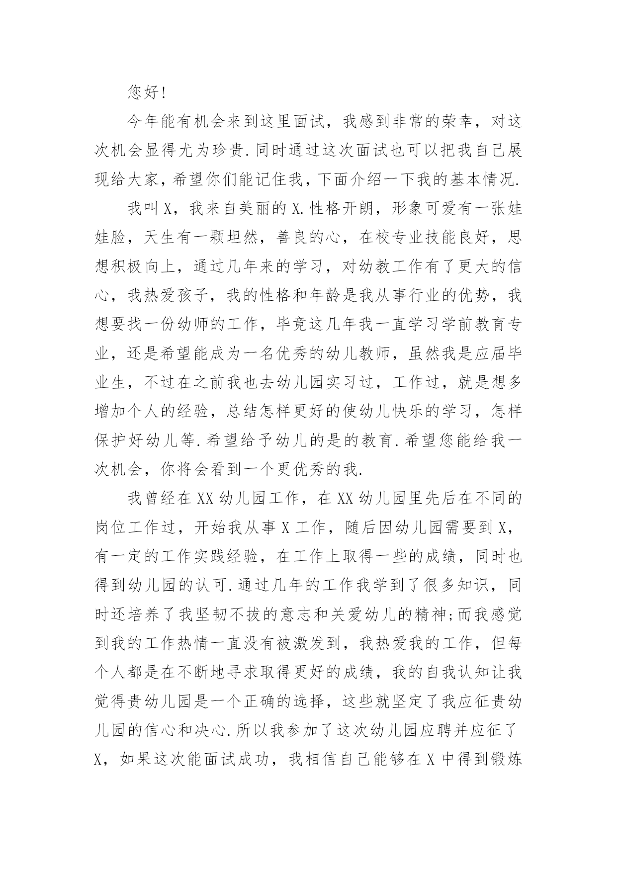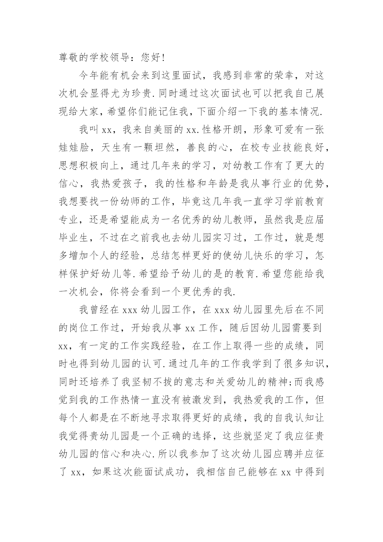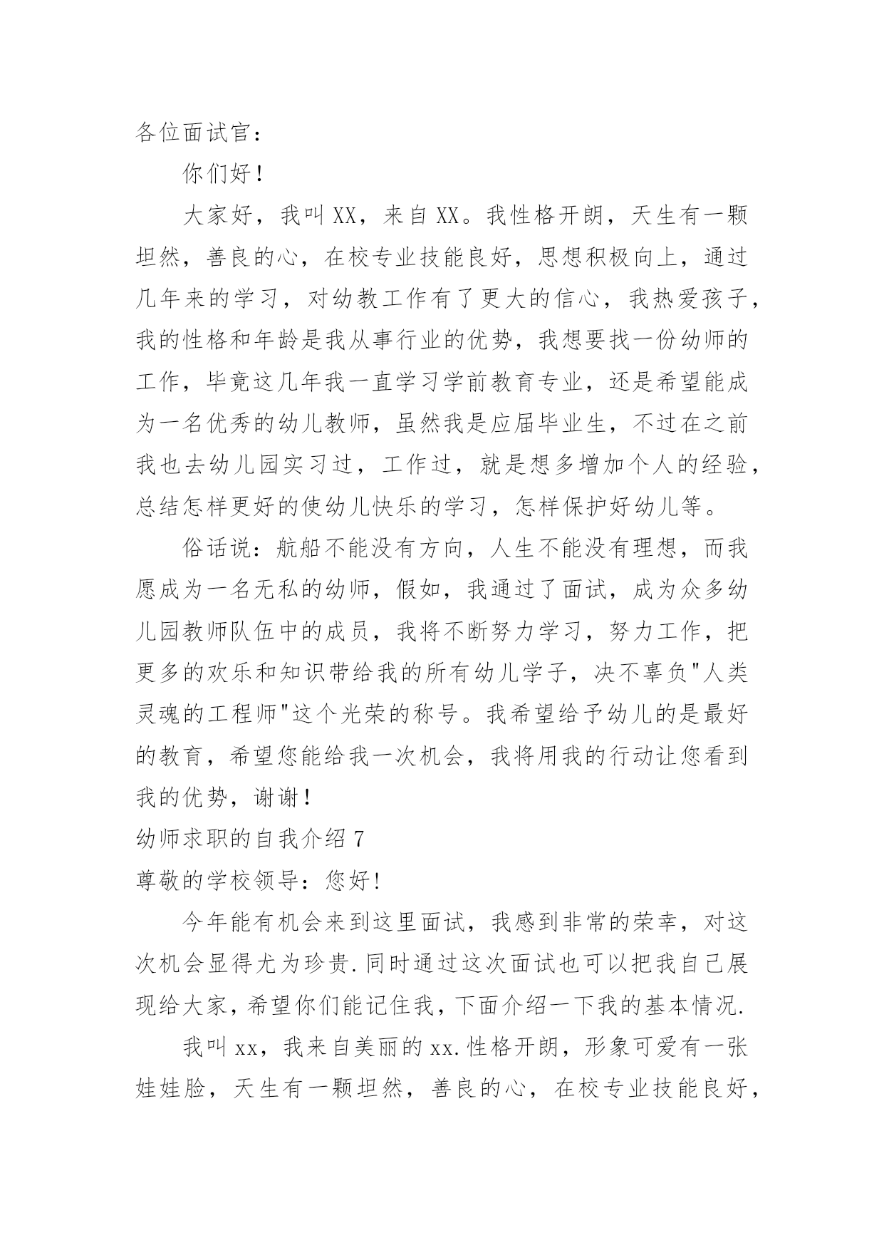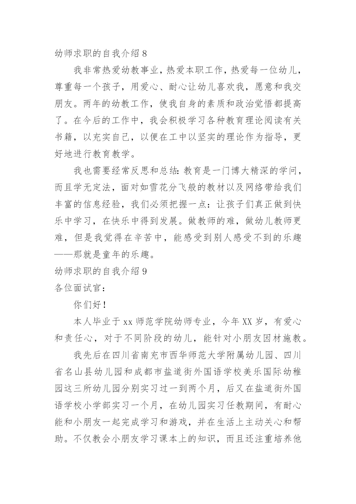幼师求职的自我介绍幼师求职的自我介绍当我们在一个陌生场合中,常常要进行自我介绍,通过自我介绍可以让他人了解我们。到底应如何写自我介绍呢?以下是小编帮大家整理的幼师求职的自我介绍,欢迎阅读与收藏。幼师求职的自我介绍1本人毕业于xx师范学院幼师专业,今年x岁,有爱心和责任心,对于不同阶段的幼儿,能针对小朋友因材施教。我先后在xx省xx市xx师范大学附属幼儿园、xx省xx县幼儿园和xx市xx街外国语学校xx国际幼稚园这三所幼儿园分别实习过一到两个月,后又在xx外国语学校小学部实习一个月,在幼儿园实习任教期间,有耐心能和小朋友一起完成学习和游戏,并在生活上主动关心和帮助。不仅教会小朋友学习课本上的知识,而且还注重培养他们的学习兴趣,在组织活动中培养团队的合作能力及各方面能力让每位小朋友都能充分的展示自己,发挥出自己的优势。在工作中我积极进取,吃苦耐劳,在实践中成长很多,丰富了我的专业,学到了更多更实用的知识,也深得老师领导的好评。在以后工作过程中,我还要不断学习和完善自己。请领导给我一次机会,我会用实际行动去证明我的`能力!幼师求职的自我介绍2尊敬的学校领导:您好!今年能有机会来到这里面试,我感到非常的荣幸,对这次机会显得尤为珍贵.同时通过这次面试也可以把我自己展现给大家,希望你们能记住我,下面介绍一下我的基本情况.我叫xx,我来自美丽的xx.性格开朗,形象可爱有一张娃娃脸,天生有一颗坦然,善良的心,在校专业技能良好,思想积极向上,通过几年来的学习,对幼教工作有了更大的信心,我热爱孩子,我的性格和年龄是我从事行业的优势,我想要找一份幼师的工作,毕竟这几年我一直学习学前教育专业,还是希望能成为一名优秀的幼儿教师,虽然我是应届毕业生,不过在之前我也去幼儿园实习过,工作过,就是想多增加个人的经验,总结怎样更好的使幼儿快乐的学习,怎样保护好幼儿等.希望给予幼儿的是的教育.希望您能给我一次机会,你将会看到一个更优秀的我.我曾经在xxx幼儿园工作,在xxx幼儿园里先后在不同的岗位工作过,开始我从事xx工作,随后因幼儿园需要到xx,有一定的工作实践经验,在工作上取得一些的成绩,同时也得到幼儿园的认可.通过几年的工作我学到了很多知识,同时还培养了我坚韧不拔的意志和关爱幼儿的精神;而我感觉到我的工作热情一直没有被激发到,我热爱我的工作,但每个人都是在不断地寻求取得更好的成绩,我的自我认知让我觉得贵幼儿园是一个正确的选择,这些就坚定了我应征贵幼儿园的信心和决心.所以我参加了这次幼儿园应聘并应征了xx,如果这次能面试成功,我相信自己能够在xx中得到锻炼和有获得发展的机会.假如,我通过了面试,成为众多幼儿园教师队伍中的成员,我将不断努力学习,努力工作,把更多的欢乐和知识带给我的所有幼儿学子,决不辜负"人类灵魂的工程师"这个光荣的称号.幼师求职的自我介绍3各位领导和老师:你们好!我叫xxx,来自xxxx职业技术学院幼教专业。我从小就向往成为一名幼儿教师,今天很荣幸能有这个机会来到贵园面试幼师一职。我自信,乐观,宽容,有耐心,爱心,同时在在幼儿的管理方面,有一定的经验,并且我是从内而外的喜欢孩子们,相信在这个大家庭里,以我对孩子的爱,让孩子们每一天都过的快乐,充实。当然我也会以一个老师,母亲及朋友的身份与幼儿相处。让他们喜欢我,爱我,尊重我!对待我的工作我也会尽职尽责。努力的做到尽善尽美。为了以后能成为优秀幼师,不断从各方面完善自己,每个学期都以较好的成绩完成规定学科的学习,同时也具备了一定的语言听、说、读写的能力,良好的教师素质,具有良好的语音面貌,在课余时间我阅读了大量的书籍,对专业课的一些练习,我相信皇天不负有心人,只要自己努力了,就一定会有收获。幼师求职的自我介绍4尊敬的学校领导:您好!今年能有机会来到这里面试,我感到非常的荣幸,对这次机会显得尤为珍贵.同时通过这次面试也可以把我自己展现给大家,希望你们能记住我,下面介绍一下我的基本情况.我叫X,我来自美丽的X.性格开朗,形象可爱有一张娃娃脸,天生有一颗坦然,善良的心,在校专业技能良好,思想积极向上,通过几年来的学习,对幼教工作有了更大的信心,我热爱孩子,我的性格和年龄是我从事行业的优势,我想要找一份幼师的工作,毕竟这几年我一直学习学前教育专业,还是希望能成为一名优秀的幼儿教师,虽然我是应届毕业生,不过在之前我也去幼儿园实习过,工作过,就是想多增加个人的经验,总结怎样更好的使幼儿快乐的学习,怎样保护好幼儿等.希望给予幼儿的是的教育.希望您能给我一次机会,你将会看到一个更优秀的我.我曾经在XX幼儿园工作,在XX幼儿园里先后在不同的岗位工作过,开始我从事X工作,随后因幼儿园需要到X,有一定的工作实践经验,在工作上取得一些的成绩,同时也得到幼儿园的认可.通过几年的工作我学到了很多知识,同时还培养了我坚韧不拔