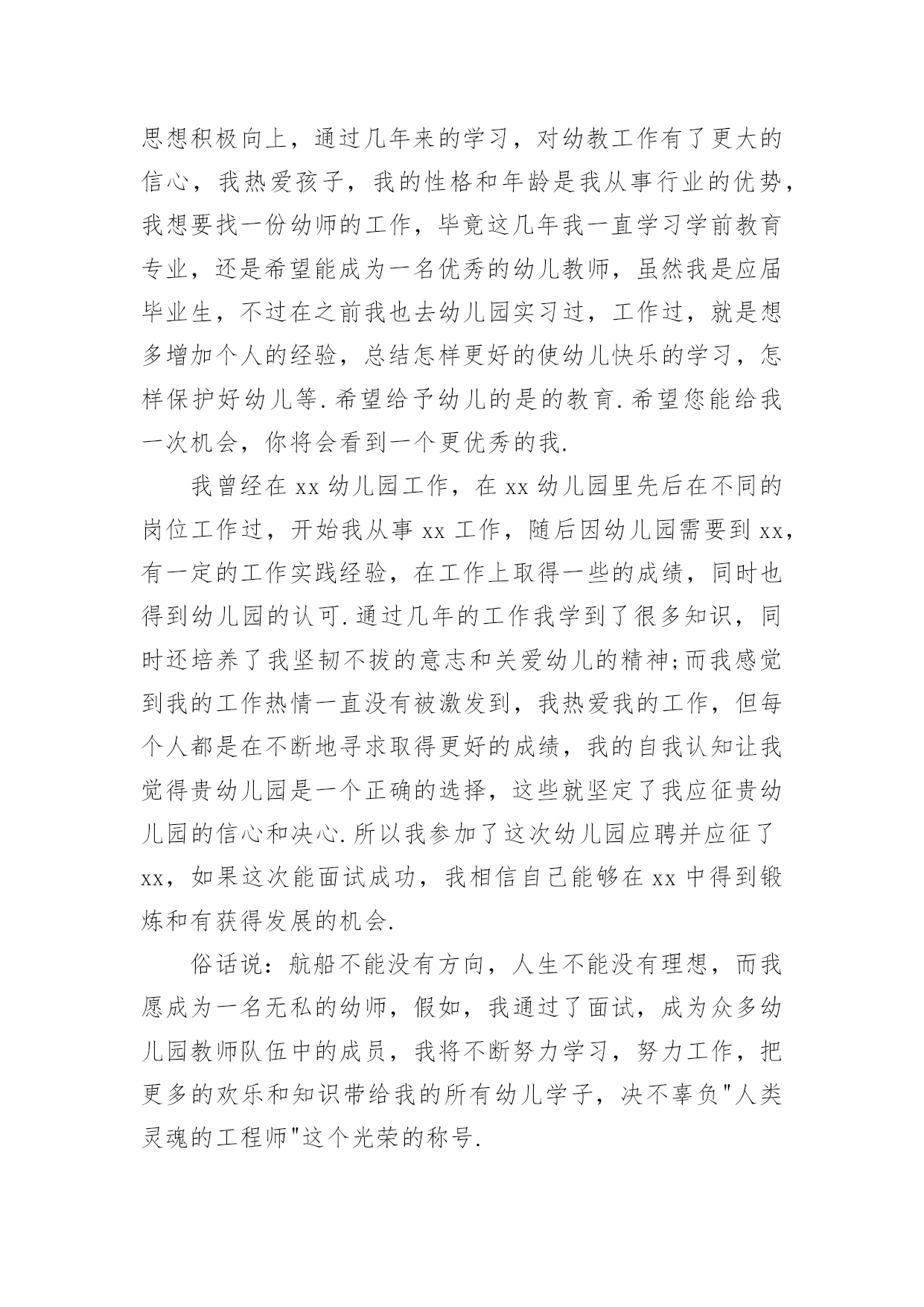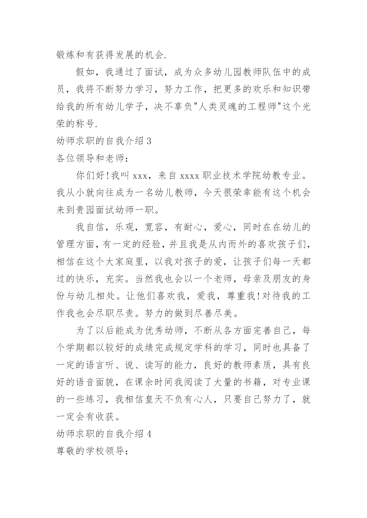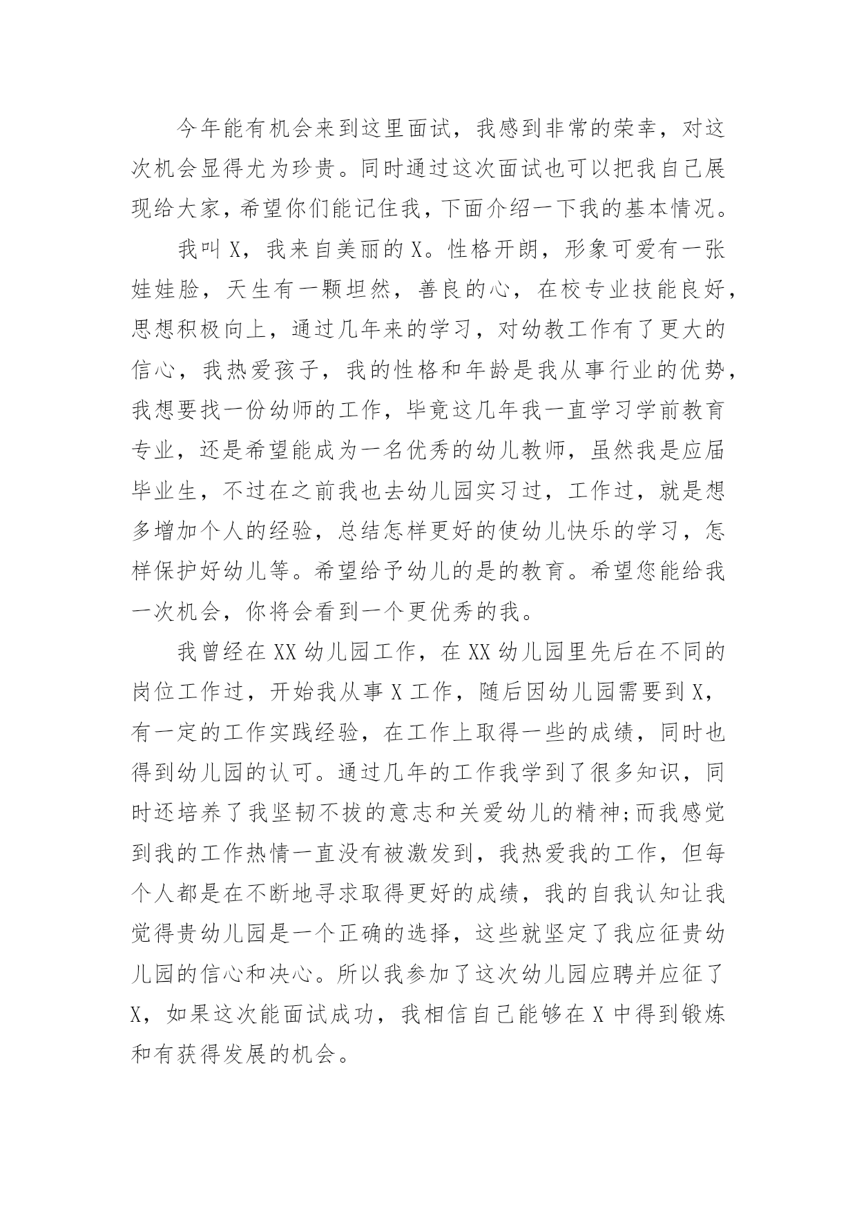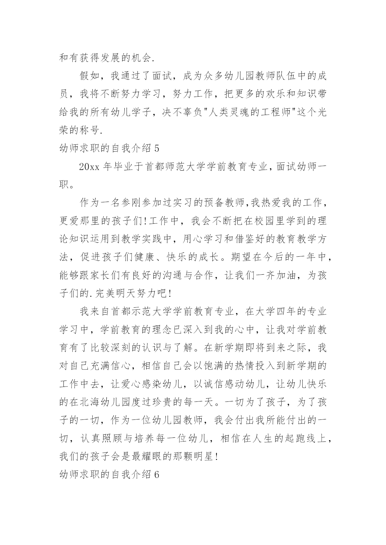 幼师求职的自我介绍幼师求职的自我介绍当我们在一个陌生场合中,常常要进行自我介绍,通过自我介绍可以让他人了解我们。到底应如何写自我介绍呢?以下是小编帮大家整理的幼师求职的自我介绍,欢迎阅读与收藏。幼师求职的自我介绍1本人毕业于xx师范学院幼师专业,今年x岁,有爱心和责任心,对于不同阶段的幼儿,能针对小朋友因材施教。我先后在xx省xx市xx师范大学附属幼儿园、xx省xx县幼儿园和xx市xx街外国语学校xx国际幼稚园这三所幼儿园分别实习过一到两个月,后又在xx外国语学校小学部实习一个月,在幼儿园实习任教期间,有耐心能和小朋友一起完成学习和游戏,并在生活上主动关心和帮助。不仅教会小朋友学习课本上的知识,而且还注重培养他们的学习兴趣,在组织活动中培养团队的合作能力及各方面能力让每位小朋友都能充分的展示自己,发挥出自己的优势。在工作中我积极进取,吃苦耐劳,在实践中成长很多,丰富了我的专业,学到了更多更实用的知识,也深得老师领导的好评。在以后工作过程中,我还要不断学习和完善自己。请领导给我一次机会,我会用实际行动去证明我的`能力!幼师求职的自我介绍2尊敬的学校领导:您好!今年能有机会来到这里面试,我感到非常的荣幸,对这次机会显得尤为珍贵.同时通过这次面试也可以把我自己展现给大家,希望你们能记住我,下面介绍一下我的基本情况.我叫xx,我来自美丽的xx.性格开朗,形象可爱有一张娃娃脸,天生有一颗坦然,善良的心,在校专业技能良好,思想积极向上,通过几年来的学习,对幼教工作有了更大的信心,我热爱孩子,我的性格和年龄是我从事行业的优势,我想要找一份幼师的工作,毕竟这几年我一直学习学前教育专业,还是希望能成为一名优秀的幼儿教师,虽然我是应届毕业生,不过在之前我也去幼儿园实习过,工作过,就是想多增加个人的经验,总结怎样更好的使幼儿快乐的学习,怎样保护好幼儿等.希望给予幼儿的是的教育.希望您能给我一次机会,你将会看到一个更优秀的我.我曾经在xxx幼儿园工作,在xxx幼儿园里先后在不同的岗位工作过,开始我从事xx工作,随后因幼儿园需要到xx,有一定的工作实践经验,在工作上取得一些的成绩,同时也得到幼儿园的认可.通过几年的工作我学到了很多知识,同时还培养了我坚韧不拔的意志和关爱幼儿的精神;而我感觉到我的工作热情一直没有被激发到,我热爱我的工作,但每个人都是在不断地寻求取得更好的成绩,我的自我认知让我觉得贵幼儿园是一个正确的选择,这些就坚定了我应征贵幼儿园的信心和决心.所以我参加了这次幼儿园应聘并应征了xx,如果这次能面试成功,我相信自己能够在xx中得到锻炼和有获得发展的机会.假如,我通过了面试,成为众多幼儿园教师队伍中的成员,我将不断努力学习,努力工作,把更多的欢乐和知识带给我的所有幼儿学子,决不辜负"人类灵魂的工程师"这个光荣的称号.幼师求职的自我介绍3各位领导和老师:你们好!我叫xxx,来自xxxx职业技术学院幼教专业。我从小就向往成为一名幼儿教师,今天很荣幸能有这个机会来到贵园面试幼师一职。我自信,乐观,宽容,有耐心,爱心,同时在在幼儿的管理方面,有一定的经验,并且我是从内而外的喜欢孩子们,相信在这个大家庭里,以我对孩子的爱,让孩子们每一天都过的快乐,充实。当然我也会以一个老师,母亲及朋友的身份与幼儿相处。让他们喜欢我,爱我,尊重我!对待我的工作我也会尽职尽责。努力的做到尽善尽美。为了以后能成为优秀幼师,不断从各方面完善自己,每个学期都以较好的成绩完成规定学科的学习,同时也具备了一定的语言听、说、读写的能力,良好的教师素质,具有良好的语音面貌,在课余时间我阅读了大量的书籍,对专业课的一些练习,我相信皇天不负有心人,只要自己努力了,就一定会有收获。幼师求职的自我介绍4尊敬的学校领导:您好!今年能有机会来到这里面试,我感到非常的荣幸,对这次机会显得尤为珍贵.同时通过这次面试也可以把我自己展现给大家,希望你们能记住我,下面介绍一下我的基本情况.我叫X,我来自美丽的X.性格开朗,形象可爱有一张娃娃脸,天生有一颗坦然,善良的心,在校专业技能良好,思想积极向上,通过几年来的学习,对幼教工作有了更大的信心,我热爱孩子,我的性格和年龄是我从事行业的优势,我想要找一份幼师的工作,毕竟这几年我一直学习学前教育专业,还是希望能成为一名优秀的幼儿教师,虽然我是应届毕业生,不过在之前我也去幼儿园实习过,工作过,就是想多增加个人的经验,总结怎样更好的使幼儿快乐的学习,怎样保护好幼儿等.希望给予幼儿的是的教育.希望您能给我一次机会,你将会看到一个更优秀的我.我曾经在XX幼儿园工作,在XX幼儿园里先后在不同的岗位工作过,开始我从事X工作,随后因幼儿园需要到X,有一定的工作实践经验,在工作上取得一些的成绩,同时也得到幼儿园的认可.通过几年的工作我学到了很多知识,同时还培养了我坚韧不拔