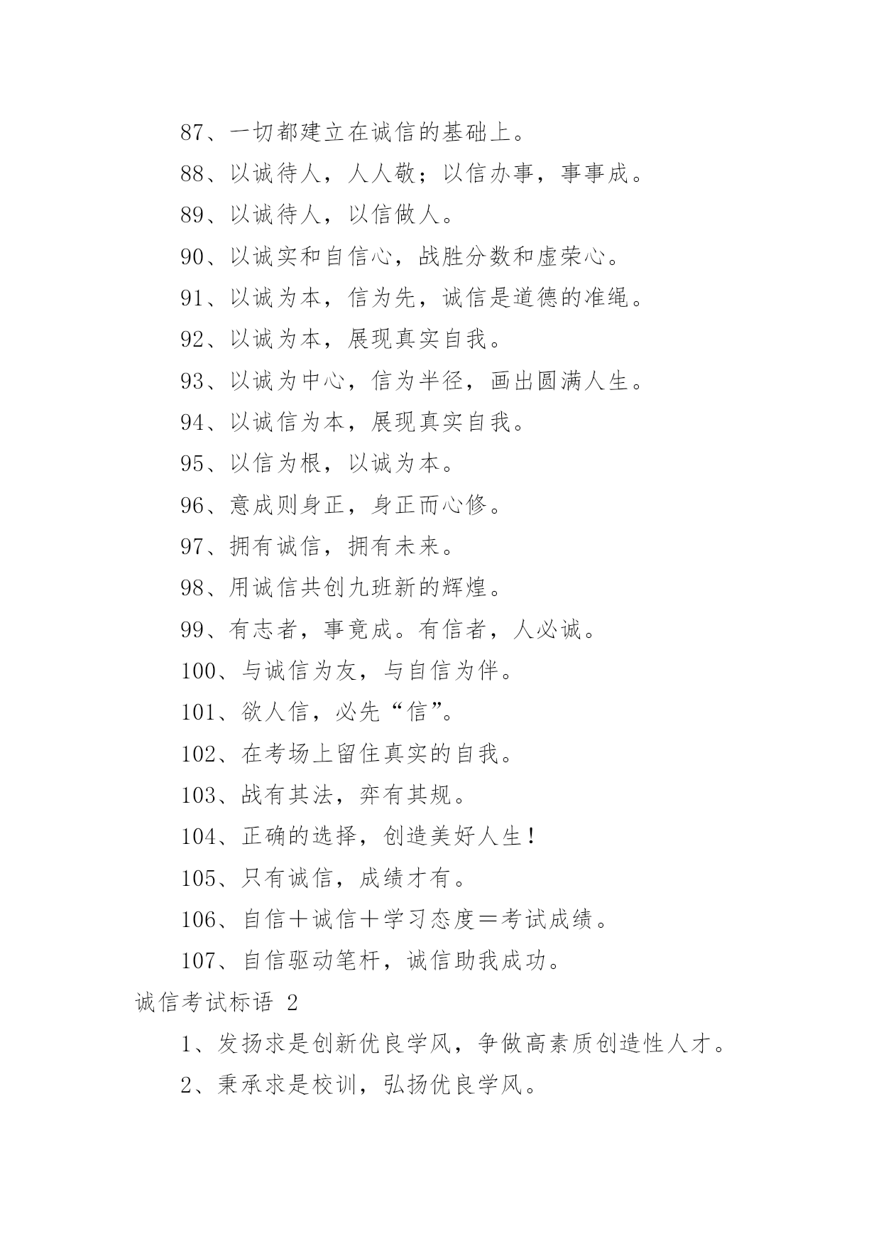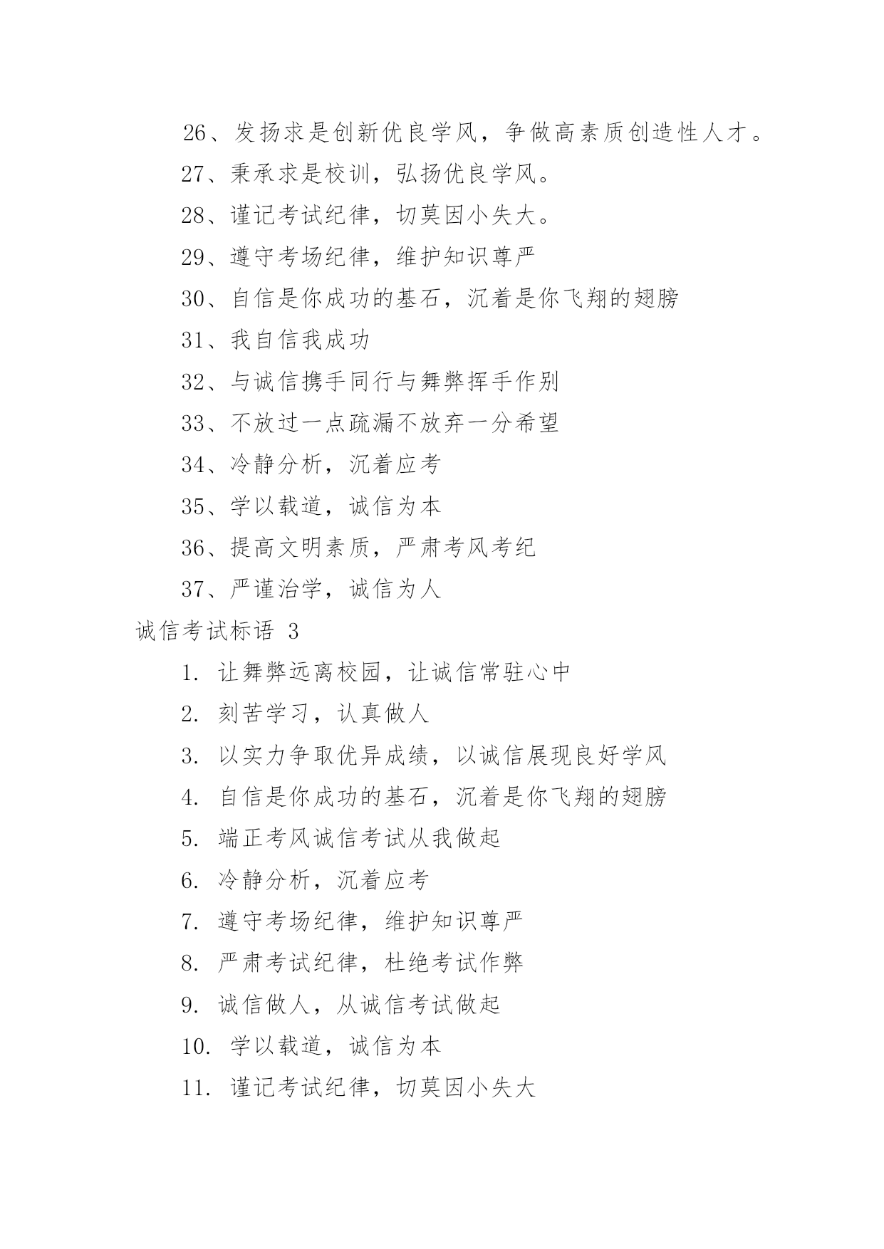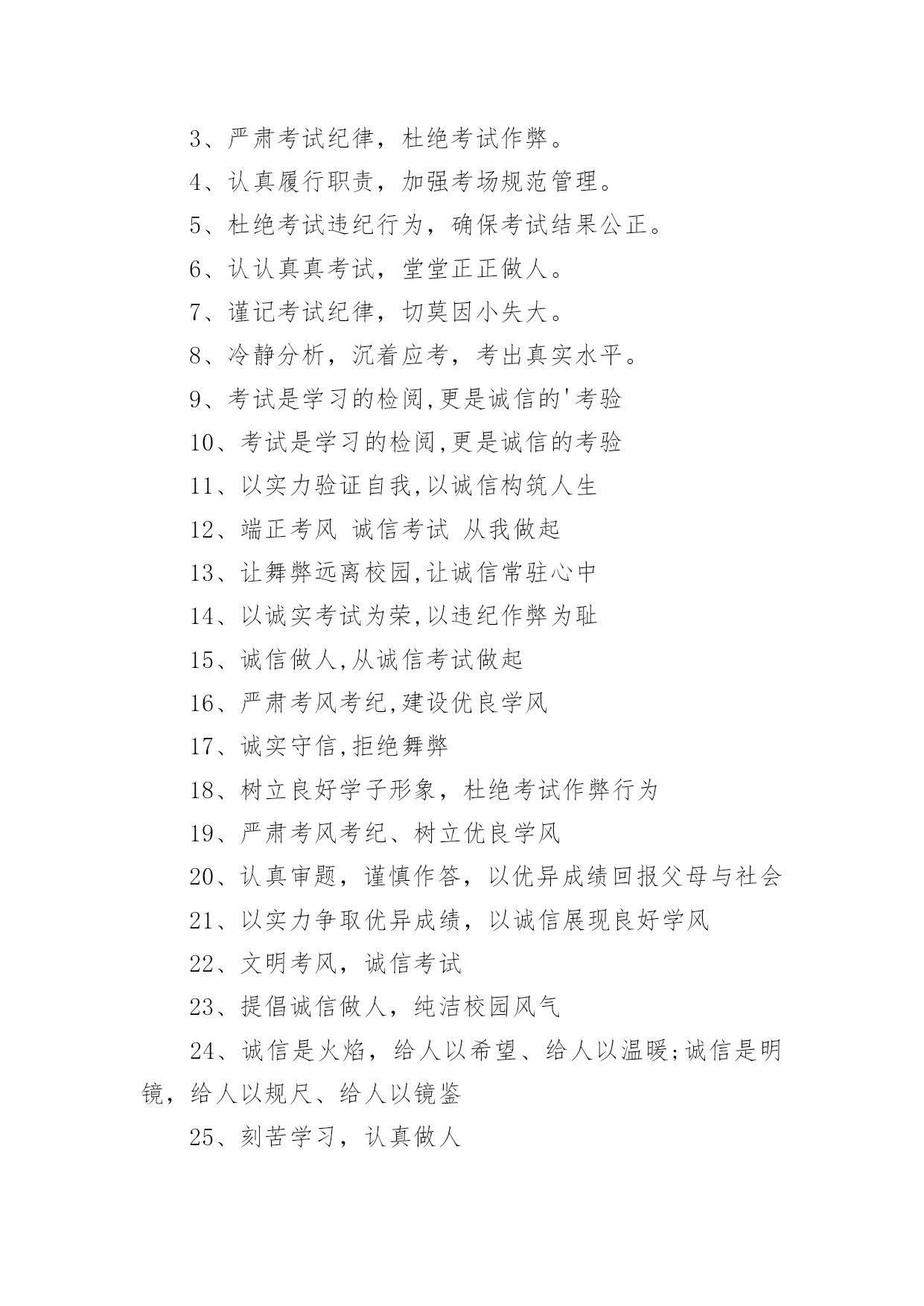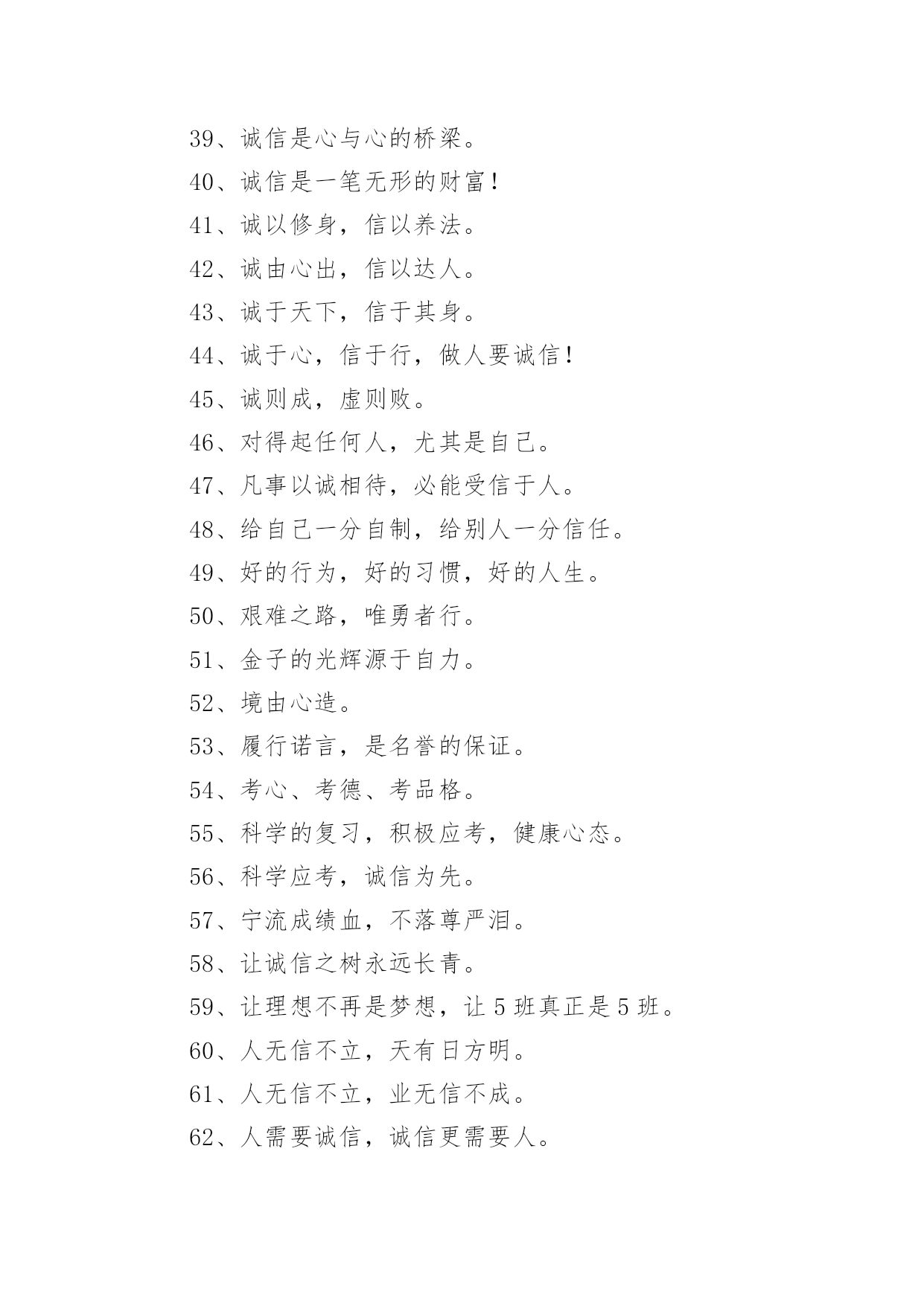 诚信考试标语诚信考试标语精选12篇在平平淡淡的学习、工作、生活中,大家都不可避免地会接触到标语吧,标语具有非常明显的时代特征和行业特色。还苦于找不到好的标语?以下是小编为大家整理的诚信考试标语,仅供参考,大家一起来看看吧。诚信考试标语11、“信”不“信”,由你。2、播种诚实,收获信任。3、播种诚信,收获人生。4、播种诚信,收获希望。5、不欺骗任何人,也包括自己。6、成绩检验过去,诚信成就未来。7、诚,是信的前提;信,是诚的基础。8、诚风拂面,诚尚融融。9、诚人之本,信人之德。10、诚人之美,信福一生。11、诚如泰山,信比金坚。12、诚实的蜜蜂,不会向塑料花献殷勤。13、诚实考试,诚信做人。14、诚实守信,乃人之本,存之道也。15、诚实应该成为你永久的伴侣。16、诚实重于珠宝。17、诚心待人,诚信出世。18、诚信——一把打开人类心灵的钥匙。19、诚信,拉近人与人之间的距离。20、诚信,梦的起点,成功的开端。21、诚信,为学之道,为人之本。22、诚信,让社会更美好。23、诚信=人说了一定要做到。24、诚信成就精品人生。25、诚信的美才是真正的美。26、诚信高于成绩。27、诚信进化一个人的心灵。28、诚信是打开成功之门不可或缺的钥匙。29、诚信——人的名片。30、诚信容易失去,不容易得到。31、诚信是宝石。32、诚信是金,认真是根。33、诚信是金。34、诚信是人们交往的基本要素。35、诚信是人与人之间的桥梁。36、诚信是人最重要的品牌。37、诚信为本。38、诚信是心灵的另一扇窗户。39、诚信是心与心的桥梁。40、诚信是一笔无形的财富!41、诚以修身,信以养法。42、诚由心出,信以达人。43、诚于天下,信于其身。44、诚于心,信于行,做人要诚信!45、诚则成,虚则败。46、对得起任何人,尤其是自己。47、凡事以诚相待,必能受信于人。48、给自己一分自制,给别人一分信任。49、好的行为,好的习惯,好的人生。50、艰难之路,唯勇者行。51、金子的光辉源于自力。52、境由心造。53、履行诺言,是名誉的保证。54、考心、考德、考品格。55、科学的复习,积极应考,健康心态。56、科学应考,诚信为先。57、宁流成绩血,不落尊严泪。58、让诚信之树永远长青。59、让理想不再是梦想,让5班真正是5班。60、人无信不立,天有日方明。61、人无信不立,业无信不成。62、人需要诚信,诚信更需要人。63、人言则信,言真为诚。64、人之言,须诚;诚则立,信则成。65、慎独以树信,树信二立人。66、生命不可能从谎言中开出灿烂的`鲜花。67、生命诚可贵,交往信更高。68、生命之树,诚信为根。69、时间是金钱,诚信是生命。70、守诚信,立人格。71、说谎是堕落的开始。72、坦荡如空讲诚信,沉静如水射天狼。73、我信故我在。74、无诚天公恨,无信枉为人。75、小人常戚戚,君子坦荡荡。76、信不信,由人。77、信乃处事之本,诚乃做人之根。78、信心是前进的动力,诚实是成功的希望。79、修身处世,一诚之外更无余事。80、虚伪的真诚比魔鬼更可怕。81、学会考试,提高能力。82、学习诚可贵,诚信价更高。83、言+成=诚;人+言=信。84、言出使人信,行至使人服。85、一个作弊的民族怎么能够进步、强大?86、一撇的诚信和一捺的责任,构成了人格。87、一切都建立在诚信的基础上。88、以诚待人,人人敬;以信办事,事事成。89、以诚待人,以信做人。90、以诚实和自信心,战胜分数和虚荣心。91、以诚为本,信为先,诚信是道德的准绳。92、以诚为本,展现真实自我。93、以诚为中心,信为半径,画出圆满人生。94、以诚信为本,展现真实自我。95、以信为根,以诚为本。96、意成则身正,身正而心修。97、拥有诚信,拥有未来。98、用诚信共创九班新的辉煌。99、有志者,事竟成。有信者,人必诚。100、与诚信为友,与自信为伴。101、欲人信,必先“信”。102、在考场上留住真实的自我。103、战有其法,弈有其规。104、正确的选择,创造美好人生!105、只有诚信,成绩才有。106、自信+诚信+学习态度=考试成绩。107、自信驱动笔杆,诚信助我成功。诚信考试标语21、发扬求是创新优良学风,争做高素质创造性人才。2、秉承求是校训,弘扬优良学风。3、严肃考试纪律,杜绝考试作弊。4、认真履行职责,加强考场规范管理。5、杜绝考试违纪行为,确保考试结果公正。6、认认真真考试,堂堂正正做人。7、谨记考试纪律,切莫因小失大。8、冷静分析,沉着应考,考出真实水平。9、考试是学习的检阅,更是诚信的'考验10、考试是学习的检阅,更是诚信的考验11、以实力验证自我,以诚信构筑人生12、端正考风诚信考试从我做起13、让舞弊远离校园,让诚信常驻心中14、以诚实考试为荣,以违纪作弊为耻15、诚信做人,从诚信考试做起16、严肃考