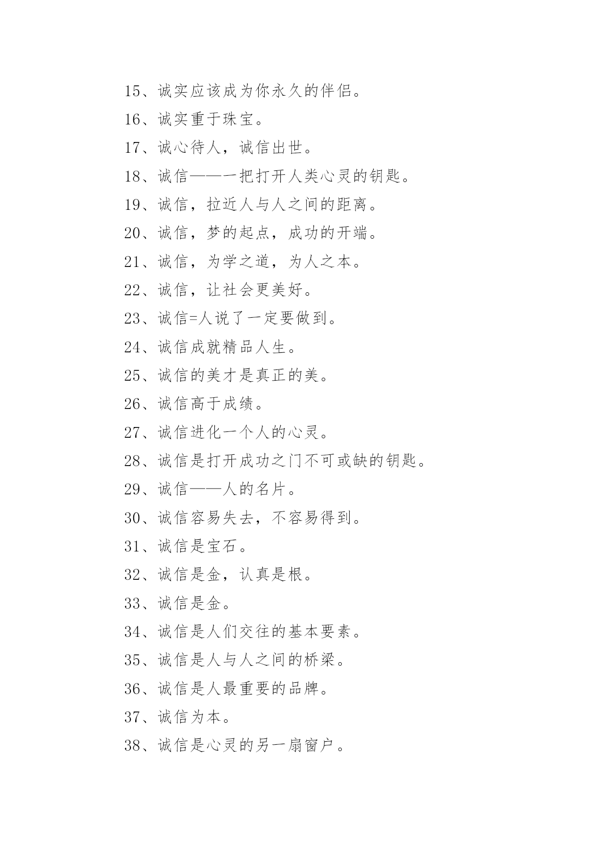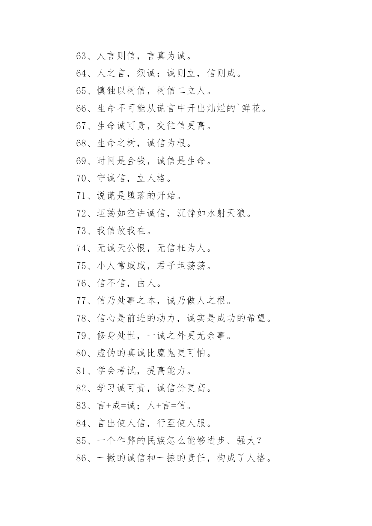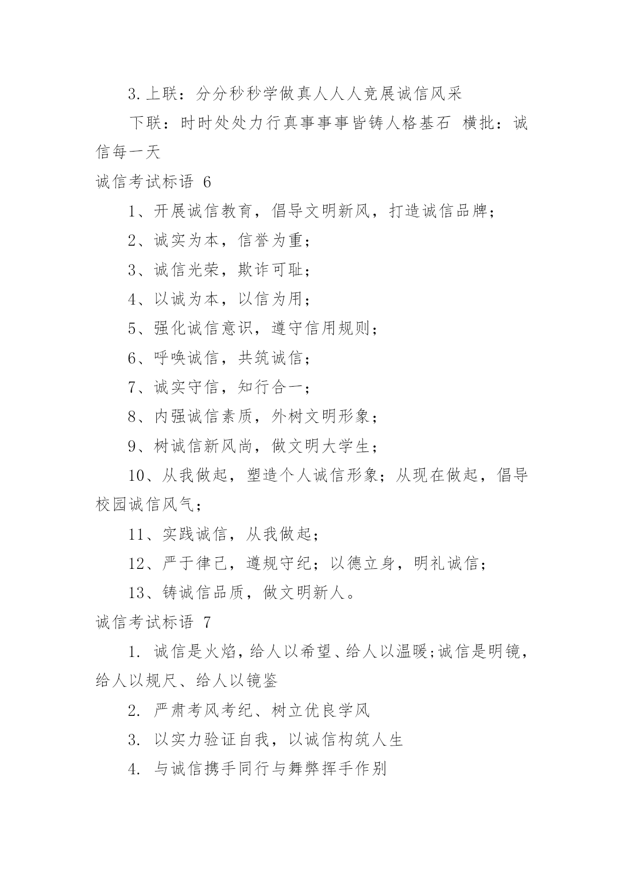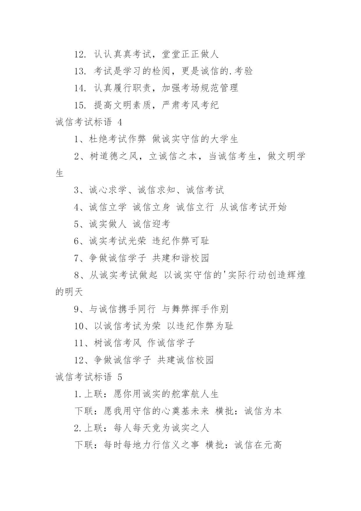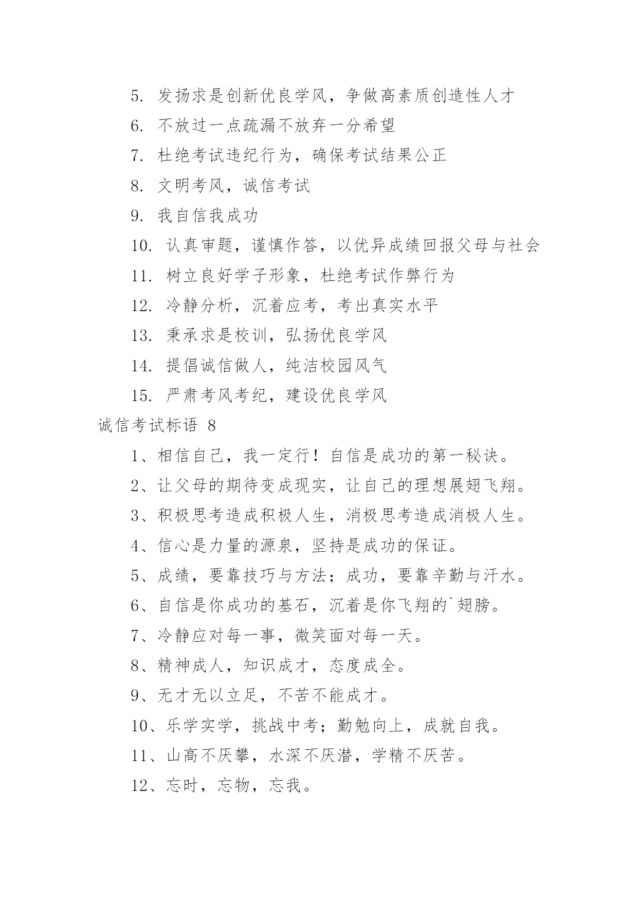 诚信考试标语诚信考试标语精选12篇在平平淡淡的学习、工作、生活中,大家都不可避免地会接触到标语吧,标语具有非常明显的时代特征和行业特色。还苦于找不到好的标语?以下是小编为大家整理的诚信考试标语,仅供参考,大家一起来看看吧。诚信考试标语11、“信”不“信”,由你。2、播种诚实,收获信任。3、播种诚信,收获人生。4、播种诚信,收获希望。5、不欺骗任何人,也包括自己。6、成绩检验过去,诚信成就未来。7、诚,是信的前提;信,是诚的基础。8、诚风拂面,诚尚融融。9、诚人之本,信人之德。10、诚人之美,信福一生。11、诚如泰山,信比金坚。12、诚实的蜜蜂,不会向塑料花献殷勤。13、诚实考试,诚信做人。14、诚实守信,乃人之本,存之道也。15、诚实应该成为你永久的伴侣。16、诚实重于珠宝。17、诚心待人,诚信出世。18、诚信——一把打开人类心灵的钥匙。19、诚信,拉近人与人之间的距离。20、诚信,梦的起点,成功的开端。21、诚信,为学之道,为人之本。22、诚信,让社会更美好。23、诚信=人说了一定要做到。24、诚信成就精品人生。25、诚信的美才是真正的美。26、诚信高于成绩。27、诚信进化一个人的心灵。28、诚信是打开成功之门不可或缺的钥匙。29、诚信——人的名片。30、诚信容易失去,不容易得到。31、诚信是宝石。32、诚信是金,认真是根。33、诚信是金。34、诚信是人们交往的基本要素。35、诚信是人与人之间的桥梁。36、诚信是人最重要的品牌。37、诚信为本。38、诚信是心灵的另一扇窗户。39、诚信是心与心的桥梁。40、诚信是一笔无形的财富!41、诚以修身,信以养法。42、诚由心出,信以达人。43、诚于天下,信于其身。44、诚于心,信于行,做人要诚信!45、诚则成,虚则败。46、对得起任何人,尤其是自己。47、凡事以诚相待,必能受信于人。48、给自己一分自制,给别人一分信任。49、好的行为,好的习惯,好的人生。50、艰难之路,唯勇者行。51、金子的光辉源于自力。52、境由心造。53、履行诺言,是名誉的保证。54、考心、考德、考品格。55、科学的复习,积极应考,健康心态。56、科学应考,诚信为先。57、宁流成绩血,不落尊严泪。58、让诚信之树永远长青。59、让理想不再是梦想,让5班真正是5班。60、人无信不立,天有日方明。61、人无信不立,业无信不成。62、人需要诚信,诚信更需要人。63、人言则信,言真为诚。64、人之言,须诚;诚则立,信则成。65、慎独以树信,树信二立人。66、生命不可能从谎言中开出灿烂的`鲜花。67、生命诚可贵,交往信更高。68、生命之树,诚信为根。69、时间是金钱,诚信是生命。70、守诚信,立人格。71、说谎是堕落的开始。72、坦荡如空讲诚信,沉静如水射天狼。73、我信故我在。74、无诚天公恨,无信枉为人。75、小人常戚戚,君子坦荡荡。76、信不信,由人。77、信乃处事之本,诚乃做人之根。78、信心是前进的动力,诚实是成功的希望。79、修身处世,一诚之外更无余事。80、虚伪的真诚比魔鬼更可怕。81、学会考试,提高能力。82、学习诚可贵,诚信价更高。83、言+成=诚;人+言=信。84、言出使人信,行至使人服。85、一个作弊的民族怎么能够进步、强大?86、一撇的诚信和一捺的责任,构成了人格。87、一切都建立在诚信的基础上。88、以诚待人,人人敬;以信办事,事事成。89、以诚待人,以信做人。90、以诚实和自信心,战胜分数和虚荣心。91、以诚为本,信为先,诚信是道德的准绳。92、以诚为本,展现真实自我。93、以诚为中心,信为半径,画出圆满人生。94、以诚信为本,展现真实自我。95、以信为根,以诚为本。96、意成则身正,身正而心修。97、拥有诚信,拥有未来。98、用诚信共创九班新的辉煌。99、有志者,事竟成。有信者,人必诚。100、与诚信为友,与自信为伴。101、欲人信,必先“信”。102、在考场上留住真实的自我。103、战有其法,弈有其规。104、正确的选择,创造美好人生!105、只有诚信,成绩才有。106、自信+诚信+学习态度=考试成绩。107、自信驱动笔杆,诚信助我成功。诚信考试标语21、发扬求是创新优良学风,争做高素质创造性人才。2、秉承求是校训,弘扬优良学风。3、严肃考试纪律,杜绝考试作弊。4、认真履行职责,加强考场规范管理。5、杜绝考试违纪行为,确保考试结果公正。6、认认真真考试,堂堂正正做人。7、谨记考试纪律,切莫因小失大。8、冷静分析,沉着应考,考出真实水平。9、考试是学习的检阅,更是诚信的'考验10、考试是学习的检阅,更是诚信的考验11、以实力验证自我,以诚信构筑人生12、端正考风诚信考试从我做起13、让舞弊远离校园,让诚信常驻心中14、以诚实考试为荣,以违纪作弊为耻15、诚信做人,从诚信考试做起16、严肃考