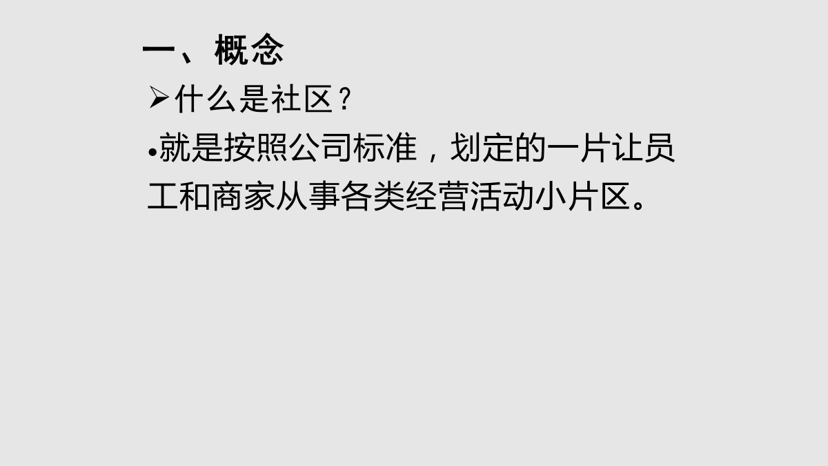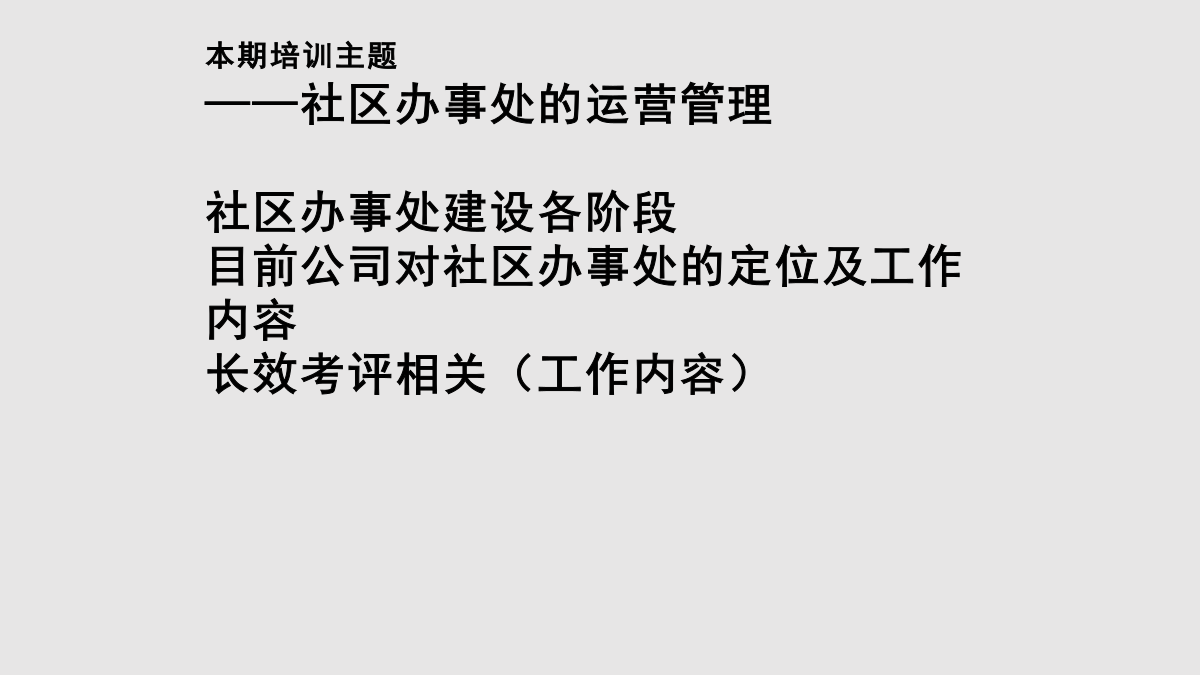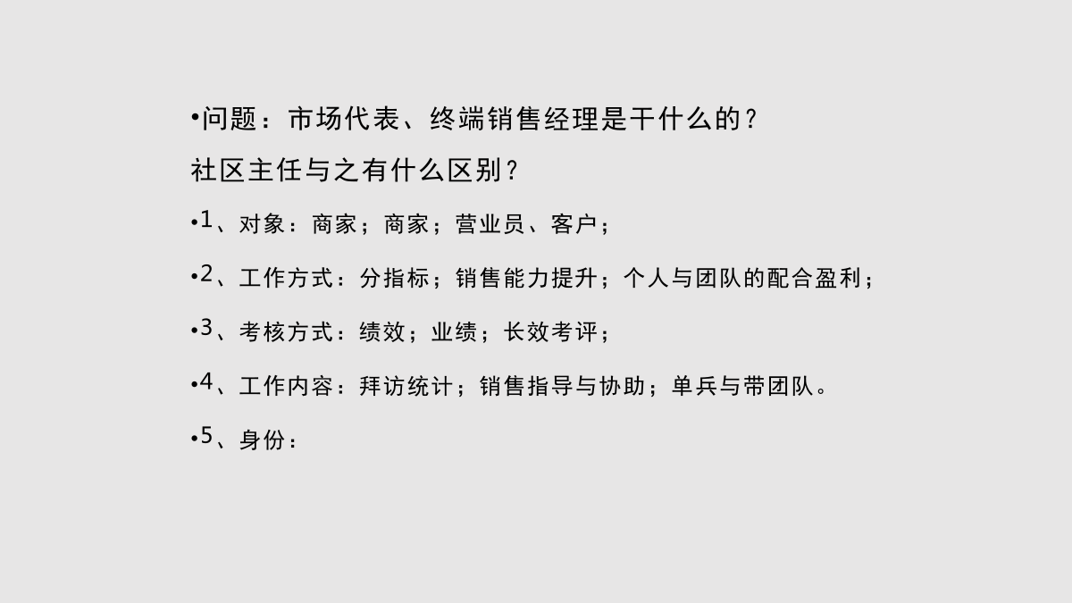 岗前培训--社区办事处运营管理2010年9月自我介绍培训说明1、材料2、方式3、内容制作桌牌渠道知识回顾问题1:德阳渠道目前共分几个层级,分别是?战略合作商、合作营业厅、核心专营店、普通专营店、特约代理点(一村一店)问题2:目前德阳三大运营商存量客户数量和比例?移动210万,联通19万+,电信20万+问题:市场代表、终端销售经理是干什么的?社区主任与之有什么区别?1、对象:商家;商家;营业员、客户;2、工作方式:分指标;销售能力提升;个人与团队的配合盈利;3、考核方式:绩效;业绩;长效考评;4、工作内容:拜访统计;销售指导与协助;单兵与带团队。5、身份:本期培训主题——社区办事处的运营管理社区办事处建设各阶段目前公司对社区办事处的定位及工作内容长效考评相关(工作内容)什么是社区?中文名称:社区英文名称:community定义:通常是集中在固定地域内的家庭间相互作用所形成的社会网络。社区是我们生活中不可缺少的一个综合基础的群众基础机构。他为我们居住在一个固定区域的居民群体范围内的居民,起着一种媒介桥梁作用。在为我们广大居民群众做着一些日常生活中所需与社会团体旋节沟通连贯的作用。是我们信任的一个基础机构,与居民群众生活有着息息相关的关联基层组织。又指网络板块。什么是社区?就是按照公司标准,划定的一片让员工和商家从事各类经营活动小片区。什么是社区办事处?街道办事处:区政府的派出机构,是代表区级政府在辖区内实行社会管理的基层组织,其管理手段是行政手段社区居委会:居民自治组织是管理与被管理指导与被指导什么是社区办事处?人员:1+N工作性质:客户经理、营业员、直销队德阳移动对社区的定义建设背景及目的二、社区办事处的发展历史为什么要建社区办事处为什么要建社区办事处二、社区办事处的发展历史二、社区办事处的发展历史二、社区办事处的发展历史二、社区办事处的发展历史二、社区办事处的发展历史二、社区办事处的发展历史二、社区办事处的发展历史二、社区办事处的发展历史二、社区办事处的发展历史二、社区办事处的发展历史二、社区办事处的发展历史二、社区办事处的发展历史二、社区办事处的发展历史二、社区办事处的发展历史二、社区办事处的发展历史三、目前公司对社区办事处的定位及工作内容问题了解办事处的定位认识社区办事处工作界面C类集团及商铺的营销服务问题二C类集团及商铺的客户特征问题三C类集团及商铺的生意经商铺的融入、维系与营业厅运营社区市场的营销组织什么是长效考评?总体思路:按劳计酬,将个人与办事处团队的综合销售情况与每月收入挂钩。(公司销售转型的整体思路)优化:从业务计量到利润分配欢迎加入社区办事处因为有你,所以更精彩!什么是社区?中文名称:社区英文名称:community定义:通常是集中在固定地域内的家庭间相互作用所形成的社会网络。社区是我们生活中不可缺少的一个综合基础的群众基础机构。他为我们居住在一个固定区域的居民群体范围内的居民,起着一种媒介桥梁作用。在为我们广大居民群众做着一些日常生活中所需与社会团体旋节沟通连贯的作用。是我们信任的一个基础机构,与居民群众生活有着息息相关的关联基层组织。又指网络板块。为什么要建社区办事处二、社区办事处的发展历史二、社区办事处的发展历史二、社区办事处的发展历史二、社区办事处的发展历史二、社区办事处的发展历史二、社区办事处的发展历史