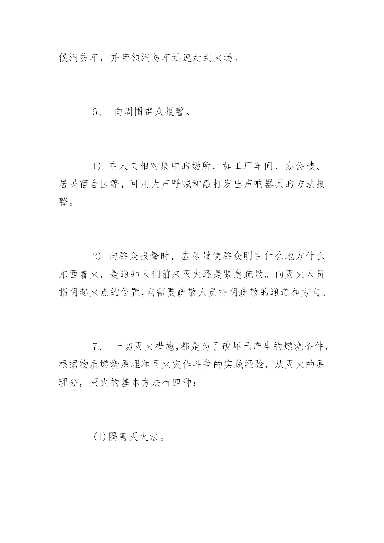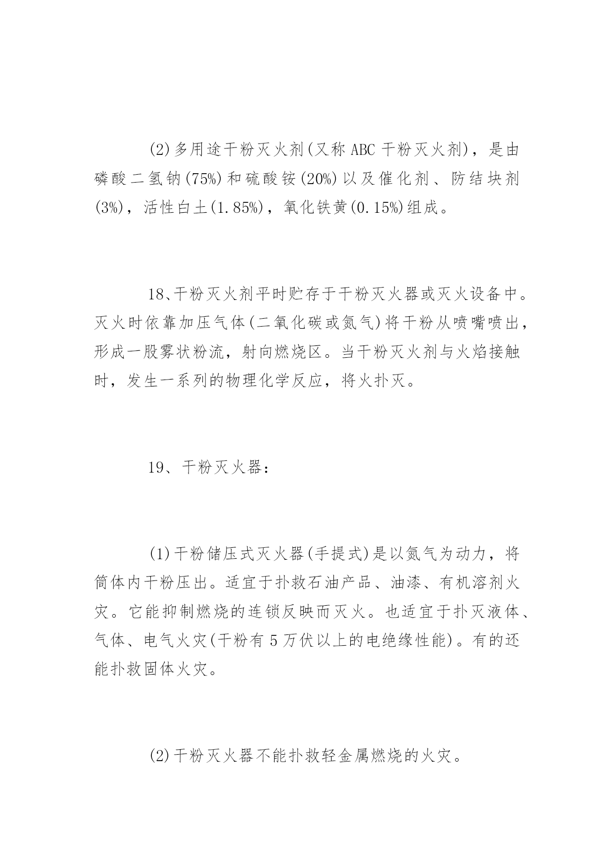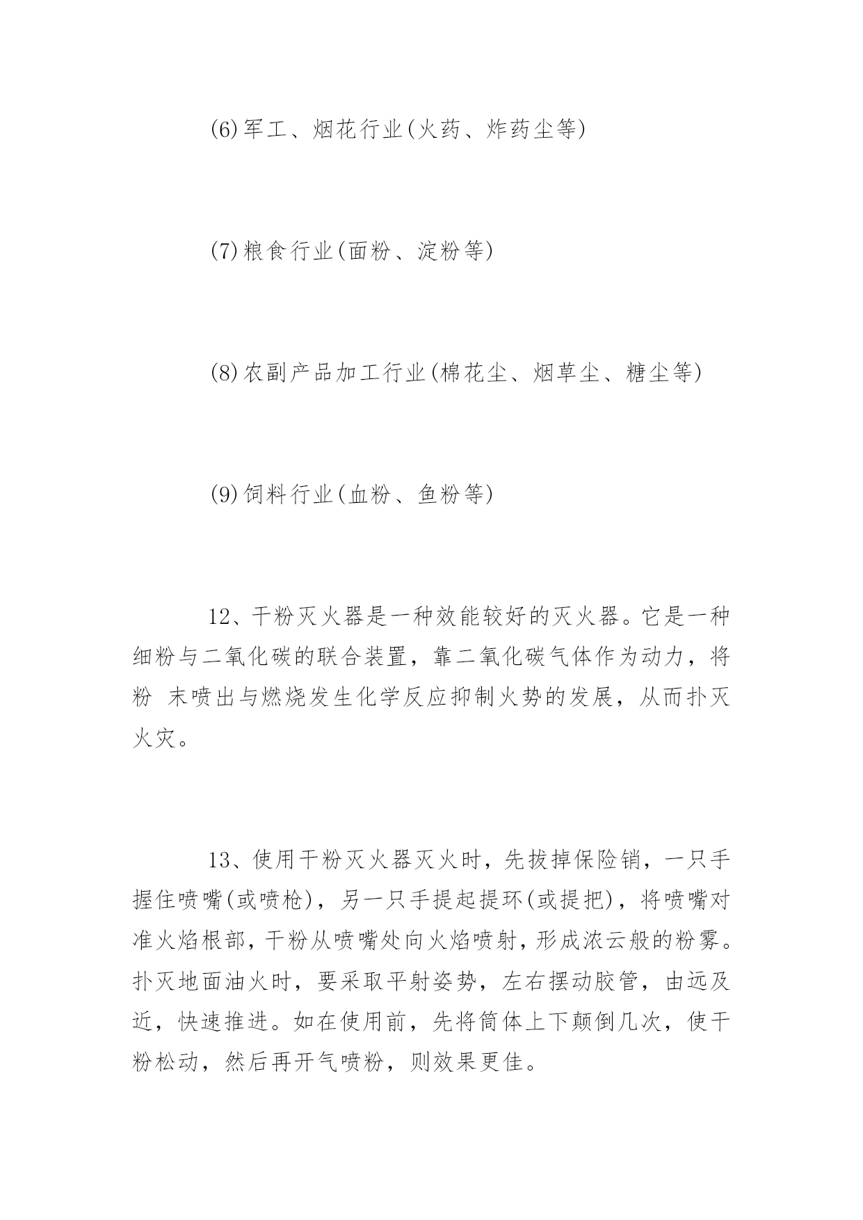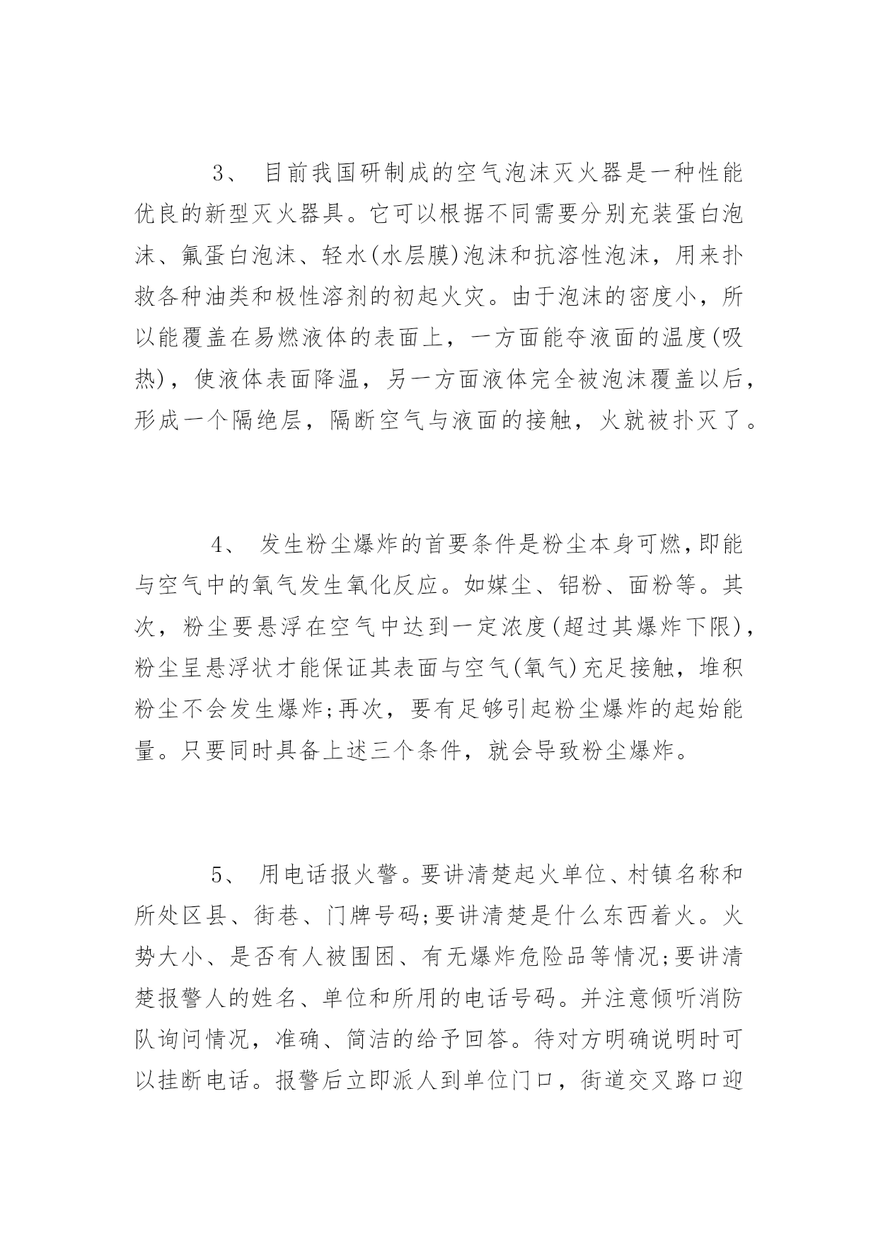 消防安全知识资料对于生活中,消防知识是必须了解的,那么到底有些什么消防知识呢?下面是百分网小编为大家整理了关于消防安全知识资料,希望大家喜欢。消防安全知识培训资料1、灭火器是一种可由人力移动的轻便灭火器具。它能在其内部压力作用下将所充装的灭火剂喷出,用来扑灭火灾。由于它的结构简单,操作方便,使用面广,对扑灭初起火灾有一定效果,因此,在工厂、企业、机关、商店、仓库,以及汽车、轮船、飞机等交通工具上,几乎到处可见,已成为群众性的常规灭火武器。2、灭火器的种类很多,按其移动方式可分为:手提式和推车式;按驱动灭火剂的动力来源可分为:贮气瓶式、贮压式、化学反应式;按所充装的灭火剂则又可分为:泡沫、干粉、二氧化碳、酸碱、清水、卤代烷灭火器。3、目前我国研制成的空气泡沫灭火器是一种性能优良的新型灭火器具。它可以根据不同需要分别充装蛋白泡沫、氟蛋白泡沫、轻水(水层膜)泡沫和抗溶性泡沫,用来扑救各种油类和极性溶剂的初起火灾。由于泡沫的密度小,所以能覆盖在易燃液体的表面上,一方面能夺液面的温度(吸热),使液体表面降温,另一方面液体完全被泡沫覆盖以后,形成一个隔绝层,隔断空气与液面的接触,火就被扑灭了。4、发生粉尘爆炸的首要条件是粉尘本身可燃,即能与空气中的氧气发生氧化反应。如媒尘、铝粉、面粉等。其次,粉尘要悬浮在空气中达到一定浓度(超过其爆炸下限),粉尘呈悬浮状才能保证其表面与空气(氧气)充足接触,堆积粉尘不会发生爆炸;再次,要有足够引起粉尘爆炸的起始能量。只要同时具备上述三个条件,就会导致粉尘爆炸。5、用电话报火警。要讲清楚起火单位、村镇名称和所处区县、街巷、门牌号码;要讲清楚是什么东西着火。火势大小、是否有人被围困、有无爆炸危险品等情况;要讲清楚报警人的姓名、单位和所用的电话号码。并注意倾听消防队询问情况,准确、简洁的给予回答。待对方明确说明时可以挂断电话。报警后立即派人到单位门口,街道交叉路口迎候消防车,并带领消防车迅速赶到火场。6、向周围群众报警。1)在人员相对集中的场所,如工厂车间、办公楼、居民宿舍区等,可用大声呼喊和敲打发出声响器具的方法报警。2)向群众报警时,应尽量使群众明白什么地方什么东西着火,是通知人们前来灭火还是紧急疏散。向灭火人员指明起火点的位置,向需要疏散人员指明疏散的通道和方向。7、一切灭火措施,都是为了破坏已产生的燃烧条件,根据物质燃烧原理和同火灾作斗争的实践经验,从灭火的原理分,灭火的基本方法有四种:(1)隔离灭火法。(2)窒息灭火法。(3)冷却灭火法。(4)抑制灭火法。8、常见的点火能源可分为四大类:9、(1)机械火源:如摩擦、撞击、绝热压缩等。(2)热火源:高温表面、热射线(包括日光)等。(3)电火源:电气火花、静电火花、雷电等。(4)化学(或物理)火源:明火、化学能、发热自燃等。10、引发火灾的三个条件是:可燃物、氧化剂和点火能源同时存在,相互作用。引发爆炸的条件是:爆炸品(内含还原剂和氧化剂)或可燃物(可燃气、蒸气或粉尘)与空气混合物和起爆能源同时存在、相互作用。如果我们采取措施避免或消除上述条件之一,就可以防止火灾或爆炸事故的发生,这就是防火防爆的基本原理。在制定防火防爆措施时,可以从以下四个方面去考虑:(1)预防性措施。这是最基本、最重要的措施。我们可以把预防性措施分为两大类:消除导致火爆灾害的物质条件(即点火可燃物与氧比剂的结合)及消除导致火爆灾害的能量条件(即点火或引爆能源),从而从根本上杜绝发火(引爆)的可能性。(2)限制性措施。即一旦发生火灾爆炸事故。限制其蔓延扩大及减少其损失的措施。如安装阻火、泄压设备,设防火墙、防爆墙等。(3)消防措施。配备必要的消防措施,在万一不慎起火时,能及时扑灭。特别是如果能在着火初期将火扑灭,就可以避免发生大火灾或引发爆炸。从广义上讲,这也是防火防爆措施的一部分。(4)疏散性措施。预先采取必要的措施,如建筑物、飞机、车辆上设置安全门或疏散楼梯、疏散通道等。当一旦发生较大火灾时,能迅速将人员或重要物资撤到安全区,以减少损失。10、为了消除导致火灾爆炸灾害的物质条件,主要从以下三个方面考虑:(1)在生产中尽量不用或少用可燃物。通过改进生产工艺及研制新材料,以不燃物或难燃物代替可燃易燃物,以爆炸危险性小的物质代替危险性大的物质,是工业防火防爆的根本措施,应首先加以考虑。如以阻燃材料代替易燃材料:以不燃或难燃溶剂代替易燃溶剂(如汽油、苯等);在矿井下用金属、水泥支架代替木支架等,都属此类措施。(2)在爆炸危险场所采取措施,使空气中可燃物(可燃气、蒸气、粉尘)浓度保持在安全限度(爆炸下限十安全裕度)以下。(3)加强爆炸危险物的管理。在生产、使用、贮存、运输中都要根据其特性采取有针对性的防范措施11、目前发现具有粉尘