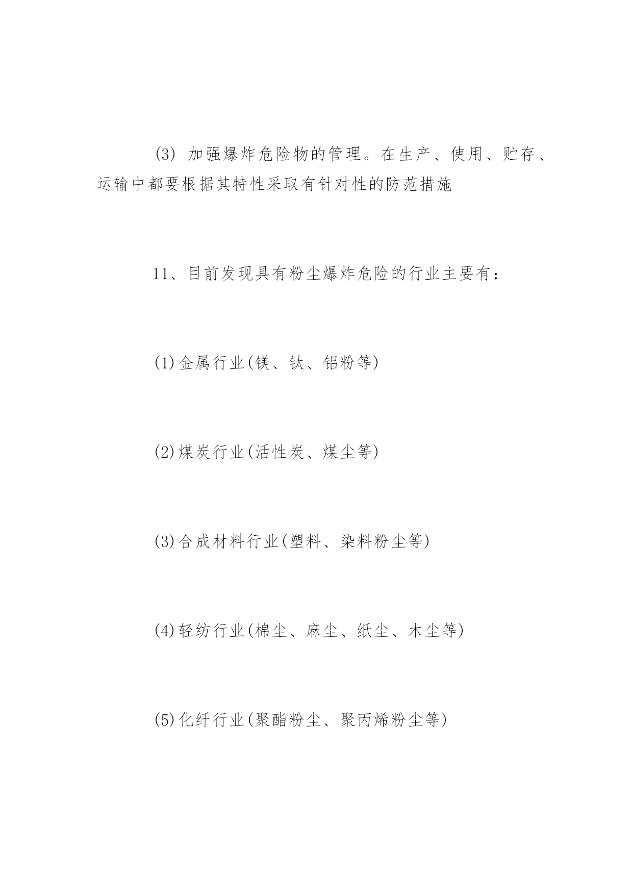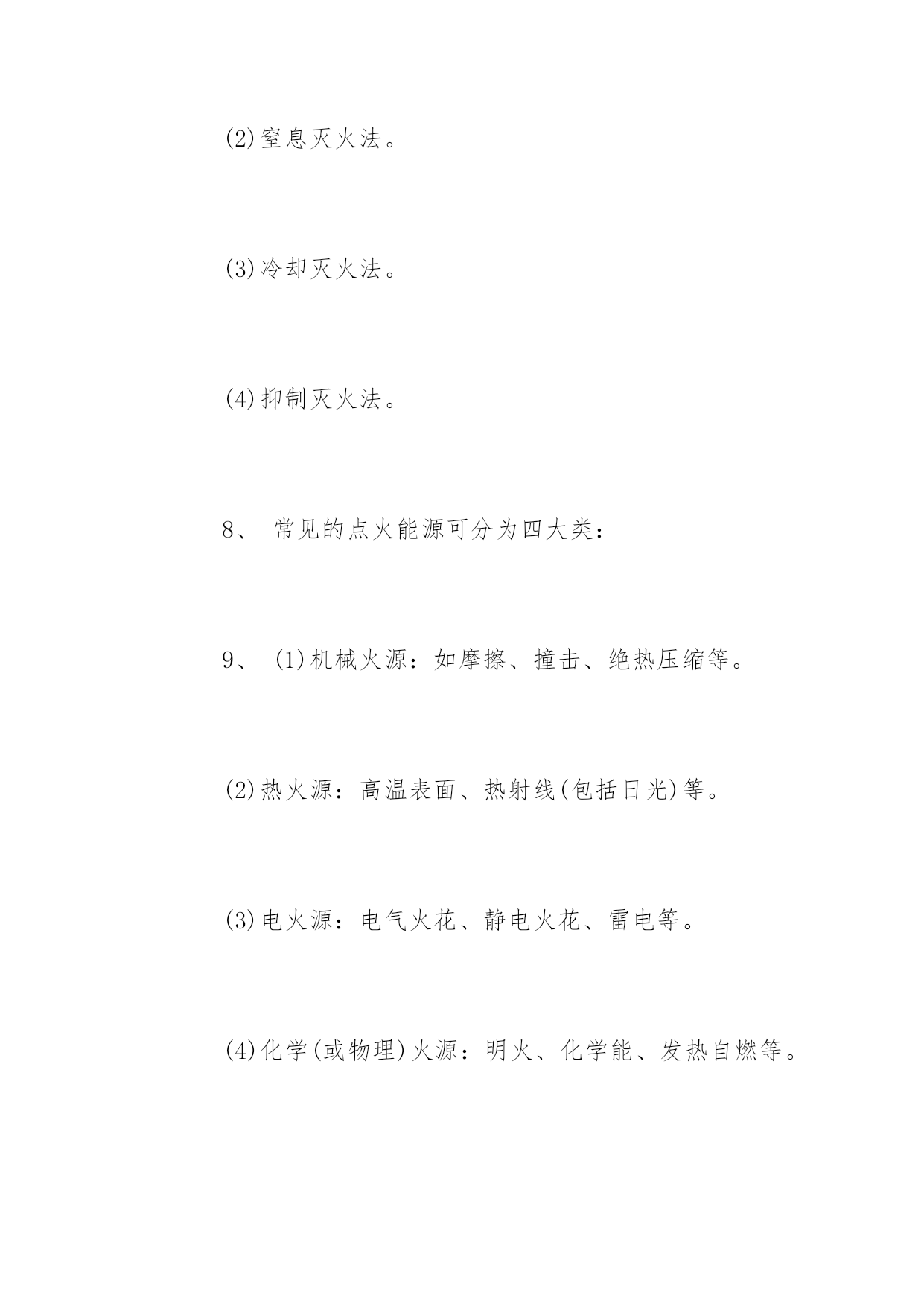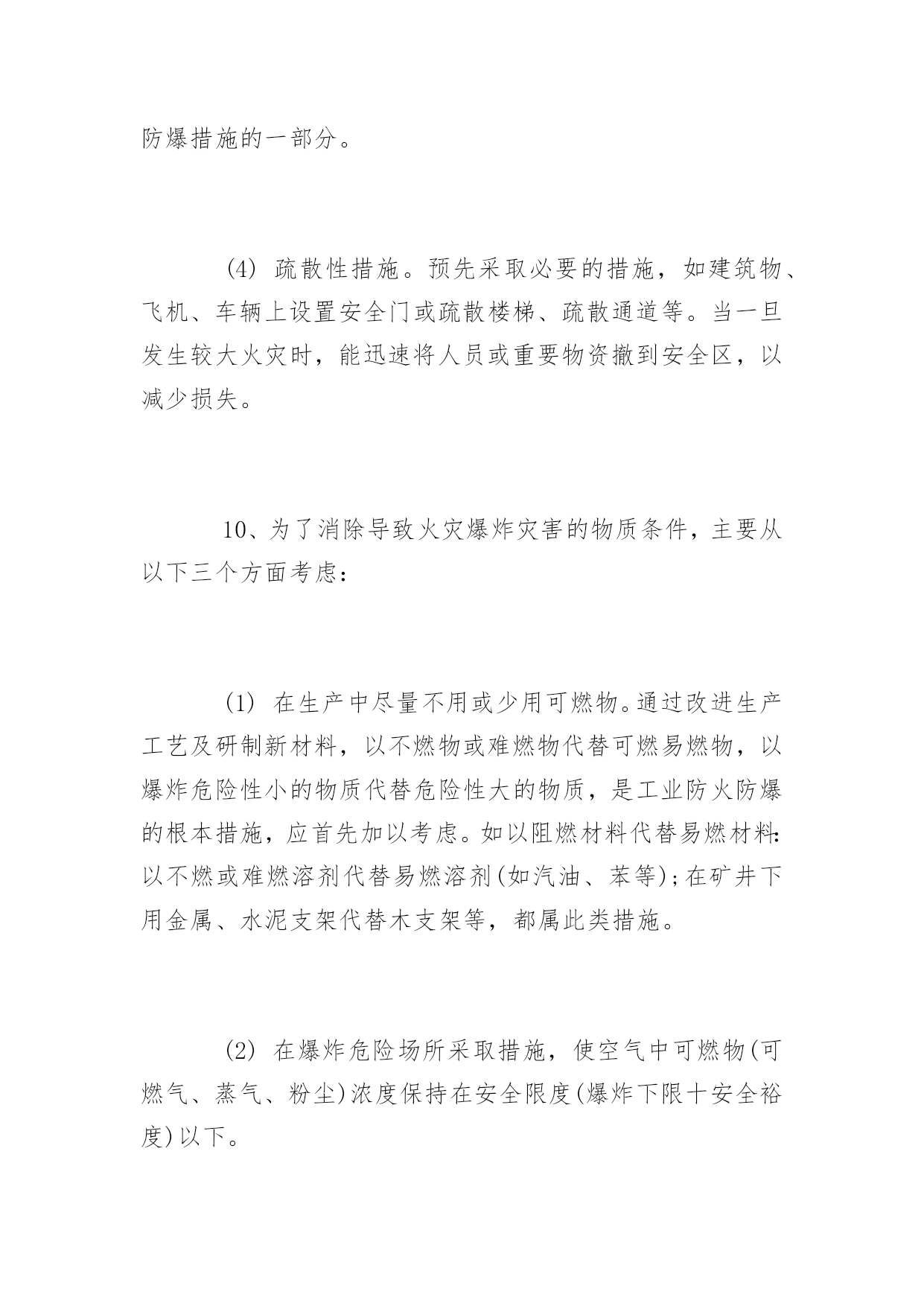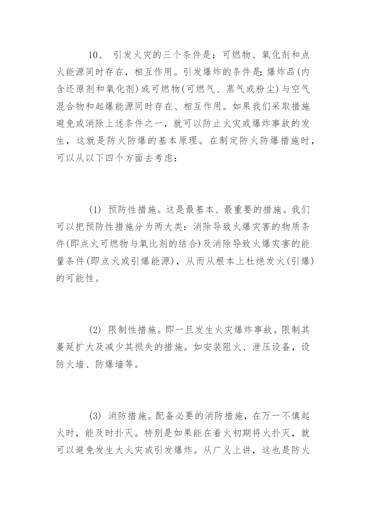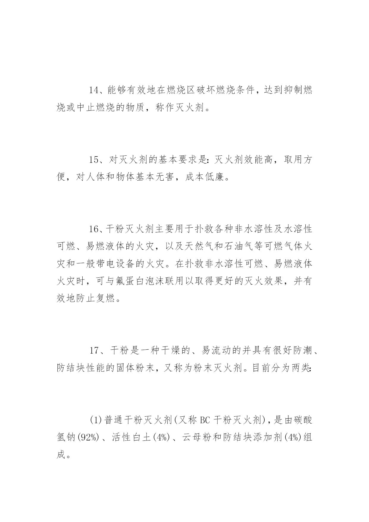 消防安全知识资料对于生活中,消防知识是必须了解的,那么到底有些什么消防知识呢?下面是百分网小编为大家整理了关于消防安全知识资料,希望大家喜欢。消防安全知识培训资料1、灭火器是一种可由人力移动的轻便灭火器具。它能在其内部压力作用下将所充装的灭火剂喷出,用来扑灭火灾。由于它的结构简单,操作方便,使用面广,对扑灭初起火灾有一定效果,因此,在工厂、企业、机关、商店、仓库,以及汽车、轮船、飞机等交通工具上,几乎到处可见,已成为群众性的常规灭火武器。2、灭火器的种类很多,按其移动方式可分为:手提式和推车式;按驱动灭火剂的动力来源可分为:贮气瓶式、贮压式、化学反应式;按所充装的灭火剂则又可分为:泡沫、干粉、二氧化碳、酸碱、清水、卤代烷灭火器。3、目前我国研制成的空气泡沫灭火器是一种性能优良的新型灭火器具。它可以根据不同需要分别充装蛋白泡沫、氟蛋白泡沫、轻水(水层膜)泡沫和抗溶性泡沫,用来扑救各种油类和极性溶剂的初起火灾。由于泡沫的密度小,所以能覆盖在易燃液体的表面上,一方面能夺液面的温度(吸热),使液体表面降温,另一方面液体完全被泡沫覆盖以后,形成一个隔绝层,隔断空气与液面的接触,火就被扑灭了。4、发生粉尘爆炸的首要条件是粉尘本身可燃,即能与空气中的氧气发生氧化反应。如媒尘、铝粉、面粉等。其次,粉尘要悬浮在空气中达到一定浓度(超过其爆炸下限),粉尘呈悬浮状才能保证其表面与空气(氧气)充足接触,堆积粉尘不会发生爆炸;再次,要有足够引起粉尘爆炸的起始能量。只要同时具备上述三个条件,就会导致粉尘爆炸。5、用电话报火警。要讲清楚起火单位、村镇名称和所处区县、街巷、门牌号码;要讲清楚是什么东西着火。火势大小、是否有人被围困、有无爆炸危险品等情况;要讲清楚报警人的姓名、单位和所用的电话号码。并注意倾听消防队询问情况,准确、简洁的给予回答。待对方明确说明时可以挂断电话。报警后立即派人到单位门口,街道交叉路口迎候消防车,并带领消防车迅速赶到火场。6、向周围群众报警。1)在人员相对集中的场所,如工厂车间、办公楼、居民宿舍区等,可用大声呼喊和敲打发出声响器具的方法报警。2)向群众报警时,应尽量使群众明白什么地方什么东西着火,是通知人们前来灭火还是紧急疏散。向灭火人员指明起火点的位置,向需要疏散人员指明疏散的通道和方向。7、一切灭火措施,都是为了破坏已产生的燃烧条件,根据物质燃烧原理和同火灾作斗争的实践经验,从灭火的原理分,灭火的基本方法有四种:(1)隔离灭火法。(2)窒息灭火法。(3)冷却灭火法。(4)抑制灭火法。8、常见的点火能源可分为四大类:9、(1)机械火源:如摩擦、撞击、绝热压缩等。(2)热火源:高温表面、热射线(包括日光)等。(3)电火源:电气火花、静电火花、雷电等。(4)化学(或物理)火源:明火、化学能、发热自燃等。10、引发火灾的三个条件是:可燃物、氧化剂和点火能源同时存在,相互作用。引发爆炸的条件是:爆炸品(内含还原剂和氧化剂)或可燃物(可燃气、蒸气或粉尘)与空气混合物和起爆能源同时存在、相互作用。如果我们采取措施避免或消除上述条件之一,就可以防止火灾或爆炸事故的发生,这就是防火防爆的基本原理。在制定防火防爆措施时,可以从以下四个方面去考虑:(1)预防性措施。这是最基本、最重要的措施。我们可以把预防性措施分为两大类:消除导致火爆灾害的物质条件(即点火可燃物与氧比剂的结合)及消除导致火爆灾害的能量条件(即点火或引爆能源),从而从根本上杜绝发火(引爆)的可能性。(2)限制性措施。即一旦发生火灾爆炸事故。限制其蔓延扩大及减少其损失的措施。如安装阻火、泄压设备,设防火墙、防爆墙等。(3)消防措施。配备必要的消防措施,在万一不慎起火时,能及时扑灭。特别是如果能在着火初期将火扑灭,就可以避免发生大火灾或引发爆炸。从广义上讲,这也是防火防爆措施的一部分。(4)疏散性措施。预先采取必要的措施,如建筑物、飞机、车辆上设置安全门或疏散楼梯、疏散通道等。当一旦发生较大火灾时,能迅速将人员或重要物资撤到安全区,以减少损失。10、为了消除导致火灾爆炸灾害的物质条件,主要从以下三个方面考虑:(1)在生产中尽量不用或少用可燃物。通过改进生产工艺及研制新材料,以不燃物或难燃物代替可燃易燃物,以爆炸危险性小的物质代替危险性大的物质,是工业防火防爆的根本措施,应首先加以考虑。如以阻燃材料代替易燃材料:以不燃或难燃溶剂代替易燃溶剂(如汽油、苯等);在矿井下用金属、水泥支架代替木支架等,都属此类措施。(2)在爆炸危险场所采取措施,使空气中可燃物(可燃气、蒸气、粉尘)浓度保持在安全限度(爆炸下限十安全裕度)以下。(3)加强爆炸危险物的管理。在生产、使用、贮存、运输中都要根据其特性采取有针对性的防范措施11、目前发现具有粉尘